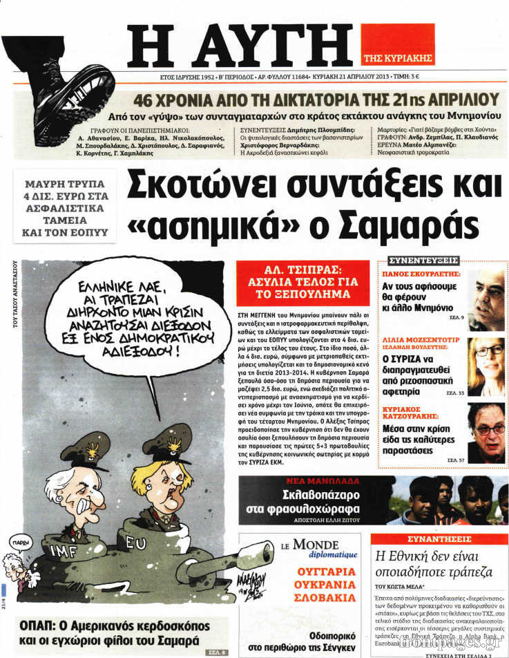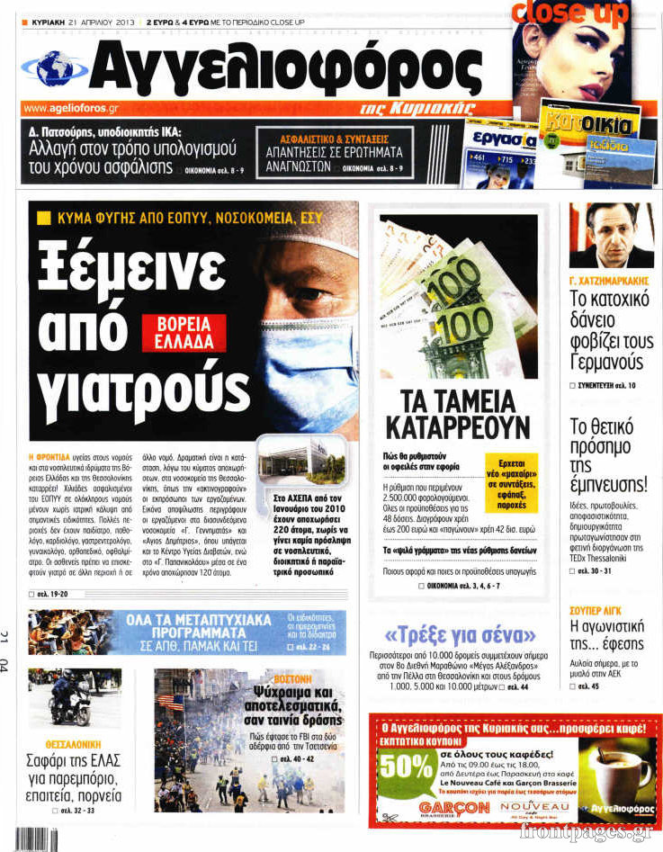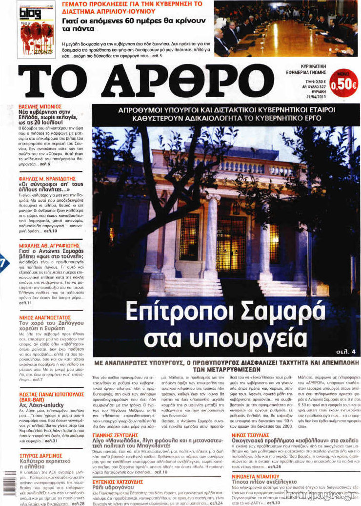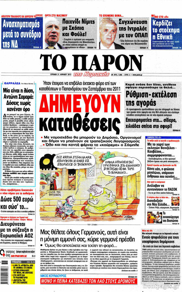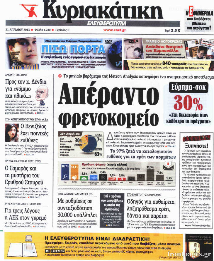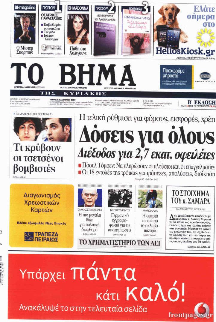 Οι πολιτικές εφημερίδες Enikos Newsroom 09:12, Κυριακή 21 Απριλίου 2013 Media Οι πολιτικές εφημερίδες Τα πρωτοσέλιδα των πολιτικών εφημερίδων. ΕΦΗΜΕΡΙΔΕΣ ΠΟΛΙΤΙΚΕΣ ΕΦΗΜΕΡΙΔΕΣ ΠΡΩΤΟΣΕΛΙΔΑ Μοιράσου το: σχολίασε κι εσύ (0 σχόλια) Ακολουθήστε το enikos.gr στο Google News και μάθετε πρώτοι όλες τις ειδήσεις Δείτε όλες τις τελευταίες ειδήσεις από την Ελλάδα και τον Κόσμο στο enikos.gr Ειδήσεις Ροή Ειδήσεων 3 ώρες πριν Χριστούγεννα στα μπλόκα: Επιμένουν στις κινητοποιήσεις τους οι αγρότες – Ανοίγουν τα διόδια το Σαββατοκύριακο 4 ώρες πριν Ουκρανία: Η άνευ προηγουμένου επίθεση σε ρωσικό τάνκερ στη Μεσόγειο και το μήνυμα προς στον Πούτιν – Το «μακρύ χέρι» του Κιέβου 3 ώρες πριν Πούτιν: Τα μηνύματα σε Ευρώπη και ΝΑΤΟ από το μαραθώνιο «σόου» του – Η απαίτηση για «σεβασμό» και η ειρήνη «με τους όρους» της Μόσχας 4 ώρες πριν Τραμπ: Δεν αποκλείει την πιθανότητα ενός πολέμου στη Βενεζουέλα – «Ο Μαδούρο ξέρει καλύτερα από τον καθένα τι ακριβώς θέλω» 5 ώρες πριν Συνεχίζει να προκαλεί ο Μίτσκοσκι: «Για μένα το όνομα Μακεδονία είναι ιερό» 3 ώρες πριν Ανακαλύφθηκαν αρχαία χρυσά νομίσματα 2.200 ετών που απεικονίζουν τον θεό Απόλλωνα – Η άγνωστη σύνδεση με τον Φίλιππο Β΄ της Μακεδονίας 4 ώρες πριν Ύπνος: Μια κρυφή κατάσταση του εγκεφάλου πριν από τον ύπνο μπορεί να είναι το “κλειδί” για υψηλή ευφυΐα και δημιουργικότητα 5 ώρες πριν Αριθμολογία: Οι άνθρωποι που έχουν γεννηθεί αυτές τις 4 ημερομηνίες, συχνά παρεξηγούνται – «Η καλοσύνη τους κρύβει τεράστια δύναμη» 6 ώρες πριν Ξεχάστε το καθάρισμα το Σαββατοκύριακο: Ο «κανόνας των 20 λεπτών» που θα σας λύσει τα χέρια 24 λεπτά πριν Πρόταση γάμου στο ΣΕΦ κατά την διάρκεια του αγώνα Ολυμπιακός-Βιλερμπάν – Δείτε βίντεο 39 λεπτά πριν Euroleague: Επέστρεψε στις νίκες ο Ολυμπιακός, πήρε την ματσάρα της χρονιάς η Μπάρτσα – Τα αποτελέσματα και η βαθμολογία 54 λεπτά πριν Συρία: Μαζικά πλήγματα των ΗΠΑ σε θέσεις του Ισλαμικού Κράτους – Χέγκσεθ: «Δεν είναι αρχή πολέμου, είναι μια δήλωση εκδίκησης» για το θάνατο των στρατιωτών μας 1 ώρα πριν Ουκρανία: Ολοκληρώθηκαν οι συνομιλίες με τους Αμερικανούς κι Ευρωπαίους διαπραγματευτές 1 ώρα πριν Μπαρτσελόνα – Μπασκόνια 134-124: Οι «μπλαουγκράνα» πήραν το ματς της χρονιάς ύστερα από τρεις παρατάσεις ENIKOS NETWORK Το ΕΚΑΒ τιμήθηκε από την Ακαδημία Αθηνών για τα 40 χρόνια προσφοράς του Έχετε πραγματικά μεγάλη καρδιά; 10 χαρακτηριστικά όσων έχουν καλοσύνη Αναστολή μέτρων αναγκαστικής εκτέλεσης για κτηνοτρόφους που πλήττονται από την ευλογιά των αιγοπροβάτων Πλήρης επάρκεια προϊόντων στις λαϊκές της Αττικής, παρά τις αγροτικές κινητοποιήσεις – Τι απαντούν οι πωλητές Χαρτογραφώντας το «σημείο χωρίς επιστροφή»: Για πρώτη φορά αποκαλύπτεται με λεπτομέρεια το ακανθώδες όριο της ατμόσφαιρας τ... Η Google καταργεί τη λειτουργία «dark web report» – Πώς θα μπορούν οι χρήστες να διαγράφουν τα δεδομένα τους περισσότερα 22:42 , Παρασκευή 19 Δεκεμβρίου 2025 Γιώργος Γιαννόπουλος για “Το σόι σου”: “Είναι ευτυχία και ευλογία αυτή η σειρά” «Είναι ευτυχία και ευλογία η συγκυρία αυτής της σειράς», θα πει ο Γιώργος Γιαννόπουλος -ο αγαπ... 20:37 , Παρασκευή 19 Δεκεμβρίου 2025 Don’t Forget The Lyrics: Η Έλλη Κοκκίνου υποδέχεται 4 παίκτες που θα κάνουν τα πάντα για να μη χάσουν ούτε… μισή λέξη από τους στίχους Το «Don’t Forget The Lyrics» επιστρέφει απόψε, Παρασκευή 19 Δεκεμβρίου, στις 21:00 με νέο επει... 19:31 , Παρασκευή 19 Δεκεμβρίου 2025 GNTM: Απόψε ο μεγάλος τελικός για τους 4 φιναλίστ Έπειτα από