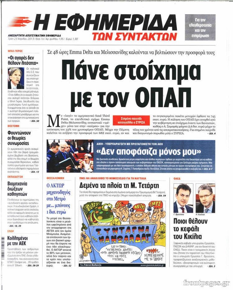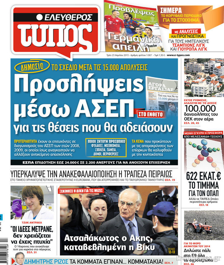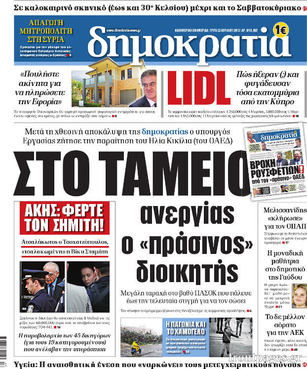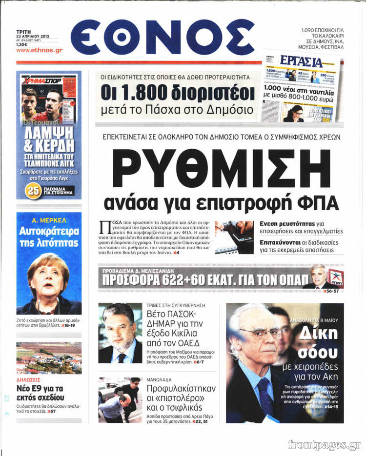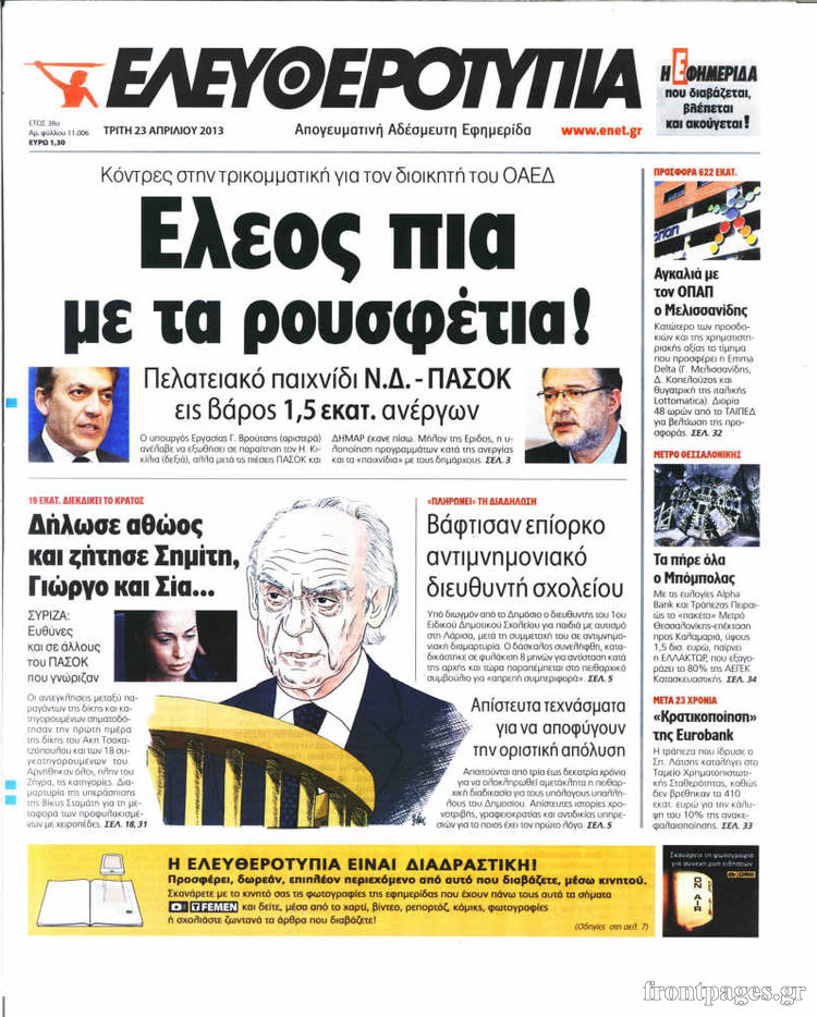 Οι πολιτικές εφημερίδες Enikos Newsroom 08:58, Τρίτη 23 Απριλίου 2013 Media Οι πολιτικές εφημερίδες Τα πρωτοσέλιδα των πολιτικών εφημερίδων. ΕΦΗΜΕΡΙΔΕΣ ΠΟΛΙΤΙΚΕΣ ΕΦΗΜΕΡΙΔΕΣ ΠΡΩΤΟΣΕΛΙΔΑ Μοιράσου το: σχολίασε κι εσύ (0 σχόλια) Ακολουθήστε το enikos.gr στο Google News και μάθετε πρώτοι όλες τις ειδήσεις Δείτε όλες τις τελευταίες ειδήσεις από την Ελλάδα και τον Κόσμο στο enikos.gr Ειδήσεις Ροή Ειδήσεων 1 ώρα πριν Πώς δρούσε το κύκλωμα που διακινούσε ναρκωτικά σε σχολεία – Υπέβαλαν σε βασανιστήρια όσους δεν τηρούσαν τους «κανόνες πειθαρχίας» 2 ώρες πριν Αγρότες: Γιορτές στα μπλόκα με ανοιχτά διόδια – Δικογραφία στα Ιωάννινα για το σήκωμα των μπαρών 6 ώρες πριν Αρχεία Έπσταϊν: Οι συγκλονιστικές φωτογραφίες – Ο Μάικλ Τζάκσον, ο Μικ Τζάγκερ και ο Κέβιν Σπέισι ανάμεσα στους διάσημους που απεικονίζονται 26 λεπτά πριν NBC: Ο Νετανιάχου σχεδιάζει να ενημερώσει τον Τραμπ για πιθανά νέα πλήγματα εναντίον του Ιράν 35 λεπτά πριν Αττική: Εξαρθρώθηκε εγκληματική οργάνωση που έκλεβε οχήματα, τα παραποιούσε και τα μεταπωλούσε σε πολίτες – Πώς δρούσε το κύκλωμα 2 ώρες πριν Η τύχη χαμογελά σε 3 ζώδια έως τις 28 Δεκεμβρίου – «Προσέξτε τις επιλογές σας και η επιμονή σας θα ανταμειφθεί» 6 ώρες πριν Διαιτολόγος αποκαλύπτει 9 πρωινές συνήθειες που «λιώνουν» το κοιλιακό λίπος – «Υποστηρίζουν την υγιεινή απώλεια βάρους» 3 ώρες πριν Μία ανεκμετάλλευτη πηγή θα μπορούσε να προσφέρει ανεξάντλητη ενέργεια – Οι επιστήμονες ίσως γνωρίζουν πώς να την ξεκλειδώσουν 9 ώρες πριν Enerwave: Το νέο «ρεύμα» στη λιανική ενέργειας που αλλάζει την εμπειρία του καταναλωτή 7 λεπτά πριν Νιούκαστλ – Τσέλσι 2-2: Αλύγιστοι οι Λονδρέζοι 17 λεπτά πριν Μικαέλα Μπέντχαους: Ο πρώτος άνθρωπος σε αναπηρικό αμαξίδιο που ταξίδεψε στο διάστημα – ΒΙΝΤΕΟ 26 λεπτά πριν NBC: Ο Νετανιάχου σχεδιάζει να ενημερώσει τον Τραμπ για πιθανά νέα πλήγματα εναντίον του Ιράν 35 λεπτά πριν Αττική: Εξαρθρώθηκε εγκληματική οργάνωση που έκλεβε οχήματα, τα παραποιούσε και τα μεταπωλούσε σε πολίτες – Πώς δρούσε το κύκλωμα 44 λεπτά πριν Κωνσταντίνος Αργυρός: «Δεν θέλω να ασχοληθώ με την πολιτική σε αυτή τη φάση – Μου έχουν γίνει προτάσεις» ENIKOS NETWORK Γιατί πρέπει να ζητάμε χάρες; Ποιο είναι το φαινόμενο Ben Franklin που κάνει τους άλλους να μας συμπαθούν Η αποχή από την αναπαραγωγή παρατείνει τη ζωή στα ζώα, σύμφωνα με μελέτη – Τι ισχύει για τους ανθρώπους; Τράπεζες: Πόσες ημέρες θα είναι κλειστές μέσα στις γιορτές Στα ύψη ο χρυσός – Νέο ρεκόρ στην τιμή της λίρας, πόσο πωλείται Χαρτογραφώντας το «σημείο χωρίς επιστροφή»: Για πρώτη φορά αποκαλύπτεται με λεπτομέρεια το ακανθώδες όριο της ατμόσφαιρας τ... Η Google καταργεί τη λειτουργία «dark web report» – Πώς θα μπορούν οι χρήστες να διαγράφουν τα δεδομένα τους περισσότερα 14:04 , Σάββατο 20 Δεκεμβρίου 2025 Η Realnews αυτής της Κυριακής (21/12/2025) Με τίτλο: «Ασπίδα προστασίας για την Ελλάδα» κυκλοφορεί, αυτήν την Κυριακή, η Realnews. Σημαντ... 12:53 , Σάββατο 20 Δεκεμβρίου 2025 Να μ’ αγαπάς: Το παρελθόν έρχεται στο φως – Καταιγιστικές εξελίξεις στα τελευταία επεισόδια του 2025 Ο Άγγελος αποκαλύπτεται, η Φωτεινή ανησυχεί για τον Λευτέρη και η Ζωή έρχεται αντιμέτωπη με το... 11:41 , Σάββατο 20 Δεκεμβρίου 2025 «Η αγάπη δεν χάνεται ποτέ»: Η μικρού μήκους ταινία κινουμένων σχεδίων που θέτει ερωτήματα για τη ζωή και τον θάνατο Ο θάνατος είναι ένα από τα πιο σκληρά θέματα που καλείται να διαχειριστεί κάποιος στη διάρκεια... 09:30 , Σάββατο 20 Δεκεμβρίου 2025 «Porto Leone: Στη γει