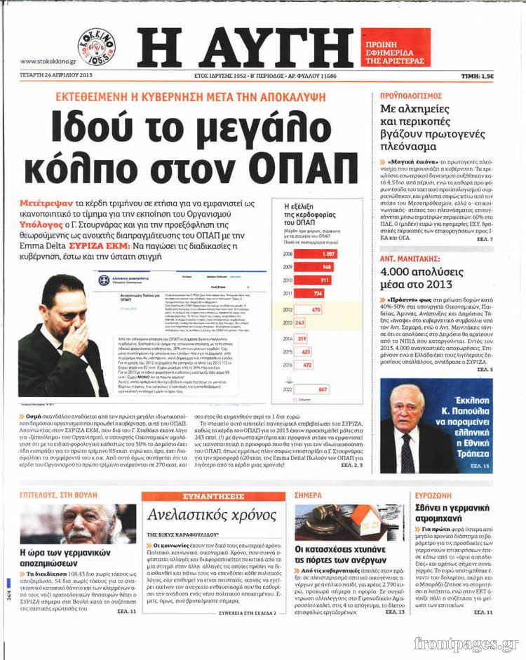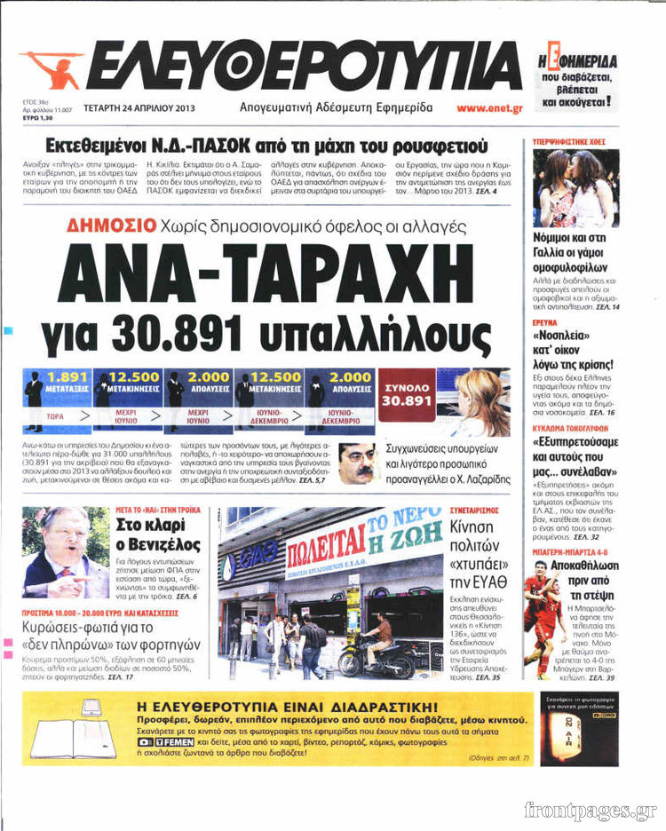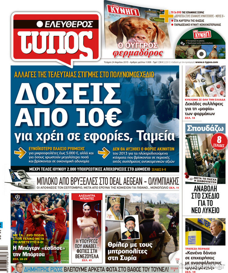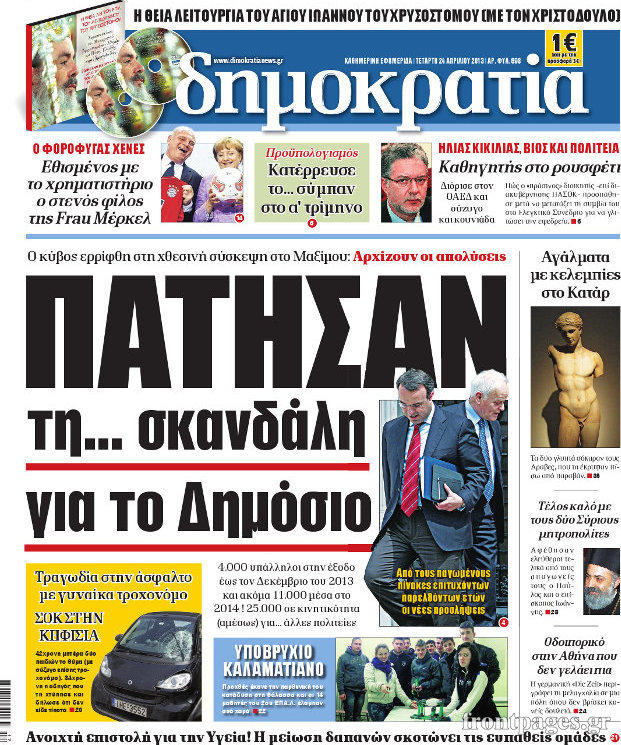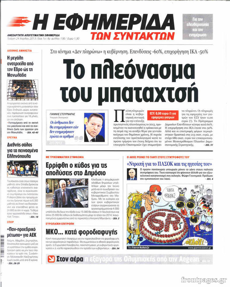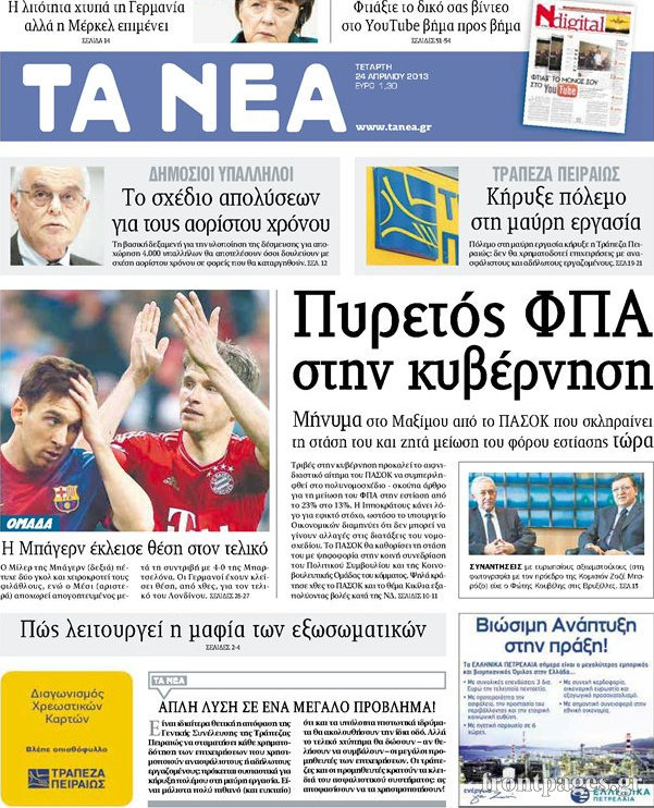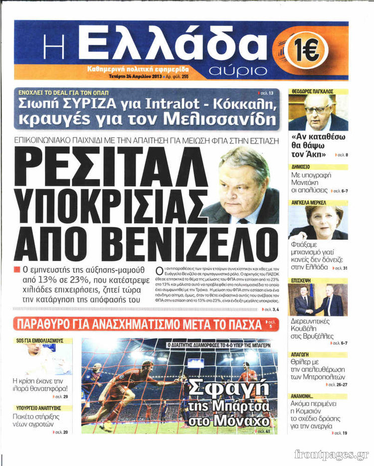 Οι πολιτικές εφημερίδες Enikos Newsroom 07:52, Τετάρτη 24 Απριλίου 2013 Media Οι πολιτικές εφημερίδες ΠΟΛΙΤΙΚΕΣ ΕΦΗΜΕΡΙΔΕΣ Μοιράσου το: σχολίασε κι εσύ (0 σχόλια) Ακολουθήστε το enikos.gr στο Google News και μάθετε πρώτοι όλες τις ειδήσεις Δείτε όλες τις τελευταίες ειδήσεις από την Ελλάδα και τον Κόσμο στο enikos.gr Ειδήσεις Ροή Ειδήσεων 2 ώρες πριν Μπλόκα: Οι αγρότες σηκώνουν τις μπάρες σε διόδια για τους εκδρομείς των Χριστουγέννων και μοιράζουν προϊόντα – Βίντεο 2 ώρες πριν Τσιάρας προς αγρότες: Τα μπλόκα και τα πείσματα δεν ωφελούν – Οι λύσεις περνούν μέσα από τον διάλογο 3 ώρες πριν Αρχεία Έπσταϊν: Οι συγκλονιστικές φωτογραφίες – Ο Μάικλ Τζάκσον, ο Μικ Τζάγκερ και ο Κέβιν Σπέισι ανάμεσα στους διάσημους που απεικονίζονται 57 λεπτά πριν Μαθητές διακινούσαν κοκαΐνη και χασίς σε σχολείο της Αττικής – 12 συλλήψεις 1 ώρα πριν Βέλγιο: Άγνωστοι έριξαν κόκκινη μπογιά στο προξενείο της Πολωνίας στις Βρυξέλλες 5 ώρες πριν Μία νέα «χρυσή» περίοδος αρχίζει για 3 ζώδια από σήμερα – «Μία αναπάντεχη ευκαιρία οδηγεί στην επιτυχία» 4 ώρες πριν Διαιτολόγος αποκαλύπτει 9 πρωινές συνήθειες που «λιώνουν» το κοιλιακό λίπος – «Υποστηρίζουν την υγιεινή απώλεια βάρους» 4 ώρες πριν Οι 7 φράσεις που δεν λένε ποτέ οι συναισθηματικά έξυπνοι άνθρωποι κατά τη διάρκεια ενός καβγά 7 ώρες πριν Enerwave: Το νέο «ρεύμα» στη λιανική ενέργειας που αλλάζει την εμπειρία του καταναλωτή 6 λεπτά πριν Μαρινάκης στον Realfm 97,8: Η κυβέρνηση σέβεται κάθε λογική διεκδίκηση των αγροτών, αλλά και το αίτημα των πολιτών να μην ταλαιπωρούνται 12 λεπτά πριν O Πάντερ MVP της 17ης αγωνιστικής στην Euroleague 21 λεπτά πριν Πέθανε η τραγουδίστρια Κλαούντια Ντελμέρ 28 λεπτά πριν Μία ανεκμετάλλευτη πηγή θα μπορούσε να προσφέρει ανεξάντλητη ενέργεια – Οι επιστήμονες ίσως γνωρίζουν πώς να την ξεκλειδώσουν 37 λεπτά πριν Θεσσαλονίκη: Ανήλικος που είχε εξαφανιστεί βρέθηκε στο σπίτι Τούρκων μετά από αστυνομική επιχείρηση ENIKOS NETWORK Η αποχή από την αναπαραγωγή παρατείνει τη ζωή στα ζώα, σύμφωνα με μελέτη – Τι ισχύει για τους ανθρώπους; Σημαντικές επαφές στις ΗΠΑ είχε ο υπουργός Υγείας Άδωνις Γεωργιάδης Ευλογιά αιγοπροβάτων: Παρατεταμένη επιζωοτία, αυστηρά μέτρα – Τι ισχύει για τον εμβολιασμό και την ανασύσταση του ζωικού κε... Τσιάρας προς αγρότες: Έχει ικανοποιηθεί το 74% των αιτημάτων – Τα μπλόκα και τα πείσματα δεν ωφελούν Χαρτογραφώντας το «σημείο χωρίς επιστροφή»: Για πρώτη φορά αποκαλύπτεται με λεπτομέρεια το ακανθώδες όριο της ατμόσφαιρας τ... Η Google καταργεί τη λειτουργία «dark web report» – Πώς θα μπορούν οι χρήστες να διαγράφουν τα δεδομένα τους περισσότερα 14:04 , Σάββατο 20 Δεκεμβρίου 2025 Η Realnews αυτής της Κυριακής (21/12/2025) Με τίτλο: «Ασπίδα προστασίας για την Ελλάδα» κυκλοφορεί, αυτήν την Κυριακή, η Realnews. Σημαντ... 12:53 , Σάββατο 20 Δεκεμβρίου 2025 Να μ’ αγαπάς: Το παρελθόν έρχεται στο φως – Καταιγιστικές εξελίξεις στα τελευταία επεισόδια του 2025 Ο Άγγελος αποκαλύπτεται, η Φωτεινή ανησυχεί για τον Λευτέρη και η Ζωή έρχεται αντιμέτωπη με το... 11:41 , Σάββατο 20 Δεκεμβρίου 2025 «Η αγάπη δεν χάνεται ποτέ»: Η μικρού μήκους ταινία κινουμένων σχεδίων που θέτει ερωτήματα για τη ζωή και τον θάνατο Ο θάνατος είναι ένα από τα πιο σκληρά θέματα που καλείται να διαχειριστεί κάποιος στη διάρκεια... 09:30 , Σάββατο 20 Δεκεμβρίου 2025 «Porto Leone: Στη γειτονιά με τα κόκκινα φανάρια» – Ο Χρόνης αποκαλύπτει στην Αλεξάνδρα το μυστικό για το παιδί της Λένας Η μεγάλη δραματική σειρά του Aph