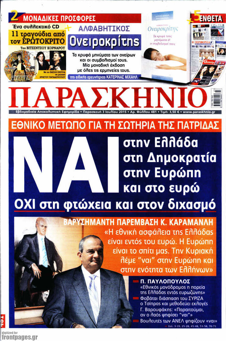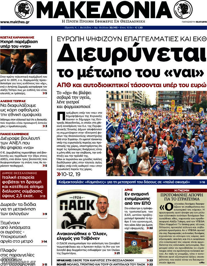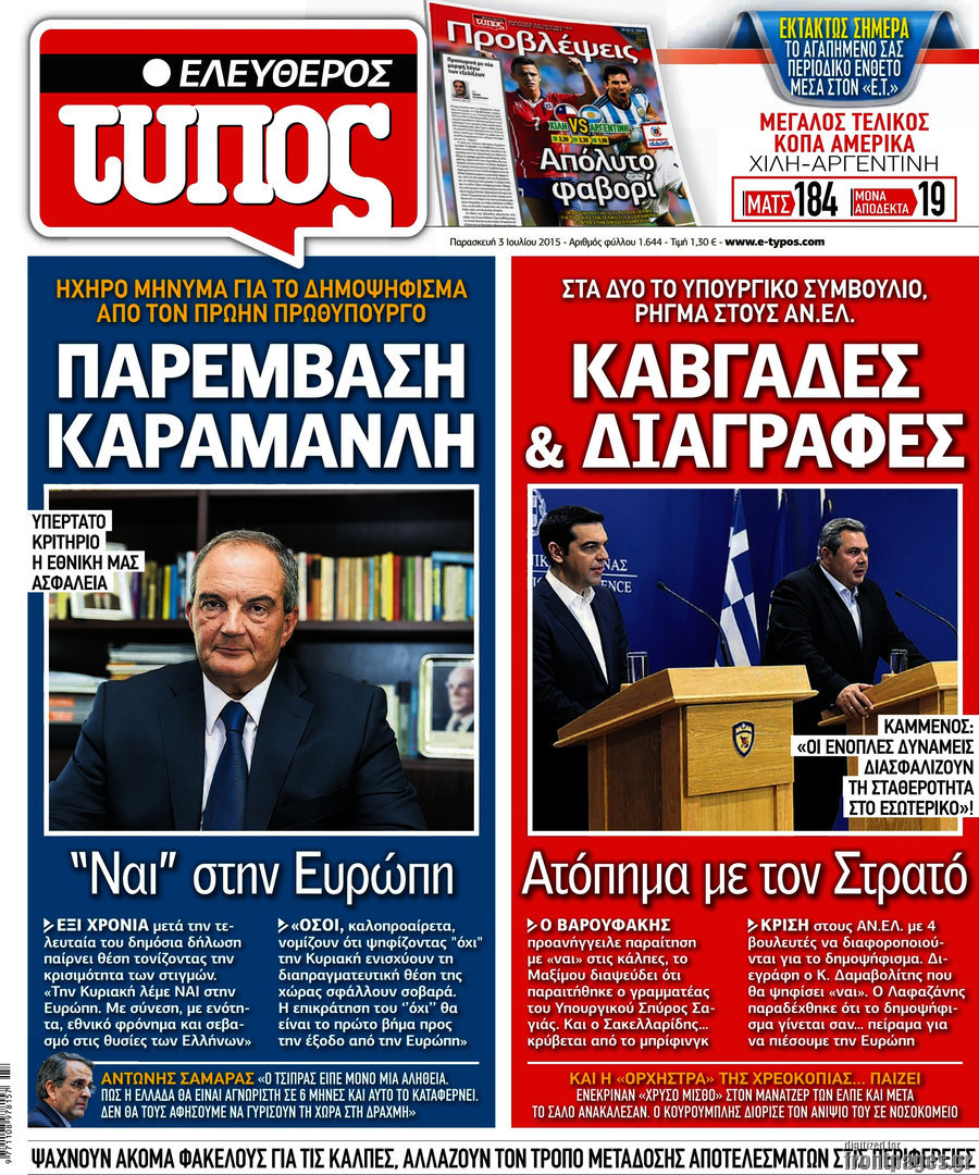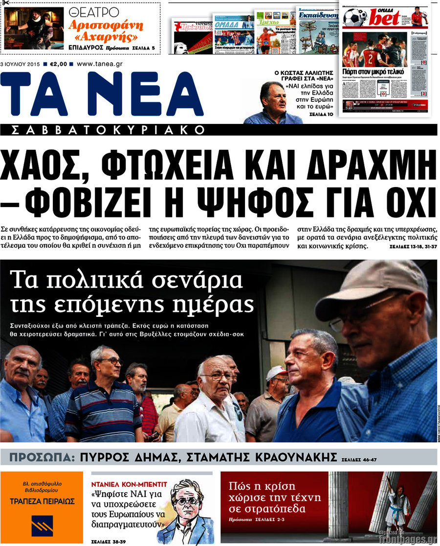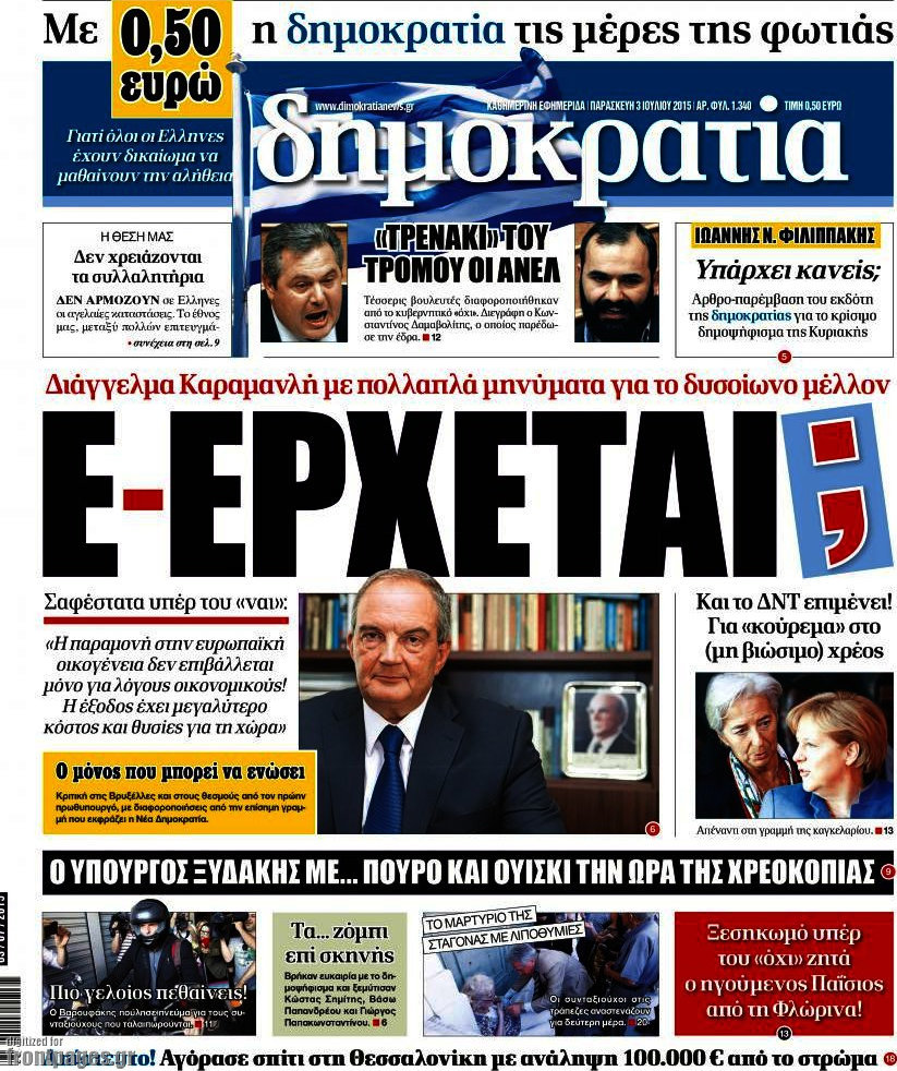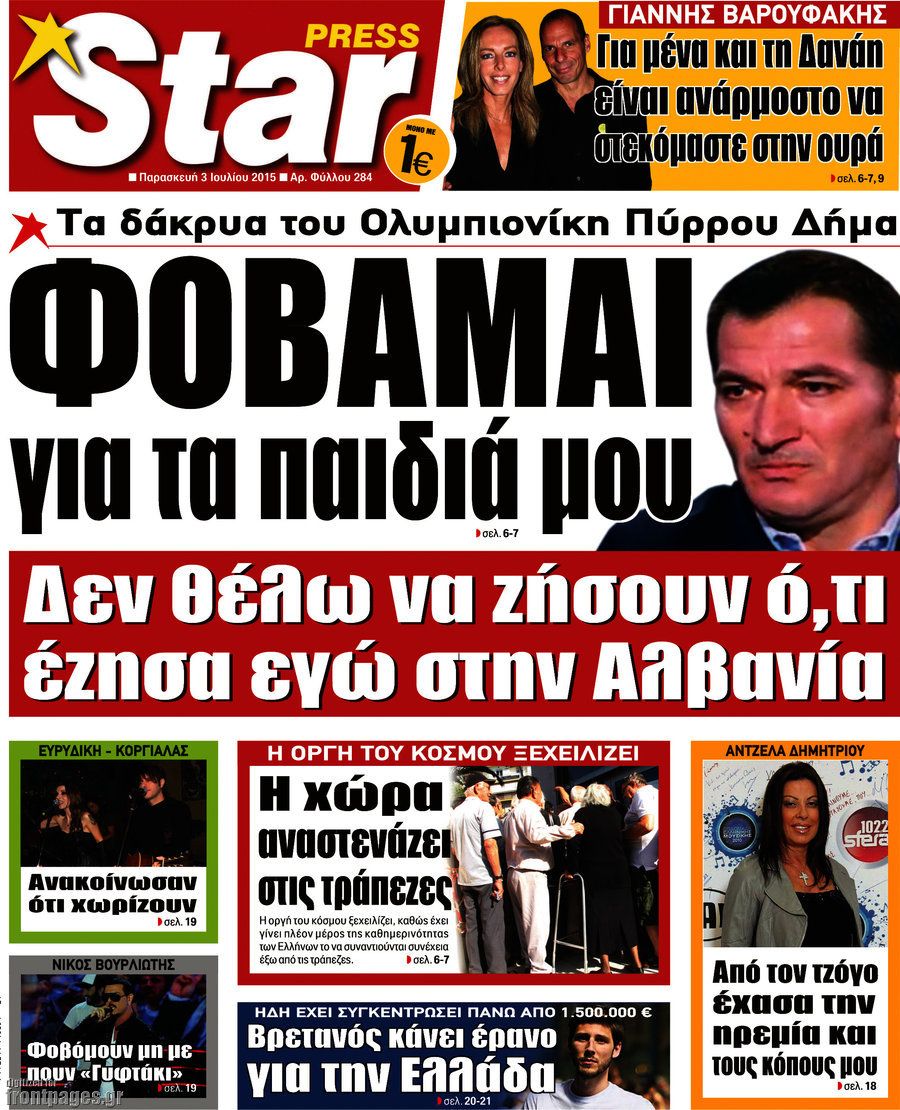 Οι πολιτικές εφημερίδες 3/7/2015 Enikos Newsroom 07:58, Παρασκευή 03 Ιουλίου 2015 Media Διαβάστε τα σημερινά πρωτοσέλιδα των σημερινών πολιτικών εφημερίδων: ΠΟΛΙΤΙΚΕΣ ΕΦΗΜΕΡΙΔΕΣ ΠΡΩΤΟΣΕΛΙΔΑ Μοιράσου το: σχολίασε κι εσύ (0 σχόλια) Ακολουθήστε το enikos.gr στο Google News και μάθετε πρώτοι όλες τις ειδήσεις Δείτε όλες τις τελευταίες ειδήσεις από την Ελλάδα και τον Κόσμο στο enikos.gr Ειδήσεις Ροή Ειδήσεων 4 ώρες πριν Από το Ορμένιο ως τα Μάλγαρα κι από τη Σιάτιστα μέχρι τη Νίκαια: Μπλόκα σε όλη την Ελλάδα – Το Σάββατο ανοίγουν τα διόδια οι αγρότες 1 ώρα πριν Εμπλοκή και αερομαχίες με οπλισμένα τουρκικά F-16 στο Αιγαίο 3 ώρες πριν Αττική: Θρίλερ με νεκρό βρέφος 5 μηνών – Κοιμόταν στο ίδιο κρεβάτι με τους γονείς του 1 ώρα πριν Πούτιν: «Ναι, είμαι ερωτευμένος» – Βίντεο από τη σπάνια προσωπική παραδοχή του 3 ώρες πριν Μεσόγειος: Η διαδρομή του ρωσικού τάνκερ «Qendil» και η στοχευμένη επίθεση της Ουκρανίας με drone – Ο Πούτιν προειδοποίησε για αντίποινα 5 ώρες πριν Τα 5 ζώδια που ευνοούνται στην ερωτική ζωή τους την επόμενη εβδομάδα – «Η ενέργεια του Αιγόκερου φέρνει αγάπη και σταθερότητα» 6 ώρες πριν Αυτό το έξυπνο μαθηματικό κόλπο θα μπορούσε να αλλάξει τον τρόπο με τον οποίο οι επιστήμονες μελετούν τους σεισμούς 2 ώρες πριν Μήπως έχετε χάσει τον εαυτό σας στη σχέση σας; 7 «αθόρυβες» υποχωρήσεις που μάλλον κάνατε, χωρίς να το συνειδητοποιήσετε 4 ώρες πριν Κουίζ για την παλιά Αθήνα: Αναγνωρίζετε την περιοχή; Έχετε περάσει 100% από εκεί 8 λεπτά πριν Μπαράκ Ομπάμα: Τα βιβλία, οι ταινίες και τα τραγούδια που ξεχώρισε το 2025 – Πλήρης λίστα 13 λεπτά πριν Don’t Forget The Lyrics: Η Έλλη Κοκκίνου υποδέχεται 4 παίκτες που θα κάνουν τα πάντα για να μη χάσουν ούτε… μισή λέξη από τους στίχους 19 λεπτά πριν Πλεύρης στον ΑΝΤ1: Η βασική πολιτική που ψηφίστηκε από τους υπουργούς Μετανάστευσης είναι η δημιουργία κέντρων κράτησης μεταναστών στην Αφρική – ΒΙΝΤΕΟ 24 λεπτά πριν Η εξομολόγηση της Νίκης Σερέτη: «Δεν κρύβω ότι ήταν πάρα πολύ δύσκολο όλο αυτό που βίωσα» 29 λεπτά πριν Αγρότες: Κλειστό ξανά το ρεύμα εισόδου στα Μάλγαρα – Άνοιξαν τον κόμβο της Χαλκηδόνας ENIKOS NETWORK Έχετε πραγματικά μεγάλη καρδιά; 10 χαρακτηριστικά όσων έχουν καλοσύνη «Η σούπερ» γρίπη εξαπλώνεται στην Ευρώπη-Στοιχεία από το ECDC για την αποτελεσματικότητα του εμβολίου Επίδομα παιδιού: Πότε ανοίγει ξανά η πλατφόρμα για τις αιτήσεις Προκήρυξη ΑΣΕΠ για 397 μόνιμες προσλήψεις στο Δημόσιο: Βγήκαν τα προσωρινά αποτελέσματα – Πότε αρχίζει η υποβολή ενστάσεων Χαρτογραφώντας το «σημείο χωρίς επιστροφή»: Για πρώτη φορά αποκαλύπτεται με λεπτομέρεια το ακανθώδες όριο της ατμόσφαιρας τ... Η Google καταργεί τη λειτουργία «dark web report» – Πώς θα μπορούν οι χρήστες να διαγράφουν τα δεδομένα τους περισσότερα 20:37 , Παρασκευή 19 Δεκεμβρίου 2025 Don’t Forget The Lyrics: Η Έλλη Κοκκίνου υποδέχεται 4 παίκτες που θα κάνουν τα πάντα για να μη χάσουν ούτε… μισή λέξη από τους στίχους Το «Don’t Forget The Lyrics» επιστρέφει απόψε, Παρασκευή 19 Δεκεμβρίου, στις 21:00 με νέο επει... 19:31 , Παρασκευή 19 Δεκεμβρίου 2025 GNTM: Απόψε ο μεγάλος τελικός για τους 4 φιναλίστ Έπειτα από μήνες γεμάτους μόδα, δημιουργία και έντονες αναμετρήσεις, το GNTM 2025 κορυφώνεται,... 18:11 , Παρασκευή 19 Δεκεμβρίου 2025 Το σόι σου: Ο Άρης έρχεται στην Ελλάδα για τις γιορτές των Χριστουγέννων – Τι θα δούμε στο αποψινό εορταστικό επεισόδιο Ένα απολαυστικό, εορταστικό επεισόδιο της σειράς “Το σόι σου”, γεμάτο ευτράπελα αλ... 15:15 , Παρασκευή 19 Δεκεμβρίου 2025 