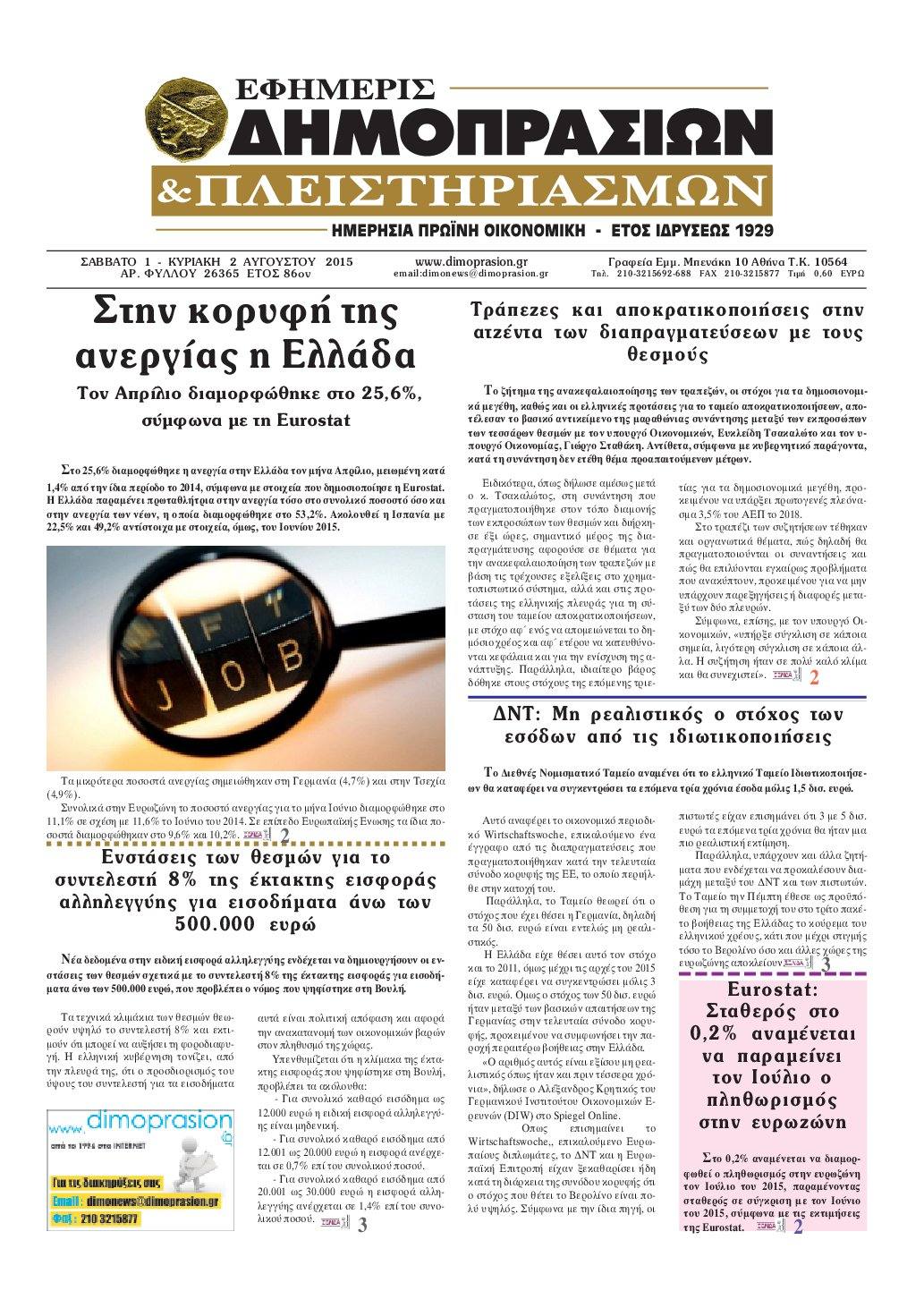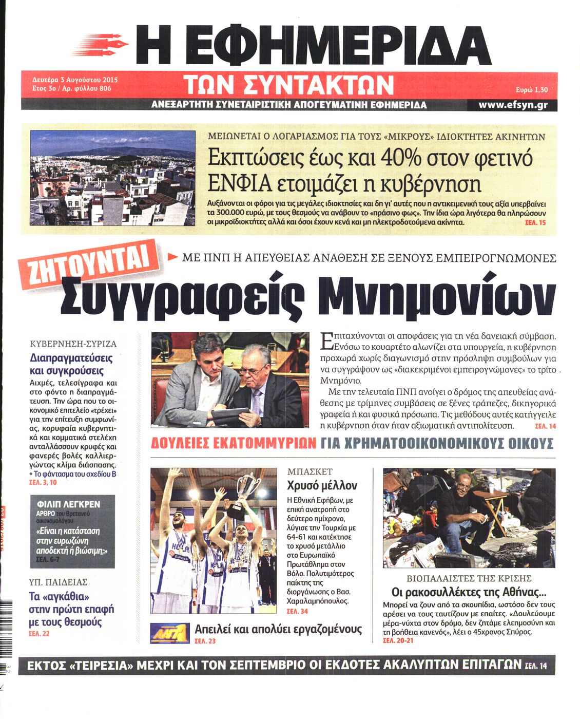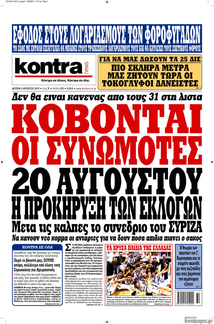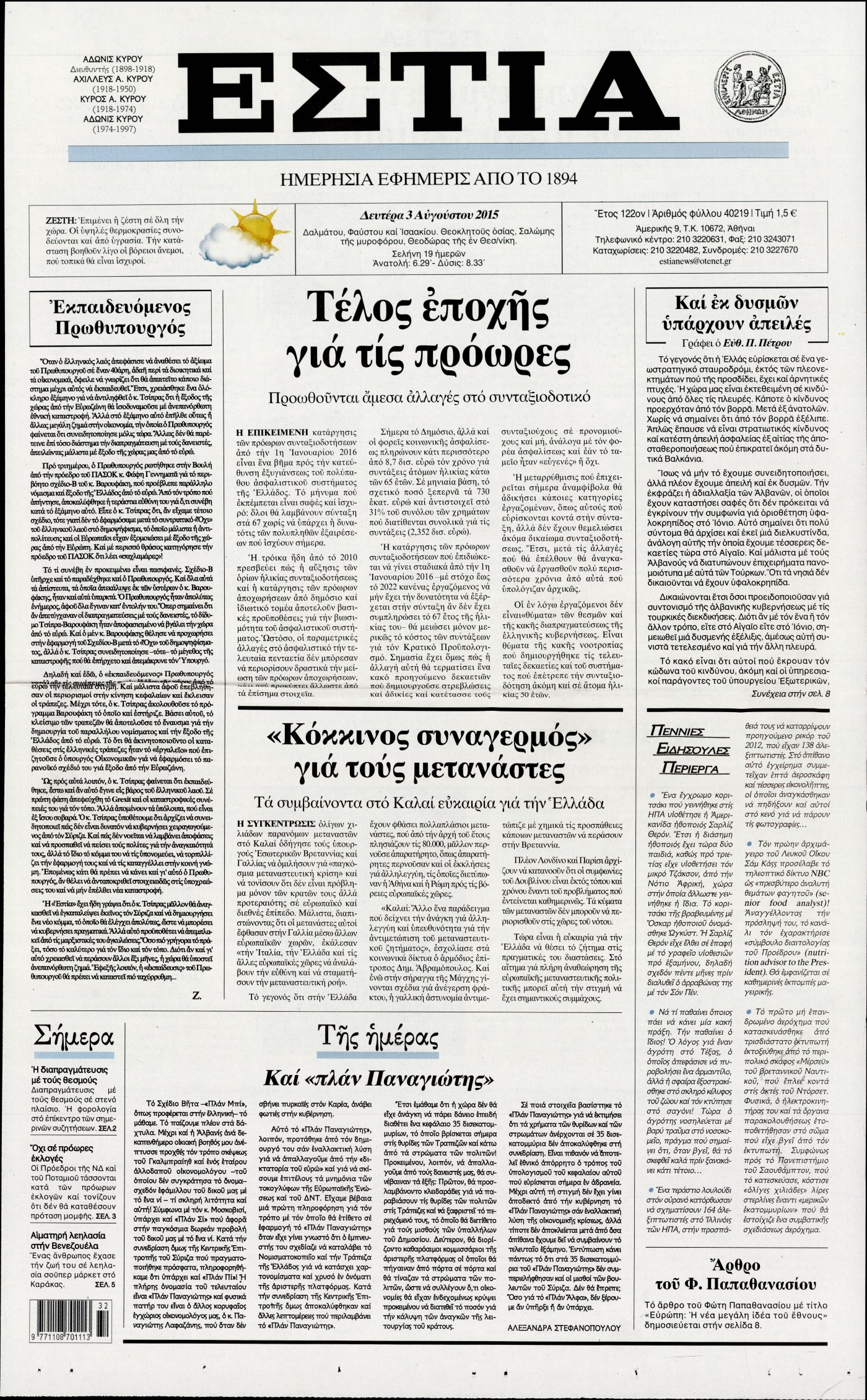 Οι πολιτικές εφημερίδες 3/8/2015 Enikos Newsroom 07:39, Δευτέρα 03 Αυγούστου 2015 Media Διαβάστε τα σημερινά πρωτοσέλιδα των πολιτικών εφημερίδων. ΕΦΗΜΕΡΙΔΕΣ ΠΟΛΙΤΙΚΕΣ ΕΦΗΜΕΡΙΔΕΣ ΠΡΩΤΟΣΕΛΙΔΑ Μοιράσου το: σχολίασε κι εσύ (0 σχόλια) Ακολουθήστε το enikos.gr στο Google News και μάθετε πρώτοι όλες τις ειδήσεις Δείτε όλες τις τελευταίες ειδήσεις από την Ελλάδα και τον Κόσμο στο enikos.gr Ειδήσεις Ροή Ειδήσεων 3 ώρες πριν Υπόθεση Έπσταϊν: Το Υπουργείο Δικαιοσύνης δημοσιοποίησε μια σειρά από εξαιρετικά επεξεργασμένα αρχεία – «Λείπουν τα πιο σημαντικά έγγραφα», λένε οι Δημοκρατικοί 20 λεπτά πριν Γιορτές με μπλόκα για τους αγρότες: Ανοίγουν διόδια και μοιράζουν προϊόντα στους ταξιδιώτες 53 λεπτά πριν Εξαφάνιση 33χρονου γιατρού στην Κρήτη: «Άναψα τα φώτα, τρόμαξε και άρχισε να τρέχει στα χωράφια» – Η τελευταία διαδρομή και η μαρτυρία «κλειδί» 2 ώρες πριν Ο «χάρτης» με τις αυξήσεις και τις φοροελαφρύνσεις του 2026 – Ποιοι και πόσα κερδίζουν 36 λεπτά πριν Τα αρχεία του Έπσταϊν αποκαλύπτουν φωτογραφία του έκπτωτου πρίγκιπα Άντριου – Είναι ξαπλωμένος στην αγκαλιά 5 γυναικών 43 λεπτά πριν Μία νέα «χρυσή» περίοδος αρχίζει για 3 ζώδια από σήμερα – «Μία αναπάντεχη ευκαιρία οδηγεί στην επιτυχία» 5 ώρες πριν Αυγά: Πόσα μπορείτε να τρώτε την ημέρα με ασφάλεια για μέγιστη πρόσληψη πρωτεΐνης 3 ώρες πριν Αρχαιολόγοι ανακάλυψαν σε χωράφι απεικόνιση 600 ετών ενός Αγίου – Τα στοιχεία που δείχνουν ότι μαρτύρησε 2 ώρες πριν Αγχώνεται για το χριστουγεννιάτικο δώρο που πήρε στην πλούσια σύντροφό του – «Φοβάμαι πως θα το βρει φθηνιάρικο, φοράει βραχιόλια Cartier» 5 λεπτά πριν Πώς η κλιματική αλλαγή επηρεάζει εγκύους και βρέφη – Οι επιπτώσεις των υψηλών θερμοκρασιών 12 λεπτά πριν e-ΕΦΚΑ και ΔΥΠΑ: Οι πληρωμές από 22 έως 24 Δεκεμβρίου – Ποιοι θα δουν χρήματα στους λογαριασμούς τους 20 λεπτά πριν Συνελήφθη οδηγός μηχανής που έτρεχε με 161 χλμ στη Συγγρού – Τον έπιασε το ραντάρ της Τροχαίας 20 λεπτά πριν Γιορτές με μπλόκα για τους αγρότες: Ανοίγουν διόδια και μοιράζουν προϊόντα στους ταξιδιώτες 29 λεπτά πριν Τηλεθέαση (19/12): Κυριάρχησε η σειρά «Το σόι σου» – Τι νούμερα έκανε ο τελικός του GNTM ENIKOS NETWORK Είστε μόνιμα απρόσεκτοι; 3 σημάδια που δείχνουν ότι μπορεί να είναι σύμπτωμα πάθησης Πόσα κιλά παίρνουμε πραγματικά τα Χριστούγεννα, σύμφωνα με την επιστήμη – Πώς να το αποτρέψουμε; Επίδομα παιδιού: Τι αλλάζει από το 2026 – Το όφελος από τις φορολογικές ελαφρύνσεις Mega χριστουγεννιάτικη φορολοταρία: «Κλείδωσε» η ημερομηνία για την κλήρωση – Ερωτήσεις και απαντήσεις Χαρτογραφώντας το «σημείο χωρίς επιστροφή»: Για πρώτη φορά αποκαλύπτεται με λεπτομέρεια το ακανθώδες όριο της ατμόσφαιρας τ... Η Google καταργεί τη λειτουργία «dark web report» – Πώς θα μπορούν οι χρήστες να διαγράφουν τα δεδομένα τους περισσότερα 09:30 , Σάββατο 20 Δεκεμβρίου 2025 «Porto Leone: Στη γειτονιά με τα κόκκινα φανάρια» – Ο Χρόνης αποκαλύπτει στην Αλεξάνδρα το μυστικό για το παιδί της Λένας Η μεγάλη δραματική σειρά του Apha «Porto Leone: Στη γειτονιά με τα κόκκινα φανάρια» μας μεταφέ... 08:14 , Σάββατο 20 Δεκεμβρίου 2025 Τρομεροί γονείς: Η Μαρία Καβογιάννη εισβάλλει στο σπίτι της οικογένειας Στεφανίδη Όσα θα δούμε στο νέο διπλό επεισόδιο της σειράς «Τρομεροί γονείς», σήμερα Σάββατο 20 Δεκεμβρίο... 05:48 , Σάββατο 20 Δεκεμβρίου 2025 Οι οικονομικές εφημερίδες 20/12/2025 Διαβάστε τα πρωτοσέλιδα από τις οικονομικές εφημερίδες, σήμερα 20/12/2025. 05:43 , Σάββατο 20 Δεκεμβρίου 2025 Οι αθλητικές εφημερίδες 20/12