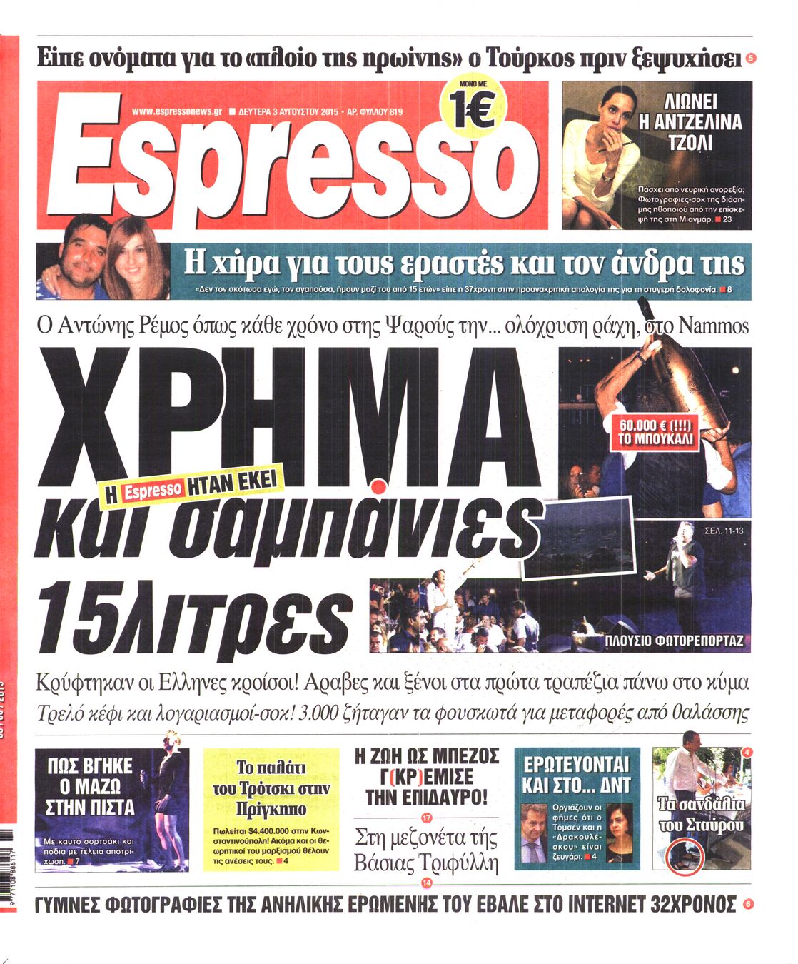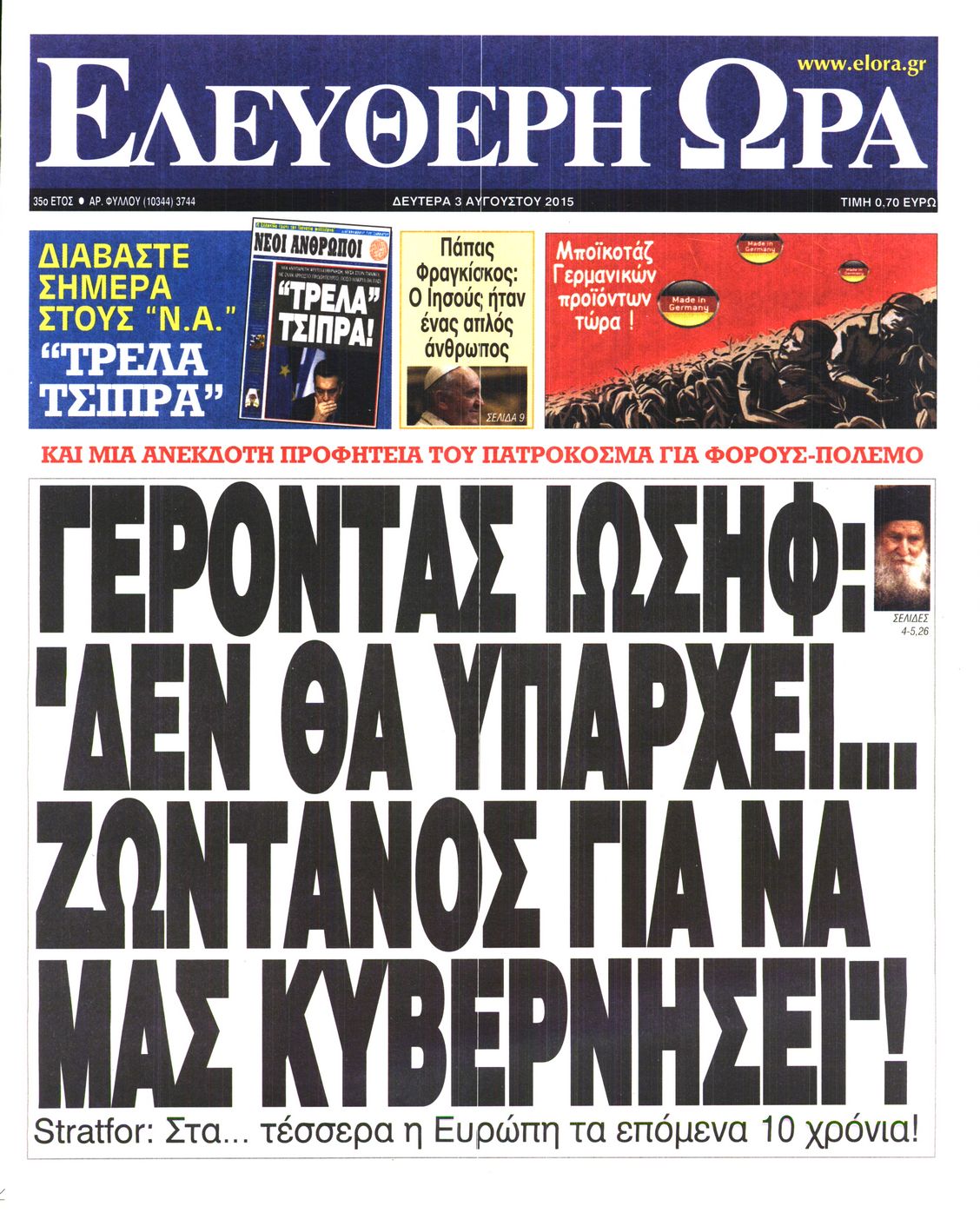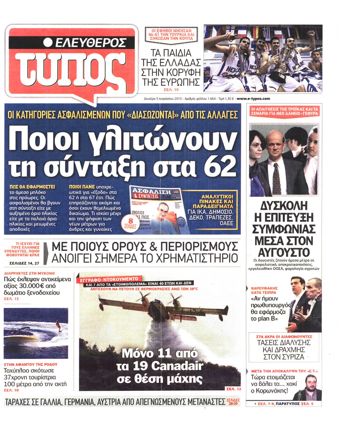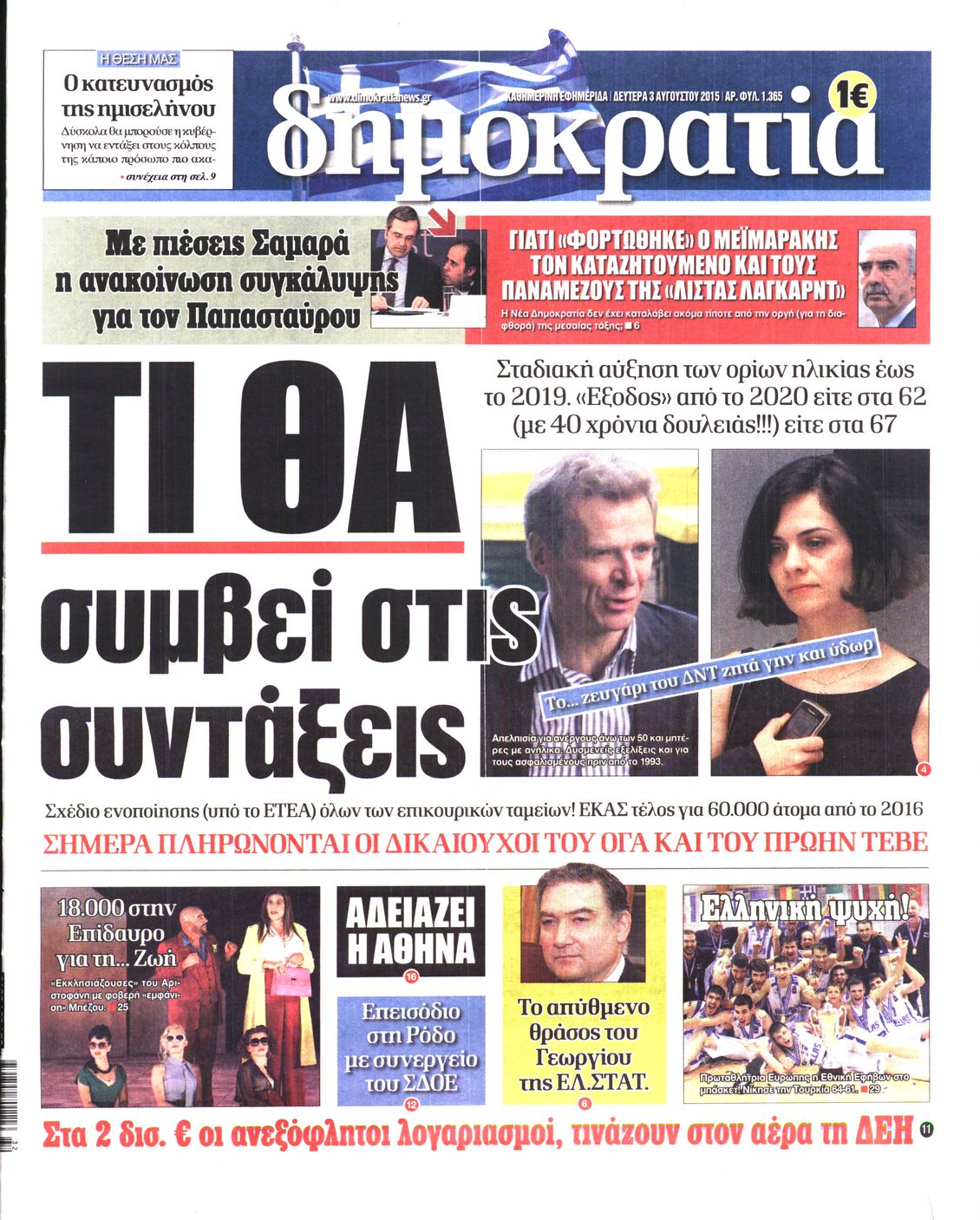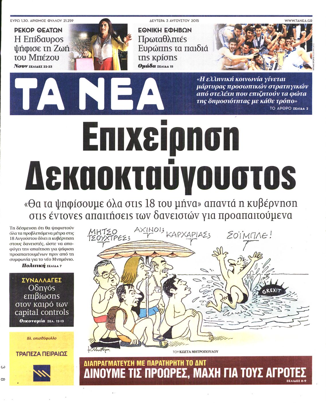 Οι πολιτικές εφημερίδες 3/8/2015 Enikos Newsroom 07:39, Δευτέρα 03 Αυγούστου 2015 Media Διαβάστε τα σημερινά πρωτοσέλιδα των πολιτικών εφημερίδων. ΕΦΗΜΕΡΙΔΕΣ ΠΟΛΙΤΙΚΕΣ ΕΦΗΜΕΡΙΔΕΣ ΠΡΩΤΟΣΕΛΙΔΑ Μοιράσου το: σχολίασε κι εσύ (0 σχόλια) Ακολουθήστε το enikos.gr στο Google News και μάθετε πρώτοι όλες τις ειδήσεις Δείτε όλες τις τελευταίες ειδήσεις από την Ελλάδα και τον Κόσμο στο enikos.gr Ειδήσεις Ροή Ειδήσεων 3 ώρες πριν Υπόθεση Έπσταϊν: Το Υπουργείο Δικαιοσύνης δημοσιοποίησε μια σειρά από εξαιρετικά επεξεργασμένα αρχεία – «Λείπουν τα πιο σημαντικά έγγραφα», λένε οι Δημοκρατικοί 20 λεπτά πριν Γιορτές με μπλόκα για τους αγρότες: Ανοίγουν διόδια και μοιράζουν προϊόντα στους ταξιδιώτες 53 λεπτά πριν Εξαφάνιση 33χρονου γιατρού στην Κρήτη: «Άναψα τα φώτα, τρόμαξε και άρχισε να τρέχει στα χωράφια» – Η τελευταία διαδρομή και η μαρτυρία «κλειδί» 2 ώρες πριν Ο «χάρτης» με τις αυξήσεις και τις φοροελαφρύνσεις του 2026 – Ποιοι και πόσα κερδίζουν 36 λεπτά πριν Τα αρχεία του Έπσταϊν αποκαλύπτουν φωτογραφία του έκπτωτου πρίγκιπα Άντριου – Είναι ξαπλωμένος στην αγκαλιά 5 γυναικών 43 λεπτά πριν Μία νέα «χρυσή» περίοδος αρχίζει για 3 ζώδια από σήμερα – «Μία αναπάντεχη ευκαιρία οδηγεί στην επιτυχία» 5 ώρες πριν Αυγά: Πόσα μπορείτε να τρώτε την ημέρα με ασφάλεια για μέγιστη πρόσληψη πρωτεΐνης 3 ώρες πριν Αρχαιολόγοι ανακάλυψαν σε χωράφι απεικόνιση 600 ετών ενός Αγίου – Τα στοιχεία που δείχνουν ότι μαρτύρησε 2 ώρες πριν Αγχώνεται για το χριστουγεννιάτικο δώρο που πήρε στην πλούσια σύντροφό του – «Φοβάμαι πως θα το βρει φθηνιάρικο, φοράει βραχιόλια Cartier» 5 λεπτά πριν Πώς η κλιματική αλλαγή επηρεάζει εγκύους και βρέφη – Οι επιπτώσεις των υψηλών θερμοκρασιών 12 λεπτά πριν e-ΕΦΚΑ και ΔΥΠΑ: Οι πληρωμές από 22 έως 24 Δεκεμβρίου – Ποιοι θα δουν χρήματα στους λογαριασμούς τους 20 λεπτά πριν Συνελήφθη οδηγός μηχανής που έτρεχε με 161 χλμ στη Συγγρού – Τον έπιασε το ραντάρ της Τροχαίας 20 λεπτά πριν Γιορτές με μπλόκα για τους αγρότες: Ανοίγουν διόδια και μοιράζουν προϊόντα στους ταξιδιώτες 29 λεπτά πριν Τηλεθέαση (19/12): Κυριάρχησε η σειρά «Το σόι σου» – Τι νούμερα έκανε ο τελικός του GNTM ENIKOS NETWORK Είστε μόνιμα απρόσεκτοι; 3 σημάδια που δείχνουν ότι μπορεί να είναι σύμπτωμα πάθησης Πόσα κιλά παίρνουμε πραγματικά τα Χριστούγεννα, σύμφωνα με την επιστήμη – Πώς να το αποτρέψουμε; Επίδομα παιδιού: Τι αλλάζει από το 2026 – Το όφελος από τις φορολογικές ελαφρύνσεις Mega χριστουγεννιάτικη φορολοταρία: «Κλείδωσε» η ημερομηνία για την κλήρωση – Ερωτήσεις και απαντήσεις Χαρτογραφώντας το «σημείο χωρίς επιστροφή»: Για πρώτη φορά αποκαλύπτεται με λεπτομέρεια το ακανθώδες όριο της ατμόσφαιρας τ... Η Google καταργεί τη λειτουργία «dark web report» – Πώς θα μπορούν οι χρήστες να διαγράφουν τα δεδομένα τους περισσότερα 09:30 , Σάββατο 20 Δεκεμβρίου 2025 «Porto Leone: Στη γειτονιά με τα κόκκινα φανάρια» – Ο Χρόνης αποκαλύπτει στην Αλεξάνδρα το μυστικό για το παιδί της Λένας Η μεγάλη δραματική σειρά του Apha «Porto Leone: Στη γειτονιά με τα κόκκινα φανάρια» μας μεταφέ... 08:14 , Σάββατο 20 Δεκεμβρίου 2025 Τρομεροί γονείς: Η Μαρία Καβογιάννη εισβάλλει στο σπίτι της οικογένειας Στεφανίδη Όσα θα δούμε στο νέο διπλό επεισόδιο της σειράς «Τρομεροί γονείς», σήμερα Σάββατο 20 Δεκεμβρίο... 05:48 , Σάββατο 20 Δεκεμβρίου 2025 Οι οικονομικές εφημερίδες 20/12/2025 Διαβάστε τα πρωτοσέλιδα από τις οικονομικές εφημερίδες, σήμερα 20/12/2025. 05:43 , Σάββατο 20 Δεκεμβρίου 2025 Οι αθλητικές εφημερίδες 20/12