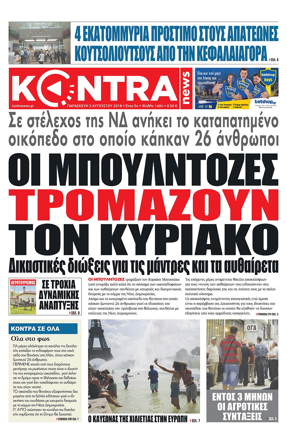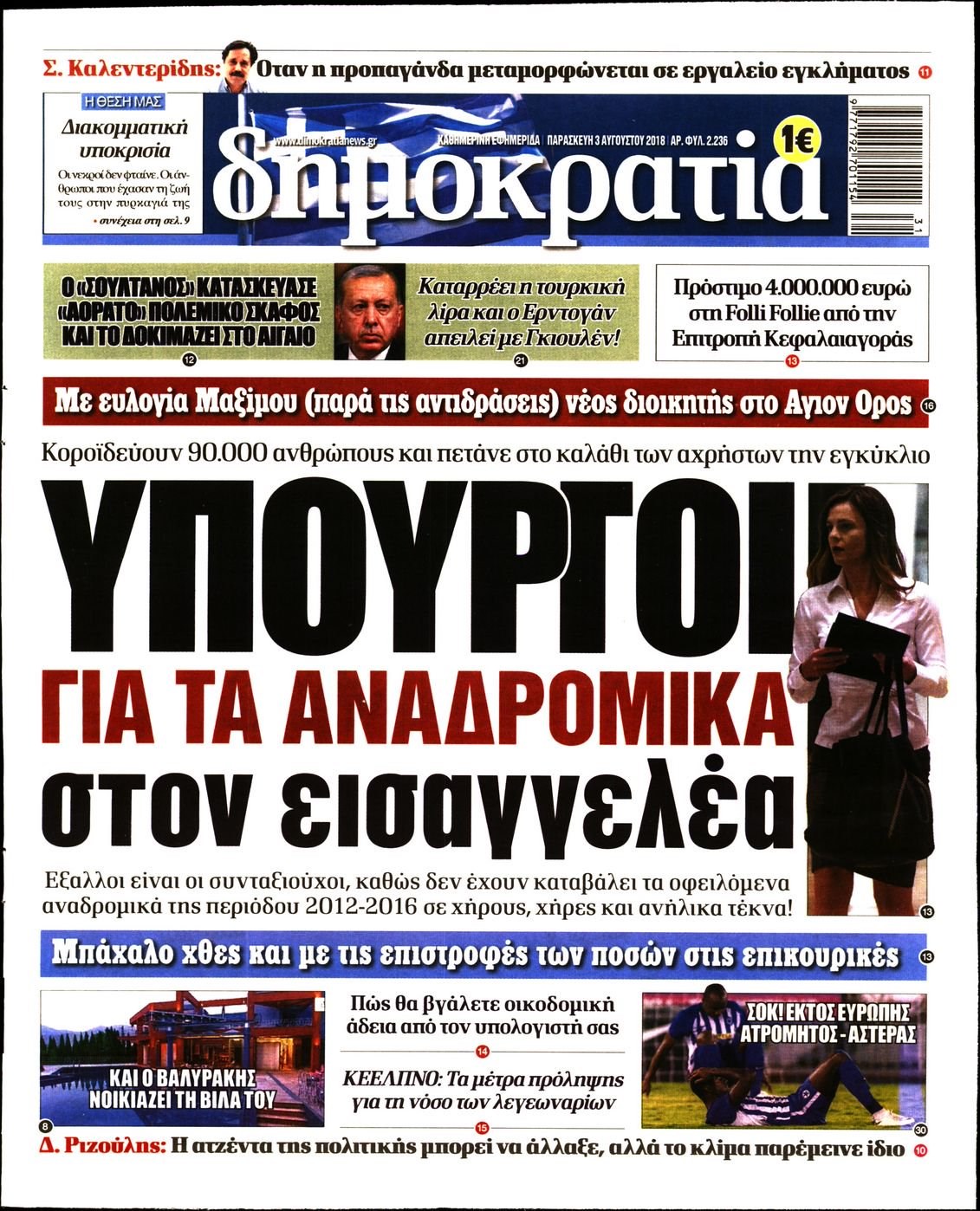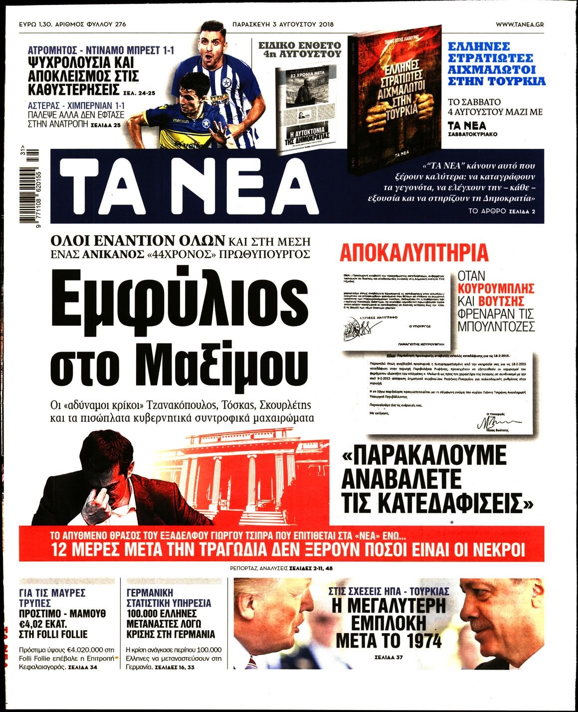 Οι πολιτικές εφημερίδες 3/8/2018 Enikos Newsroom 06:28, Παρασκευή 03 Αυγούστου 2018 Media Διαβάστε τα σημερινά πρωτοσέλιδα των πολιτικών εφημερίδων. ΠΟΛΙΤΙΚΕΣ ΕΦΗΜΕΡΙΔΕΣ ΠΡΩΤΟΣΕΛΙΔΑ Μοιράσου το: σχολίασε κι εσύ (0 σχόλια) Ακολουθήστε το enikos.gr στο Google News και μάθετε πρώτοι όλες τις ειδήσεις Δείτε όλες τις τελευταίες ειδήσεις από την Ελλάδα και τον Κόσμο στο enikos.gr Ειδήσεις Ροή Ειδήσεων 5 ώρες πριν Χριστούγεννα στα μπλόκα οι αγρότες: Άνοιξαν στα διόδια και μοίρασαν προϊόντα στους πολίτες – Νέα σύσκεψη την Κυριακή στη Νίκαια 5 ώρες πριν Κύκλωμα διακίνησης ναρκωτικών σε σχολεία: Τηλεφωνούσαν στους ανηλίκους την ώρα του μαθήματος – Οι διάλογοι-σοκ, τα «ψευδώνυμα» και τα βασανιστήρια 4 ώρες πριν Αρχεία Επστάιν: Οι 500 σελίδες που λείπουν, τα αναπάντητα ερωτήματα και οι επώνυμοι – Τι έπεται 6 ώρες πριν Ζελένσκι: Μόνο οι ΗΠΑ και ο Τραμπ μπορούν να πιέσουν τη Ρωσία να βάλει τέλος στον πόλεμο 6 ώρες πριν Φοινικούντα: Προφυλακιστέος ο 30χρονος για συνέργεια στη διπλή δολοφονία – Και άλλα πρόσωπα στο «μικροσκόπιο» 4 ώρες πριν Αποκαλύφθηκε το άγνωστο «GPS» της αρχαιότητας – Πώς οι ναοί «φώτιζαν» τον δρόμο των ναυτικών πριν από την εφεύρεση των φάρων 5 ώρες πριν Ύπνος: Η διατροφή που μπορεί να σας βοηθήσει να κοιμάστε καλύτερα και να ζήσετε περισσότερο 6 ώρες πριν Αριθμολογία: Ο αριθμός του φύλακα αγγέλου σας, με βάση τον μήνα γέννησής σας – «Έτσι σας στέλνει σημάδια το σύμπαν» 18 ώρες πριν Enerwave: Το νέο «ρεύμα» στη λιανική ενέργειας που αλλάζει την εμπειρία του καταναλωτή 17 λεπτά πριν Κηφισιά: Το συγκινητικό «Last dance» του Ανδρέα Τεττέη – «Λύγισε» στην τελευταία του συνέντευξη ως παίκτης της ομάδας των βορείων προαστίων 32 λεπτά πριν Οι «εποικοδομητικές» συνομιλίες Ρωσίας – ΗΠΑ στο Μαϊάμι θα συνεχιστούν σήμερα, λέει με τον Ρώσο απεσταλμένος Ντμίτριεφ 47 λεπτά πριν La Liga: Η Ρεάλ νίκησε την Σεβίλλη στην ιστορική βραδιά του Κίλιαν Εμπαπέ – Αποβλήθηκε ο Ματίας Αλμέιδα 1 ώρα πριν Δυτική Όχθη: Δύο Παλαιστίνιοι νεκροί από σφαίρες του Ισραηλινού στρατού 1 ώρα πριν Ένοχος ο 54χρονος «ερευνητής» που έταζε ότι θα εντοπίσει τον αγνοούμενο γιατρό από την Κρήτη – «Μας γέμισε φρούδες ελπίδες», λέει ο πατέρας του 33χρονου ENIKOS NETWORK Οι γυναίκες αποκαλύπτουν το πιο ελκυστικό πράγμα που μπορεί να κάνει ένας άνδρας Ομορφιά και αντιγήρανση: Ειδικοί μιλούν για συσκευές περιποίησης του δέρματος «Πολεμική» προετοιμασία από την ευρωπαϊκή βιομηχανία ενέργειας – Η Eurelectric ζητεί «ομπρέλα» προστασίας για τις υποδομές Ακύρωση ΑΦΜ για απάτες – Ποιους βάζει στο στόχαστρο η ΑΑΔΕ Χαρτογραφώντας το «σημείο χωρίς επιστροφή»: Για πρώτη φορά αποκαλύπτεται με λεπτομέρεια το ακανθώδες όριο της ατμόσφαιρας τ... Η Google καταργεί τη λειτουργία «dark web report» – Πώς θα μπορούν οι χρήστες να διαγράφουν τα δεδομένα τους περισσότερα 01:30 , Κυριακή 21 Δεκεμβρίου 2025 Άννα Βίσση: Τα… Social Media «προσκύνησαν» την «απόλυτη» για την συναυλία της στο Καλλιμάρμαρο που προβλήθηκε από το Mega Την ημέρα των γενεθλίων της Άννας Βίσση, το MEGA τίμησε τη διαχρονική παρουσία της «απόλυτης Ε... 00:00 , Κυριακή 21 Δεκεμβρίου 2025 The Voice: Η επιστροφή της Έλενας Παπαρίζου και η ατάκα του Γιώργου Μαζωνάκη μετά τις καταγγελίες Στη φάση των Cross Battles Live μπήκε το The Voice, με την Έλενα Παπαρίζου να επιστρέφει στο π... 20:30 , Σάββατο 20 Δεκεμβρίου 2025 Αυτή την Κυριακή με τη Realnews: Instyle, μαζί Drive και Realnews Geopolitics Αυτή την Κυριακή με τη Realnews: Instyle, μαζί Drive και Realnews Geopolitics Instyle Η Άννα Ρ... 20:28 , Σάβ