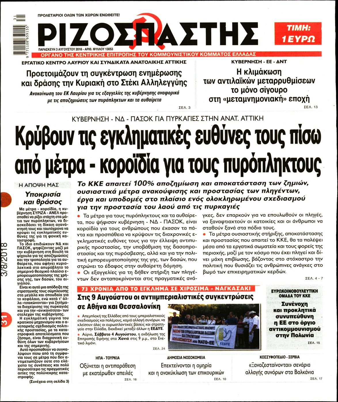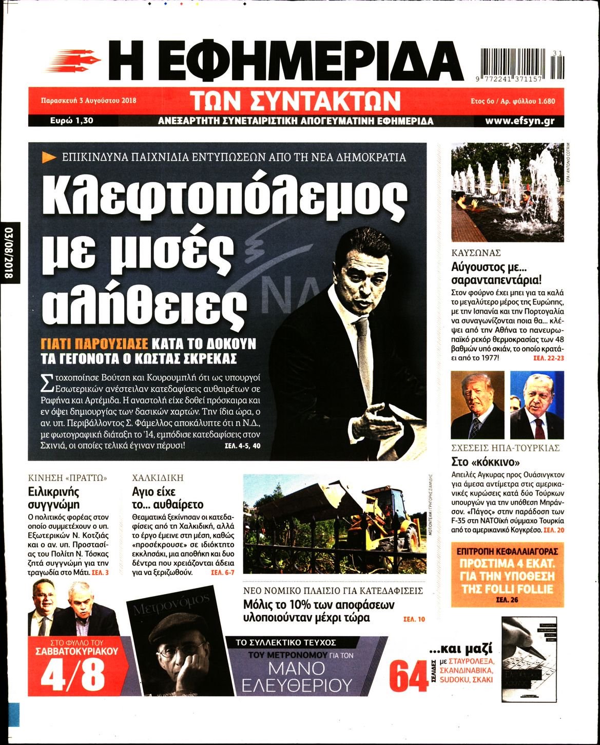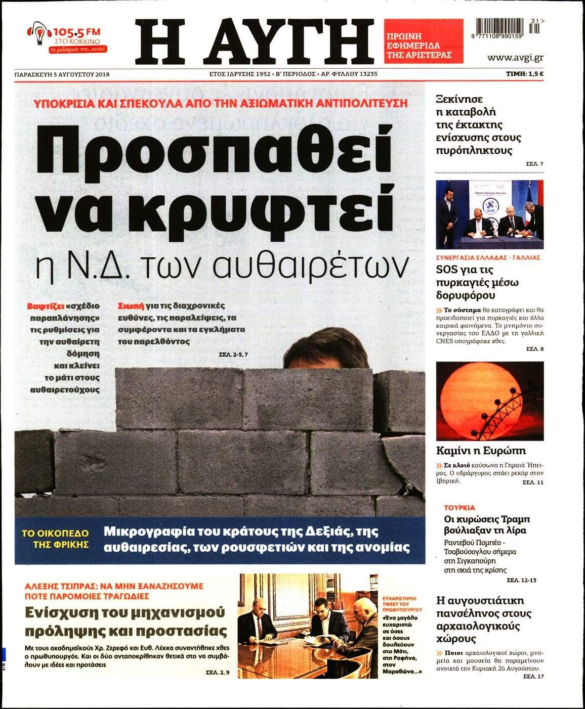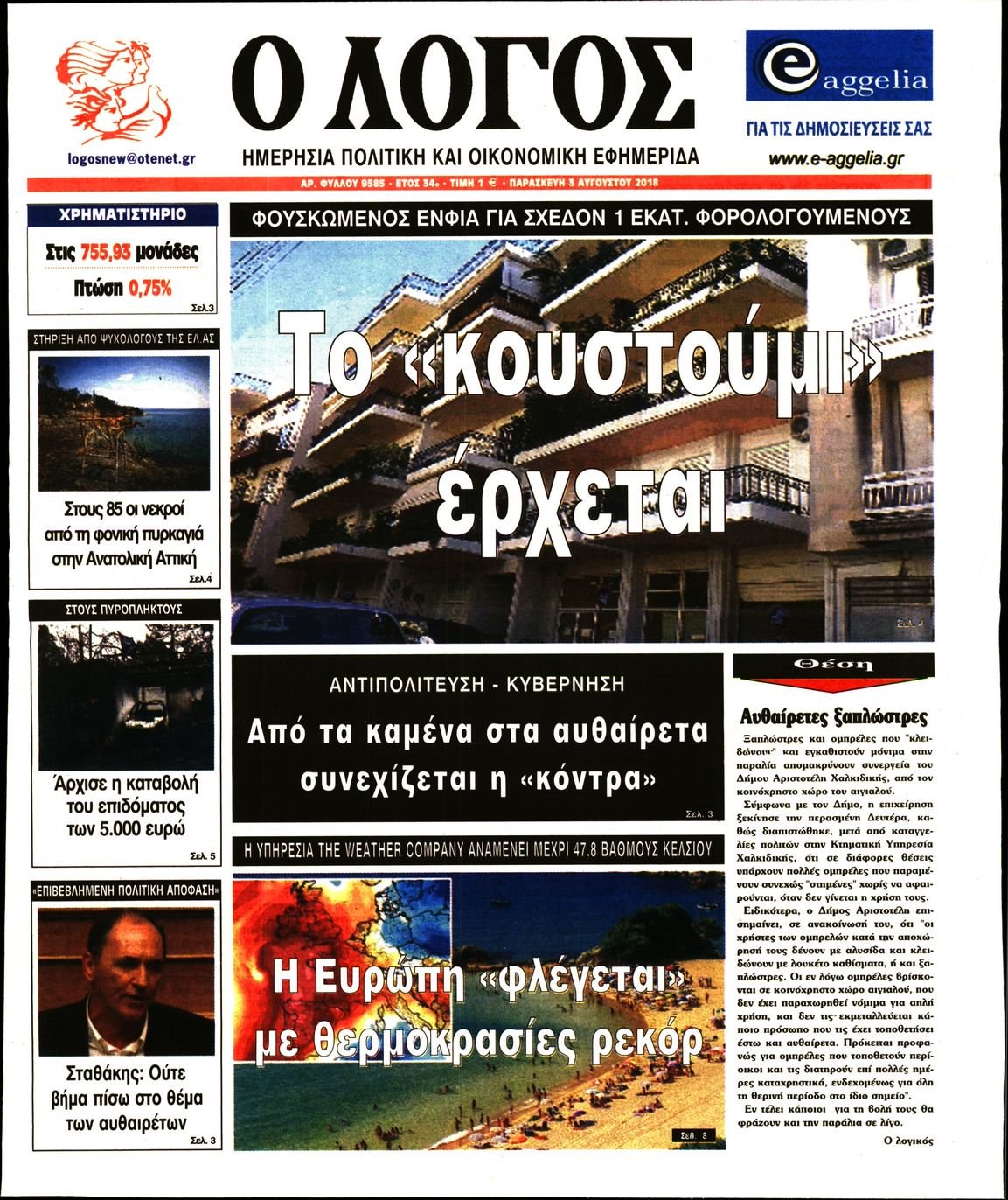 Οι πολιτικές εφημερίδες 3/8/2018 Enikos Newsroom 06:28, Παρασκευή 03 Αυγούστου 2018 Media Διαβάστε τα σημερινά πρωτοσέλιδα των πολιτικών εφημερίδων. ΠΟΛΙΤΙΚΕΣ ΕΦΗΜΕΡΙΔΕΣ ΠΡΩΤΟΣΕΛΙΔΑ Μοιράσου το: σχολίασε κι εσύ (0 σχόλια) Ακολουθήστε το enikos.gr στο Google News και μάθετε πρώτοι όλες τις ειδήσεις Δείτε όλες τις τελευταίες ειδήσεις από την Ελλάδα και τον Κόσμο στο enikos.gr Ειδήσεις Ροή Ειδήσεων 5 ώρες πριν Χριστούγεννα στα μπλόκα οι αγρότες: Άνοιξαν στα διόδια και μοίρασαν προϊόντα στους πολίτες – Νέα σύσκεψη την Κυριακή στη Νίκαια 5 ώρες πριν Κύκλωμα διακίνησης ναρκωτικών σε σχολεία: Τηλεφωνούσαν στους ανηλίκους την ώρα του μαθήματος – Οι διάλογοι-σοκ, τα «ψευδώνυμα» και τα βασανιστήρια 4 ώρες πριν Αρχεία Επστάιν: Οι 500 σελίδες που λείπουν, τα αναπάντητα ερωτήματα και οι επώνυμοι – Τι έπεται 6 ώρες πριν Ζελένσκι: Μόνο οι ΗΠΑ και ο Τραμπ μπορούν να πιέσουν τη Ρωσία να βάλει τέλος στον πόλεμο 6 ώρες πριν Φοινικούντα: Προφυλακιστέος ο 30χρονος για συνέργεια στη διπλή δολοφονία – Και άλλα πρόσωπα στο «μικροσκόπιο» 4 ώρες πριν Αποκαλύφθηκε το άγνωστο «GPS» της αρχαιότητας – Πώς οι ναοί «φώτιζαν» τον δρόμο των ναυτικών πριν από την εφεύρεση των φάρων 5 ώρες πριν Ύπνος: Η διατροφή που μπορεί να σας βοηθήσει να κοιμάστε καλύτερα και να ζήσετε περισσότερο 6 ώρες πριν Αριθμολογία: Ο αριθμός του φύλακα αγγέλου σας, με βάση τον μήνα γέννησής σας – «Έτσι σας στέλνει σημάδια το σύμπαν» 18 ώρες πριν Enerwave: Το νέο «ρεύμα» στη λιανική ενέργειας που αλλάζει την εμπειρία του καταναλωτή 17 λεπτά πριν Κηφισιά: Το συγκινητικό «Last dance» του Ανδρέα Τεττέη – «Λύγισε» στην τελευταία του συνέντευξη ως παίκτης της ομάδας των βορείων προαστίων 32 λεπτά πριν Οι «εποικοδομητικές» συνομιλίες Ρωσίας – ΗΠΑ στο Μαϊάμι θα συνεχιστούν σήμερα, λέει με τον Ρώσο απεσταλμένος Ντμίτριεφ 47 λεπτά πριν La Liga: Η Ρεάλ νίκησε την Σεβίλλη στην ιστορική βραδιά του Κίλιαν Εμπαπέ – Αποβλήθηκε ο Ματίας Αλμέιδα 1 ώρα πριν Δυτική Όχθη: Δύο Παλαιστίνιοι νεκροί από σφαίρες του Ισραηλινού στρατού 1 ώρα πριν Ένοχος ο 54χρονος «ερευνητής» που έταζε ότι θα εντοπίσει τον αγνοούμενο γιατρό από την Κρήτη – «Μας γέμισε φρούδες ελπίδες», λέει ο πατέρας του 33χρονου ENIKOS NETWORK Οι γυναίκες αποκαλύπτουν το πιο ελκυστικό πράγμα που μπορεί να κάνει ένας άνδρας Ομορφιά και αντιγήρανση: Ειδικοί μιλούν για συσκευές περιποίησης του δέρματος «Πολεμική» προετοιμασία από την ευρωπαϊκή βιομηχανία ενέργειας – Η Eurelectric ζητεί «ομπρέλα» προστασίας για τις υποδομές Ακύρωση ΑΦΜ για απάτες – Ποιους βάζει στο στόχαστρο η ΑΑΔΕ Χαρτογραφώντας το «σημείο χωρίς επιστροφή»: Για πρώτη φορά αποκαλύπτεται με λεπτομέρεια το ακανθώδες όριο της ατμόσφαιρας τ... Η Google καταργεί τη λειτουργία «dark web report» – Πώς θα μπορούν οι χρήστες να διαγράφουν τα δεδομένα τους περισσότερα 01:30 , Κυριακή 21 Δεκεμβρίου 2025 Άννα Βίσση: Τα… Social Media «προσκύνησαν» την «απόλυτη» για την συναυλία της στο Καλλιμάρμαρο που προβλήθηκε από το Mega Την ημέρα των γενεθλίων της Άννας Βίσση, το MEGA τίμησε τη διαχρονική παρουσία της «απόλυτης Ε... 00:00 , Κυριακή 21 Δεκεμβρίου 2025 The Voice: Η επιστροφή της Έλενας Παπαρίζου και η ατάκα του Γιώργου Μαζωνάκη μετά τις καταγγελίες Στη φάση των Cross Battles Live μπήκε το The Voice, με την Έλενα Παπαρίζου να επιστρέφει στο π... 20:30 , Σάββατο 20 Δεκεμβρίου 2025 Αυτή την Κυριακή με τη Realnews: Instyle, μαζί Drive και Realnews Geopolitics Αυτή την Κυριακή με τη Realnews: Instyle, μαζί Drive και Realnews Geopolitics Instyle Η Άννα Ρ... 20:28 , Σάβ