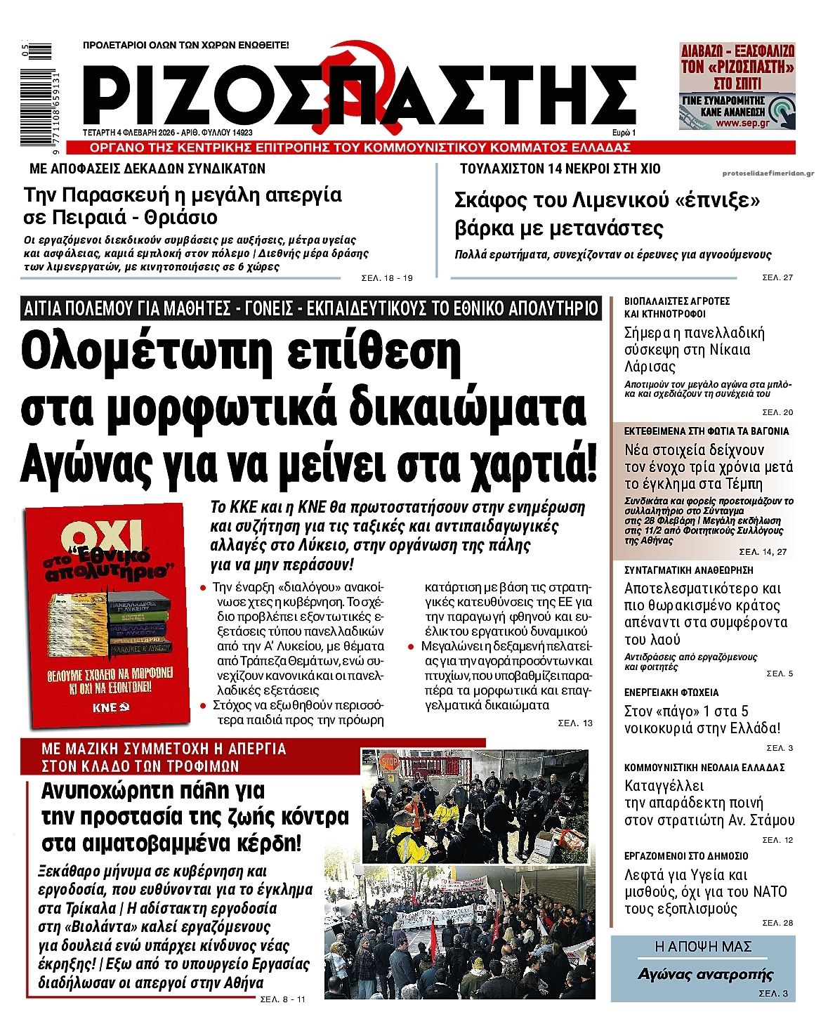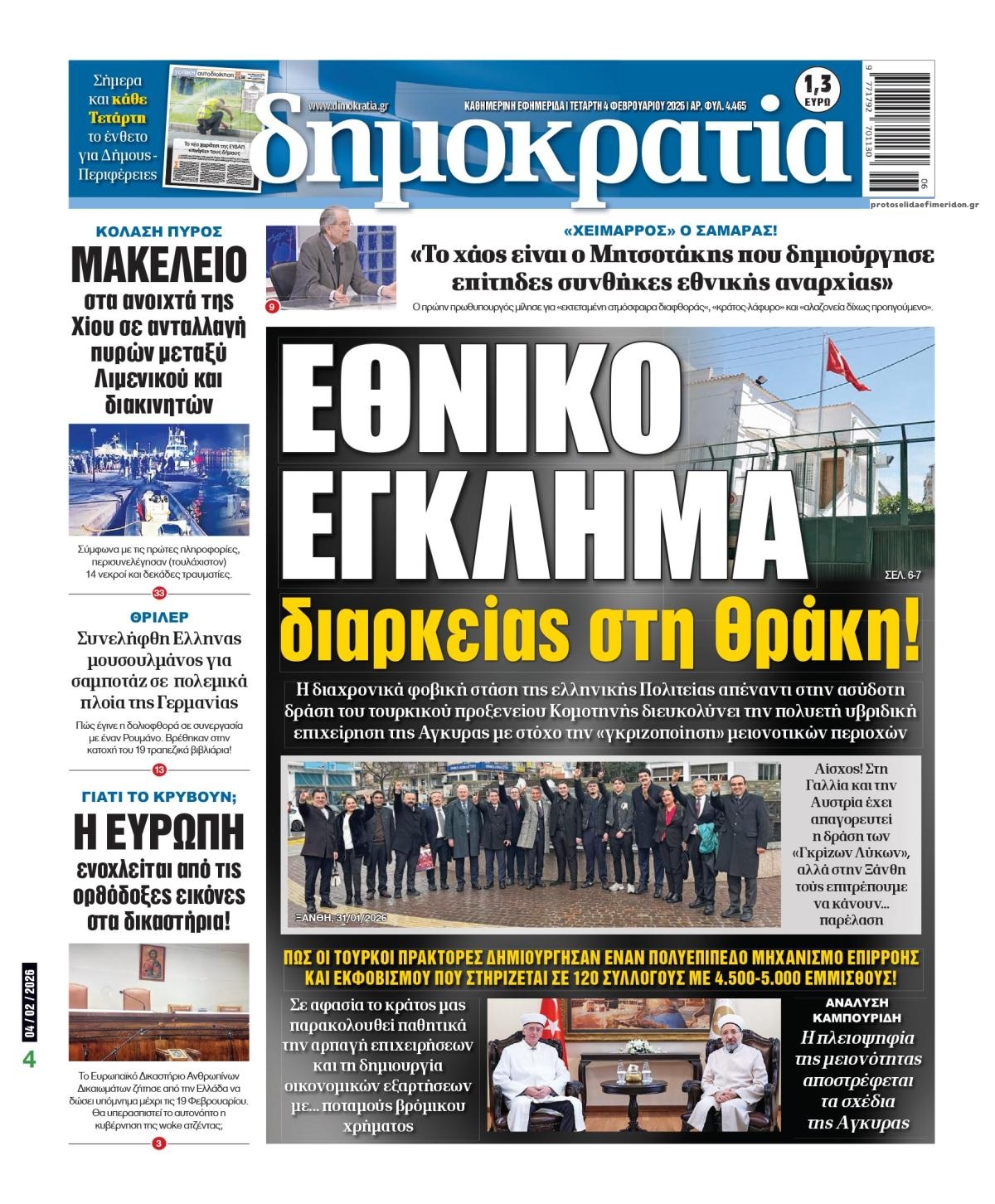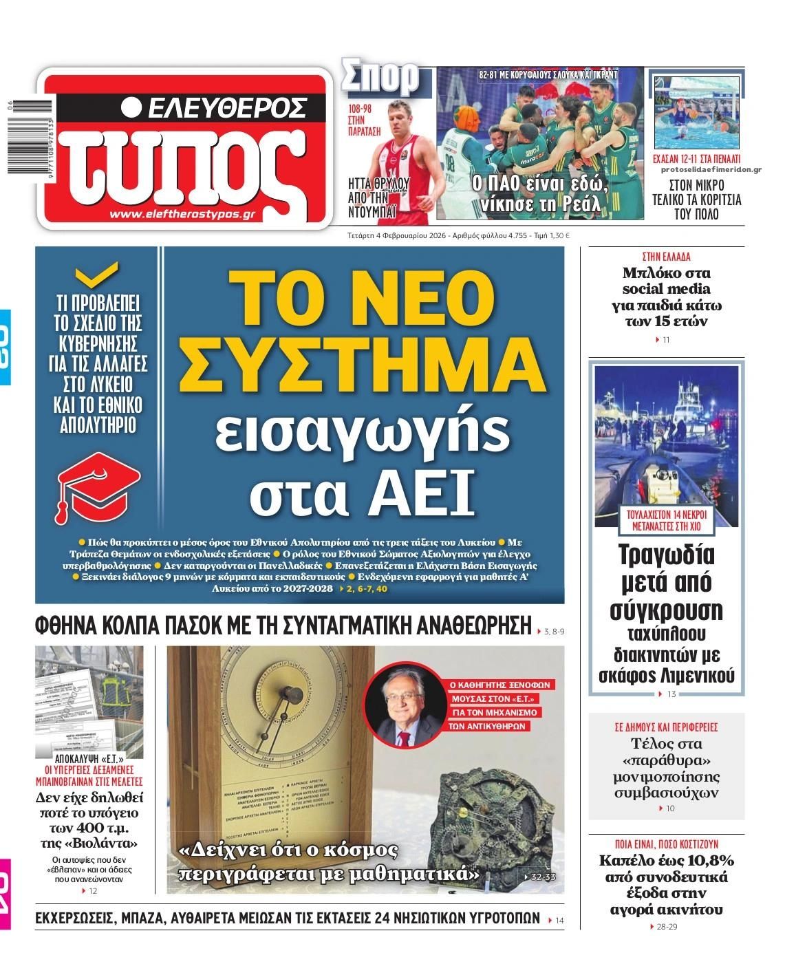 Οι πολιτικές εφημερίδες 4/2/2026 Enikos Newsroom 05:38, Τετάρτη 04 Φεβρουαρίου 2026 Media Διαβάστε τα πρωτοσέλιδα από τις πολιτικές εφημερίδες, σήμερα 4/2/2026. ΕΦΗΜΕΡΙΔΕΣ ΠΟΛΙΤΙΚΕΣ ΕΦΗΜΕΡΙΔΕΣ ΠΡΩΤΟΣΕΛΙΔΑ Μοιράσου το: Χίος: 15 νεκροί και πολλοί τραυματίες μετά το σοβαρό επεισόδιο Λιμενικού και σκάφους διακινητών Ντόναλντ Τραμπ: Τερμάτισε το shutdown – Υπέγραψε το νομοσχέδιο που βάζει τέλος στη δημοσιονομική παράλυση Ο Ντόναλντ Τραμπ δήλωσε ότι ο Πούτιν «κράτησε τον λόγο του» για εβδομαδιαία εκεχειρία στην Ουκρανία, παρά τα χθεσινά χτυπήματα σχολίασε κι εσύ (0 σχόλια) Ακολουθήστε το enikos.gr στο Google News και μάθετε πρώτοι όλες τις ειδήσεις Δείτε όλες τις τελευταίες ειδήσεις από την Ελλάδα και τον Κόσμο στο enikos.gr Ειδήσεις Ροή Ειδήσεων 7 ώρες πριν Χίος: 15 νεκροί και πολλοί τραυματίες μετά το σοβαρό επεισόδιο Λιμενικού και σκάφους διακινητών 8 ώρες πριν Δολοφονία στη Νέα Πέραμο: Στο «μικροσκόπιο» των Αρχών η τεράστια περιουσία του 27χρονου – Η κατάθεση της συντρόφου του και όσα λένε συγγενικά του πρόσωπα 8 ώρες πριν Υπόθεση Επστάιν: Η σαπίλα που αναδύεται έχει βαθιές ρίζες – Η Αμερική πρέπει τώρα να αναρωτηθεί αν μπορεί να ξεπεράσει μια κουλτούρα ντροπής 8 ώρες πριν Πέπλο μυστηρίου γύρω από την εξαφάνιση της 16χρονης Λόρας – Ο άνδρας που βρέθηκε μαζί της στην πτήση, ο «αυταρχικός» πατέρας και η αντίδραση του αδελφού της 10 ώρες πριν Κλειστό για τρεις ημέρες το Ειδικό Σχολείο Σάμου: «Κάθε έλλειψη είναι κίνδυνος», λένε οι γονείς – Τι υποστηρίζει ο Δήμος 58 λεπτά πριν Οπτική ψευδαίσθηση: Μόνο αν είσαι ο Σέρλοκ Χολμς θα βρεις το ζώο σε 15 δευτερόλεπτα 1 ώρα πριν Το μπαχαρικό που «θωρακίζει» την υγεία: Μειώνει την χοληστερίνη και τον κίνδυνο καρκίνου 4 ώρες πριν Τα ζώδια σήμερα, Τετάρτη 4 Φεβρουαρίου 2026: Ζυγοί, τιμήστε την ανάγκη σας για αναζωογόνηση 8 ώρες πριν «Χρυσή» αρχαιολογική ανακάλυψη σε χωριό – Βρέθηκε αριστοκρατικός οικισμός σε κτήματα θρυλικού βασιλιά 47 λεπτά πριν Αυτή την Κυριακή με τη Realnews: Τίτλοι τέλους – Ένα ψυχολογικό θρίλερ γεμάτο μυστήριο, ανατροπές και σκοτεινά μυστικά από τον βραβευμένο συγγραφέα M.J. Trow 4 λεπτά πριν Εορτολόγιο: Ποιοι γιορτάζουν σήμερα 4 Φεβρουαρίου 13 λεπτά πριν Την Κυριακή με τη Realnews: Ό,τι και αν αγοράσεις, σκανάρεις και κερδίζεις! 33 λεπτά πριν ΔΕΔΔΗΕ: Διακοπές ρεύματος σήμερα (4/2) στην Αθήνα και σε άλλες 15 περιοχές της Αττικής 34 λεπτά πριν Διαπραγματεύσεις Ουκρανίας – Ρωσίας – ΗΠΑ ξεκινούν σήμερα στο Άμπου Ντάμπι υπό το βάρος των ρωσικών επιθέσεων ENIKOS NETWORK Ώρα να δείξετε την «αετίσια» σας όραση – Βρείτε το διαφορετικό φλαμίνγκο που είναι κρυμμένο στη φωτογραφία σε 39 δεύτερα Ο ιερός καρπός του Αμαζονίου που είναι πλούσιος σε σελήνιο και μπορεί να ενισχύσει τον θυρεοειδή ΕΑΕΕ: Άνοδος στην παραγωγή ασφαλίστρων το ενδεκάμηνο του 2025 – Τι δείχνουν τα στοιχεία Κενές περισσότερες από 70.000 θέσεις εργασίας στον γεωργικό τομέα – «Περίπου το 10% του καρπού της ελιάς έχει μείνει στα δέ... Ευπάθεια στο moltbook ai αποκαλύπτει email, tokens σύνδεσης και api keys Αυτός είναι ο ρόλος της μικρής τρύπας στους νυχοκόπτες – «Είμαι ο μόνος που δεν το ήξερε;»» περισσότερα 02:33 , Τετάρτη 04 Φεβρουαρίου 2026 MasterChef: Λύγισε ο Γιώργος Αχλαδιώτης – «Κερδίζω, συγκινούμαι… Τώρα θα τους δείξω τι αξίζω» Το πρώτο Τεστ Δημιουργικότητας του MasterChef ολοκληρώθηκε με έναν ξεκάθαρο πρωταγωνιστή. Ο Γι... 21:33 , Τρίτη 03 Φεβρουαρίου 2026 Porto Leone: Στη γειτονιά με τα κόκκινα φανάρια – Η Ασημίνα αποκαλύπτει στην Αλ