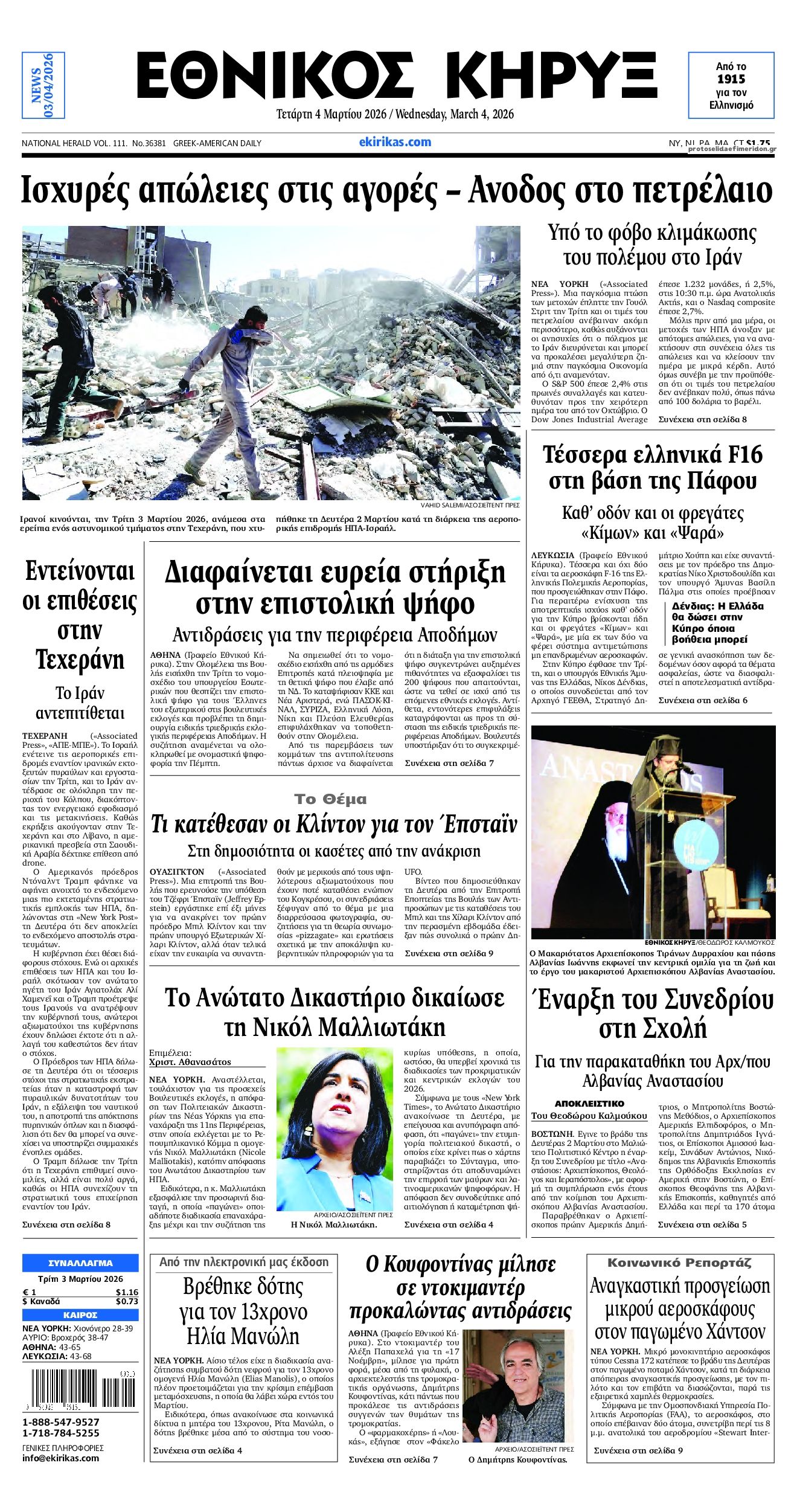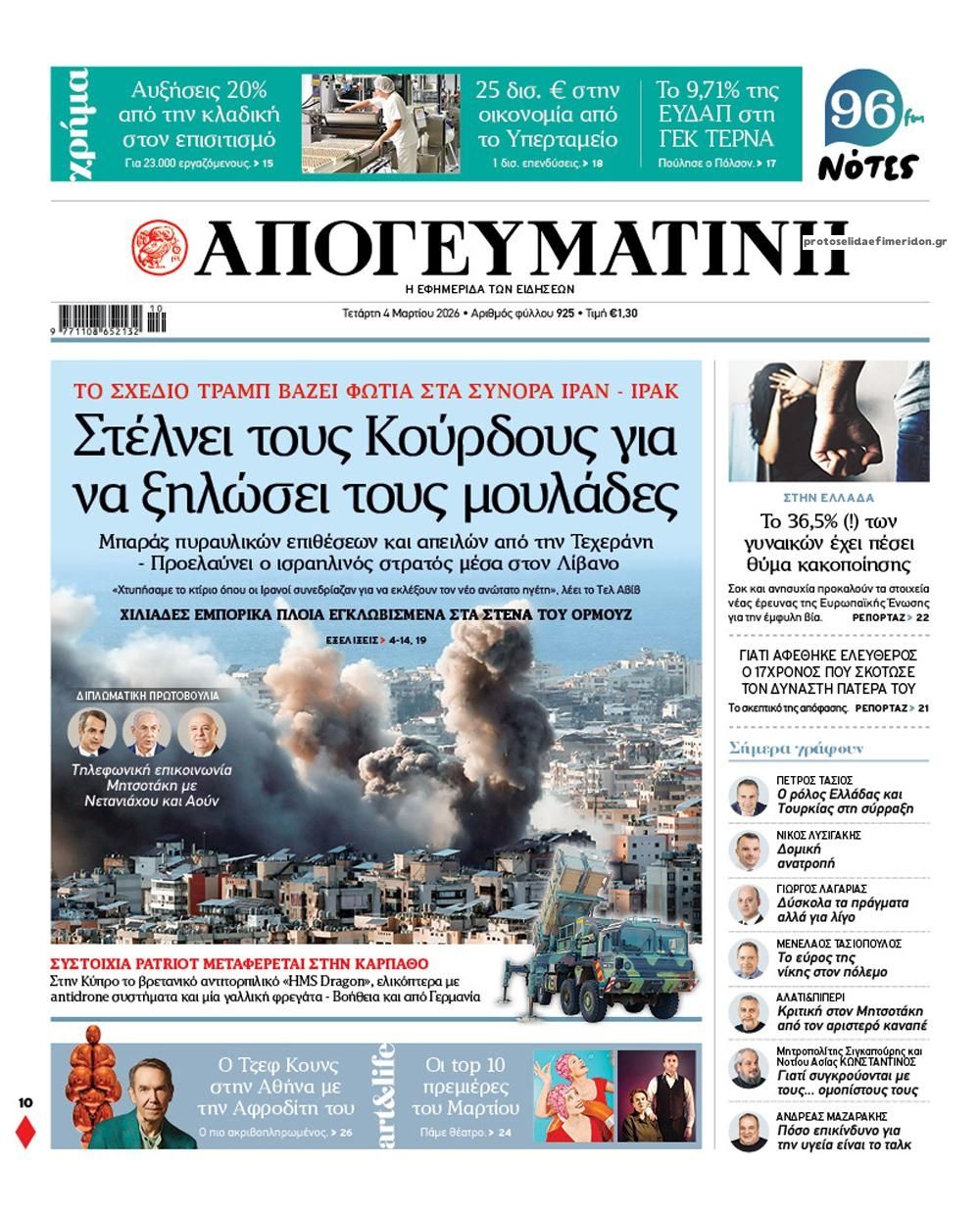 Οι πολιτικές εφημερίδες 4/3/2026 Enikos Newsroom 05:38, Τετάρτη 04 Μαρτίου 2026 Media Διαβάστε τα πρωτοσέλιδα από τις πολιτικές εφημερίδες, σήμερα 4/3/2026. ΕΦΗΜΕΡΙΔΕΣ ΠΟΛΙΤΙΚΕΣ ΕΦΗΜΕΡΙΔΕΣ ΠΡΩΤΟΣΕΛΙΔΑ Μοιράσου το: Καγκελάριος Μέρτς: Η Γερμανία δεν θα εμπλακεί στις αμερικανοϊσραηλινές επιθέσεις – Ανησυχία για την επόμενη μέρα στο Ιράν Ο πρέσβης του Ισραήλ στον ΟΗΕ καλεί τον Λίβανο να αφοπλίσει τη Χεζμπολάχ ΗΠΑ: Περισσότεροι από 9.000 Αμερικανοί έφυγαν από τη Μέση Ανατολή εξαιτίας του πολέμου σχολίασε κι εσύ (0 σχόλια) Ακολουθήστε το enikos.gr στο Google News και μάθετε πρώτοι όλες τις ειδήσεις Δείτε όλες τις τελευταίες ειδήσεις από την Ελλάδα και τον Κόσμο στο enikos.gr Ειδήσεις Ροή Ειδήσεων 23 ώρες πριν LIVE Μέση Ανατολή – Εκρήξεις και καπνοί στο αμερικανικό προξενείο στο Ντουμπάι – Νέες απειλές από Ιράν: «Είμαστε έτοιμοι για πόλεμο μακράς διαρκείας» – Όλες οι εξελίξεις 8 ώρες πριν Ο γιος του Αλί Χαμενεΐ, νέος ανώτατος θρησκευτικός ηγέτης του Ιράν – Εκλέχθηκε με τηλεδιάσκεψη από τη Συνέλευση Εμπειρογνωμόνων 8 ώρες πριν Τραμπ: Τι παραδέχτηκε και τι έκρυψε στις δηλώσεις του για τον πόλεμο στη Μέση Ανατολή παρουσία του καγκελάριου Μερτς 8 ώρες πριν Σούδα: Τα μυστικά στις συσκευές του 36χρονου – Η σύνδεση με τον 26χρονο Αζέρο που είχε συλληφθεί για κατασκοπεία τον Ιούνιο του 2025 10 ώρες πριν Διάγγελμα Μακρόν: «Η Τεχεράνη φέρει την πρώτη ευθύνη για τον πόλεμο – Στέλνουμε φρεγάτα στην Κύπρο, έχουμε αποφασίσει την στήριξή της 49 λεπτά πριν Οπτική ψευδαίσθηση: Μόνο όσοι έχουν τέλεια όραση μπορούν να εντοπίσουν την πιπίλα μέσα σε 8 δευτερόλεπτα 31 λεπτά πριν Μυϊκή ενδυνάμωση και ισορροπία: Η θρεπτική τροφή που πρέπει να τρώτε περισσότερο καθώς μεγαλώνετε, σύμφωνα με μελέτη 4 ώρες πριν Ζώδια 4/3: Ημερήσιες προβλέψεις – Υδροχόοι, βγείτε μπροστά, ακόμα κι αν νιώθετε λίγο άβολα στην αρχή 8 ώρες πριν Εκπληκτική ανακάλυψη κοντά στην αρχαία Θήβα της Αιγύπτου – Βρέθηκε κρύπτη με 22 σαρκοφάγους με 8 άθικτους παπύρους 11 λεπτά πριν Τρίκαλα: Φωτιά σε τουριστικό γραφείο την Τρίτη 17 λεπτά πριν Αυστραλία: Ο πρωθυπουργός Άντονι Αλμπανέζε δήλωσε ότι «δεν υπάρχει καμία δικαιολογία» για τις «τυφλές» επιθέσεις του Ιράν 30 λεπτά πριν ΔΕΔΔΗΕ: Διακοπές ρεύματος σήμερα (4/3) στην Αθήνα και σε άλλες 12 περιοχές της Αττικής 31 λεπτά πριν Μυϊκή ενδυνάμωση και ισορροπία: Η θρεπτική τροφή που πρέπει να τρώτε περισσότερο καθώς μεγαλώνετε, σύμφωνα με μελέτη 34 λεπτά πριν Σαουδική Αραβία: Αναχαιτίστηκαν δύο πύραυλοι κρουζ στην πόλη Αλ Χαρτζ ENIKOS NETWORK Πόσες γάτες περιπλανιούνται σε αυτόν τον χώρο που μοιάζει με λαβύρινθο; Μόνο αν είστε στο 1% των πιο έξυπνων θα μπορέσετε ν... Το όσπριο από το παραμύθι του Hans Christian Andersen που μπορεί να προστατεύσει την όραση και να καταπολεμήσει τη φλεγμονή Ιδρύεται Παρατηρητήριο Καθυστερήσεων και Κακοδικίας στα δικαστήρια της Αθήνας – Πώς θα λειτουργεί Κεντρική Μακεδονία: Σχέδιο στήριξης για τους ορυζοκαλλιεργητές – Παρεμβάσεις για κόστος, ανταγωνιστικότητα και βιωσιμότητα Ευπάθεια στο moltbook ai αποκαλύπτει email, tokens σύνδεσης και api keys Αυτός είναι ο ρόλος της μικρής τρύπας στους νυχοκόπτες – «Είμαι ο μόνος που δεν το ήξερε;»» περισσότερα 05:48 , Τετάρτη 04 Μαρτίου 2026 Οι οικονομικές εφημερίδες 4/3/2026 Διαβάστε τα πρωτοσέλιδα από τις οικονομικές εφημερίδες, σήμερα 4/3/2026. 05:43 , Τετάρτη 04 Μαρτίου 2026 Οι αθλητικές εφημερίδες 4/3/2026 Διαβάστε τα πρωτοσέλιδα από τις αθλητικές εφημερίδες, σήμερα 4/3/2026. 20:20 , Τρίτη 03 Μα