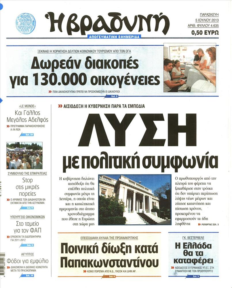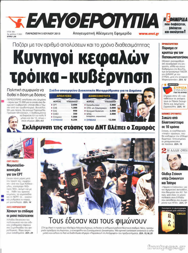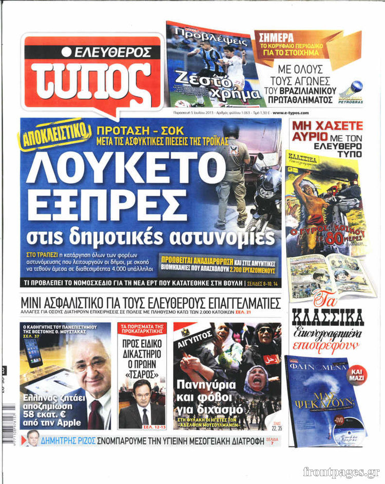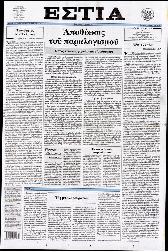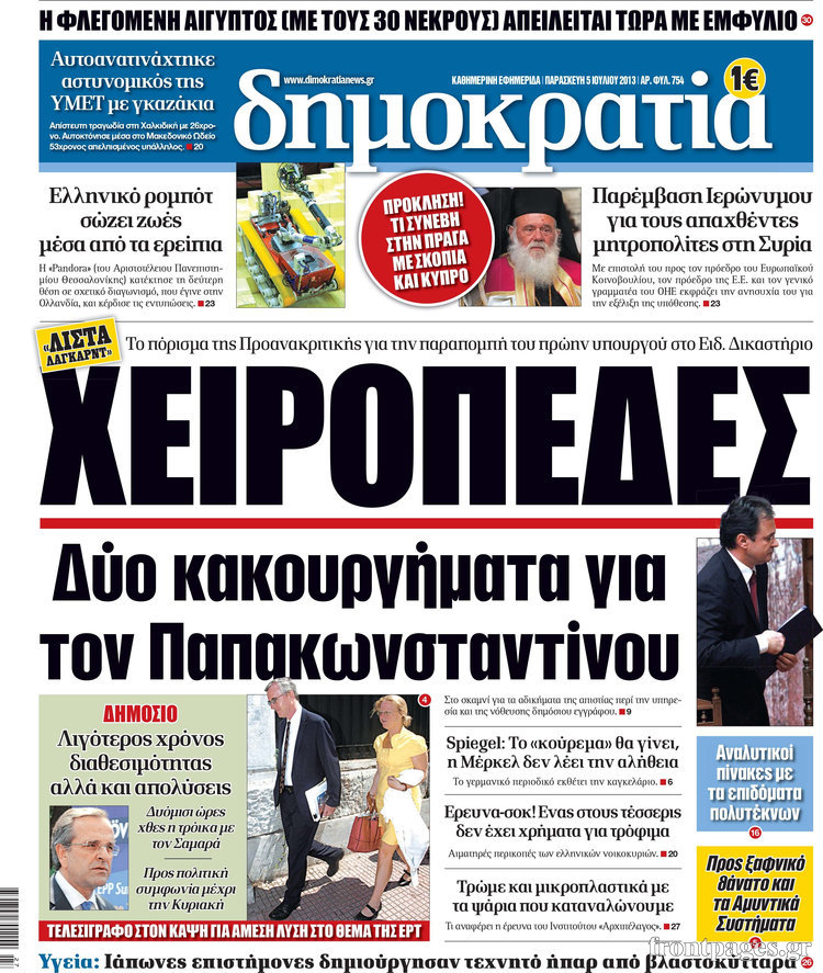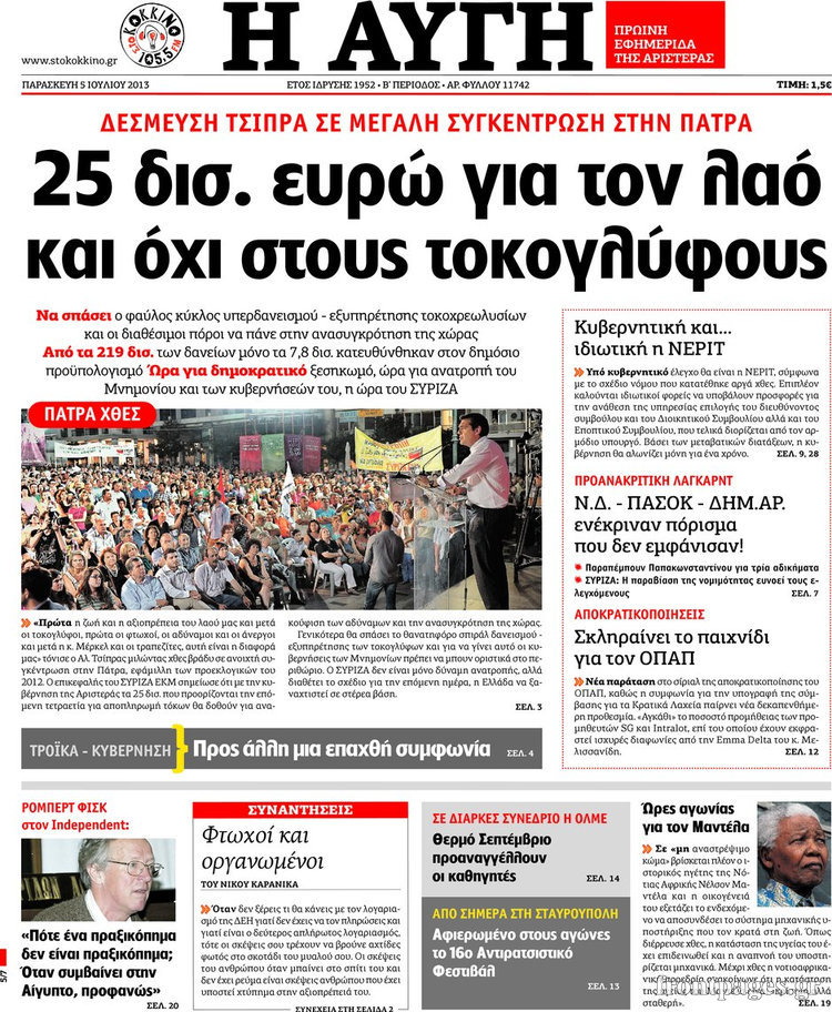 Οι πολιτικές εφημερίδες Enikos Newsroom 08:15, Παρασκευή 05 Ιουλίου 2013 Media Οι πολιτικές εφημερίδες Διαβάστε τα πρωτοσέλιδα των πολιτικών εφημερίδων: ΕΦΗΜΕΡΙΔΕΣ ΠΟΛΙΤΙΚΕΣ ΕΦΗΜΕΡΙΔΕΣ ΠΡΩΤΟΣΕΛΙΔΑ Μοιράσου το: σχολίασε κι εσύ (0 σχόλια) Ακολουθήστε το enikos.gr στο Google News και μάθετε πρώτοι όλες τις ειδήσεις Δείτε όλες τις τελευταίες ειδήσεις από την Ελλάδα και τον Κόσμο στο enikos.gr Ειδήσεις Ροή Ειδήσεων 8 ώρες πριν Χριστούγεννα στα μπλόκα: Επιμένουν στις κινητοποιήσεις τους οι αγρότες – Ανοίγουν τα διόδια το Σαββατοκύριακο 9 ώρες πριν Ουκρανία: Η άνευ προηγουμένου επίθεση σε ρωσικό τάνκερ στη Μεσόγειο και το μήνυμα προς στον Πούτιν – Το «μακρύ χέρι» του Κιέβου 8 ώρες πριν Πούτιν: Τα μηνύματα σε Ευρώπη και ΝΑΤΟ από το μαραθώνιο «σόου» του – Η απαίτηση για «σεβασμό» και η ειρήνη «με τους όρους» της Μόσχας 7 ώρες πριν ΗΠΑ: Η κυβέρνηση του Ντόναλντ Τραμπ άρχισε να δημοσιοποιεί τα αρχεία Έπσταϊν 7 ώρες πριν Άνω Λιόσια: Πυροβολισμοί σε επιχείρηση με χαλιά – Εντοπίστηκαν 10 κάλυκες 60 λεπτά πριν Αυγά: Πόσα μπορείτε να τρώτε την ημέρα με ασφάλεια για μέγιστη πρόσληψη πρωτεΐνης 1 ώρα πριν Τα ζώδια σήμερα, Σάββατο 20 Δεκεμβρίου: Παρθένοι, το σύμπαν σας δίνει το κλειδί 8 ώρες πριν Ανακαλύφθηκαν αρχαία χρυσά νομίσματα 2.200 ετών που απεικονίζουν τον θεό Απόλλωνα – Η άγνωστη σύνδεση με τον Φίλιππο Β΄ της Μακεδονίας 9 ώρες πριν Ύπνος: Μια κρυφή κατάσταση του εγκεφάλου πριν από τον ύπνο μπορεί να είναι το “κλειδί” για υψηλή ευφυΐα και δημιουργικότητα 6 λεπτά πριν Αναβολή συμφωνίας ΕΕ-Mercosur: Ο χρόνος «δεν είναι απεριόριστος» προειδοποιεί η Παραγουάη 20 λεπτά πριν Κίριλ Ντμίτριεφ: Στις ΗΠΑ ο απεσταλμένος της Ρωσίας για συνομιλίες με τους ομολόγους του, Γουίτκοφ και Κούσνερ 28 λεπτά πριν ΔΕΔΔΗΕ: Διακοπές ρεύματος σήμερα (20/12) στην Αθήνα και σε άλλες 7 περιοχές της Αττικής 36 λεπτά πριν Κολομβία: Είκοσι χρόνια κάθειρξη σε πρώην ανώτερο αξιωματικό για 72 εκτελέσεις αμάχων 44 λεπτά πριν Οπτική ψευδαίσθηση: Μόνο αν είσαι ο Σέρλοκ Χολμς θα βρεις τον αριθμό «87» σε 7 δευτερόλεπτα ENIKOS NETWORK Πρέπει να αποδέχεστε ή να απορρίπτετε όλα τα cookies; Ένας ειδικός εξηγεί Η αγαπημένη λιχουδιά των πόνι που μπορεί να ενισχύσει όραση, εγκέφαλο και ανοσοποιητικό Αναστολή μέτρων αναγκαστικής εκτέλεσης για κτηνοτρόφους που πλήττονται από την ευλογιά των αιγοπροβάτων Πλήρης επάρκεια προϊόντων στις λαϊκές της Αττικής, παρά τις αγροτικές κινητοποιήσεις – Τι απαντούν οι πωλητές Χαρτογραφώντας το «σημείο χωρίς επιστροφή»: Για πρώτη φορά αποκαλύπτεται με λεπτομέρεια το ακανθώδες όριο της ατμόσφαιρας τ... Η Google καταργεί τη λειτουργία «dark web report» – Πώς θα μπορούν οι χρήστες να διαγράφουν τα δεδομένα τους περισσότερα 05:48 , Σάββατο 20 Δεκεμβρίου 2025 Οι οικονομικές εφημερίδες 20/12/2025 Διαβάστε τα πρωτοσέλιδα από τις οικονομικές εφημερίδες, σήμερα 20/12/2025. 05:43 , Σάββατο 20 Δεκεμβρίου 2025 Οι αθλητικές εφημερίδες 20/12/2025 Διαβάστε τα πρωτοσέλιδα από τις αθλητικές εφημερίδες, σήμερα 20/12/2025. 05:38 , Σάββατο 20 Δεκεμβρίου 2025 Οι πολιτικές εφημερίδες 20/12/2025 Διαβάστε τα πρωτοσέλιδα από τις πολιτικές εφημερίδες, σήμερα 20/12/2025. 04:20 , Σάββατο 20 Δεκεμβρίου 2025 Αγγελική Νικολούλη: Τα συλλυπητήρια για την απώλεια της Ειρήνης Μαρινάκη Τα συλληπητήρια στον πρόεδρο του Mega, τον Βαγγέλη Μαρινάκη, για την απώλεια της μητέρας του Ε... ΤΕΛΕΥΤΑΙΕΣ ΕΙΔΗΣΕΙΣ 6 λεπτά πριν Αναβολή συμφωνίας ΕΕ-Mercosur: Ο χρόνος «δεν είναι... 20 λεπτά πριν Κίριλ Ντμίτριεφ: Στις ΗΠΑ ο απεστα