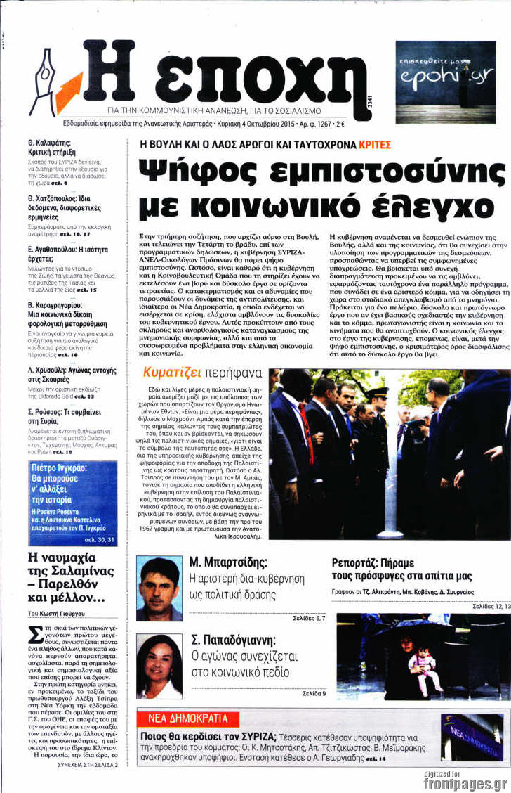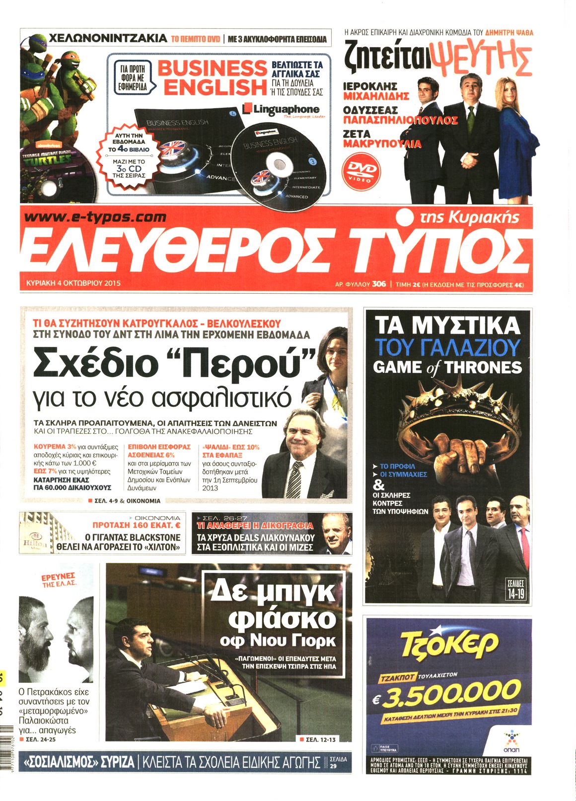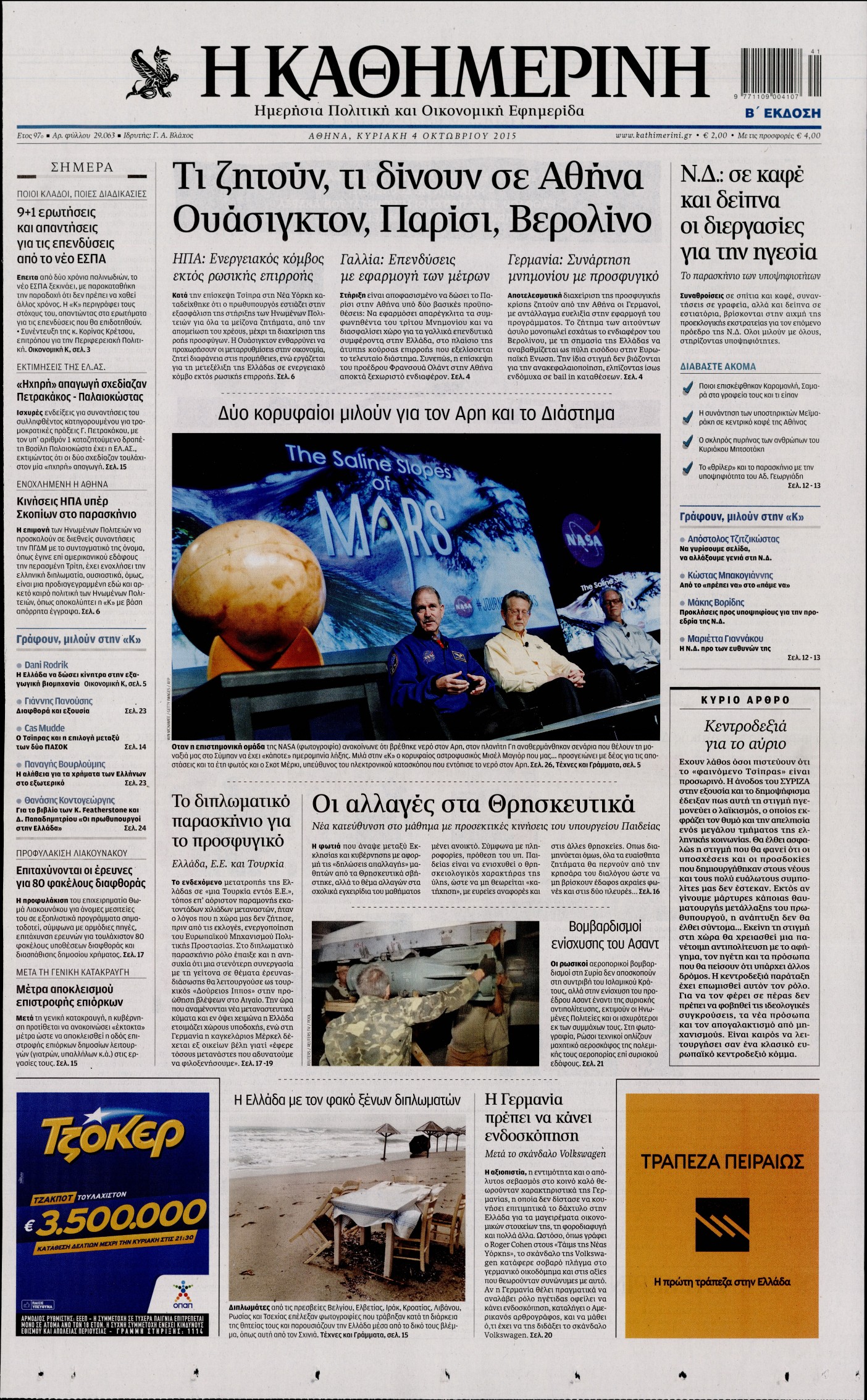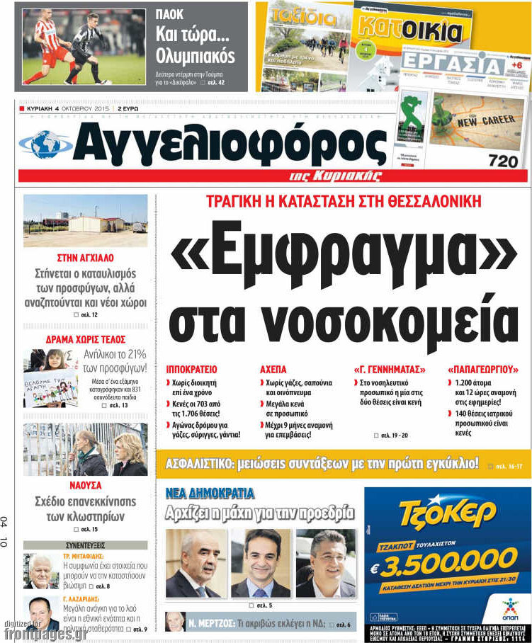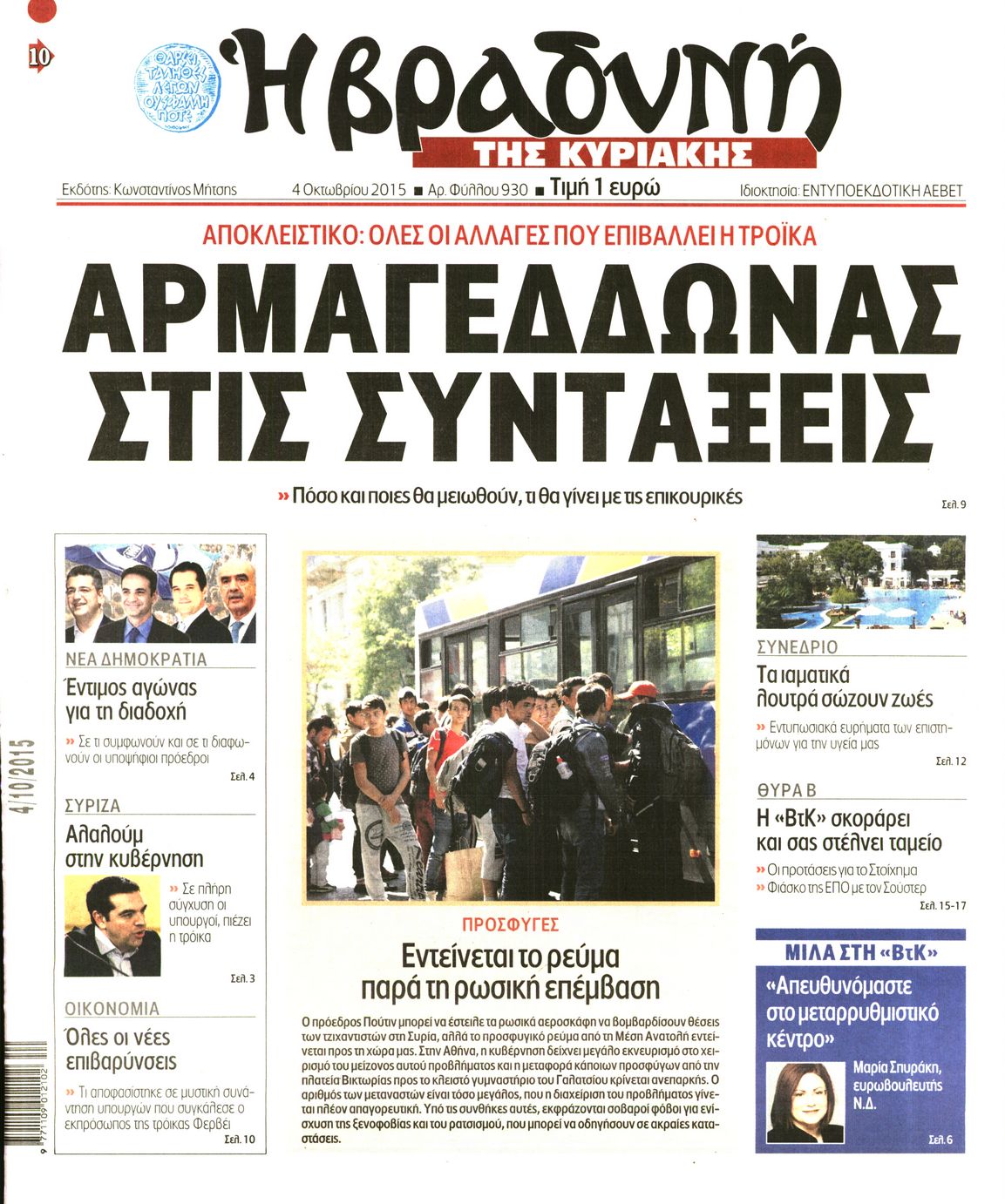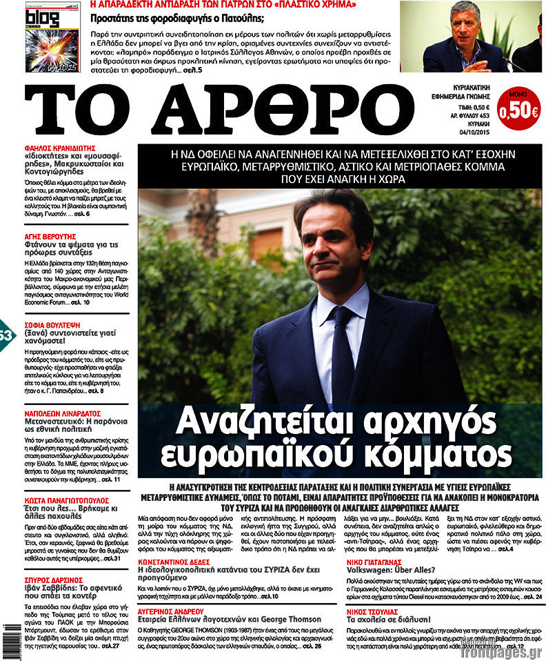 Οι πολιτικές εφημερίδες 4/10/2015 Enikos Newsroom 07:50, Κυριακή 04 Οκτωβρίου 2015 Media Διαβάστε τα σημερινά πρωτοσέλιδα των πολιτικών εφημερίδων. ΕΦΗΜΕΡΙΔΕΣ ΠΟΛΙΤΙΚΕΣ ΕΦΗΜΕΡΙΔΕΣ ΠΡΩΤΟΣΕΛΙΔΑ Μοιράσου το: σχολίασε κι εσύ (0 σχόλια) Ακολουθήστε το enikos.gr στο Google News και μάθετε πρώτοι όλες τις ειδήσεις Δείτε όλες τις τελευταίες ειδήσεις από την Ελλάδα και τον Κόσμο στο enikos.gr Ειδήσεις Ροή Ειδήσεων 4 ώρες πριν Υπόθεση Έπσταϊν: Το Υπουργείο Δικαιοσύνης δημοσιοποίησε μια σειρά από εξαιρετικά επεξεργασμένα αρχεία – «Λείπουν τα πιο σημαντικά έγγραφα», λένε οι Δημοκρατικοί 56 λεπτά πριν Γιορτές με μπλόκα για τους αγρότες: Ανοίγουν διόδια και μοιράζουν προϊόντα στους ταξιδιώτες 1 ώρα πριν Εξαφάνιση 33χρονου γιατρού στην Κρήτη: «Άναψα τα φώτα, τρόμαξε και άρχισε να τρέχει στα χωράφια» – Η τελευταία διαδρομή και η μαρτυρία «κλειδί» 3 ώρες πριν Ο «χάρτης» με τις αυξήσεις και τις φοροελαφρύνσεις του 2026 – Ποιοι και πόσα κερδίζουν 1 ώρα πριν Τα αρχεία του Έπσταϊν αποκαλύπτουν φωτογραφία του έκπτωτου πρίγκιπα Άντριου – Είναι ξαπλωμένος στην αγκαλιά 5 γυναικών 1 ώρα πριν Μία νέα «χρυσή» περίοδος αρχίζει για 3 ζώδια από σήμερα – «Μία αναπάντεχη ευκαιρία οδηγεί στην επιτυχία» 6 ώρες πριν Αυγά: Πόσα μπορείτε να τρώτε την ημέρα με ασφάλεια για μέγιστη πρόσληψη πρωτεΐνης 3 ώρες πριν Αρχαιολόγοι ανακάλυψαν σε χωράφι απεικόνιση 600 ετών ενός Αγίου – Τα στοιχεία που δείχνουν ότι μαρτύρησε 2 ώρες πριν Αγχώνεται για το χριστουγεννιάτικο δώρο που πήρε στην πλούσια σύντροφό του – «Φοβάμαι πως θα το βρει φθηνιάρικο, φοράει βραχιόλια Cartier» 5 λεπτά πριν Τραγωδία στην άσφαλτο στα Χανιά: Νεκρός 37χρονος οδηγός ΙΧ – Τον βρήκαν ώρες μετά το τροχαίο 13 λεπτά πριν Τα Labubu «μετακομίζουν» στο Χόλιγουντ: Η Sony Pictures ετοιμάζει live-action ταινία με τον σκηνοθέτη του «Wonka» 21 λεπτά πριν Νέες ταυτότητες: Μεγάλη αναμονή για ραντεβού στην Αττική – Τέλος τα ταξίδια εκτός Ελλάδος από τον Αύγουστο για όσους δεν έχουν αλλάξει 29 λεπτά πριν Οι 7 φράσεις που δεν λένε ποτέ οι συναισθηματικά έξυπνοι άνθρωποι κατά τη διάρκεια ενός καβγά 33 λεπτά πριν Τηλεθέαση (19/12): Ανατροπές και πρωτιές στην πρωινή ζώνη ENIKOS NETWORK Είστε μόνιμα απρόσεκτοι; 3 σημάδια που δείχνουν ότι μπορεί να είναι σύμπτωμα πάθησης Πόσα κιλά παίρνουμε πραγματικά τα Χριστούγεννα, σύμφωνα με την επιστήμη – Πώς να το αποτρέψουμε; e-ΕΦΚΑ και ΔΥΠΑ: Έρχονται νέες πληρωμές έως τις 24 Δεκεμβρίου – Ποιοι πάνε ταμείο Επίδομα παιδιού: Τι αλλάζει από το 2026 – Το όφελος από τις φορολογικές ελαφρύνσεις Χαρτογραφώντας το «σημείο χωρίς επιστροφή»: Για πρώτη φορά αποκαλύπτεται με λεπτομέρεια το ακανθώδες όριο της ατμόσφαιρας τ... Η Google καταργεί τη λειτουργία «dark web report» – Πώς θα μπορούν οι χρήστες να διαγράφουν τα δεδομένα τους περισσότερα 09:30 , Σάββατο 20 Δεκεμβρίου 2025 «Porto Leone: Στη γειτονιά με τα κόκκινα φανάρια» – Ο Χρόνης αποκαλύπτει στην Αλεξάνδρα το μυστικό για το παιδί της Λένας Η μεγάλη δραματική σειρά του Apha «Porto Leone: Στη γειτονιά με τα κόκκινα φανάρια» μας μεταφέ... 08:14 , Σάββατο 20 Δεκεμβρίου 2025 Τρομεροί γονείς: Η Μαρία Καβογιάννη εισβάλλει στο σπίτι της οικογένειας Στεφανίδη Όσα θα δούμε στο νέο διπλό επεισόδιο της σειράς «Τρομεροί γονείς», σήμερα Σάββατο 20 Δεκεμβρίο... 05:48 , Σάββατο 20 Δεκεμβρίου 2025 Οι οικονομικές εφημερίδες 20/12/2025 Διαβάστε τα πρωτοσέλιδα από τις οικονομικές εφημερίδες, σήμερα 20/12/2025. 05:43 , Σάββατο 20 Δεκεμβρίου 2025 Οι αθλητικές εφημερίδες 20/12/2025 Διαβάστε τα πρω