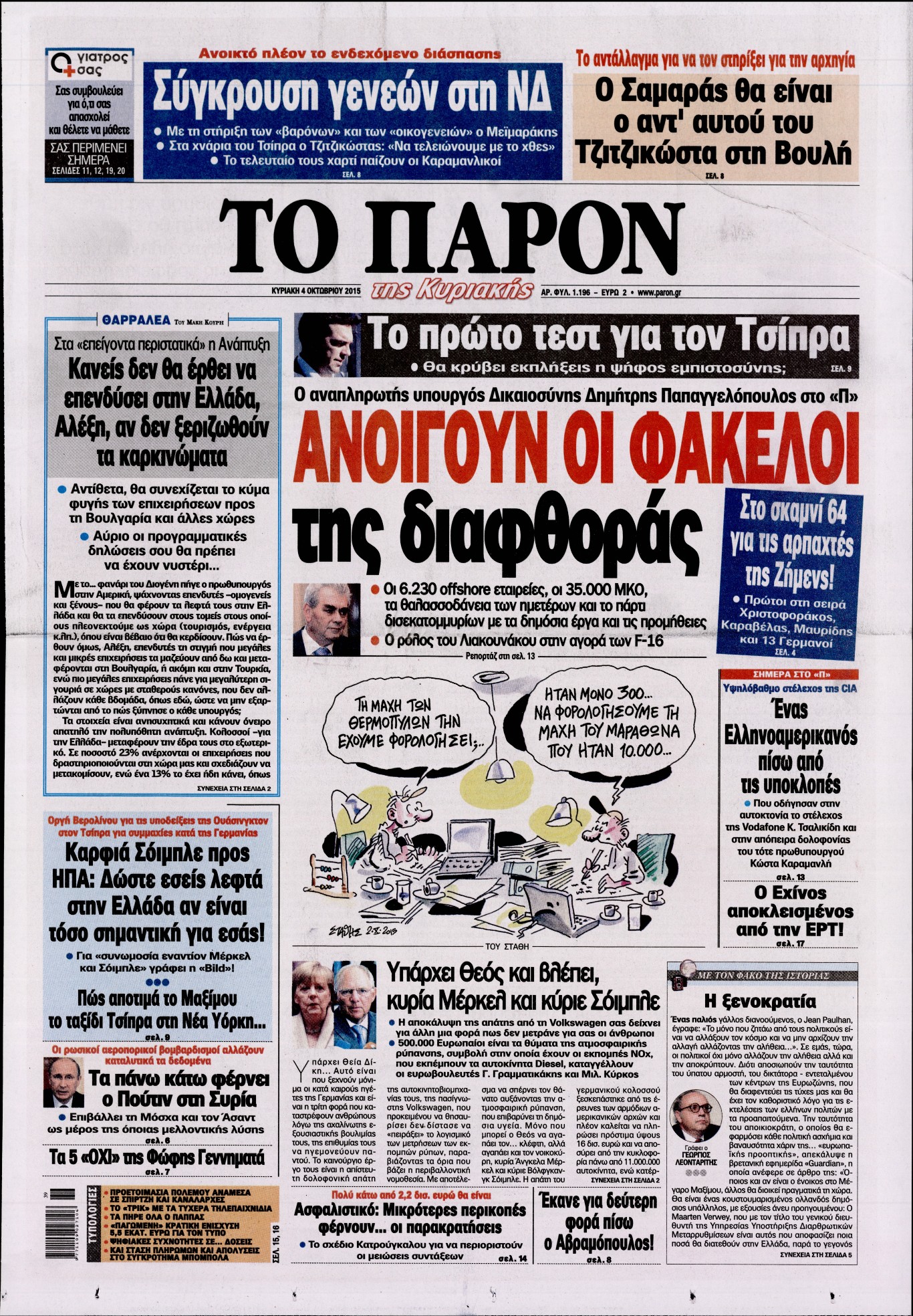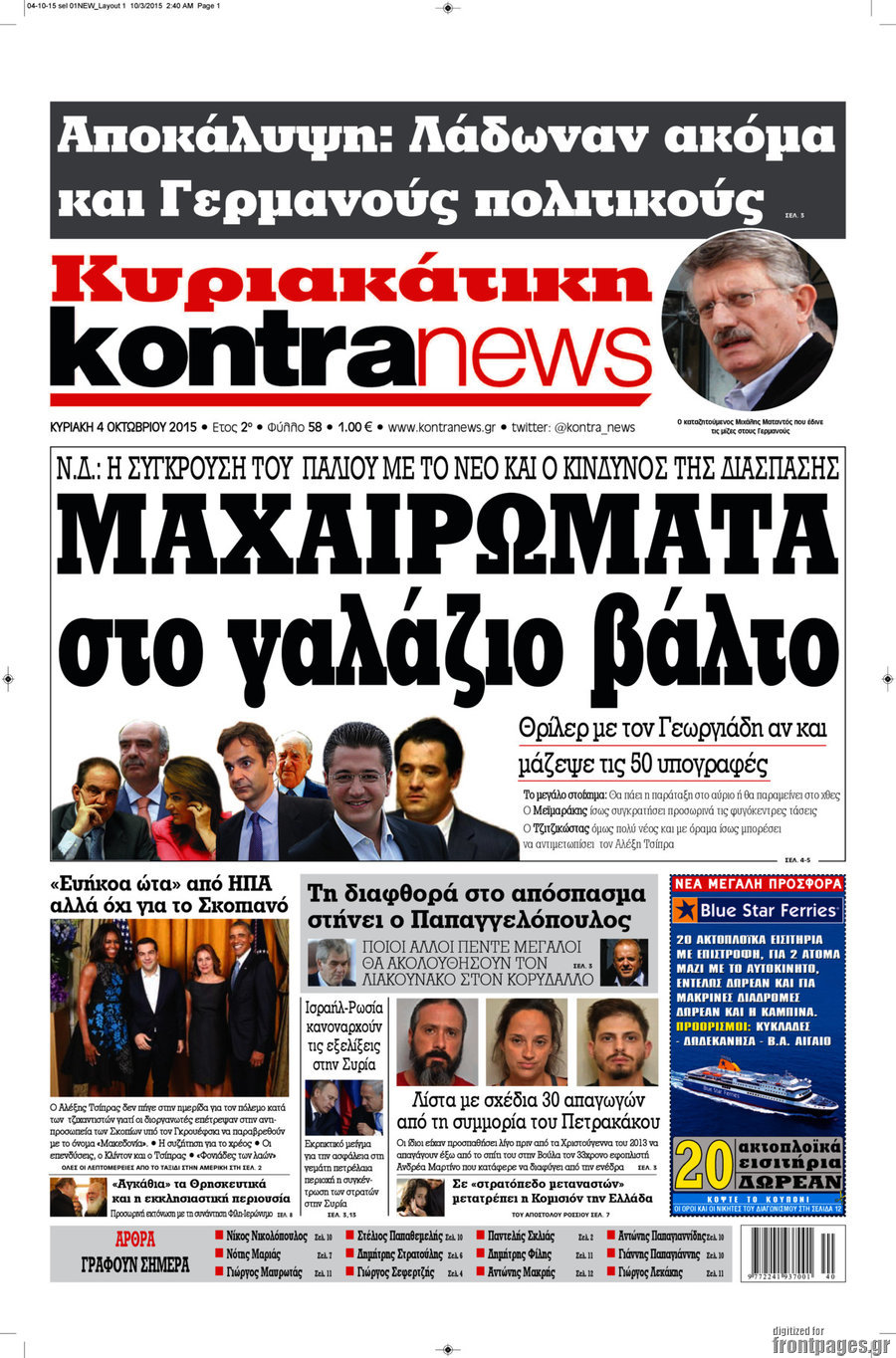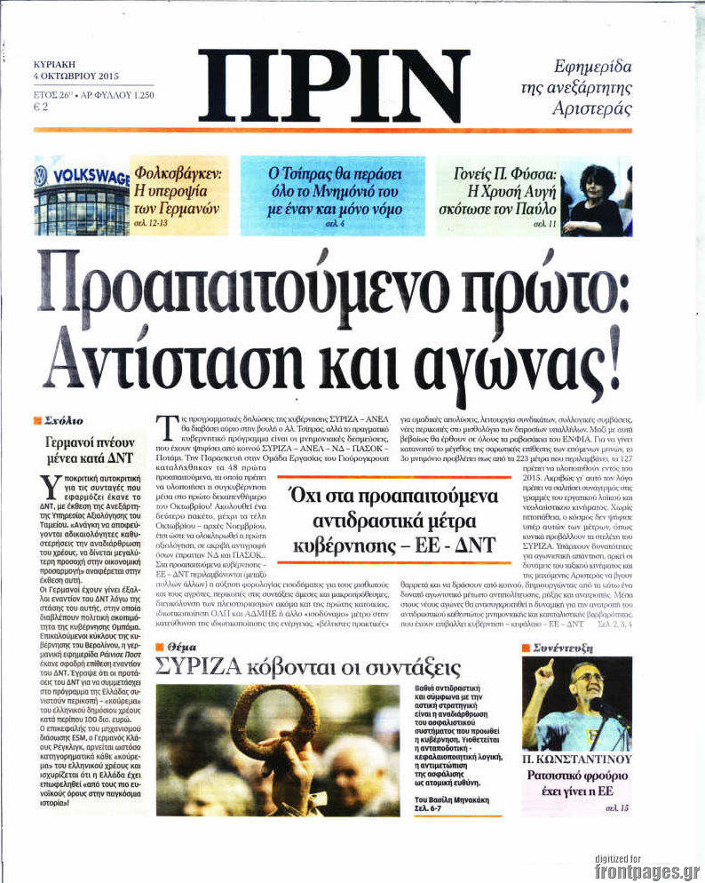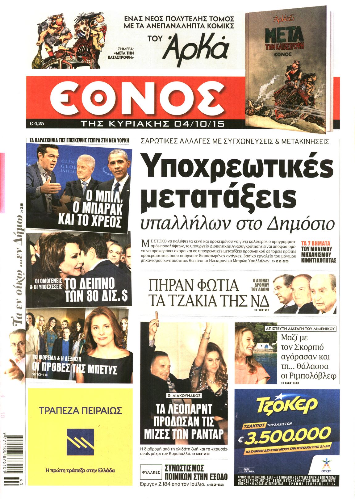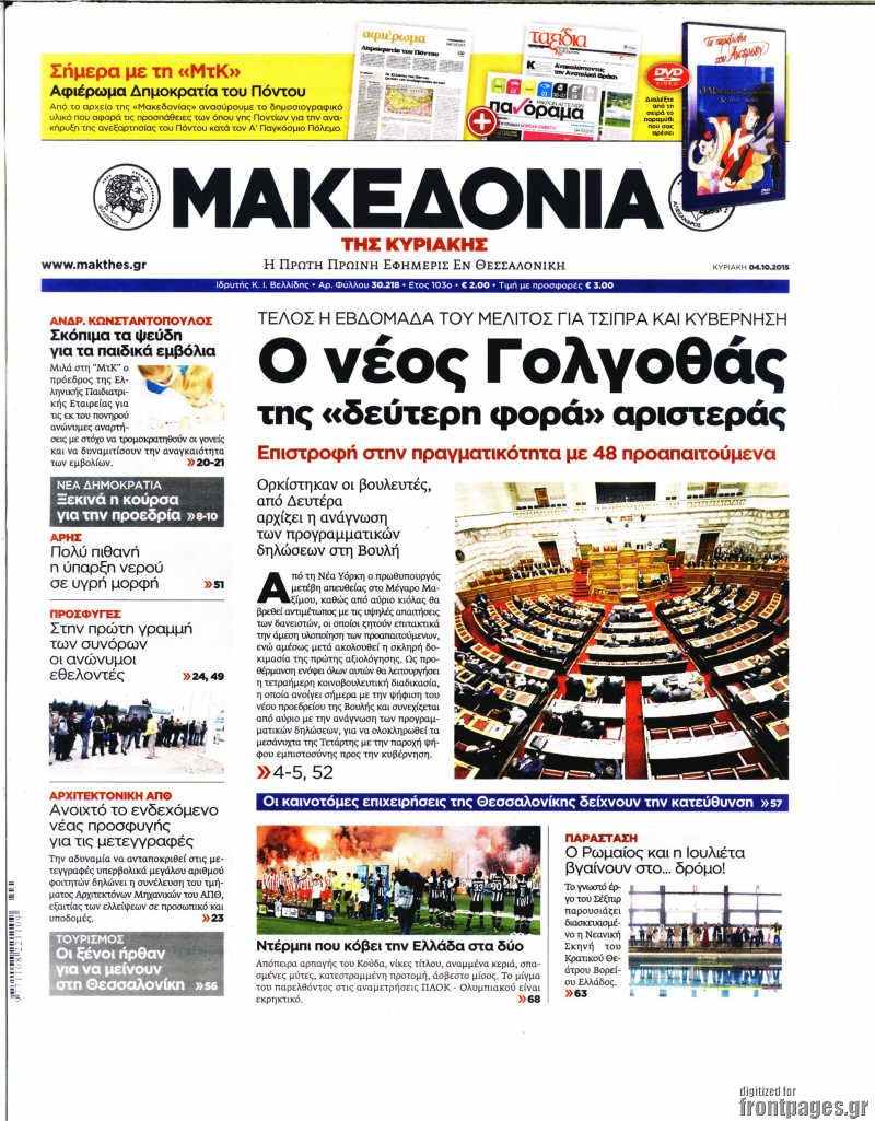 Οι πολιτικές εφημερίδες 4/10/2015 Enikos Newsroom 07:50, Κυριακή 04 Οκτωβρίου 2015 Media Διαβάστε τα σημερινά πρωτοσέλιδα των πολιτικών εφημερίδων. ΕΦΗΜΕΡΙΔΕΣ ΠΟΛΙΤΙΚΕΣ ΕΦΗΜΕΡΙΔΕΣ ΠΡΩΤΟΣΕΛΙΔΑ Μοιράσου το: σχολίασε κι εσύ (0 σχόλια) Ακολουθήστε το enikos.gr στο Google News και μάθετε πρώτοι όλες τις ειδήσεις Δείτε όλες τις τελευταίες ειδήσεις από την Ελλάδα και τον Κόσμο στο enikos.gr Ειδήσεις Ροή Ειδήσεων 4 ώρες πριν Υπόθεση Έπσταϊν: Το Υπουργείο Δικαιοσύνης δημοσιοποίησε μια σειρά από εξαιρετικά επεξεργασμένα αρχεία – «Λείπουν τα πιο σημαντικά έγγραφα», λένε οι Δημοκρατικοί 56 λεπτά πριν Γιορτές με μπλόκα για τους αγρότες: Ανοίγουν διόδια και μοιράζουν προϊόντα στους ταξιδιώτες 1 ώρα πριν Εξαφάνιση 33χρονου γιατρού στην Κρήτη: «Άναψα τα φώτα, τρόμαξε και άρχισε να τρέχει στα χωράφια» – Η τελευταία διαδρομή και η μαρτυρία «κλειδί» 3 ώρες πριν Ο «χάρτης» με τις αυξήσεις και τις φοροελαφρύνσεις του 2026 – Ποιοι και πόσα κερδίζουν 1 ώρα πριν Τα αρχεία του Έπσταϊν αποκαλύπτουν φωτογραφία του έκπτωτου πρίγκιπα Άντριου – Είναι ξαπλωμένος στην αγκαλιά 5 γυναικών 1 ώρα πριν Μία νέα «χρυσή» περίοδος αρχίζει για 3 ζώδια από σήμερα – «Μία αναπάντεχη ευκαιρία οδηγεί στην επιτυχία» 6 ώρες πριν Αυγά: Πόσα μπορείτε να τρώτε την ημέρα με ασφάλεια για μέγιστη πρόσληψη πρωτεΐνης 3 ώρες πριν Αρχαιολόγοι ανακάλυψαν σε χωράφι απεικόνιση 600 ετών ενός Αγίου – Τα στοιχεία που δείχνουν ότι μαρτύρησε 2 ώρες πριν Αγχώνεται για το χριστουγεννιάτικο δώρο που πήρε στην πλούσια σύντροφό του – «Φοβάμαι πως θα το βρει φθηνιάρικο, φοράει βραχιόλια Cartier» 5 λεπτά πριν Τραγωδία στην άσφαλτο στα Χανιά: Νεκρός 37χρονος οδηγός ΙΧ – Τον βρήκαν ώρες μετά το τροχαίο 13 λεπτά πριν Τα Labubu «μετακομίζουν» στο Χόλιγουντ: Η Sony Pictures ετοιμάζει live-action ταινία με τον σκηνοθέτη του «Wonka» 21 λεπτά πριν Νέες ταυτότητες: Μεγάλη αναμονή για ραντεβού στην Αττική – Τέλος τα ταξίδια εκτός Ελλάδος από τον Αύγουστο για όσους δεν έχουν αλλάξει 29 λεπτά πριν Οι 7 φράσεις που δεν λένε ποτέ οι συναισθηματικά έξυπνοι άνθρωποι κατά τη διάρκεια ενός καβγά 33 λεπτά πριν Τηλεθέαση (19/12): Ανατροπές και πρωτιές στην πρωινή ζώνη ENIKOS NETWORK Είστε μόνιμα απρόσεκτοι; 3 σημάδια που δείχνουν ότι μπορεί να είναι σύμπτωμα πάθησης Πόσα κιλά παίρνουμε πραγματικά τα Χριστούγεννα, σύμφωνα με την επιστήμη – Πώς να το αποτρέψουμε; e-ΕΦΚΑ και ΔΥΠΑ: Έρχονται νέες πληρωμές έως τις 24 Δεκεμβρίου – Ποιοι πάνε ταμείο Επίδομα παιδιού: Τι αλλάζει από το 2026 – Το όφελος από τις φορολογικές ελαφρύνσεις Χαρτογραφώντας το «σημείο χωρίς επιστροφή»: Για πρώτη φορά αποκαλύπτεται με λεπτομέρεια το ακανθώδες όριο της ατμόσφαιρας τ... Η Google καταργεί τη λειτουργία «dark web report» – Πώς θα μπορούν οι χρήστες να διαγράφουν τα δεδομένα τους περισσότερα 09:30 , Σάββατο 20 Δεκεμβρίου 2025 «Porto Leone: Στη γειτονιά με τα κόκκινα φανάρια» – Ο Χρόνης αποκαλύπτει στην Αλεξάνδρα το μυστικό για το παιδί της Λένας Η μεγάλη δραματική σειρά του Apha «Porto Leone: Στη γειτονιά με τα κόκκινα φανάρια» μας μεταφέ... 08:14 , Σάββατο 20 Δεκεμβρίου 2025 Τρομεροί γονείς: Η Μαρία Καβογιάννη εισβάλλει στο σπίτι της οικογένειας Στεφανίδη Όσα θα δούμε στο νέο διπλό επεισόδιο της σειράς «Τρομεροί γονείς», σήμερα Σάββατο 20 Δεκεμβρίο... 05:48 , Σάββατο 20 Δεκεμβρίου 2025 Οι οικονομικές εφημερίδες 20/12/2025 Διαβάστε τα πρωτοσέλιδα από τις οικονομικές εφημερίδες, σήμερα 20/12/2025. 05:43 , Σάββατο 20 Δεκεμβρίου 2025 Οι αθλητικές εφημερίδες 20/12/2025 Διαβάστε τα πρω