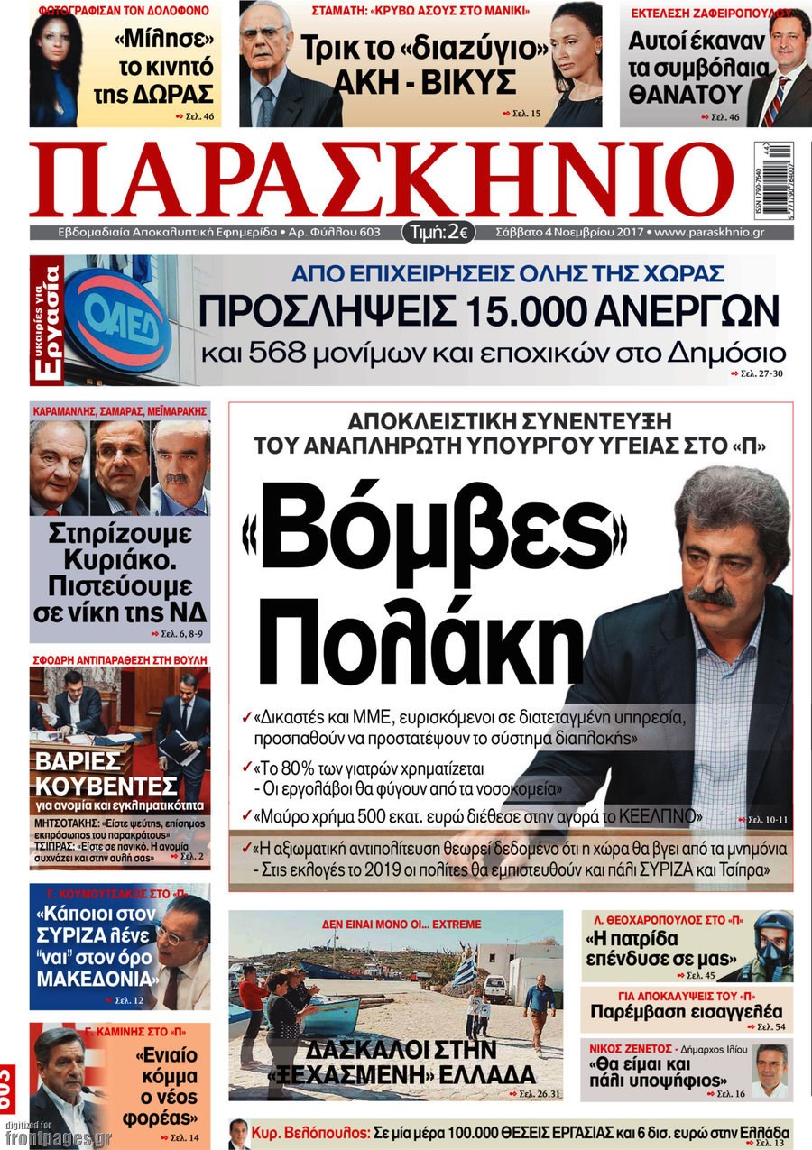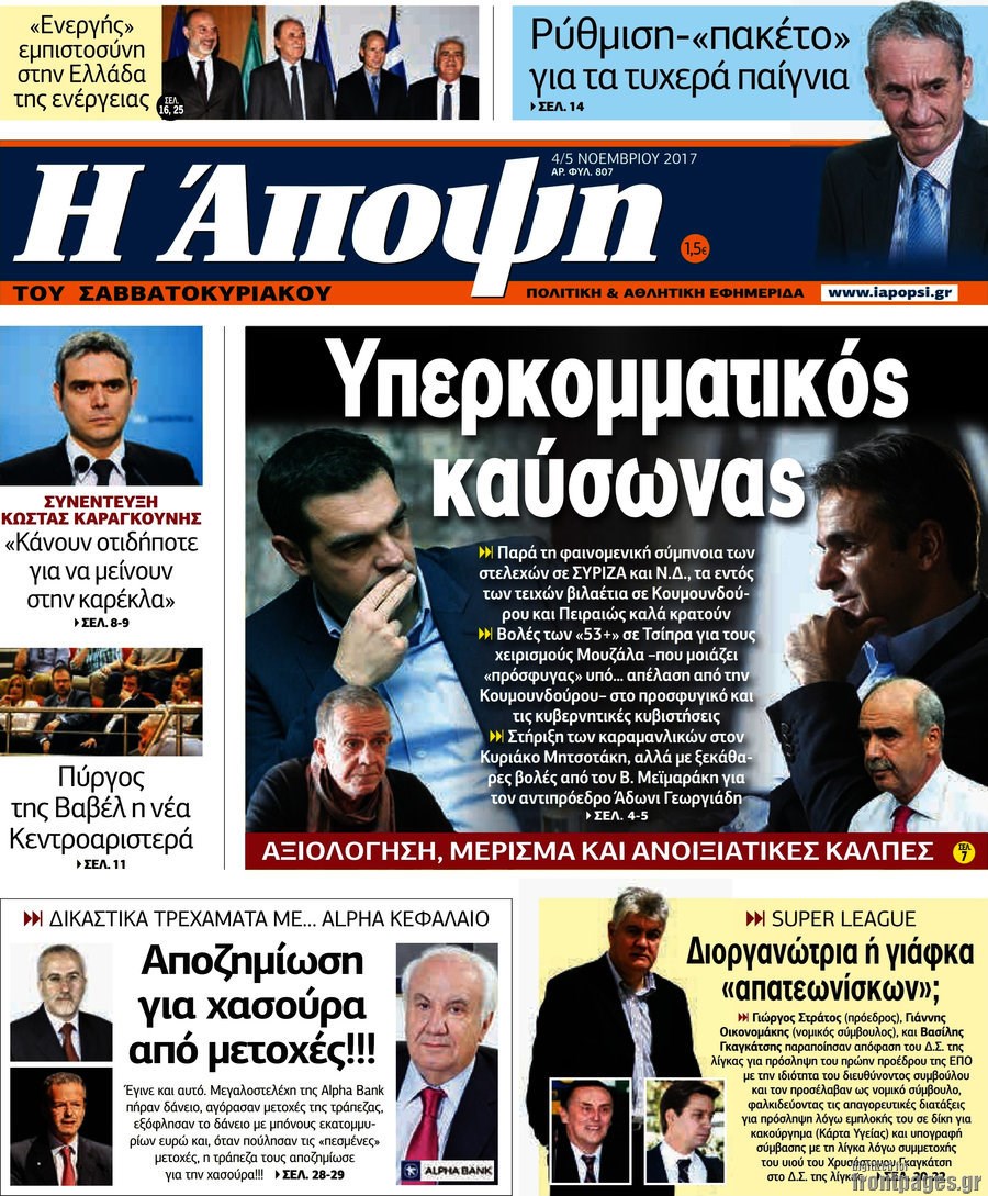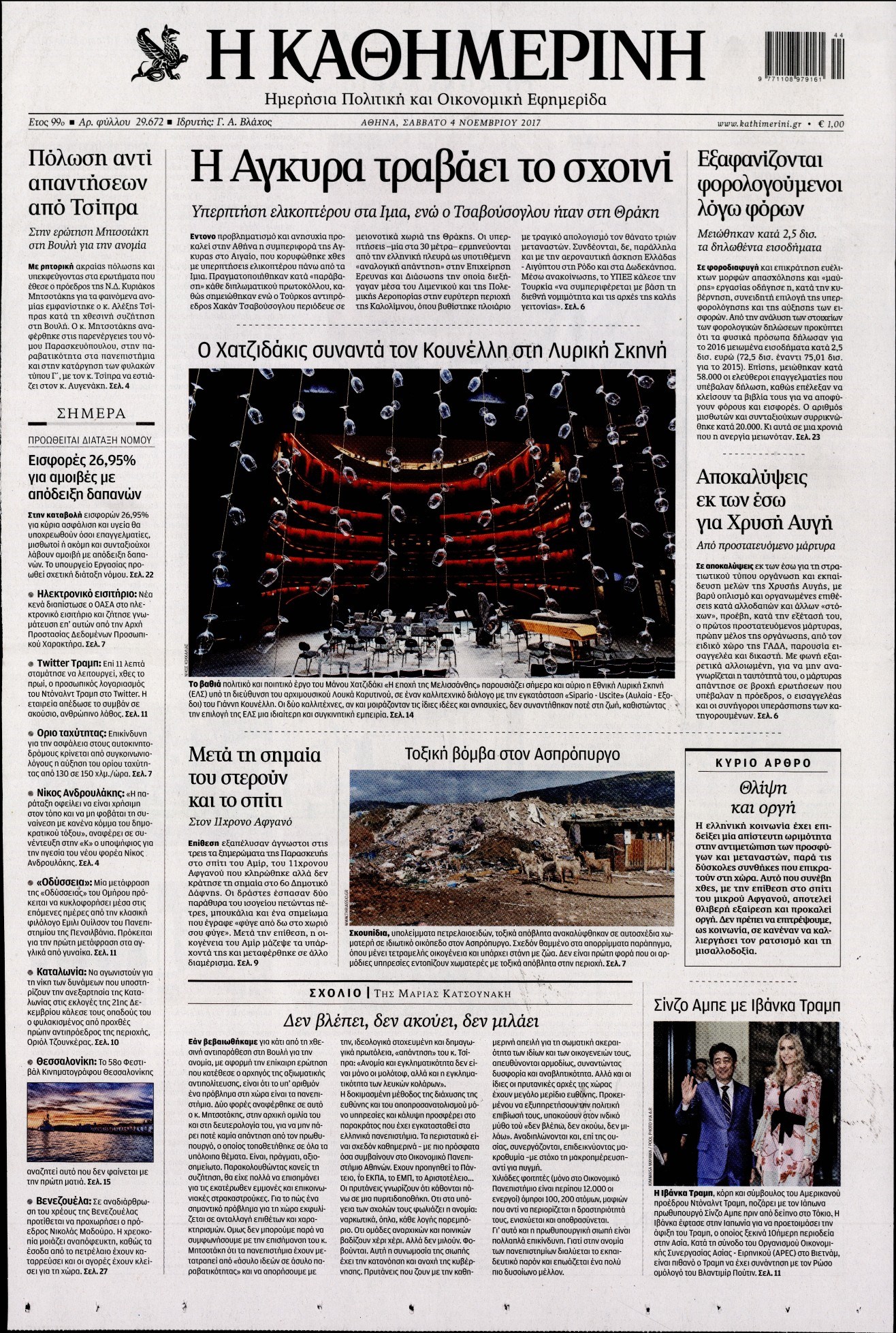 Οι πολιτικές εφημερίδες 4/11/2017 Enikos Newsroom 07:56, Σάββατο 04 Νοεμβρίου 2017 Media Διαβάστε τα σημερινά πρωτοσέλιδα των πολιτικών εφημερίδων: ΠΟΛΙΤΙΚΕΣ ΕΦΗΜΕΡΙΔΕΣ ΠΡΩΤΟΣΕΛΙΔΑ Μοιράσου το: σχολίασε κι εσύ (0 σχόλια) Ακολουθήστε το enikos.gr στο Google News και μάθετε πρώτοι όλες τις ειδήσεις Δείτε όλες τις τελευταίες ειδήσεις από την Ελλάδα και τον Κόσμο στο enikos.gr Ειδήσεις Ροή Ειδήσεων 3 ώρες πριν Χριστούγεννα στα μπλόκα: Επιμένουν στις κινητοποιήσεις τους οι αγρότες – Ανοίγουν τα διόδια το Σαββατοκύριακο 3 ώρες πριν Ουκρανία: Η άνευ προηγουμένου επίθεση σε ρωσικό τάνκερ στη Μεσόγειο και το μήνυμα προς στον Πούτιν – Το «μακρύ χέρι» του Κιέβου 2 ώρες πριν Πούτιν: Τα μηνύματα σε Ευρώπη και ΝΑΤΟ από το μαραθώνιο «σόου» του – Η απαίτηση για «σεβασμό» και η ειρήνη «με τους όρους» της Μόσχας 3 ώρες πριν Τραμπ: Δεν αποκλείει την πιθανότητα ενός πολέμου στη Βενεζουέλα – «Ο Μαδούρο ξέρει καλύτερα από τον καθένα τι ακριβώς θέλω» 4 ώρες πριν Συνεχίζει να προκαλεί ο Μίτσκοσκι: «Για μένα το όνομα Μακεδονία είναι ιερό» 2 ώρες πριν Ανακαλύφθηκαν αρχαία χρυσά νομίσματα 2.200 ετών που απεικονίζουν τον θεό Απόλλωνα – Η άγνωστη σύνδεση με τον Φίλιππο Β΄ της Μακεδονίας 3 ώρες πριν Ύπνος: Μια κρυφή κατάσταση του εγκεφάλου πριν από τον ύπνο μπορεί να είναι το “κλειδί” για υψηλή ευφυΐα και δημιουργικότητα 4 ώρες πριν Αριθμολογία: Οι άνθρωποι που έχουν γεννηθεί αυτές τις 4 ημερομηνίες, συχνά παρεξηγούνται – «Η καλοσύνη τους κρύβει τεράστια δύναμη» 5 ώρες πριν Ξεχάστε το καθάρισμα το Σαββατοκύριακο: Ο «κανόνας των 20 λεπτών» που θα σας λύσει τα χέρια 6 λεπτά πριν Συρία: Μαζικά πλήγματα των ΗΠΑ σε θέσεις του Ισλαμικού Κράτους – Χέγκσεθ: «Δεν είναι αρχή πολέμου, είναι μια δήλωση εκδίκησης» για το θάνατο των στρατιωτών μας 18 λεπτά πριν Ουκρανία: Ολοκληρώθηκαν οι συνομιλίες με τους Αμερικανούς κι Ευρωπαίους διαπραγματευτές 33 λεπτά πριν Μπαρτσελόνα – Μπασκόνια 134-124: Οι «μπλαουγκράνα» πήραν το ματς της χρονιάς ύστερα από τρεις παρατάσεις 48 λεπτά πριν Φαίη Σκορδά: «Παλιότερα τα κομπλιμέντα τα προσπερνούσα, τώρα τα έχω ανάγκη» 1 ώρα πριν Βασίλης Σπανούλης: Δεν εμφανίστηκε ούτε ένας δημοσιογράφος στην συνέντευξη Τύπου – «Καλησπέρα στον… κανέναν», δείτε βίντεο ENIKOS NETWORK Το ΕΚΑΒ τιμήθηκε από την Ακαδημία Αθηνών για τα 40 χρόνια προσφοράς του Έχετε πραγματικά μεγάλη καρδιά; 10 χαρακτηριστικά όσων έχουν καλοσύνη Αναστολή μέτρων αναγκαστικής εκτέλεσης για κτηνοτρόφους που πλήττονται από την ευλογιά των αιγοπροβάτων Πλήρης επάρκεια προϊόντων στις λαϊκές της Αττικής, παρά τις αγροτικές κινητοποιήσεις – Τι απαντούν οι πωλητές Χαρτογραφώντας το «σημείο χωρίς επιστροφή»: Για πρώτη φορά αποκαλύπτεται με λεπτομέρεια το ακανθώδες όριο της ατμόσφαιρας τ... Η Google καταργεί τη λειτουργία «dark web report» – Πώς θα μπορούν οι χρήστες να διαγράφουν τα δεδομένα τους περισσότερα 22:42 , Παρασκευή 19 Δεκεμβρίου 2025 Γιώργος Γιαννόπουλος για “Το σόι σου”: “Είναι ευτυχία και ευλογία αυτή η σειρά” «Είναι ευτυχία και ευλογία η συγκυρία αυτής της σειράς», θα πει ο Γιώργος Γιαννόπουλος -ο αγαπ... 20:37 , Παρασκευή 19 Δεκεμβρίου 2025 Don’t Forget The Lyrics: Η Έλλη Κοκκίνου υποδέχεται 4 παίκτες που θα κάνουν τα πάντα για να μη χάσουν ούτε… μισή λέξη από τους στίχους Το «Don’t Forget The Lyrics» επιστρέφει απόψε, Παρασκευή 19 Δεκεμβρίου, στις 21:00 με νέο επει... 19:31 , Παρασκευή 19 Δεκεμβρίου 2025 GNTM: Απόψε ο μεγάλος τελικός για τους 4 φιναλίστ Έπειτα από μήνες γεμ