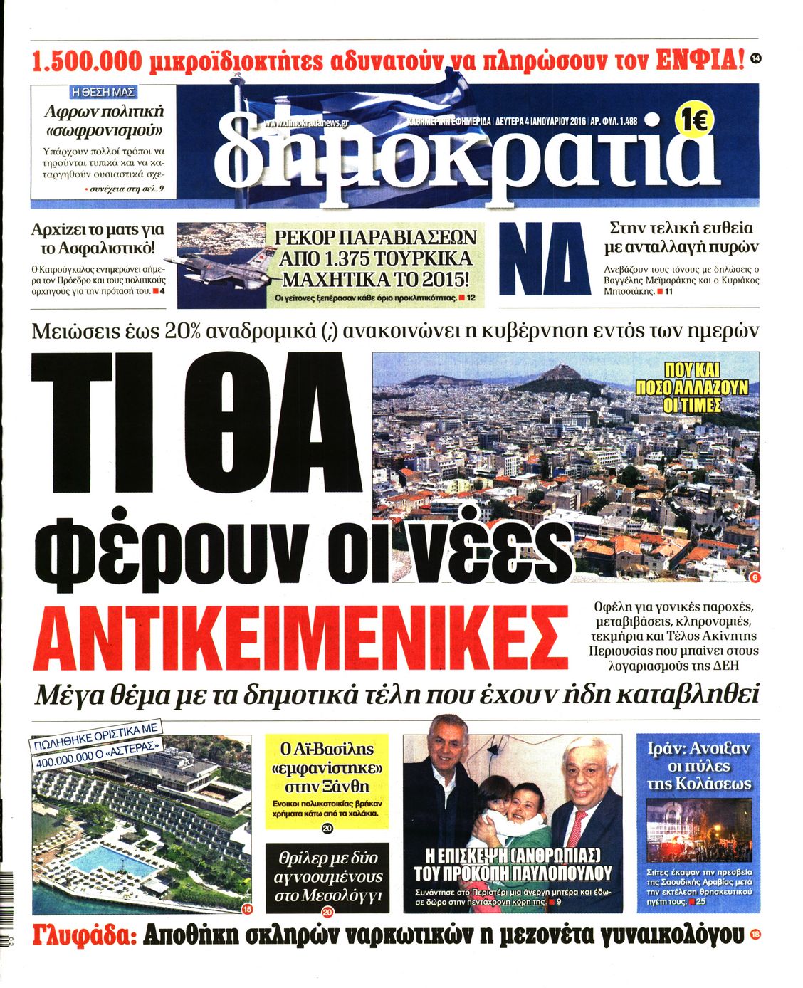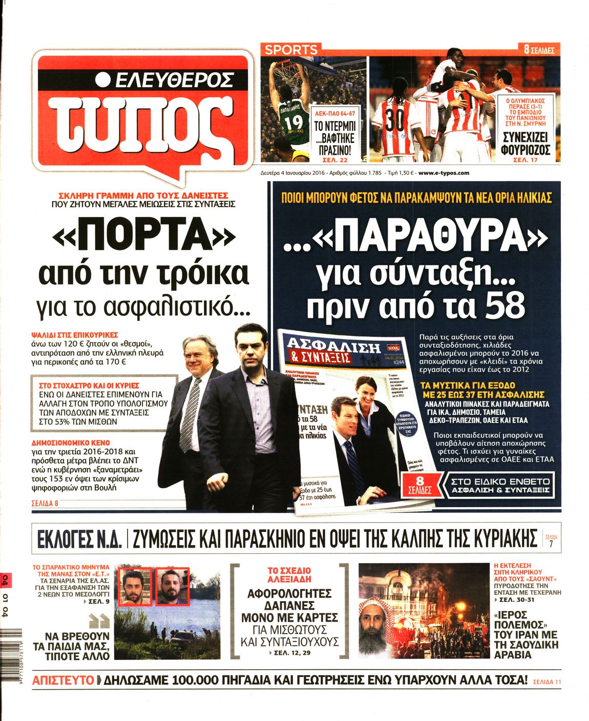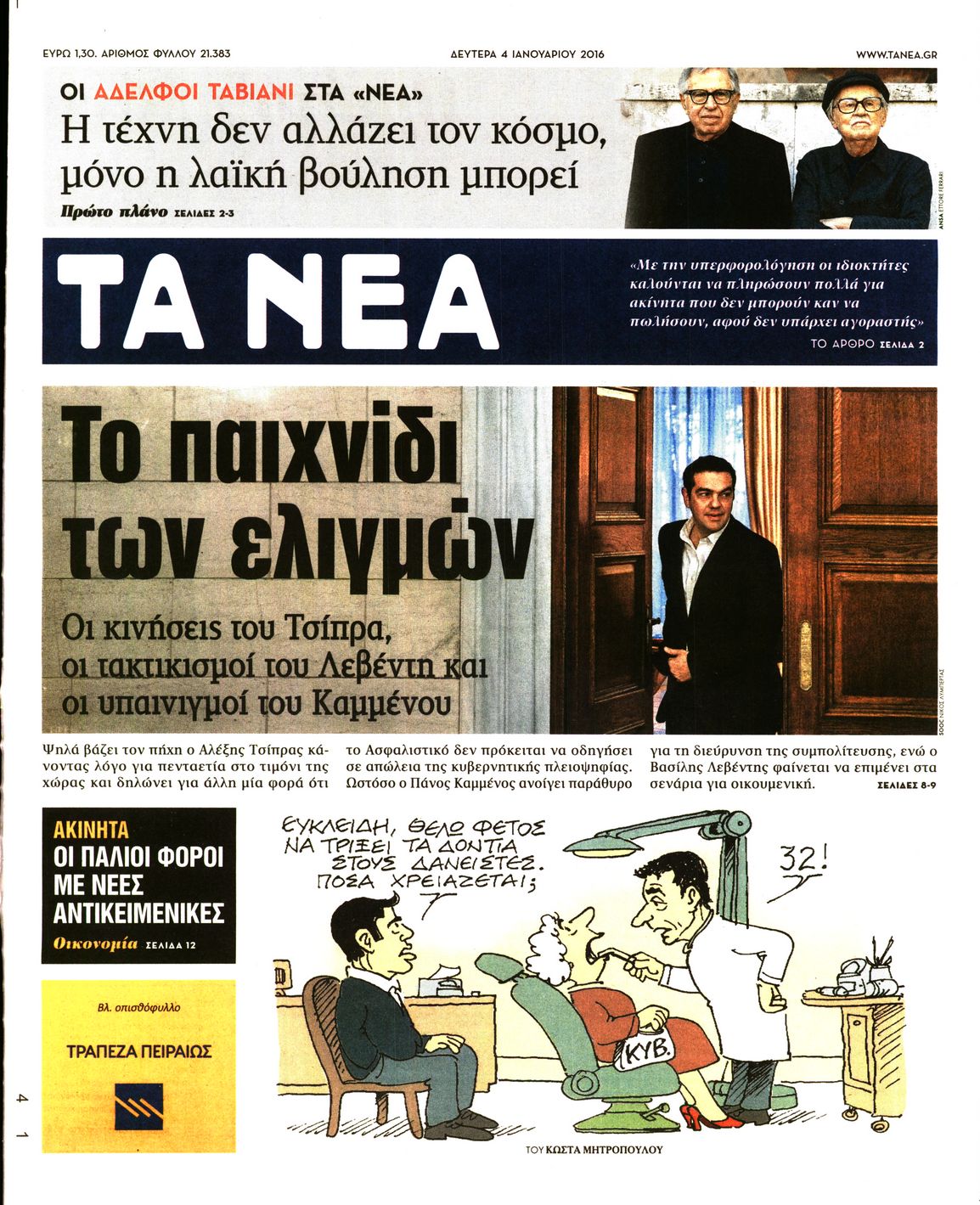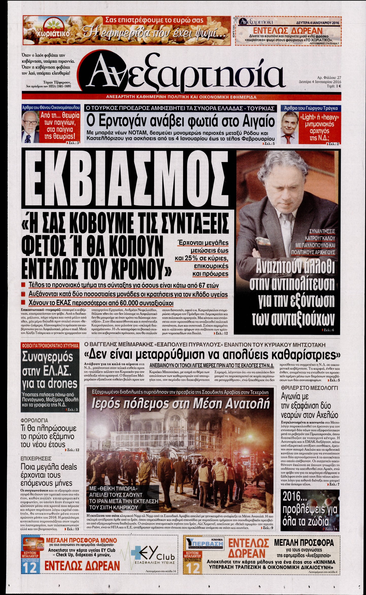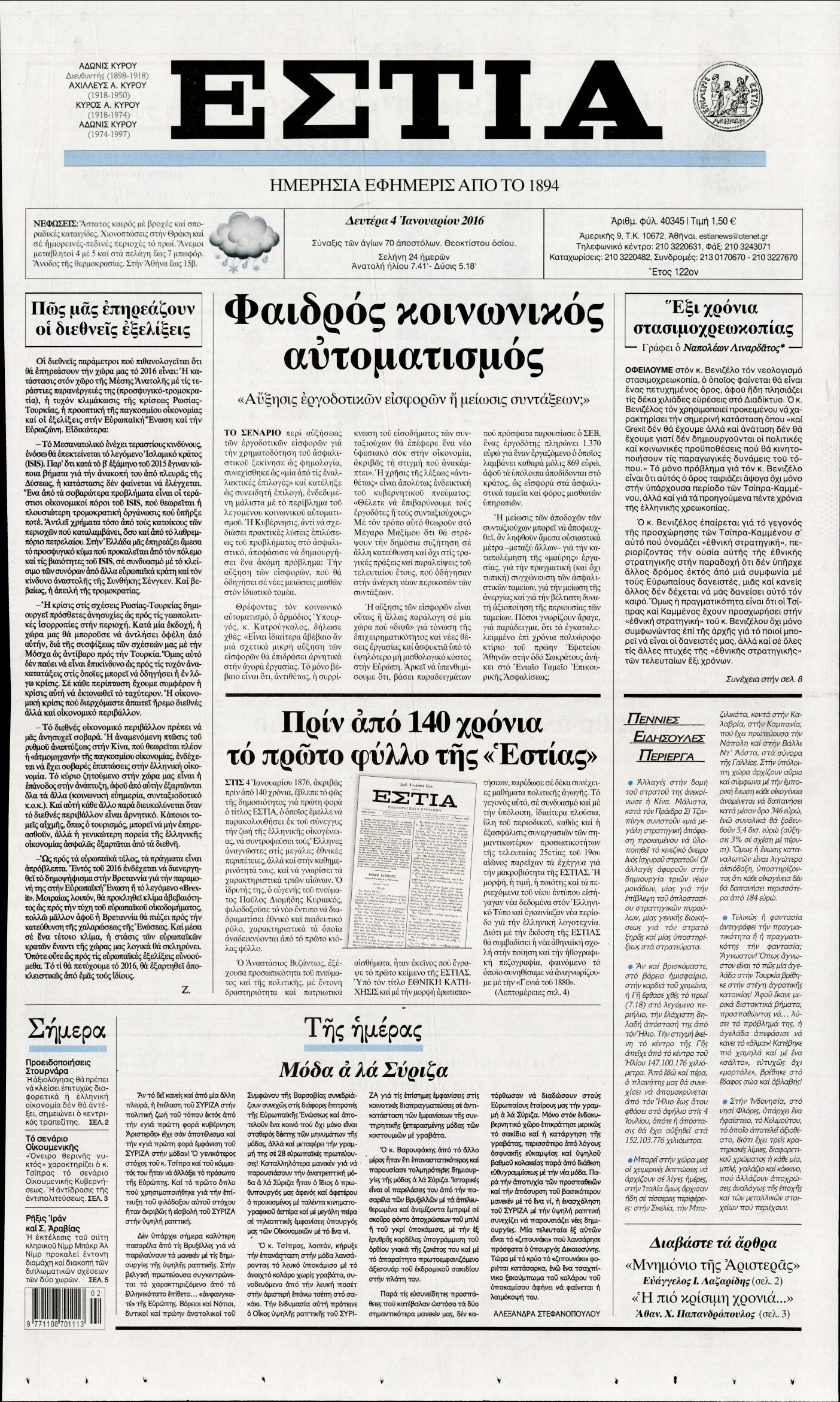 Οι πολιτικές εφημερίδες 4/1/2016 Enikos Newsroom 07:39, Δευτέρα 04 Ιανουαρίου 2016 Media Διαβάστε τα σημερινά πρωτοσέλιδα των πολιτικών εφημερίδων. ΠΟΛΙΤΙΚΕΣ ΕΦΗΜΕΡΙΔΕΣ ΠΡΩΤΟΣΕΛΙΔΑ Μοιράσου το: σχολίασε κι εσύ (0 σχόλια) Ακολουθήστε το enikos.gr στο Google News και μάθετε πρώτοι όλες τις ειδήσεις Δείτε όλες τις τελευταίες ειδήσεις από την Ελλάδα και τον Κόσμο στο enikos.gr Ειδήσεις Ροή Ειδήσεων 1 ώρα πριν Διάλογοι-σοκ από το κύκλωμα που διακινούσε ναρκωτικά σε σχολεία – «Αν δεν είσαι εκεί σε 5 λεπτά, θα φας πολύ ξύλο μπρο» 3 ώρες πριν Αγρότες από το μπλόκο Νίκαιας κλείνουν τη Δευτέρα τις σήραγγες των Τεμπών για τα φορτηγά – Τι αποφάσισαν 5 ώρες πριν Κηφισιά: Δύο συλλήψεις για ληστεία με λεία 180.000 ευρώ – Βίντεο ντοκουμέντα από τη δράση των συλληφθέντων 2 ώρες πριν Ζελένσκι: Τάχθηκε σήμερα υπέρ της διεξαγωγής ευρύτερων διαβουλεύσεων με Ευρωπαίους εταίρους 3 ώρες πριν Θεσσαλονίκη: Με Αγιοβασίληδες γέμισε ο Θερμαϊκός στο 5ο Santa SUP 7 ώρες πριν Τα άστρα ευνοούν σκανδαλωδώς 4 ζώδια – «Εμφανίζονται ξαφνικά ευκαιρίες γιατί αποφασίζετε να αφήσετε πίσω το παρελθόν» 5 ώρες πριν Οι άνθρωποι που στρώνουν το κρεβάτι τους κάθε πρωί, διαθέτουν αυτές τις 8 κρυφές δυνάμεις 2 ώρες πριν Ένα πλάσμα στα βάθη της θάλασσας απορροφά άνθρακα από την ατμόσφαιρα – «Δεν είχαμε ιδέα για την ύπαρξή του» 1 ημέρα πριν Enerwave: Το νέο «ρεύμα» στη λιανική ενέργειας που αλλάζει την εμπειρία του καταναλωτή 5 λεπτά πριν Super League 2: Ο Σεμπά πέτυχε το γκολ της χρονιάς με ανάποδο ψαλίδι – ΒΙΝΤΕΟ 14 λεπτά πριν «Πλημμύρισε» με κόσμο η Ερμού ενόψει των Χριστουγέννων – Ουρές στα καταστήματα – ΦΩΤΟ και ΒΙΝΤΕΟ 23 λεπτά πριν Ολυμπιακός: Υπέταξε τον Κολοσσό στο ΣΕΦ με… σούπερ Ντόρσεϊ – Ντεμπούτο για τον Μόντε Μόρις 30 λεπτά πριν Πέθανε σε ηλικία 88 ετών η σπουδαία Ντόρα Γιαννακοπούλου 38 λεπτά πριν Αν ανήκετε σε ένα από αυτά τα 3 ζώδια, το 2026 θα είναι η χρονιά σας – «Η ζωή σας βελτιώνεται σε όλους τους τομείς» ENIKOS NETWORK Ο εγκέφαλός μας ξεπερνά ακόμα σε εξυπνάδα το ΑΙ – Ποιο είναι αυτό στο οποίο είμαστε καλύτεροι Φοράτε ψηλοτάκουνα παπούτσια; Ποδίατροι συμβουλεύουν πόσο ψηλά επιτρέπεται να είναι και πώς να τα επιλέξετε ΕΚΤ: Προβλέπει χαμηλότερες τιμές ενέργειας και αποκλιμάκωση πληθωρισμού στην Ευρωζώνη το 2026 IRIS: Διπλασιάζεται το όριο μεταφοράς χρημάτων μεταξύ ιδιωτών – Οι νέες αλλαγές και πότε θα εφαρμοστούν Χαρτογραφώντας το «σημείο χωρίς επιστροφή»: Για πρώτη φορά αποκαλύπτεται με λεπτομέρεια το ακανθώδες όριο της ατμόσφαιρας τ... Η Google καταργεί τη λειτουργία «dark web report» – Πώς θα μπορούν οι χρήστες να διαγράφουν τα δεδομένα τους περισσότερα 15:08 , Κυριακή 21 Δεκεμβρίου 2025 Μια νύχτα μόνο: Η Αρετή και ο Οδυσσέας έρχονται και πάλι κοντά Το νέο επεισόδιο της δραματικής σειράς του MEGA «Μια νύχτα μόνο», θα προβληθεί απόψε Κυριακή 2... 14:24 , Κυριακή 21 Δεκεμβρίου 2025 IQ 160: Ο φάκελος με το τεστ πατρότητας ανοίγει, απόψε στις 21:00 στο Star Ανατρεπτικό το νέο διπλό επεισόδιο της σειράς “IQ 160” στις 21:00 στο Star. Ο Τηλέ... 09:43 , Κυριακή 21 Δεκεμβρίου 2025 Το λάθος στην ταινία Die Hard που άφησε άναυδους τους θαυμαστές του Μπρους Γουίλις Ένας φανατικός των ταινιών άφησε άναυδους τους θαυμαστές του Die Hard, επισημαίνοντας τρία βασ... 08:13 , Κυριακή 21 Δεκεμβρίου 2025 Άγιος έρωτας: Ένας καταστροφικός σεισμός χτυπά τη Στέρνα Καταιγιστικές είναι οι εξελίξεις στα δυο τελευταία, συγκλονιστικά επεισόδια του 2025 της σειρά... ΤΕΛΕΥΤΑΙΕΣ ΕΙΔΗΣΕΙΣ 5 λεπτά πριν Super League 2: Ο Σεμπά πέτυχε το γ