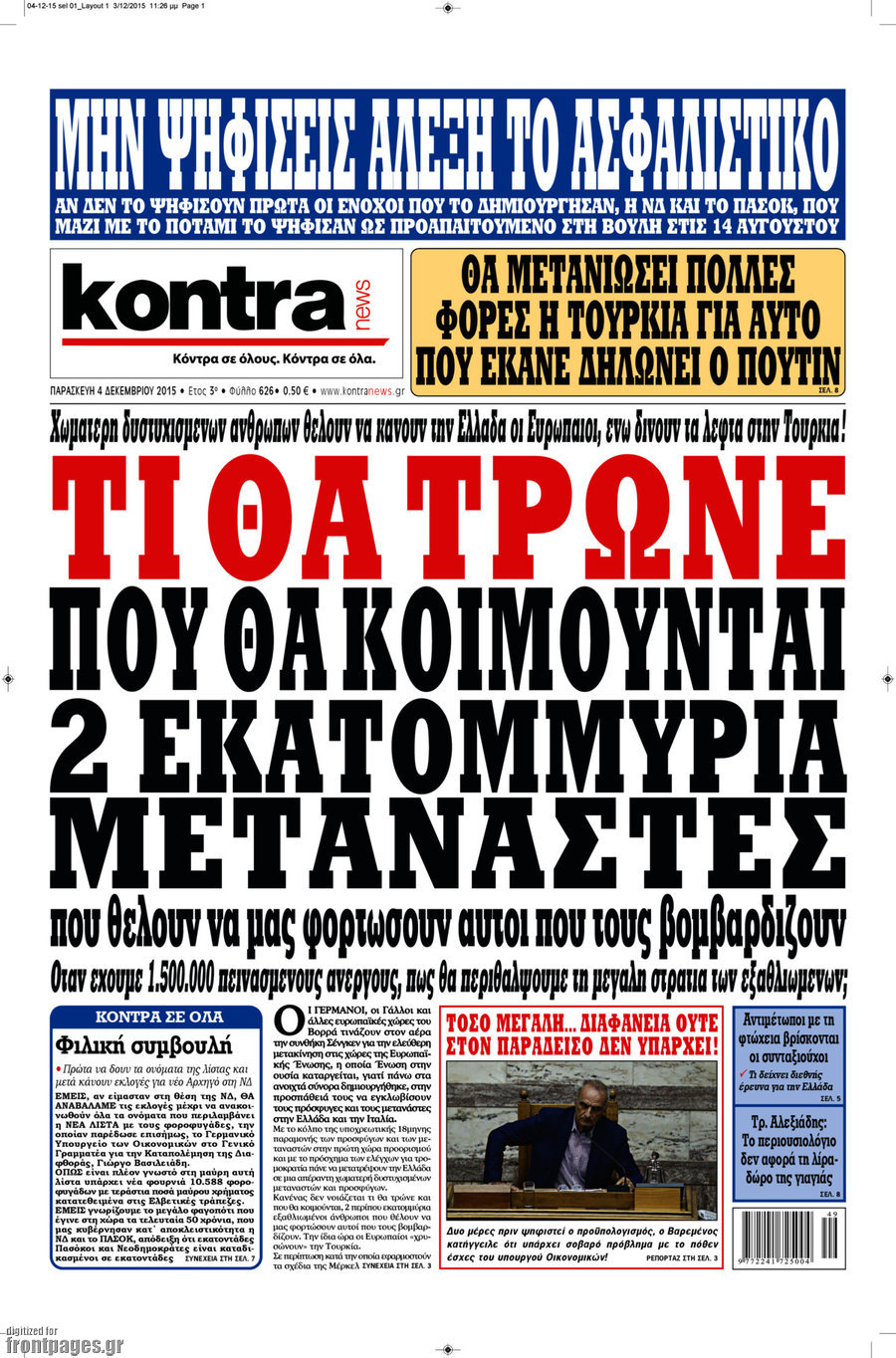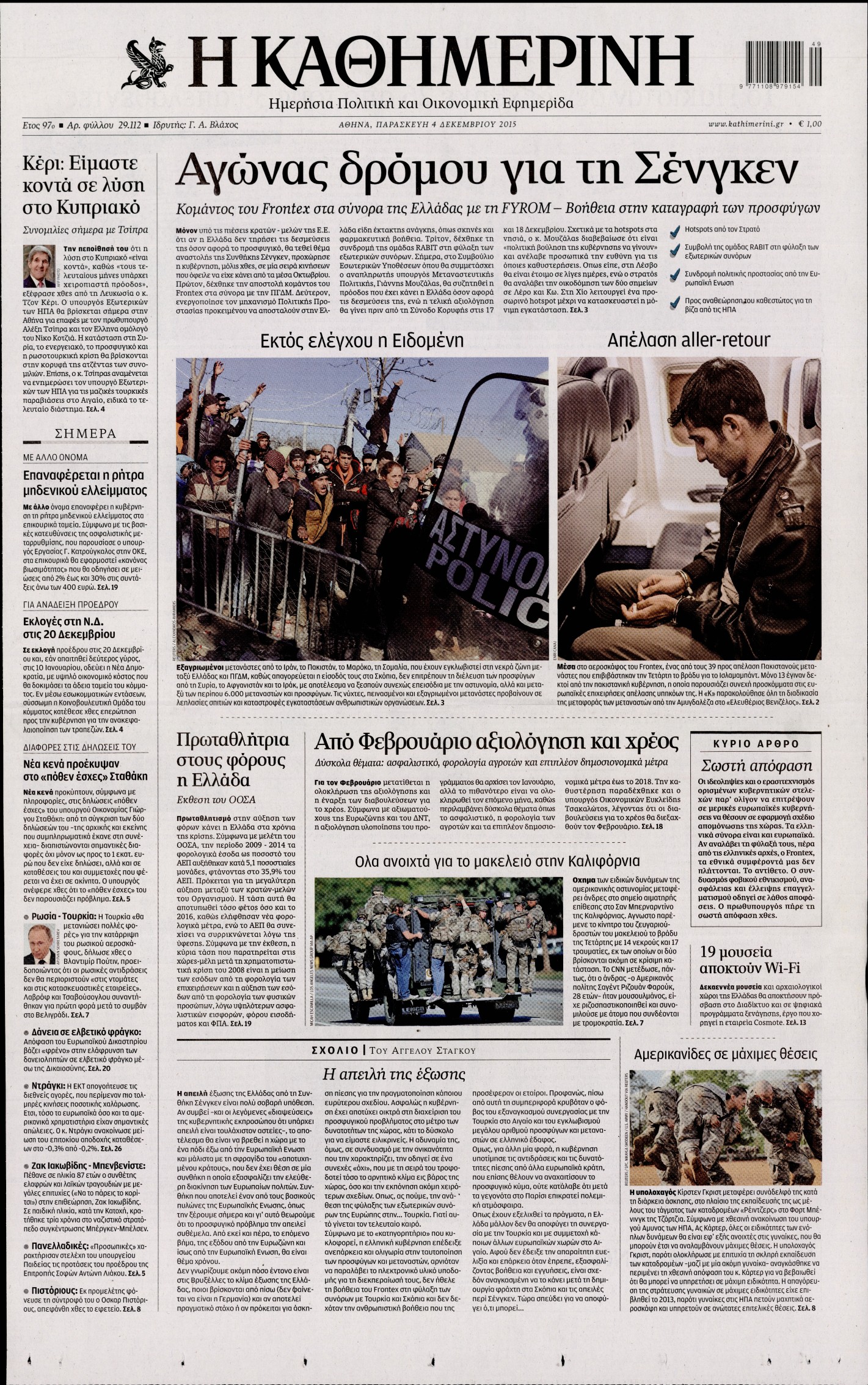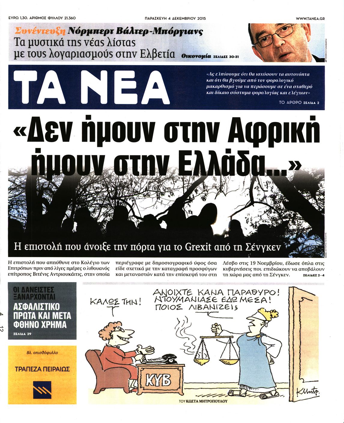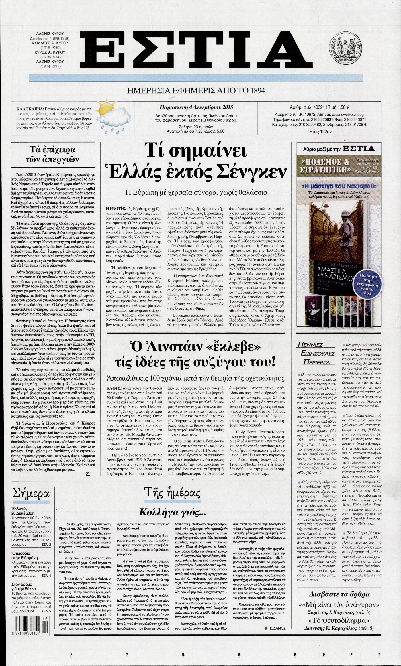 Οι πολιτικές εφημερίδες 4/12/2015 Enikos Newsroom 06:42, Παρασκευή 04 Δεκεμβρίου 2015 Media Διαβάστε τα σημερινά πρωτοσέλιδα των πολιτικών εφημερίδων: ΠΟΛΙΤΙΚΕΣ ΕΦΗΜΕΡΙΔΕΣ ΠΡΩΤΟΣΕΛΙΔΑ Μοιράσου το: σχολίασε κι εσύ (0 σχόλια) Ακολουθήστε το enikos.gr στο Google News και μάθετε πρώτοι όλες τις ειδήσεις Δείτε όλες τις τελευταίες ειδήσεις από την Ελλάδα και τον Κόσμο στο enikos.gr Ειδήσεις Ροή Ειδήσεων 57 λεπτά πριν Μεσόγειος: Η διαδρομή του ρωσικού τάνκερ «Qendil» και η στοχευμένη επίθεση της Ουκρανίας με drone – Ο Πούτιν προειδοποίησε για αντίποινα 51 λεπτά πριν Αττική: Θρίλερ με νεκρό βρέφος 5 μηνών – Κοιμόταν στο ίδιο κρεβάτι με τους γονείς του 2 ώρες πριν Από το Ορμένιο ως τα Μάλγαρα κι από τη Σιάτιστα μέχρι τη Νίκαια: Μπλόκα σε όλη την Ελλάδα – Το Σάββατο ανοίγουν τα διόδια οι αγρότες 2 ώρες πριν «Έλληνας Εσκομπάρ»: Φωτογραφίες με τους 4 τόνους κοκαΐνης που κατασχέθηκαν από το σκάφος «Ουρανία» 3 ώρες πριν Πούτιν: Σαρκαστικά μηνύματα, παράπονα και απρόοπτα στη συνέντευξη Τύπου – Η πρόταση γάμου on air και οι ερωτήσεις για τα αγγούρια και τους… εξωγήινους 3 ώρες πριν Τα 5 ζώδια που ευνοούνται στην ερωτική ζωή τους την επόμενη εβδομάδα – «Η ενέργεια του Αιγόκερου φέρνει αγάπη και σταθερότητα» 7 ώρες πριν Ειδικός μοιράζεται 6 κόλπα για να διατηρείστε σε φόρμα με πάνω από 40 ώρες εργασίας την εβδομάδα: «Προπονηθείτε πριν από τη δουλειά, όχι μετά» 4 ώρες πριν Αυτό το έξυπνο μαθηματικό κόλπο θα μπορούσε να αλλάξει τον τρόπο με τον οποίο οι επιστήμονες μελετούν τους σεισμούς 2 ώρες πριν Κουίζ για την παλιά Αθήνα: Αναγνωρίζετε την περιοχή; Έχετε περάσει 100% από εκεί 3 λεπτά πριν Τέμπη: Διεκόπη για τις 9 Ιανουαρίου η δίκη για τα χαμένα βίντεο της εμπορικής αμαξοστοιχίας – «Απαιτούμε να μας σέβονται» 9 λεπτά πριν Hellenic Train: Αλλαγές και καταργήσεις δρομολογίων λεωφορείων λόγω των αγροτικών κινητοποιήσεων 15 λεπτά πριν Ζελένσκι: «Δεν χρειάζεται αναθεώρηση του Συντάγματος» για να εγκαταλείψει η Ουκρανία τον στόχο ένταξης στο ΝΑΤΟ 19 λεπτά πριν Παναγιώτα Βλαντή: Η τρυφερή εξομολόγηση για τον σύζυγό της – «Πραγματικά ήταν για μένα αυτό που ήθελα σε όλη μου τη ζωή» 26 λεπτά πριν Επίσημη η «βόμβα»: Ο ΠΑΟΚ ανακοίνωσε την απόκτηση του Πάτρικ Μπέβερλι ENIKOS NETWORK «Η σούπερ» γρίπη εξαπλώνεται στην Ευρώπη-Στοιχεία για την αποτελεσματικότητα του εμβολίου από το ECDC ΕΛΣΤΑΤ: Αύξηση κατά 1,7% των επαγγελματιών υγείας το 2024 Η απάντηση της κυβέρνησης στα αιτήματα των αγροτών: 16 έχουν ικανοποιηθεί, 4 βρίσκονται υπό επεξεργασία και 7 δεν είναι εφι... Μισθολογική διαφάνεια: Το 68% των εργαζομένων αγνοεί τη νέα οδηγία – Αναλυτικά τα στοιχεία έρευνας Χαρτογραφώντας το «σημείο χωρίς επιστροφή»: Για πρώτη φορά αποκαλύπτεται με λεπτομέρεια το ακανθώδες όριο της ατμόσφαιρας τ... Η Google καταργεί τη λειτουργία «dark web report» – Πώς θα μπορούν οι χρήστες να διαγράφουν τα δεδομένα τους περισσότερα 18:11 , Παρασκευή 19 Δεκεμβρίου 2025 Το σόι σου: Ο Άρης έρχεται στην Ελλάδα για τις γιορτές των Χριστουγέννων – Τι θα δούμε στο αποψινό εορταστικό επεισόδιο Ένα απολαυστικό, εορταστικό επεισόδιο της σειράς “Το σόι σου”, γεμάτο ευτράπελα αλ... 15:15 , Παρασκευή 19 Δεκεμβρίου 2025 Την Κυριακή με τη Realnews: Ό,τι και αν αγοράσεις, σκανάρεις και κερδίζεις! Την Κυριακή με τη Realnews: Ό,τι και αν αγοράσεις, σκανάρεις και κερδίζεις! Με το PADU app, το... 08:00 , Παρασκευή 19 Δεκεμβρίου 2025 Την Κυριακή με τη Realnews: Δωροεπιταγή 10€ Δωροεπιταγή αξίας 10€ για αγορές άνω των 60€ από τα πολυκα
