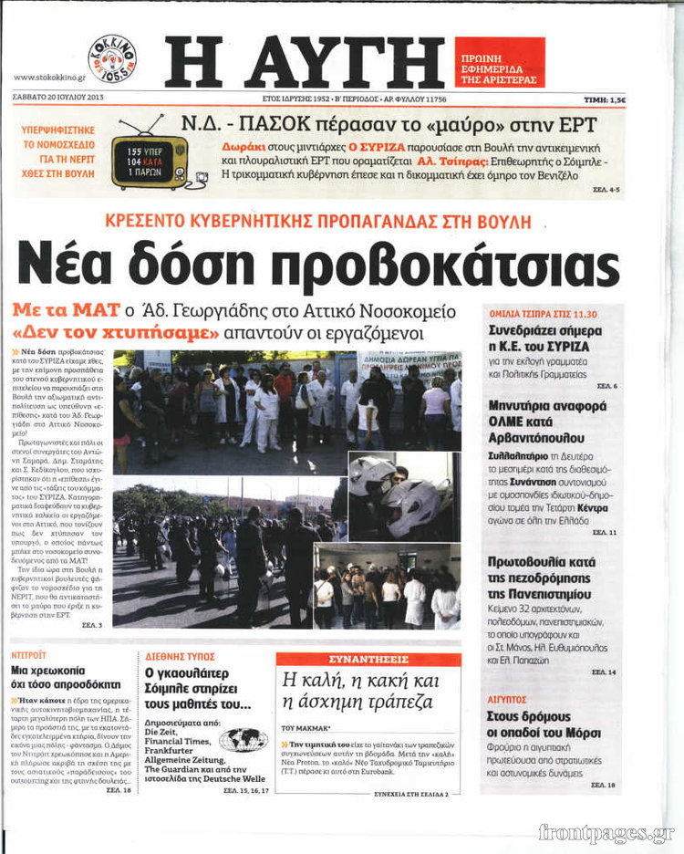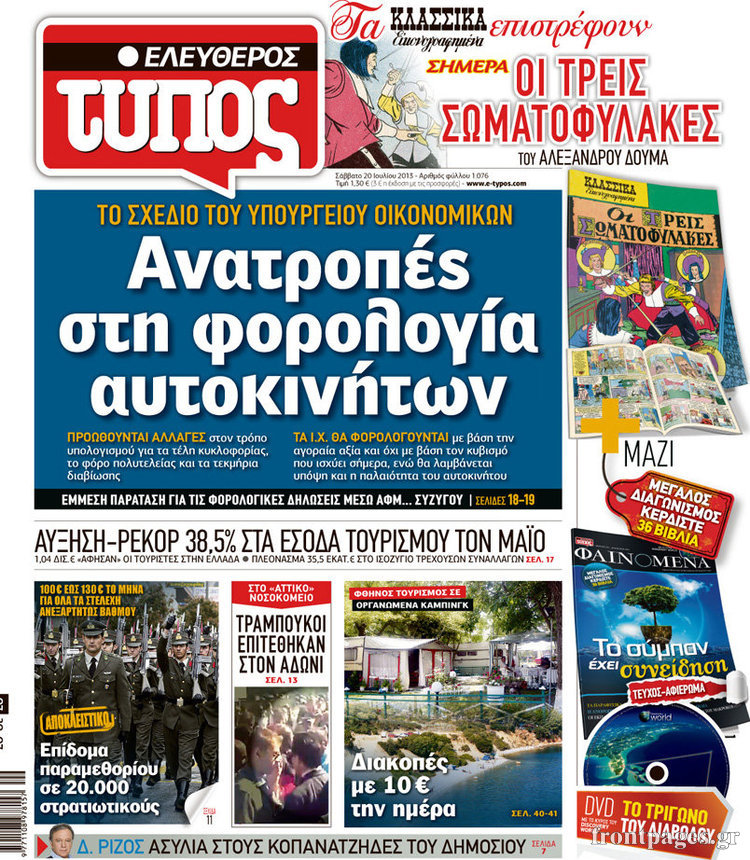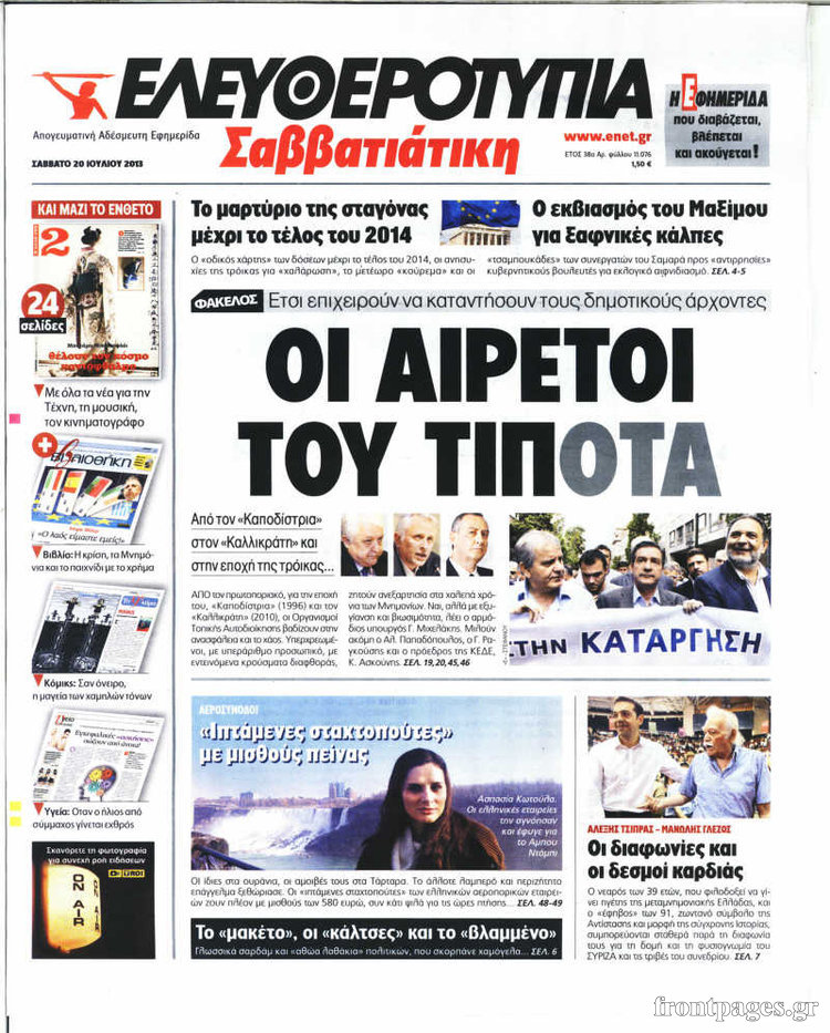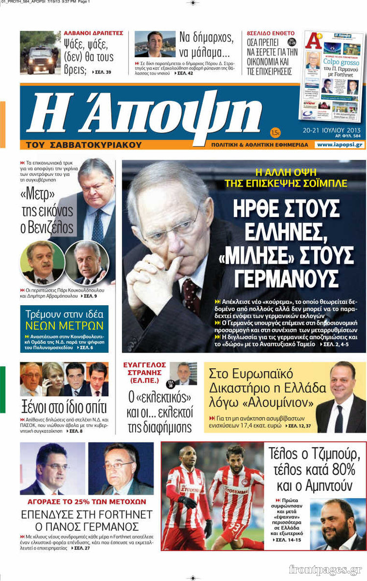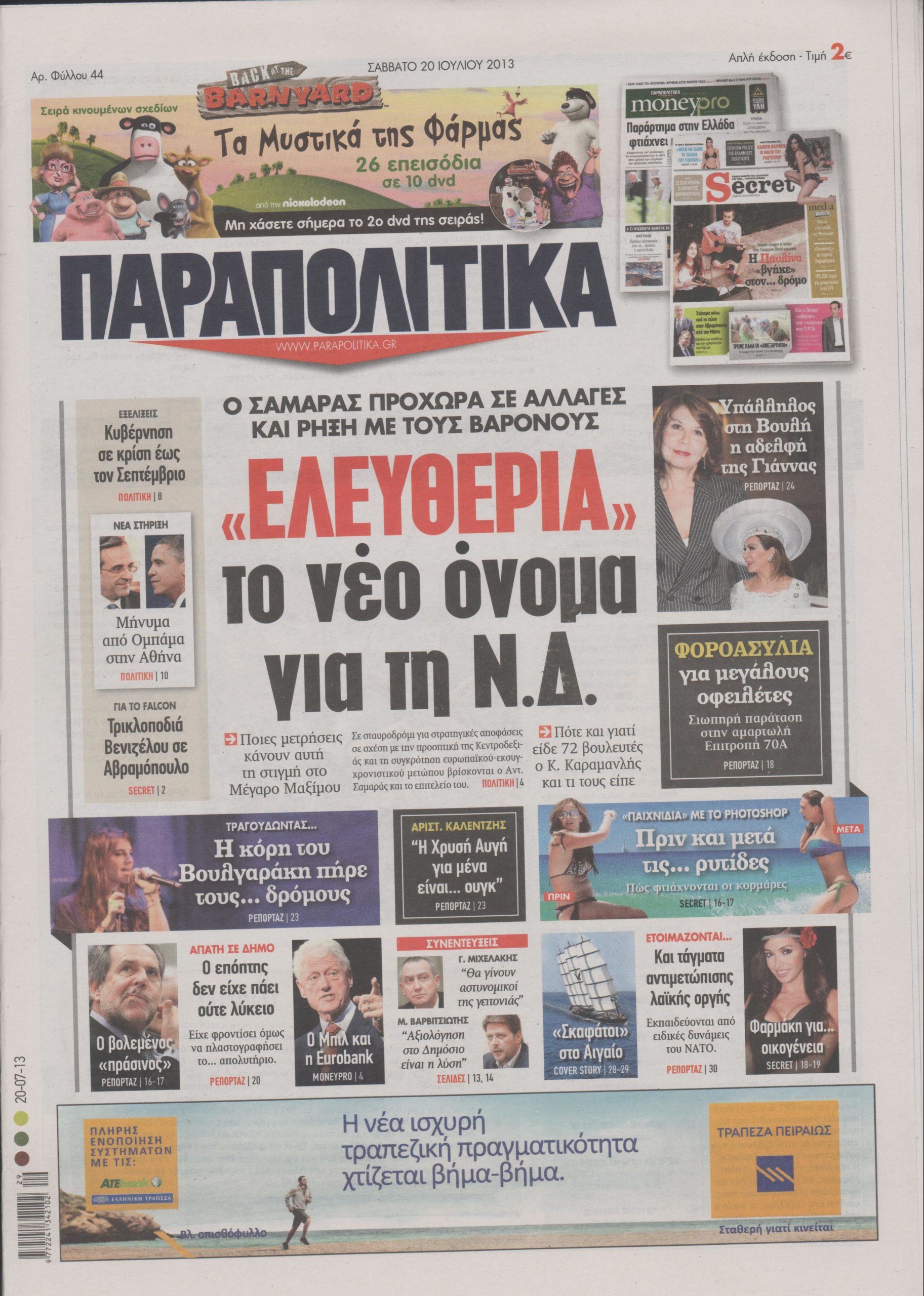 Οι πολιτικές εφημερίδες Enikos Newsroom 08:01, Σάββατο 20 Ιουλίου 2013 Media Οι πολιτικές εφημερίδες Διαβάστε τα πρωτοσέλιδα των πολιτικών εφημερίδων… ΕΦΗΜΕΡΙΔΕΣ ΠΟΛΙΤΙΚΕΣ ΕΦΗΜΕΡΙΔΕΣ Μοιράσου το: σχολίασε κι εσύ (0 σχόλια) Ακολουθήστε το enikos.gr στο Google News και μάθετε πρώτοι όλες τις ειδήσεις Δείτε όλες τις τελευταίες ειδήσεις από την Ελλάδα και τον Κόσμο στο enikos.gr Ειδήσεις Ροή Ειδήσεων 3 ώρες πριν Χριστούγεννα στα μπλόκα: Επιμένουν στις κινητοποιήσεις τους οι αγρότες – Ανοίγουν τα διόδια το Σαββατοκύριακο 3 ώρες πριν Ουκρανία: Η άνευ προηγουμένου επίθεση σε ρωσικό τάνκερ στη Μεσόγειο και το μήνυμα προς στον Πούτιν – Το «μακρύ χέρι» του Κιέβου 2 ώρες πριν Πούτιν: Τα μηνύματα σε Ευρώπη και ΝΑΤΟ από το μαραθώνιο «σόου» του – Η απαίτηση για «σεβασμό» και η ειρήνη «με τους όρους» της Μόσχας 3 ώρες πριν Τραμπ: Δεν αποκλείει την πιθανότητα ενός πολέμου στη Βενεζουέλα – «Ο Μαδούρο ξέρει καλύτερα από τον καθένα τι ακριβώς θέλω» 4 ώρες πριν Συνεχίζει να προκαλεί ο Μίτσκοσκι: «Για μένα το όνομα Μακεδονία είναι ιερό» 2 ώρες πριν Ανακαλύφθηκαν αρχαία χρυσά νομίσματα 2.200 ετών που απεικονίζουν τον θεό Απόλλωνα – Η άγνωστη σύνδεση με τον Φίλιππο Β΄ της Μακεδονίας 3 ώρες πριν Ύπνος: Μια κρυφή κατάσταση του εγκεφάλου πριν από τον ύπνο μπορεί να είναι το “κλειδί” για υψηλή ευφυΐα και δημιουργικότητα 4 ώρες πριν Αριθμολογία: Οι άνθρωποι που έχουν γεννηθεί αυτές τις 4 ημερομηνίες, συχνά παρεξηγούνται – «Η καλοσύνη τους κρύβει τεράστια δύναμη» 5 ώρες πριν Ξεχάστε το καθάρισμα το Σαββατοκύριακο: Ο «κανόνας των 20 λεπτών» που θα σας λύσει τα χέρια 5 λεπτά πριν Συρία: Μαζικά πλήγματα των ΗΠΑ σε θέσεις του Ισλαμικού Κράτους – Χέγκσεθ: «Δεν είναι αρχή πολέμου, είναι μια δήλωση εκδίκησης» για το θάνατο των στρατιωτών μας 18 λεπτά πριν Ουκρανία: Ολοκληρώθηκαν οι συνομιλίες με τους Αμερικανούς κι Ευρωπαίους διαπραγματευτές 33 λεπτά πριν Μπαρτσελόνα – Μπασκόνια 134-124: Οι «μπλαουγκράνα» πήραν το ματς της χρονιάς ύστερα από τρεις παρατάσεις 48 λεπτά πριν Φαίη Σκορδά: «Παλιότερα τα κομπλιμέντα τα προσπερνούσα, τώρα τα έχω ανάγκη» 1 ώρα πριν Βασίλης Σπανούλης: Δεν εμφανίστηκε ούτε ένας δημοσιογράφος στην συνέντευξη Τύπου – «Καλησπέρα στον… κανέναν», δείτε βίντεο ENIKOS NETWORK Το ΕΚΑΒ τιμήθηκε από την Ακαδημία Αθηνών για τα 40 χρόνια προσφοράς του Έχετε πραγματικά μεγάλη καρδιά; 10 χαρακτηριστικά όσων έχουν καλοσύνη Αναστολή μέτρων αναγκαστικής εκτέλεσης για κτηνοτρόφους που πλήττονται από την ευλογιά των αιγοπροβάτων Πλήρης επάρκεια προϊόντων στις λαϊκές της Αττικής, παρά τις αγροτικές κινητοποιήσεις – Τι απαντούν οι πωλητές Χαρτογραφώντας το «σημείο χωρίς επιστροφή»: Για πρώτη φορά αποκαλύπτεται με λεπτομέρεια το ακανθώδες όριο της ατμόσφαιρας τ... Η Google καταργεί τη λειτουργία «dark web report» – Πώς θα μπορούν οι χρήστες να διαγράφουν τα δεδομένα τους περισσότερα 22:42 , Παρασκευή 19 Δεκεμβρίου 2025 Γιώργος Γιαννόπουλος για “Το σόι σου”: “Είναι ευτυχία και ευλογία αυτή η σειρά” «Είναι ευτυχία και ευλογία η συγκυρία αυτής της σειράς», θα πει ο Γιώργος Γιαννόπουλος -ο αγαπ... 20:37 , Παρασκευή 19 Δεκεμβρίου 2025 Don’t Forget The Lyrics: Η Έλλη Κοκκίνου υποδέχεται 4 παίκτες που θα κάνουν τα πάντα για να μη χάσουν ούτε… μισή λέξη από τους στίχους Το «Don’t Forget The Lyrics» επιστρέφει απόψε, Παρασκευή 19 Δεκεμβρίου, στις 21:00 με νέο επει... 19:31 , Παρασκευή 19 Δεκεμβρίου 2025 GNTM: Απόψε ο μεγάλος τελικός για τους 4 φιναλίστ Έπειτα από μ