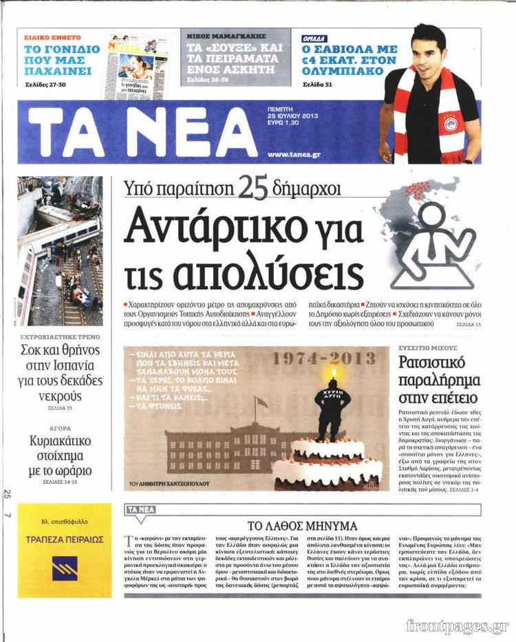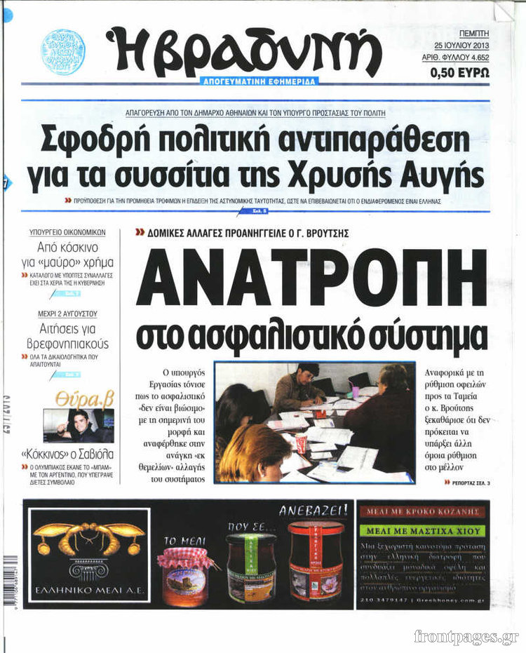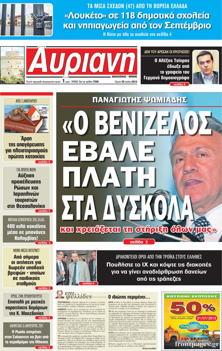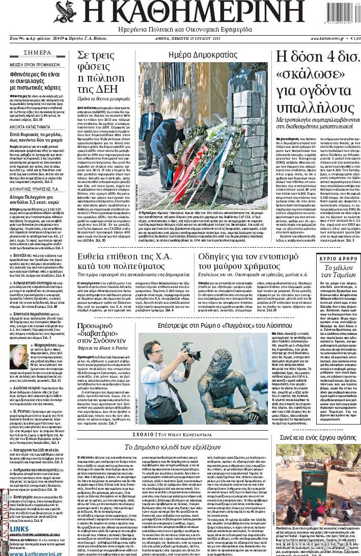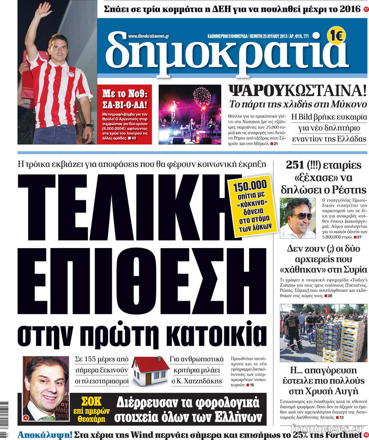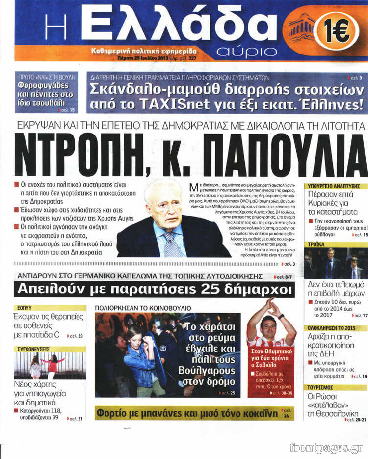 Οι πολιτικές εφημερίδες Enikos Newsroom 08:31, Πέμπτη 25 Ιουλίου 2013 Media Οι πολιτικές εφημερίδες Διαβάστε τα πρωτοσέλιδα των πολιτικών εφημερίδων. ΕΦΗΜΕΡΙΔΕΣ ΠΟΛΙΤΙΚΕΣ ΕΦΗΜΕΡΙΔΕΣ ΠΡΩΤΟΣΕΛΙΔΑ Μοιράσου το: σχολίασε κι εσύ (0 σχόλια) Ακολουθήστε το enikos.gr στο Google News και μάθετε πρώτοι όλες τις ειδήσεις Δείτε όλες τις τελευταίες ειδήσεις από την Ελλάδα και τον Κόσμο στο enikos.gr Ειδήσεις Ροή Ειδήσεων 4 ώρες πριν Χριστούγεννα στα μπλόκα: Επιμένουν στις κινητοποιήσεις τους οι αγρότες – Ανοίγουν τα διόδια το Σαββατοκύριακο 5 ώρες πριν Ουκρανία: Η άνευ προηγουμένου επίθεση σε ρωσικό τάνκερ στη Μεσόγειο και το μήνυμα προς στον Πούτιν – Το «μακρύ χέρι» του Κιέβου 4 ώρες πριν Πούτιν: Τα μηνύματα σε Ευρώπη και ΝΑΤΟ από το μαραθώνιο «σόου» του – Η απαίτηση για «σεβασμό» και η ειρήνη «με τους όρους» της Μόσχας 5 ώρες πριν Τραμπ: Δεν αποκλείει την πιθανότητα ενός πολέμου στη Βενεζουέλα – «Ο Μαδούρο ξέρει καλύτερα από τον καθένα τι ακριβώς θέλω» 5 ώρες πριν Συνεχίζει να προκαλεί ο Μίτσκοσκι: «Για μένα το όνομα Μακεδονία είναι ιερό» 4 ώρες πριν Ανακαλύφθηκαν αρχαία χρυσά νομίσματα 2.200 ετών που απεικονίζουν τον θεό Απόλλωνα – Η άγνωστη σύνδεση με τον Φίλιππο Β΄ της Μακεδονίας 5 ώρες πριν Ύπνος: Μια κρυφή κατάσταση του εγκεφάλου πριν από τον ύπνο μπορεί να είναι το “κλειδί” για υψηλή ευφυΐα και δημιουργικότητα 6 ώρες πριν Αριθμολογία: Οι άνθρωποι που έχουν γεννηθεί αυτές τις 4 ημερομηνίες, συχνά παρεξηγούνται – «Η καλοσύνη τους κρύβει τεράστια δύναμη» 7 ώρες πριν Ξεχάστε το καθάρισμα το Σαββατοκύριακο: Ο «κανόνας των 20 λεπτών» που θα σας λύσει τα χέρια 23 λεπτά πριν Θεσσαλονίκη: Εξαφανίστηκε 13χρονος από χώρο φιλοξενίας ασυνόδευτων ανηλίκων στο Ωραιόκαστρο 34 λεπτά πριν Ντόναλντ Τραμπ: «Πολύ βαριά αντίποινα» στη Συρία – «Πλήττουμε πολύ δυνατά οχυρά του Ισλαμικού Κράτους» 48 λεπτά πριν Εξάρχεια: Ένταση με μολότοφ, χημικά και κρότου λάμψης 1 ώρα πριν ΗΠΑ: Τραγωδία στην Αλαμπάμα – Σκότωσε την δημοσιογράφο σύζυγό του και αυτοκτόνησε μπροστά στον 3χρονο γιο τους 1 ώρα πριν Πρόταση γάμου στο ΣΕΦ κατά την διάρκεια του αγώνα Ολυμπιακός-Βιλερμπάν – Δείτε βίντεο ENIKOS NETWORK Το ΕΚΑΒ τιμήθηκε από την Ακαδημία Αθηνών για τα 40 χρόνια προσφοράς του Έχετε πραγματικά μεγάλη καρδιά; 10 χαρακτηριστικά όσων έχουν καλοσύνη Αναστολή μέτρων αναγκαστικής εκτέλεσης για κτηνοτρόφους που πλήττονται από την ευλογιά των αιγοπροβάτων Πλήρης επάρκεια προϊόντων στις λαϊκές της Αττικής, παρά τις αγροτικές κινητοποιήσεις – Τι απαντούν οι πωλητές Χαρτογραφώντας το «σημείο χωρίς επιστροφή»: Για πρώτη φορά αποκαλύπτεται με λεπτομέρεια το ακανθώδες όριο της ατμόσφαιρας τ... Η Google καταργεί τη λειτουργία «dark web report» – Πώς θα μπορούν οι χρήστες να διαγράφουν τα δεδομένα τους περισσότερα 22:42 , Παρασκευή 19 Δεκεμβρίου 2025 Γιώργος Γιαννόπουλος για “Το σόι σου”: “Είναι ευτυχία και ευλογία αυτή η σειρά” «Είναι ευτυχία και ευλογία η συγκυρία αυτής της σειράς», θα πει ο Γιώργος Γιαννόπουλος -ο αγαπ... 20:37 , Παρασκευή 19 Δεκεμβρίου 2025 Don’t Forget The Lyrics: Η Έλλη Κοκκίνου υποδέχεται 4 παίκτες που θα κάνουν τα πάντα για να μη χάσουν ούτε… μισή λέξη από τους στίχους Το «Don’t Forget The Lyrics» επιστρέφει απόψε, Παρασκευή 19 Δεκεμβρίου, στις 21:00 με νέο επει... 19:31 , Παρασκευή 19 Δεκεμβρίου 2025 GNTM: Απόψε ο μεγάλος τελικός για τους 4 φιναλίστ Έπειτα από μήνες γεμάτους μόδα, δημιουργία και έντονες αναμετρήσεις, το GNTM 2025 κορυφώνεται,... 18:11 , Παρασκευή 19 
