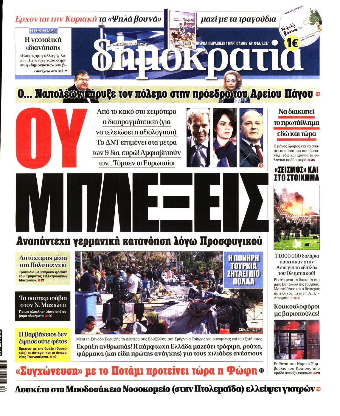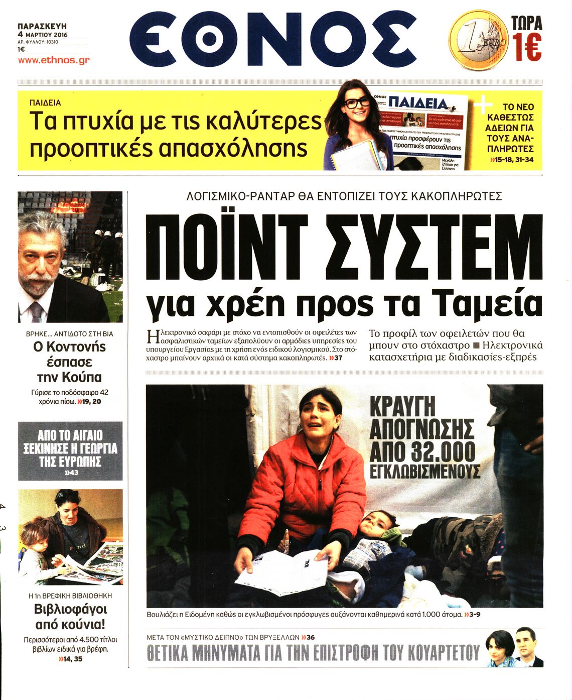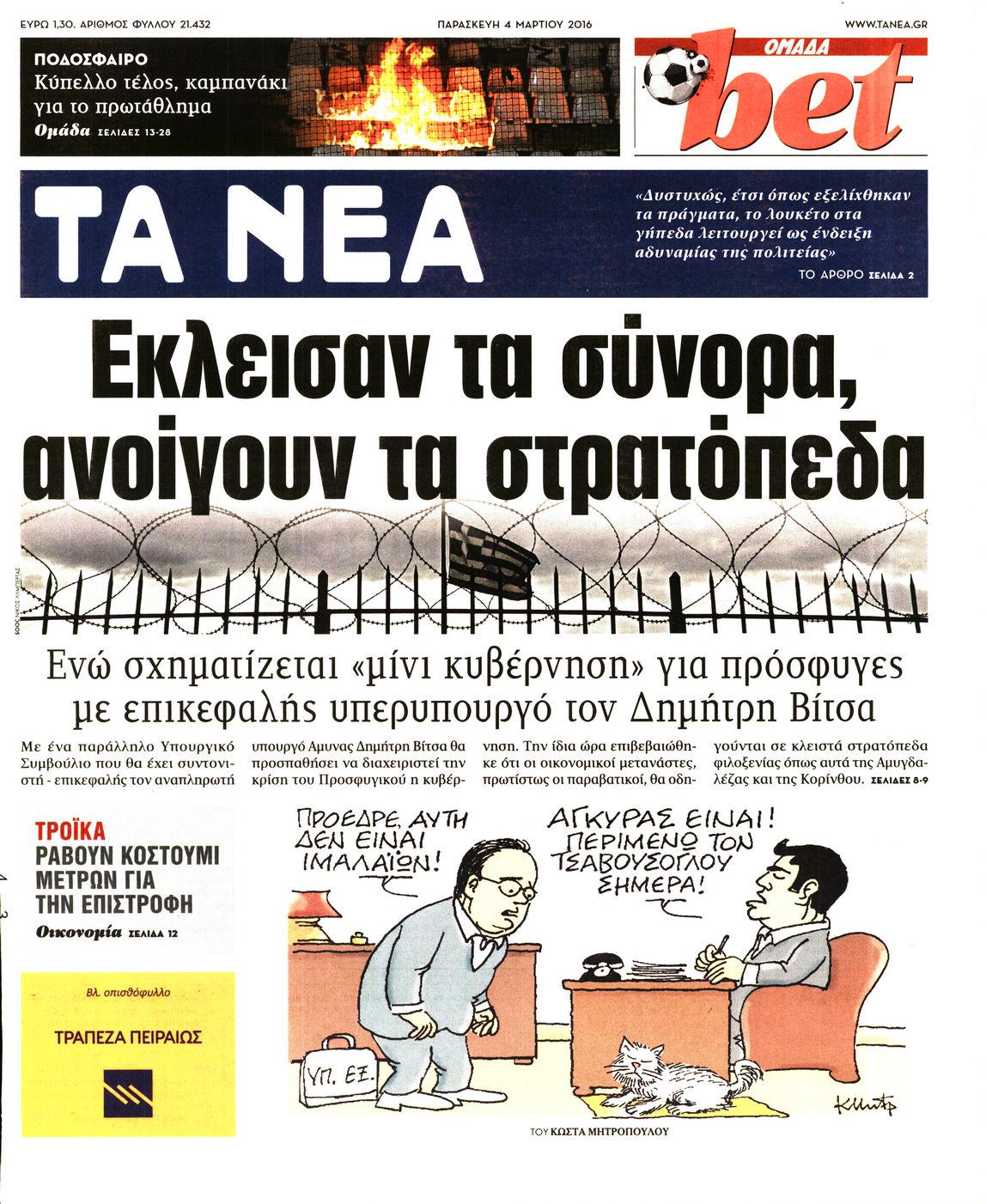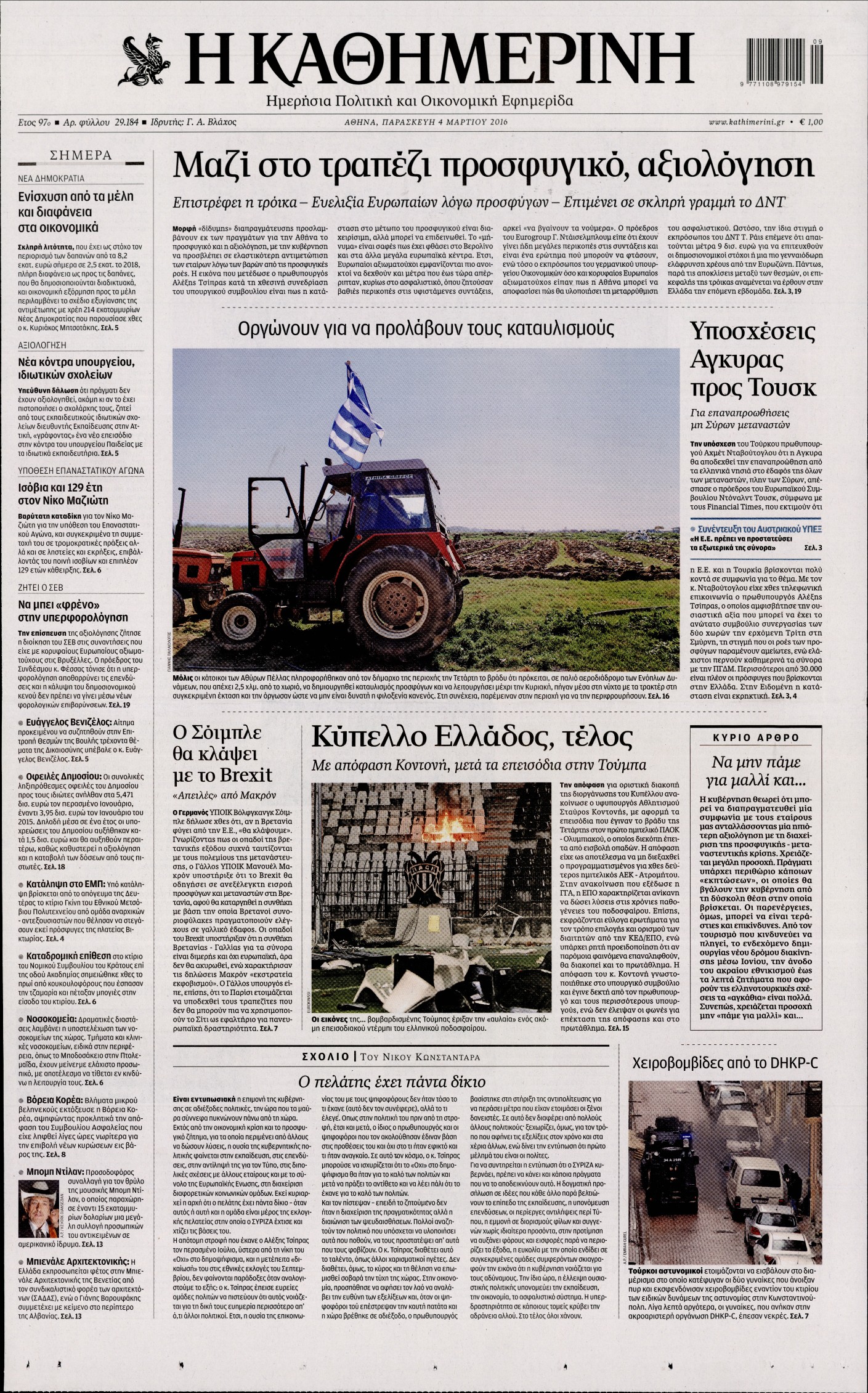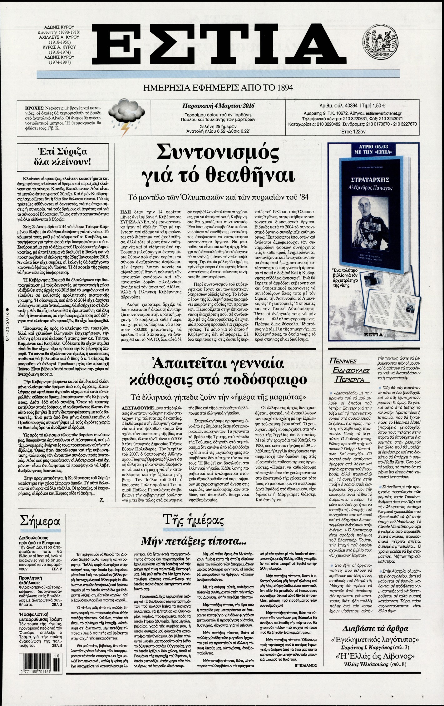 Οι πολιτικές εφημερίδες 4/3/2016 Enikos Newsroom 06:23, Παρασκευή 04 Μαρτίου 2016 Media Διαβάστε τα σημερινά πρωτοσέλιδα των πολιτικών εφημερίδων: ΠΟΛΙΤΙΚΕΣ ΕΦΗΜΕΡΙΔΕΣ ΠΡΩΤΟΣΕΛΙΔΑ Μοιράσου το: σχολίασε κι εσύ (0 σχόλια) Ακολουθήστε το enikos.gr στο Google News και μάθετε πρώτοι όλες τις ειδήσεις Δείτε όλες τις τελευταίες ειδήσεις από την Ελλάδα και τον Κόσμο στο enikos.gr Ειδήσεις Ροή Ειδήσεων 2 ώρες πριν Χριστούγεννα στα μπλόκα: Επιμένουν στις κινητοποιήσεις τους οι αγρότες – Ανοίγουν τα διόδια το Σαββατοκύριακο 3 ώρες πριν Ουκρανία: Η άνευ προηγουμένου επίθεση σε ρωσικό τάνκερ στη Μεσόγειο και το μήνυμα προς στον Πούτιν – Το «μακρύ χέρι» του Κιέβου 2 ώρες πριν Πούτιν: Τα μηνύματα σε Ευρώπη και ΝΑΤΟ από το μαραθώνιο «σόου» του – Η απαίτηση για «σεβασμό» και η ειρήνη «με τους όρους» της Μόσχας 3 ώρες πριν Τραμπ: Δεν αποκλείει την πιθανότητα ενός πολέμου στη Βενεζουέλα – «Ο Μαδούρο ξέρει καλύτερα από τον καθένα τι ακριβώς θέλω» 3 ώρες πριν Συνεχίζει να προκαλεί ο Μίτσκοσκι: «Για μένα το όνομα Μακεδονία είναι ιερό» 2 ώρες πριν Ανακαλύφθηκαν αρχαία χρυσά νομίσματα 2.200 ετών που απεικονίζουν τον θεό Απόλλωνα – Η άγνωστη σύνδεση με τον Φίλιππο Β΄ της Μακεδονίας 3 ώρες πριν Ύπνος: Μια κρυφή κατάσταση του εγκεφάλου πριν από τον ύπνο μπορεί να είναι το “κλειδί” για υψηλή ευφυΐα και δημιουργικότητα 4 ώρες πριν Αριθμολογία: Οι άνθρωποι που έχουν γεννηθεί αυτές τις 4 ημερομηνίες, συχνά παρεξηγούνται – «Η καλοσύνη τους κρύβει τεράστια δύναμη» 5 ώρες πριν Ξεχάστε το καθάρισμα το Σαββατοκύριακο: Ο «κανόνας των 20 λεπτών» που θα σας λύσει τα χέρια 19 λεπτά πριν Φαίη Σκορδά: «Παλιότερα τα κομπλιμέντα τα προσπερνούσα, τώρα τα έχω ανάγκη» 34 λεπτά πριν Βασίλης Σπανούλης: Δεν εμφανίστηκε ούτε ένας δημοσιογράφος στην συνέντευξη Τύπου – «Καλησπέρα στον… κανέναν», δείτε βίντεο 46 λεπτά πριν Πόλεμος στην Ουκρανία: Εφτά νεκροί από ρωσική πυραυλική επίθεση στο λιμάνι της Οδησσού 49 λεπτά πριν ΗΠΑ: Η κυβέρνηση του Ντόναλντ Τραμπ άρχισε να δημοσιοποιεί τα αρχεία Έπσταϊν 1 ώρα πριν Σάμος: Άνοιξε το μπλόκο των αγροτών στον κόμβο Κοκκαρίου – Σε νέα συνεδρίαση θα καθορίσουν την στάση τους ENIKOS NETWORK Το ΕΚΑΒ τιμήθηκε από την Ακαδημία Αθηνών για τα 40 χρόνια προσφοράς του Έχετε πραγματικά μεγάλη καρδιά; 10 χαρακτηριστικά όσων έχουν καλοσύνη Αναστολή μέτρων αναγκαστικής εκτέλεσης για κτηνοτρόφους που πλήττονται από την ευλογιά των αιγοπροβάτων Πλήρης επάρκεια προϊόντων στις λαϊκές της Αττικής, παρά τις αγροτικές κινητοποιήσεις – Τι απαντούν οι πωλητές Χαρτογραφώντας το «σημείο χωρίς επιστροφή»: Για πρώτη φορά αποκαλύπτεται με λεπτομέρεια το ακανθώδες όριο της ατμόσφαιρας τ... Η Google καταργεί τη λειτουργία «dark web report» – Πώς θα μπορούν οι χρήστες να διαγράφουν τα δεδομένα τους περισσότερα 22:42 , Παρασκευή 19 Δεκεμβρίου 2025 Γιώργος Γιαννόπουλος για “Το σόι σου”: “Είναι ευτυχία και ευλογία αυτή η σειρά” «Είναι ευτυχία και ευλογία η συγκυρία αυτής της σειράς», θα πει ο Γιώργος Γιαννόπουλος -ο αγαπ... 20:37 , Παρασκευή 19 Δεκεμβρίου 2025 Don’t Forget The Lyrics: Η Έλλη Κοκκίνου υποδέχεται 4 παίκτες που θα κάνουν τα πάντα για να μη χάσουν ούτε… μισή λέξη από τους στίχους Το «Don’t Forget The Lyrics» επιστρέφει απόψε, Παρασκευή 19 Δεκεμβρίου, στις 21:00 με νέο επει... 19:31 , Παρασκευή 19 Δεκεμβρίου 2025 GNTM: Απόψε ο μεγάλος τελικός για τους 4 φιναλίστ Έπειτα από μήνες γεμάτους μόδα, δημιουργία και έντονες αναμετρήσεις, το GNTM 2025 κορυφώνεται,... 18:11 , Παρασ