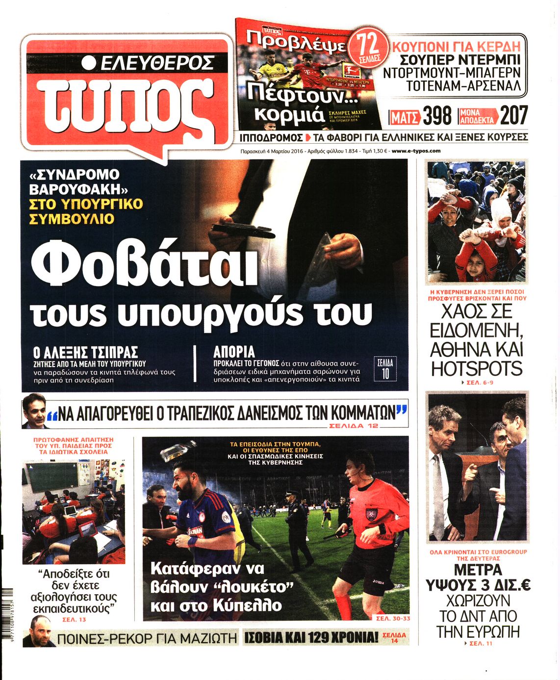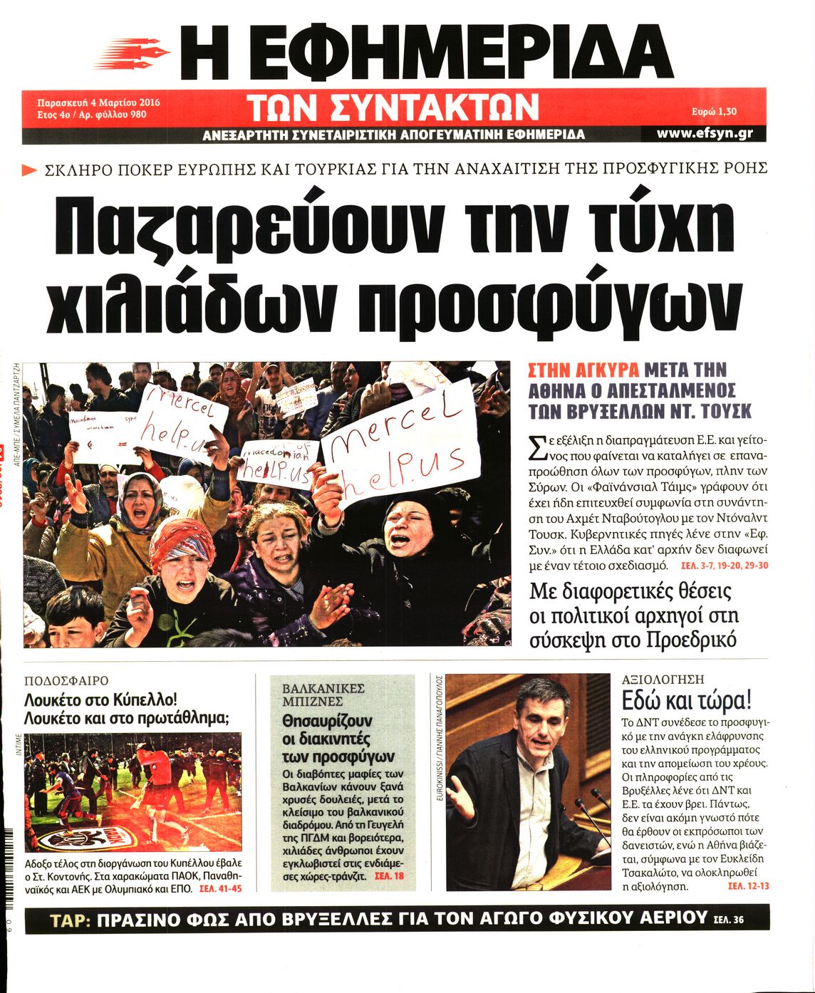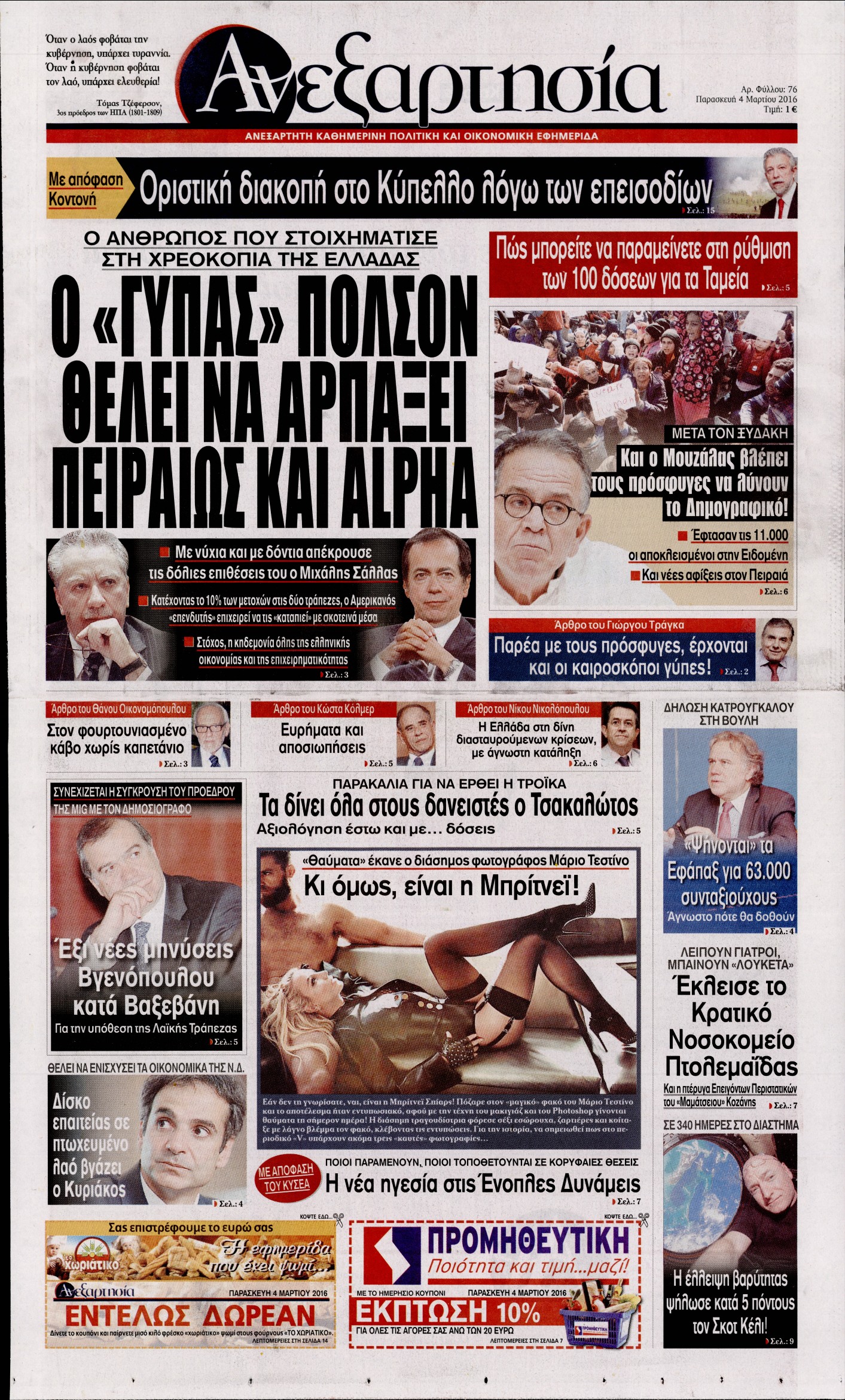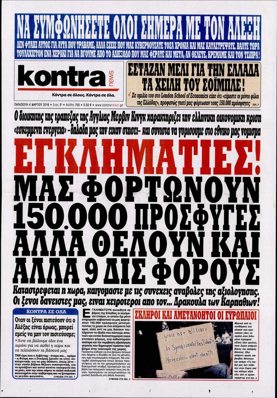 Οι πολιτικές εφημερίδες 4/3/2016 Enikos Newsroom 06:23, Παρασκευή 04 Μαρτίου 2016 Media Διαβάστε τα σημερινά πρωτοσέλιδα των πολιτικών εφημερίδων: ΠΟΛΙΤΙΚΕΣ ΕΦΗΜΕΡΙΔΕΣ ΠΡΩΤΟΣΕΛΙΔΑ Μοιράσου το: σχολίασε κι εσύ (0 σχόλια) Ακολουθήστε το enikos.gr στο Google News και μάθετε πρώτοι όλες τις ειδήσεις Δείτε όλες τις τελευταίες ειδήσεις από την Ελλάδα και τον Κόσμο στο enikos.gr Ειδήσεις Ροή Ειδήσεων 2 ώρες πριν Χριστούγεννα στα μπλόκα: Επιμένουν στις κινητοποιήσεις τους οι αγρότες – Ανοίγουν τα διόδια το Σαββατοκύριακο 3 ώρες πριν Ουκρανία: Η άνευ προηγουμένου επίθεση σε ρωσικό τάνκερ στη Μεσόγειο και το μήνυμα προς στον Πούτιν – Το «μακρύ χέρι» του Κιέβου 2 ώρες πριν Πούτιν: Τα μηνύματα σε Ευρώπη και ΝΑΤΟ από το μαραθώνιο «σόου» του – Η απαίτηση για «σεβασμό» και η ειρήνη «με τους όρους» της Μόσχας 3 ώρες πριν Τραμπ: Δεν αποκλείει την πιθανότητα ενός πολέμου στη Βενεζουέλα – «Ο Μαδούρο ξέρει καλύτερα από τον καθένα τι ακριβώς θέλω» 3 ώρες πριν Συνεχίζει να προκαλεί ο Μίτσκοσκι: «Για μένα το όνομα Μακεδονία είναι ιερό» 2 ώρες πριν Ανακαλύφθηκαν αρχαία χρυσά νομίσματα 2.200 ετών που απεικονίζουν τον θεό Απόλλωνα – Η άγνωστη σύνδεση με τον Φίλιππο Β΄ της Μακεδονίας 3 ώρες πριν Ύπνος: Μια κρυφή κατάσταση του εγκεφάλου πριν από τον ύπνο μπορεί να είναι το “κλειδί” για υψηλή ευφυΐα και δημιουργικότητα 4 ώρες πριν Αριθμολογία: Οι άνθρωποι που έχουν γεννηθεί αυτές τις 4 ημερομηνίες, συχνά παρεξηγούνται – «Η καλοσύνη τους κρύβει τεράστια δύναμη» 5 ώρες πριν Ξεχάστε το καθάρισμα το Σαββατοκύριακο: Ο «κανόνας των 20 λεπτών» που θα σας λύσει τα χέρια 19 λεπτά πριν Φαίη Σκορδά: «Παλιότερα τα κομπλιμέντα τα προσπερνούσα, τώρα τα έχω ανάγκη» 34 λεπτά πριν Βασίλης Σπανούλης: Δεν εμφανίστηκε ούτε ένας δημοσιογράφος στην συνέντευξη Τύπου – «Καλησπέρα στον… κανέναν», δείτε βίντεο 46 λεπτά πριν Πόλεμος στην Ουκρανία: Εφτά νεκροί από ρωσική πυραυλική επίθεση στο λιμάνι της Οδησσού 49 λεπτά πριν ΗΠΑ: Η κυβέρνηση του Ντόναλντ Τραμπ άρχισε να δημοσιοποιεί τα αρχεία Έπσταϊν 1 ώρα πριν Σάμος: Άνοιξε το μπλόκο των αγροτών στον κόμβο Κοκκαρίου – Σε νέα συνεδρίαση θα καθορίσουν την στάση τους ENIKOS NETWORK Το ΕΚΑΒ τιμήθηκε από την Ακαδημία Αθηνών για τα 40 χρόνια προσφοράς του Έχετε πραγματικά μεγάλη καρδιά; 10 χαρακτηριστικά όσων έχουν καλοσύνη Αναστολή μέτρων αναγκαστικής εκτέλεσης για κτηνοτρόφους που πλήττονται από την ευλογιά των αιγοπροβάτων Πλήρης επάρκεια προϊόντων στις λαϊκές της Αττικής, παρά τις αγροτικές κινητοποιήσεις – Τι απαντούν οι πωλητές Χαρτογραφώντας το «σημείο χωρίς επιστροφή»: Για πρώτη φορά αποκαλύπτεται με λεπτομέρεια το ακανθώδες όριο της ατμόσφαιρας τ... Η Google καταργεί τη λειτουργία «dark web report» – Πώς θα μπορούν οι χρήστες να διαγράφουν τα δεδομένα τους περισσότερα 22:42 , Παρασκευή 19 Δεκεμβρίου 2025 Γιώργος Γιαννόπουλος για “Το σόι σου”: “Είναι ευτυχία και ευλογία αυτή η σειρά” «Είναι ευτυχία και ευλογία η συγκυρία αυτής της σειράς», θα πει ο Γιώργος Γιαννόπουλος -ο αγαπ... 20:37 , Παρασκευή 19 Δεκεμβρίου 2025 Don’t Forget The Lyrics: Η Έλλη Κοκκίνου υποδέχεται 4 παίκτες που θα κάνουν τα πάντα για να μη χάσουν ούτε… μισή λέξη από τους στίχους Το «Don’t Forget The Lyrics» επιστρέφει απόψε, Παρασκευή 19 Δεκεμβρίου, στις 21:00 με νέο επει... 19:31 , Παρασκευή 19 Δεκεμβρίου 2025 GNTM: Απόψε ο μεγάλος τελικός για τους 4 φιναλίστ Έπειτα από μήνες γεμάτους μόδα, δημιουργία και έντονες αναμετρήσεις, το GNTM 2025 κορυφώνεται,... 18:11 , Παρασ