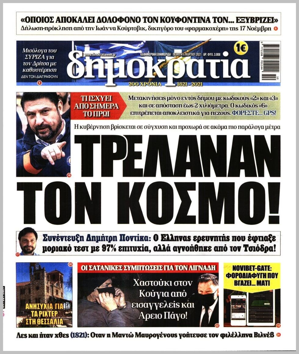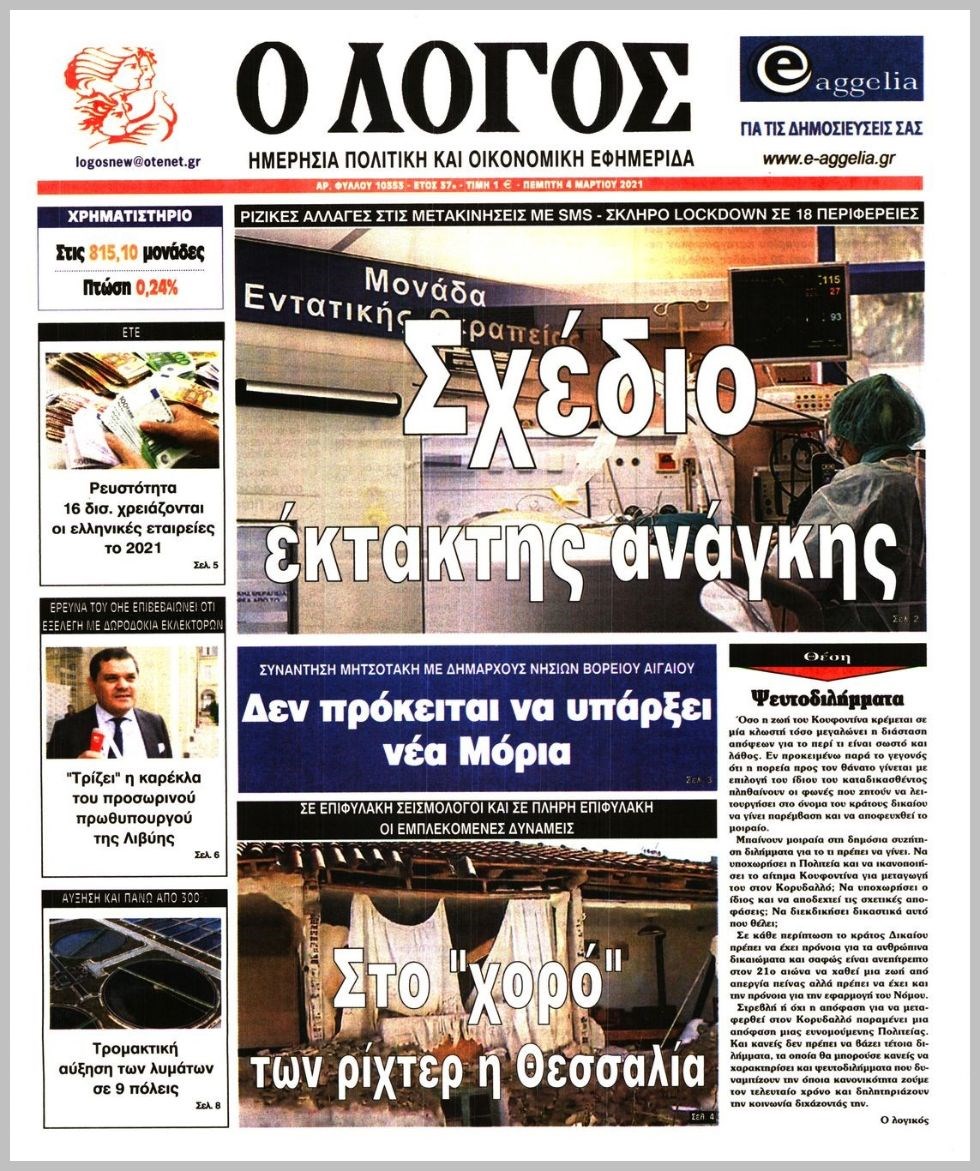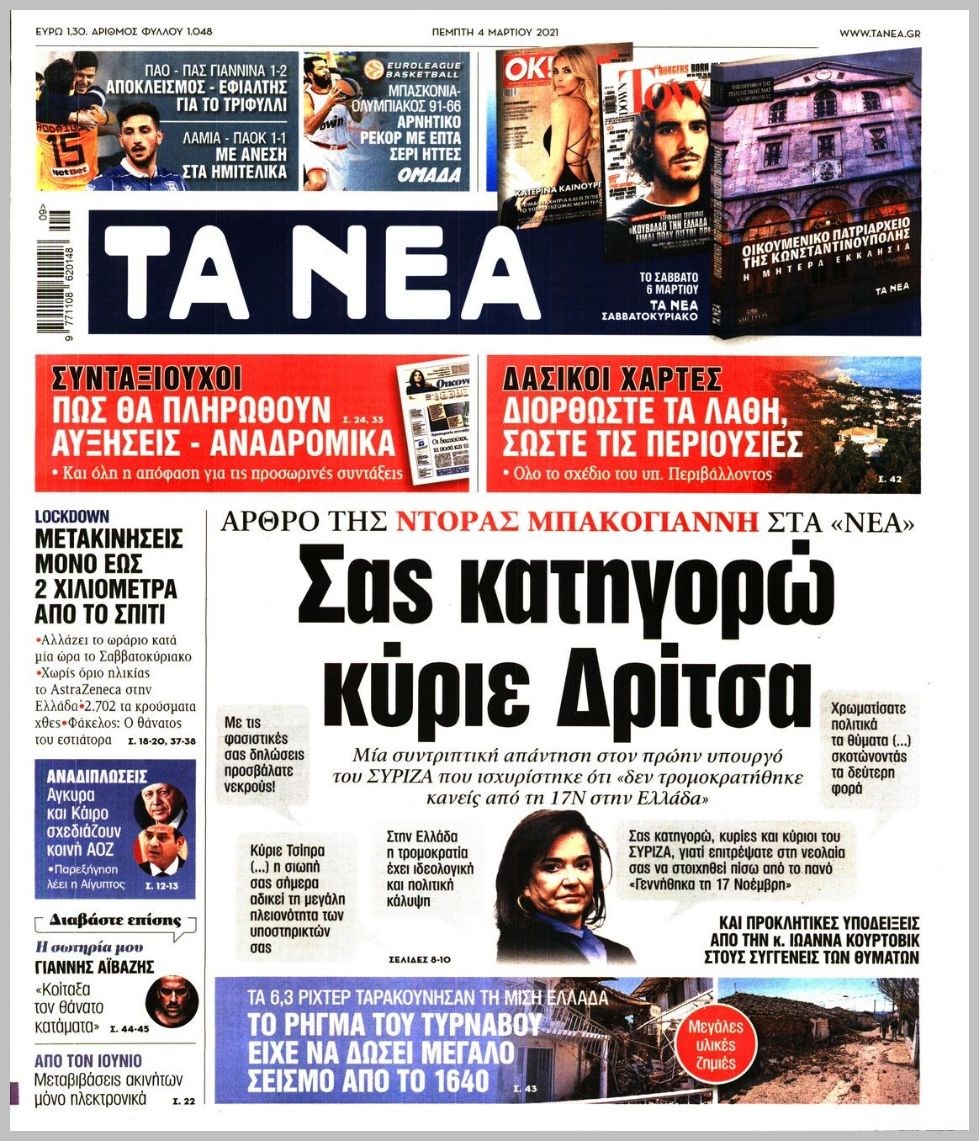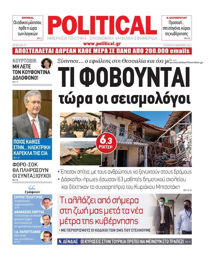 Οι πολιτικές εφημερίδες 4/3/2021 Διονύσης Νίκκας 06:09, Πέμπτη 04 Μαρτίου 2021 Media Διαβάστε τα πρωτοσέλιδα των πολιτικών εφημερίδων… ΕΦΗΜΕΡΙΔΕΣ ΠΟΛΙΤΙΚΕΣ ΕΦΗΜΕΡΙΔΕΣ ΠΡΩΤΟΣΕΛΙΔΑ Μοιράσου το: σχολίασε κι εσύ (0 σχόλια) Ακολουθήστε το enikos.gr στο Google News και μάθετε πρώτοι όλες τις ειδήσεις Δείτε όλες τις τελευταίες ειδήσεις από την Ελλάδα και τον Κόσμο στο enikos.gr Ειδήσεις Ροή Ειδήσεων 2 ώρες πριν Ζελένσκι: Μόνο οι ΗΠΑ και ο Τραμπ μπορούν να πιέσουν τη Ρωσία να βάλει τέλος στον πόλεμο 2 ώρες πριν Φοινικούντα: Προφυλακιστέος ο 30χρονος για συνέργεια στη διπλή δολοφονία – Και άλλα πρόσωπα στο «μικροσκόπιο» 3 ώρες πριν Κυριάκος Μητσοτάκης: Στην Ιερουσαλήμ την Τρίτη ο Πρωθυπουργός για την τριμερή Ελλάδας, Κύπρου, Ισραήλ – Θα συναντηθεί και με τον Αμπάς 6 ώρες πριν Πώς δρούσε το κύκλωμα που διακινούσε ναρκωτικά σε σχολεία – Υπέβαλαν σε βασανιστήρια όσους δεν τηρούσαν τους «κανόνες πειθαρχίας» 3 ώρες πριν Πάπας Λέων: Όταν έχει αϋπνίες επενδύει παραγωγικά τον χρόνο του – Ποιο παιχνίδι παίζει στο κινητό 2 ώρες πριν Αριθμολογία: Ο αριθμός του φύλακα αγγέλου σας, με βάση τον μήνα γέννησής σας – «Έτσι σας στέλνει σημάδια το σύμπαν» 3 ώρες πριν Πώς να απαλλαγείτε από τη μυρωδιά του τηγανητού φαγητού: Το μυστικό βρίσκεται στην κουζίνα σας 4 ώρες πριν Μήπως οι γιορτές σας δεν είναι τόσο τέλειες; 7 χριστουγεννιάτικες συνήθειες που μαρτυρούν ότι μια οικογένεια είναι δυσλειτουργική 14 ώρες πριν Enerwave: Το νέο «ρεύμα» στη λιανική ενέργειας που αλλάζει την εμπειρία του καταναλωτή 10 λεπτά πριν Χριστούγεννα στα μπλόκα οι αγρότες: Άνοιξαν στα διόδια και μοίρασαν προϊόντα στους πολίτες – Νέα σύσκεψη την Κυριακή στη Νίκαια 20 λεπτά πριν Ολυμπιακός – Κηφισιά 1-1: Δεύτερη σερί ισοπαλία για τους Ερυθρόλευκους – Υπό… αμφισβήτηση η κορυφή της Super League 31 λεπτά πριν Κύκλωμα διακίνησης ναρκωτικών σε σχολεία: Τηλεφωνούσαν στους ανηλίκους την ώρα του μαθήματος – Οι διάλογοι-σοκ, τα «ψευδώνυμα» και τα βασανιστήρια 40 λεπτά πριν Χαβιέρ Μιλέι: Ο πρόεδρος της Αργεντινής χαιρετίζει την «πίεση των ΗΠΑ» στη Βενεζουέλα 47 λεπτά πριν Ξένια Τσίρκοβα: Έμαθε από την τηλεόραση ότι είναι η μεγάλη νικήτρια του GNTM – Η αντίδρασή της – ΒΙΝΤΕΟ ENIKOS NETWORK Οι γυναίκες αποκαλύπτουν το πιο ελκυστικό πράγμα που μπορεί να κάνει ένας άνδρας Ομορφιά και αντιγήρανση: Ειδικοί μιλούν για συσκευές περιποίησης του δέρματος Ακύρωση ΑΦΜ για απάτες – Ποιους βάζει στο στόχαστρο η ΑΑΔΕ Ρεύμα: Πώς μπορείτε να αλλάξετε πάροχο γρήγορα και εύκολα – Τα βήματα της διαδικασίας Χαρτογραφώντας το «σημείο χωρίς επιστροφή»: Για πρώτη φορά αποκαλύπτεται με λεπτομέρεια το ακανθώδες όριο της ατμόσφαιρας τ... Η Google καταργεί τη λειτουργία «dark web report» – Πώς θα μπορούν οι χρήστες να διαγράφουν τα δεδομένα τους περισσότερα 20:30 , Σάββατο 20 Δεκεμβρίου 2025 Αυτή την Κυριακή με τη Realnews: Instyle, μαζί Drive και Realnews Geopolitics Αυτή την Κυριακή με τη Realnews: Instyle, μαζί Drive και Realnews Geopolitics Instyle Η Άννα Ρ... 20:28 , Σάββατο 20 Δεκεμβρίου 2025 Ο ΑΝΤ1 γεμίζει τις γιορτές με μουσική – Ποιους καλλιτέχνες θα απολαύσουμε Φέτος στον ΑΝΤ1 γιορτάζουμε τις νύχτες μας παρέα με αγαπημένους καλλιτέχνες και μεγάλες μουσι... 18:19 , Σάββατο 20 Δεκεμβρίου 2025 HOTΕΛ ΕΛVIRA: Η Ελβίρα μαθαίνει πως ο Χάρι μένει κρυφά στο ξενοδοχείο του Παντελή Συνεχίζονται οι εκλογές για πρόεδρο, στο νέο επεισόδιο της κωμικής σειράς του MEGA, HOTΕΛ ΕΛVI... 14:04 , Σάββατο 20 Δεκεμβρίου 2025 Η Realnews αυτής της Κυριακής (21/12/2025) Με τίτλο: «Ασπίδ