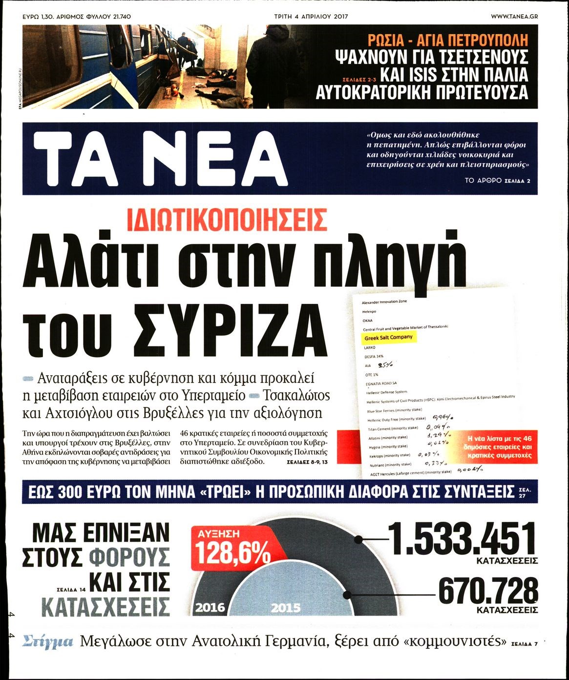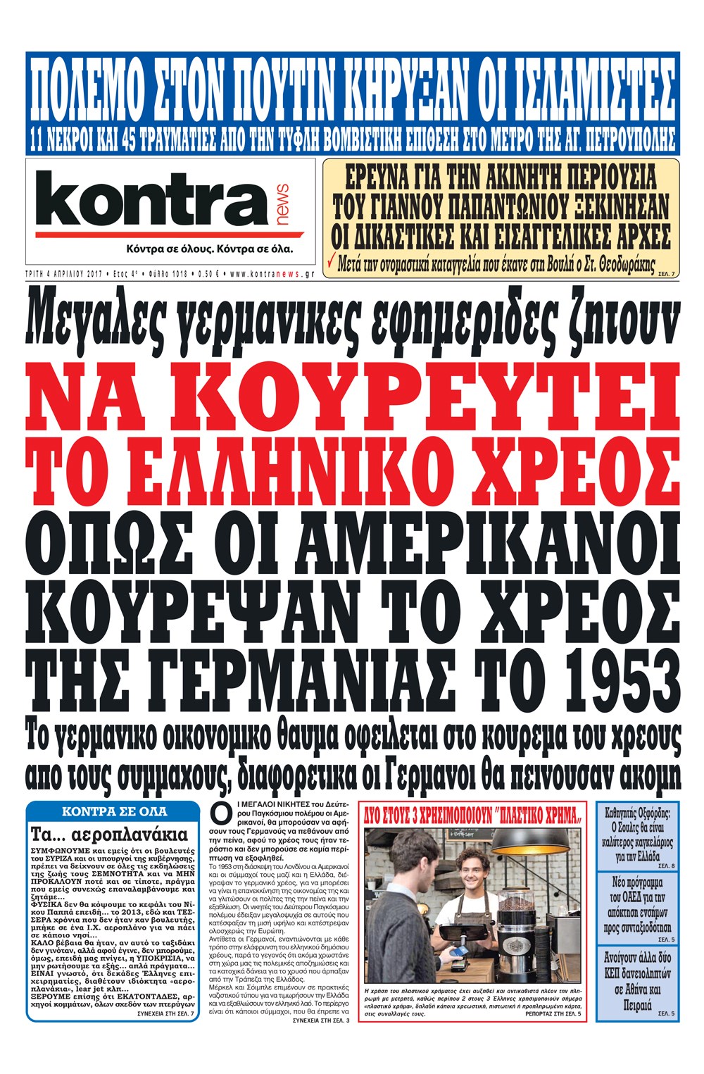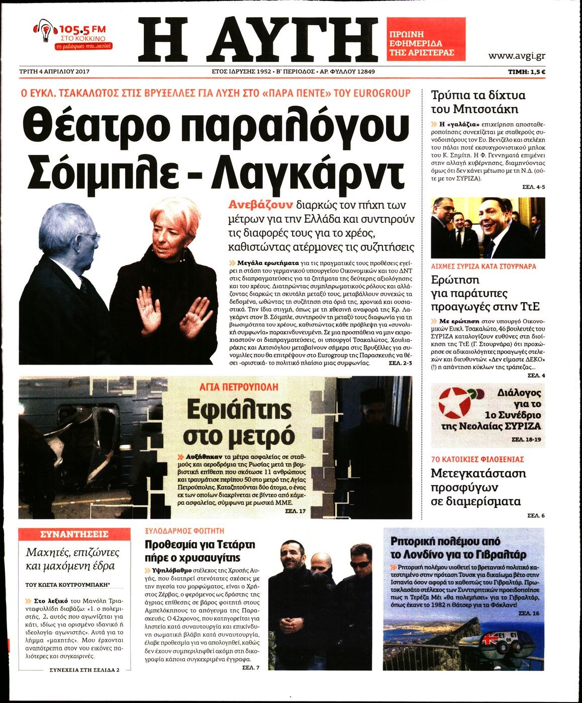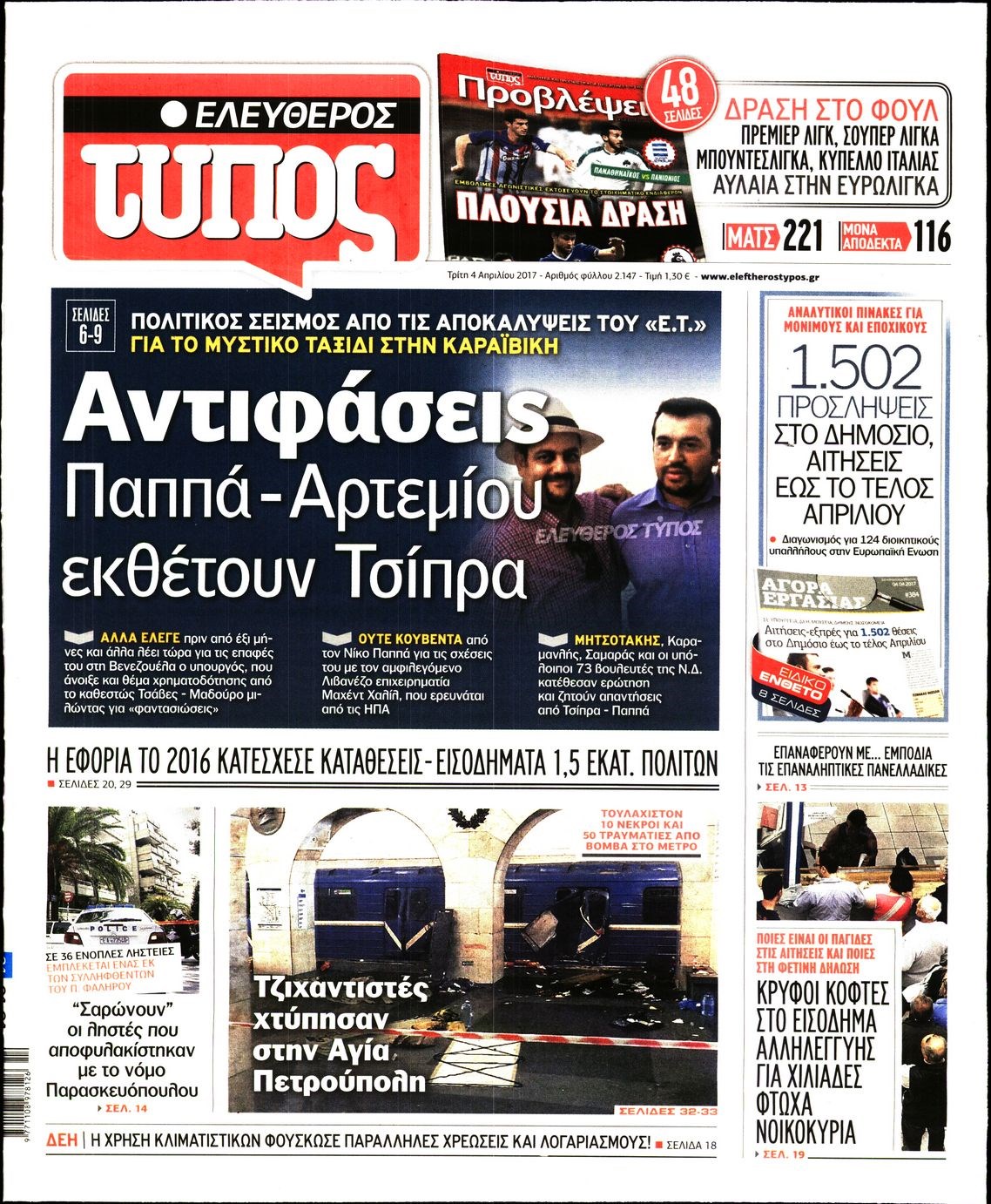 Οι πολιτικές εφημερίδες 4/4/2017 Enikos Newsroom 00:00, Δευτέρα 01 Ιανουαρίου 0001 Media Διαβάστε τα σημερινά πρωτοσέλιδα των πολιτικών εφημερίδων: ΠΟΛΙΤΙΚΕΣ ΕΦΗΜΕΡΙΔΕΣ ΠΡΩΤΟΣΕΛΙΔΑ Μοιράσου το: σχολίασε κι εσύ (0 σχόλια) Ακολουθήστε το enikos.gr στο Google News και μάθετε πρώτοι όλες τις ειδήσεις Δείτε όλες τις τελευταίες ειδήσεις από την Ελλάδα και τον Κόσμο στο enikos.gr Ειδήσεις Ροή Ειδήσεων 4 ώρες πριν Αγρότες: Την Τρίτη η απόφαση για διάλογο ή κλιμάκωση των κινητοποιήσεών τους – Πώς χαρακτηρίζουν τις ανακοινώσεις Τσιάρα και οι επόμενες κινήσεις 4 ώρες πριν Τραμπ για Ουκρανία: «Είμαστε πιο κοντά σε συμφωνία από ποτέ» – «Πολυεθνική δύναμη» προτείνουν οι Ευρωπαίοι 4 ώρες πριν Κυψέλη: Η 16χρονη που μαχαίρωσε την 14χρονη είχε συλληφθεί 3 φορές στο παρελθόν – Έβριζε καθηγητές, έβαζε φωτιές σε κάδους και εκβίαζε συμμαθητές της 4 ώρες πριν Χαλκιδική: Πώς δρούσαν οι αστυνομικοί που συνελήφθησαν για κλήσεις που δεν έκοβαν – Η «ετήσια συνδρομή» για τα μπλόκα της Τροχαίας και οι «δωρεές» 4 ώρες πριν Τρομοκρατική επίθεση στο Σίδνεϊ: Θλίψη για τα 15 θύματα – Οργή στην εβραϊκή κοινότητα που προειδοποιούσε επί δύο χρόνια 5 ώρες πριν Ύπνος: Η αρχαία μορφή άσκησης που αποδεικνύεται αποτελεσματική στην αντιμετώπιση της αϋπνίας, σύμφωνα με μελέτη 6 ώρες πριν Αριθμολογία: Ο τυχερός σας αριθμός, ανάλογα με τον μήνα γέννησής σας 7 ώρες πριν Πώς να μην μαραίνονται γρήγορα τα κομμένα λουλούδια: Το λάθος στην τοποθέτηση του βάζου που πρέπει να αποφεύγετε 4 ώρες πριν Επιστήμονες ίσως έλυσαν το μυστήριο γύρω από τα Χόμπιτ – Νέα έρευνα αποκαλύπτει πώς εξαφανίστηκαν 9 λεπτά πριν Έντι Γαβριηλίδης: «Πούλησα ακριβά σε δημοπρασία το φουστάνι που φόρεσε η Lady Gaga γιατί ξέμεινα από χρήματα» 26 λεπτά πριν Ροντ Στιούαρτ: Εκνευρίστηκε με θεατή στην συναυλία του στην Αθήνα – «Φύγε από την μέση, χαλάς το σόου» 39 λεπτά πριν Μεξικό: Συντριβή μικρού αεροσκάφους – Τουλάχιστον επτά νεκροί 52 λεπτά πριν Serie A: O Γουέσλι Φράνκα επανάφερε τη Ρόμα στις νίκες, 1-0 την Κόμο του Τάσου Δουβίκα 1 ώρα πριν Σεισμός 5,2 Ρίχτερ ανοιχτά της Ζακύνθου ENIKOS NETWORK Πότε το χρόνιο ροχαλητό να αποτελέσει ένδειξη κινδύνου για την καρδιά; Τι λένε οι ειδικοί Μάριος Θεμιστοκλέους: Το ΕΣΥ ενισχύεται, εκσυγχρονίζεται, αλλάζει ΕΒΕΠ για αγροτικές κινητοποιήσεις: Κάθε επιπλέον εβδομάδα προσθέτει περίπου 200 εκατ. ευρώ ζημιά Τι προβλέπει το νομοσχέδιο του υπουργείου Εθνικής Άμυνας – Oι αλλαγές στους μισθούς Σύγχρονος Νοστράδαμος: Προειδοποιεί για «μεγάλο γεγονός» τους επόμενους μήνες που θα συγκλονίσει τη Βρετανία και τον κόσμο Τεστ παρατηρητικότητας: Μπορείτε να βρείτε τις 3 διαφορές στις εικόνες με έναν πιγκουίνο σε 14 δευτερόλεπτα περισσότερα 21:35 , Δευτέρα 15 Δεκεμβρίου 2025 Το Σπίτι Δίπλα Στο Ποτάμι: Η Ιουλία και ο Φωκάς μετακομίζουν στη Ρόδο – Δύο νέοι χαρακτήρες μπαίνουν στη σειρά Δύο νέοι, κομβικοί χαρακτήρες κάνουν την εμφάνισή τους αυτή την εβδομάδα στην αγαπημένη σειρά ... 19:46 , Δευτέρα 15 Δεκεμβρίου 2025 Άγιος έρωτας: Η Χριστίνα λέει την αλήθεια στον Αντρέα Ο Βασίλης δέχεται επίθεση από τους συμμαθητές του, η Αναστασία είναι συντετριμμένη με την απώλ... 18:45 , Δευτέρα 15 Δεκεμβρίου 2025 Συνέδριο «Ελληνικός Τουρισμός 2025, Μια εθνική υπόθεση!» – «Ο Θαλάσσιος Πυλώνας ως Ενιαία Στρατηγική: Συνέργειες σε Λιμάνια, Μαρίνες, Ακτοπλοΐα, Κρουαζιέρα και Yachting» Στο πλαίσιο της τέταρτης και τελευταίας ενότητας του 7ου συνεδρίου «Ελληνικός Τουρισμός 2025, ... 18:13 , Δευτέ