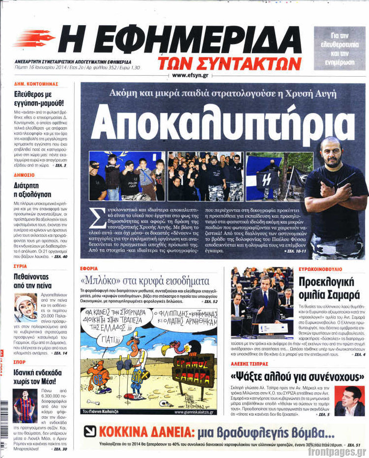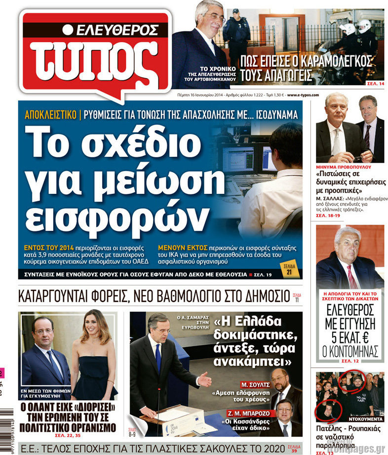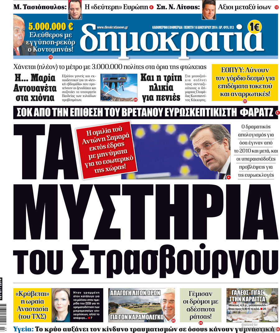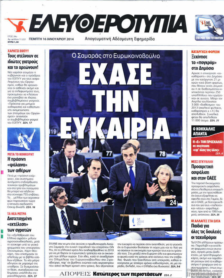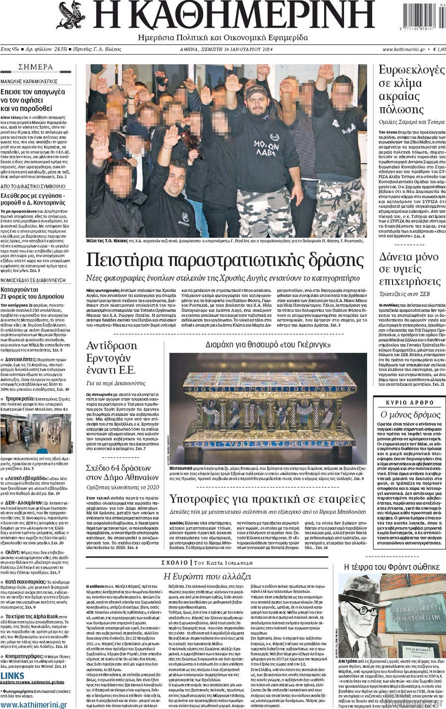 Οι πολιτικές εφημερίδες Enikos Newsroom 08:31, Πέμπτη 16 Ιανουαρίου 2014 Media Οι πολιτικές εφημερίδες Διαβάστε τα πρωτοσέλιδα των πολιτικών εφημερίδων: ΕΦΗΜΕΡΙΔΕΣ ΠΟΛΙΤΙΚΕΣ ΕΦΗΜΕΡΙΔΕΣ ΠΡΩΤΟΣΕΛΙΔΑ Μοιράσου το: σχολίασε κι εσύ (0 σχόλια) Ακολουθήστε το enikos.gr στο Google News και μάθετε πρώτοι όλες τις ειδήσεις Δείτε όλες τις τελευταίες ειδήσεις από την Ελλάδα και τον Κόσμο στο enikos.gr Ειδήσεις Ροή Ειδήσεων 1 ώρα πριν Πώς δρούσε το κύκλωμα που διακινούσε ναρκωτικά σε σχολεία – Υπέβαλαν σε βασανιστήρια όσους δεν τηρούσαν τους «κανόνες πειθαρχίας» 2 ώρες πριν Αγρότες: Γιορτές στα μπλόκα με ανοιχτά διόδια – Δικογραφία στα Ιωάννινα για το σήκωμα των μπαρών 5 ώρες πριν Αρχεία Έπσταϊν: Οι συγκλονιστικές φωτογραφίες – Ο Μάικλ Τζάκσον, ο Μικ Τζάγκερ και ο Κέβιν Σπέισι ανάμεσα στους διάσημους που απεικονίζονται 25 λεπτά πριν NBC: Ο Νετανιάχου σχεδιάζει να ενημερώσει τον Τραμπ για πιθανά νέα πλήγματα εναντίον του Ιράν 34 λεπτά πριν Αττική: Εξαρθρώθηκε εγκληματική οργάνωση που έκλεβε οχήματα, τα παραποιούσε και τα μεταπωλούσε σε πολίτες – Πώς δρούσε το κύκλωμα 2 ώρες πριν Η τύχη χαμογελά σε 3 ζώδια έως τις 28 Δεκεμβρίου – «Προσέξτε τις επιλογές σας και η επιμονή σας θα ανταμειφθεί» 6 ώρες πριν Διαιτολόγος αποκαλύπτει 9 πρωινές συνήθειες που «λιώνουν» το κοιλιακό λίπος – «Υποστηρίζουν την υγιεινή απώλεια βάρους» 3 ώρες πριν Μία ανεκμετάλλευτη πηγή θα μπορούσε να προσφέρει ανεξάντλητη ενέργεια – Οι επιστήμονες ίσως γνωρίζουν πώς να την ξεκλειδώσουν 9 ώρες πριν Enerwave: Το νέο «ρεύμα» στη λιανική ενέργειας που αλλάζει την εμπειρία του καταναλωτή 6 λεπτά πριν Νιούκαστλ – Τσέλσι 2-2: Αλύγιστοι οι Λονδρέζοι 16 λεπτά πριν Μικαέλα Μπέντχαους: Ο πρώτος άνθρωπος σε αναπηρικό αμαξίδιο που ταξίδεψε στο διάστημα – ΒΙΝΤΕΟ 25 λεπτά πριν NBC: Ο Νετανιάχου σχεδιάζει να ενημερώσει τον Τραμπ για πιθανά νέα πλήγματα εναντίον του Ιράν 34 λεπτά πριν Αττική: Εξαρθρώθηκε εγκληματική οργάνωση που έκλεβε οχήματα, τα παραποιούσε και τα μεταπωλούσε σε πολίτες – Πώς δρούσε το κύκλωμα 43 λεπτά πριν Κωνσταντίνος Αργυρός: «Δεν θέλω να ασχοληθώ με την πολιτική σε αυτή τη φάση – Μου έχουν γίνει προτάσεις» ENIKOS NETWORK Γιατί πρέπει να ζητάμε χάρες; Ποιο είναι το φαινόμενο Ben Franklin που κάνει τους άλλους να μας συμπαθούν Η αποχή από την αναπαραγωγή παρατείνει τη ζωή στα ζώα, σύμφωνα με μελέτη – Τι ισχύει για τους ανθρώπους; Στα ύψη ο χρυσός – Νέο ρεκόρ στην τιμή της λίρας, πόσο πωλείται Τέλη κυκλοφορίας 2026: Προσοχή στην προθεσμία εξόφλησής τους – Πώς διαμορφώνονται τα πρόστιμα σε περίπτωση καθυστέρησης Χαρτογραφώντας το «σημείο χωρίς επιστροφή»: Για πρώτη φορά αποκαλύπτεται με λεπτομέρεια το ακανθώδες όριο της ατμόσφαιρας τ... Η Google καταργεί τη λειτουργία «dark web report» – Πώς θα μπορούν οι χρήστες να διαγράφουν τα δεδομένα τους περισσότερα 14:04 , Σάββατο 20 Δεκεμβρίου 2025 Η Realnews αυτής της Κυριακής (21/12/2025) Με τίτλο: «Ασπίδα προστασίας για την Ελλάδα» κυκλοφορεί, αυτήν την Κυριακή, η Realnews. Σημαντ... 12:53 , Σάββατο 20 Δεκεμβρίου 2025 Να μ’ αγαπάς: Το παρελθόν έρχεται στο φως – Καταιγιστικές εξελίξεις στα τελευταία επεισόδια του 2025 Ο Άγγελος αποκαλύπτεται, η Φωτεινή ανησυχεί για τον Λευτέρη και η Ζωή έρχεται αντιμέτωπη με το... 11:41 , Σάββατο 20 Δεκεμβρίου 2025 «Η αγάπη δεν χάνεται ποτέ»: Η μικρού μήκους ταινία κινουμένων σχεδίων που θέτει ερωτήματα για τη ζωή και τον θάνατο Ο θάνατος είναι ένα από τα πιο σκληρά θέματα που καλείται να διαχει