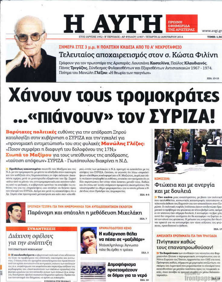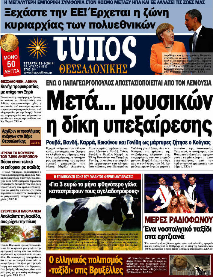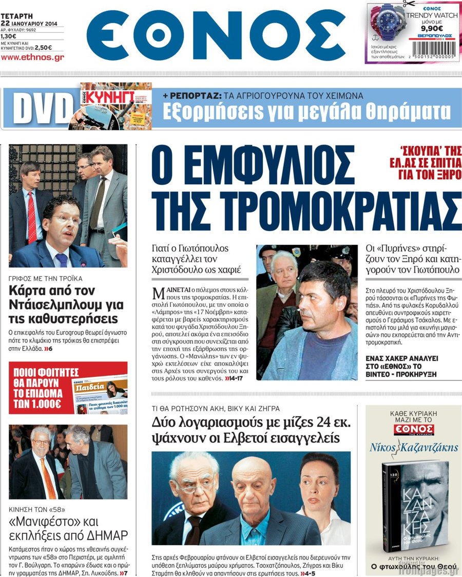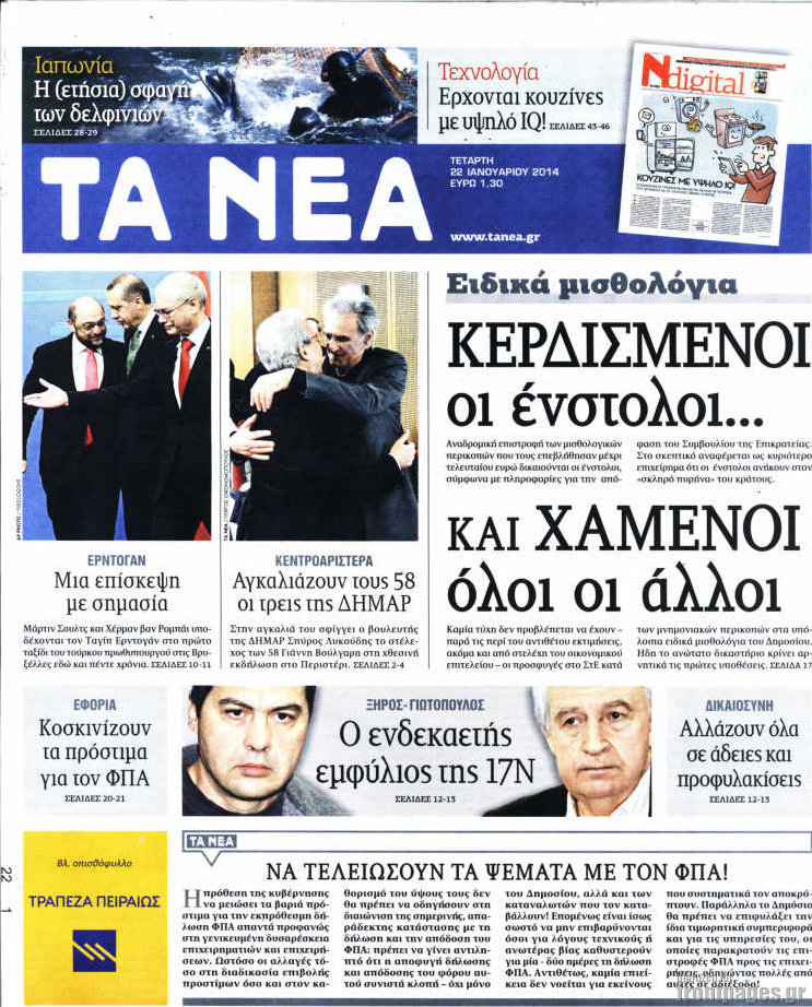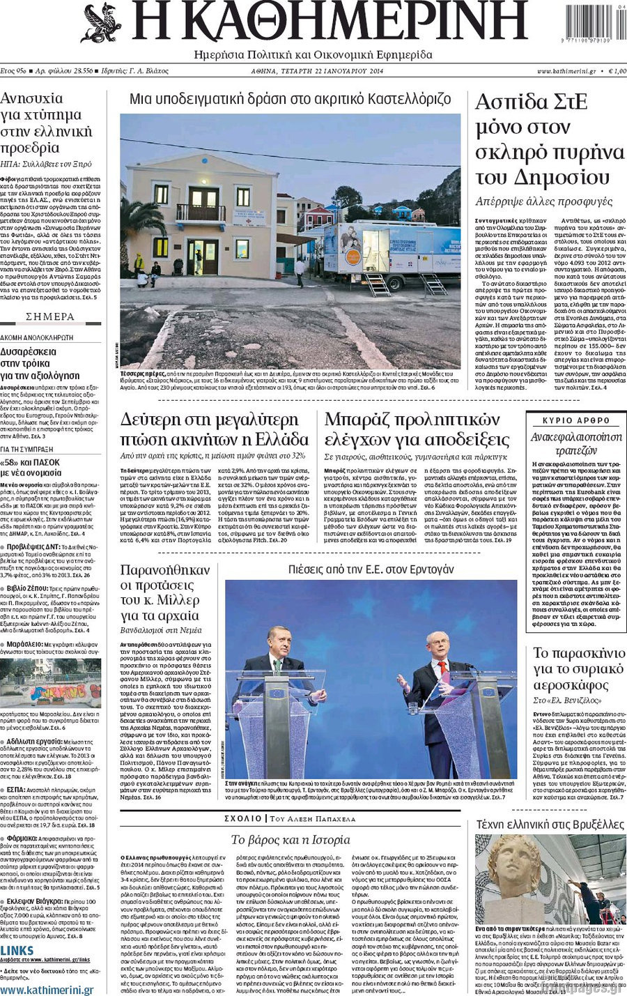 Οι πολιτικές εφημερίδες Enikos Newsroom 08:26, Τετάρτη 22 Ιανουαρίου 2014 Media Οι πολιτικές εφημερίδες Διαβάστε τα πρωτοσέλιδα των πολιτικών εφημερίδων: ΠΟΛΙΤΙΚΕΣ ΕΦΗΜΕΡΙΔΕΣ ΠΡΩΤΟΣΕΛΙΔΑ Μοιράσου το: σχολίασε κι εσύ (0 σχόλια) Ακολουθήστε το enikos.gr στο Google News και μάθετε πρώτοι όλες τις ειδήσεις Δείτε όλες τις τελευταίες ειδήσεις από την Ελλάδα και τον Κόσμο στο enikos.gr Ειδήσεις Ροή Ειδήσεων 9 ώρες πριν Κύκλωμα διακίνησης ναρκωτικών σε σχολεία: Βίντεο ντοκουμέντο από τα βασανιστήρια στους ανήλικους – Συζητούσαν για το πώς θα κάνουν «ξέπλυμα χρήματος» 8 ώρες πριν Κλιμακώνουν τις κινητοποιήσεις τους οι αγρότες: Κλείνουν τη Δευτέρα τις σήραγγες των Τεμπών για τα φορτηγά – Ανοίγουν την Τρίτη τους δρόμους για τους εκδρομείς 9 ώρες πριν Αιματηρό επεισόδιο στον Άγιο Παντελεήμονα – Δύο τραυματίες, αναζητείται ο δράστης 8 ώρες πριν ΗΠΑ: Αυξάνουν την πίεση στην Βενεζουέλα – Το νέο ρεσάλτο σε τάνκερ και ο στόχος του Τραμπ 8 ώρες πριν Κασσελάκης για παραίτηση Μάλαμα: «Η πορεία μας δεν θα καθοριστεί από μεμονωμένα πρόσωπα, μηχανισμούς και προσωπικές ατζέντες» 29 λεπτά πριν Οπτική ψευδαίσθηση: Μόνο οι πιο έξυπνοι άνθρωποι θα βρουν τον Άγιο Βασίλη σε 8 δευτερόλεπτα 44 λεπτά πριν Άνοια και εγκεφαλικό: Γιατρός προειδοποιεί για ένα δημοφιλές ρόφημα που αυξάνει τον κίνδυνο κατά 290% και 300% αντίστοιχα 1 ώρα πριν Τα ζώδια σήμερα, Δευτέρα 22 Δεκεμβρίου: Ζυγοί, αφήστε την καρδιά σας ελεύθερη 2 ημέρες πριν Enerwave: Το νέο «ρεύμα» στη λιανική ενέργειας που αλλάζει την εμπειρία του καταναλωτή 5 λεπτά πριν Επίδομα θέρμανσης: Μέχρι αύριο η προκαταβολή σε περισσότερα από 1 εκατ. νοικοκυριά – Τα ποσά που θα λάβουν οι δικαιούχοι 13 λεπτά πριν ΔΕΔΔΗΕ: Διακοπές ρεύματος σήμερα (22/12) στην Αθήνα και σε άλλες 7 περιοχές της Αττικής 22 λεπτά πριν ΗΠΑ: Το CBS αναβάλλει επ’ αόριστον την προβολή ντοκιμαντέρ για τη φυλακή CECOT του Ελ Σαλβαδόρ 29 λεπτά πριν Οπτική ψευδαίσθηση: Μόνο οι πιο έξυπνοι άνθρωποι θα βρουν τον Άγιο Βασίλη σε 8 δευτερόλεπτα 36 λεπτά πριν Τραγωδία στην Ινδονησία: Τουλάχιστον 16 νεκροί σε ανατροπή λεωφορείου ENIKOS NETWORK Οι γυναίκες έχουν βρει μια νέα απόλαυση στην κρεβατοκάμαρα που οι περισσότεροι άνδρες αγνοούν Christmas glow: 5 χρυσές συμβουλές για επιδερμίδα που λάμπει από ομορφιά τα Χριστούγεννα Νέο έτος ρεκόρ για τον ελληνικό τουρισμό το 2025: «Είμαστε μέσα στους 10 πλέον επισκέψιμους προορισμούς παγκοσμίως» λέει η ... Τιμές καυσίμων: Πόσο θα πληρώσουν οι εκδρομείς των Χριστουγέννων – Το κόστος μετακινήσεων σε δημοφιλείς προορισμούς Χαρτογραφώντας το «σημείο χωρίς επιστροφή»: Για πρώτη φορά αποκαλύπτεται με λεπτομέρεια το ακανθώδες όριο της ατμόσφαιρας τ... Η Google καταργεί τη λειτουργία «dark web report» – Πώς θα μπορούν οι χρήστες να διαγράφουν τα δεδομένα τους περισσότερα 05:48 , Δευτέρα 22 Δεκεμβρίου 2025 Οι οικονομικές εφημερίδες 22/12/2025 Διαβάστε τα πρωτοσέλιδα από τις οικονομικές εφημερίδες, σήμερα 22/12/2025 05:43 , Δευτέρα 22 Δεκεμβρίου 2025 Οι αθλητικές εφημερίδες 22/12/2025 Διαβάστε τα πρωτοσέλιδα από τις αθλητικές εφημερίδες, σήμερα 22/12/2025. 05:38 , Δευτέρα 22 Δεκεμβρίου 2025 Οι πολιτικές εφημερίδες 22/12/2025 Διαβάστε τα πρωτοσέλιδα από τις πολιτικές εφημερίδες, σήμερα 22/12/2025. 05:15 , Δευτέρα 22 Δεκεμβρίου 2025 Εφημερεύοντα φαρμακεία σε Αθήνα και Θεσσαλονίκη (22/12) Μάθετε ποια φαρμακεία εφημερεύουν σε Αθήνα και Θεσσαλονίκη. Βρείτε εύκολα και γρήγορα τα πλησι... ΤΕΛΕΥΤΑΙΕΣ ΕΙΔΗΣΕΙΣ 5 λεπτά πριν Επίδομα θέρμανσης: Μέχρι αύριο η προκα