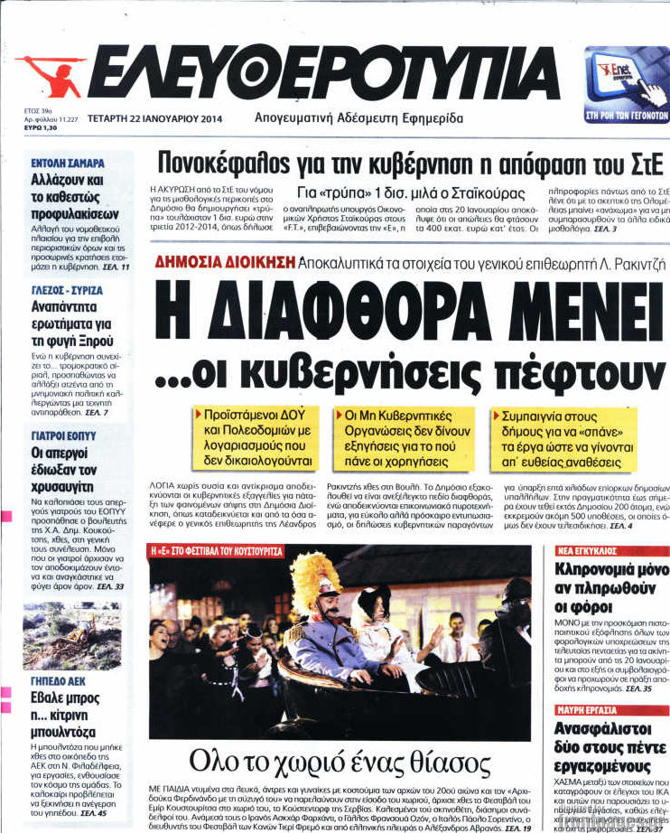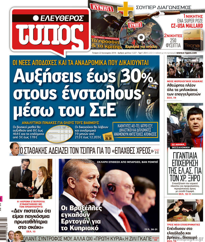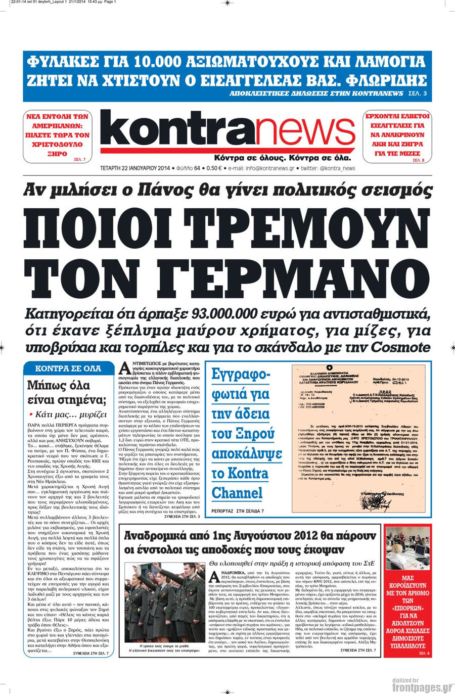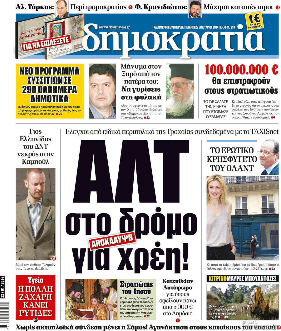 Οι πολιτικές εφημερίδες Enikos Newsroom 08:26, Τετάρτη 22 Ιανουαρίου 2014 Media Οι πολιτικές εφημερίδες Διαβάστε τα πρωτοσέλιδα των πολιτικών εφημερίδων: ΠΟΛΙΤΙΚΕΣ ΕΦΗΜΕΡΙΔΕΣ ΠΡΩΤΟΣΕΛΙΔΑ Μοιράσου το: σχολίασε κι εσύ (0 σχόλια) Ακολουθήστε το enikos.gr στο Google News και μάθετε πρώτοι όλες τις ειδήσεις Δείτε όλες τις τελευταίες ειδήσεις από την Ελλάδα και τον Κόσμο στο enikos.gr Ειδήσεις Ροή Ειδήσεων 9 ώρες πριν Κύκλωμα διακίνησης ναρκωτικών σε σχολεία: Βίντεο ντοκουμέντο από τα βασανιστήρια στους ανήλικους – Συζητούσαν για το πώς θα κάνουν «ξέπλυμα χρήματος» 8 ώρες πριν Κλιμακώνουν τις κινητοποιήσεις τους οι αγρότες: Κλείνουν τη Δευτέρα τις σήραγγες των Τεμπών για τα φορτηγά – Ανοίγουν την Τρίτη τους δρόμους για τους εκδρομείς 9 ώρες πριν Αιματηρό επεισόδιο στον Άγιο Παντελεήμονα – Δύο τραυματίες, αναζητείται ο δράστης 8 ώρες πριν ΗΠΑ: Αυξάνουν την πίεση στην Βενεζουέλα – Το νέο ρεσάλτο σε τάνκερ και ο στόχος του Τραμπ 8 ώρες πριν Κασσελάκης για παραίτηση Μάλαμα: «Η πορεία μας δεν θα καθοριστεί από μεμονωμένα πρόσωπα, μηχανισμούς και προσωπικές ατζέντες» 29 λεπτά πριν Οπτική ψευδαίσθηση: Μόνο οι πιο έξυπνοι άνθρωποι θα βρουν τον Άγιο Βασίλη σε 8 δευτερόλεπτα 44 λεπτά πριν Άνοια και εγκεφαλικό: Γιατρός προειδοποιεί για ένα δημοφιλές ρόφημα που αυξάνει τον κίνδυνο κατά 290% και 300% αντίστοιχα 1 ώρα πριν Τα ζώδια σήμερα, Δευτέρα 22 Δεκεμβρίου: Ζυγοί, αφήστε την καρδιά σας ελεύθερη 2 ημέρες πριν Enerwave: Το νέο «ρεύμα» στη λιανική ενέργειας που αλλάζει την εμπειρία του καταναλωτή 5 λεπτά πριν Επίδομα θέρμανσης: Μέχρι αύριο η προκαταβολή σε περισσότερα από 1 εκατ. νοικοκυριά – Τα ποσά που θα λάβουν οι δικαιούχοι 13 λεπτά πριν ΔΕΔΔΗΕ: Διακοπές ρεύματος σήμερα (22/12) στην Αθήνα και σε άλλες 7 περιοχές της Αττικής 22 λεπτά πριν ΗΠΑ: Το CBS αναβάλλει επ’ αόριστον την προβολή ντοκιμαντέρ για τη φυλακή CECOT του Ελ Σαλβαδόρ 29 λεπτά πριν Οπτική ψευδαίσθηση: Μόνο οι πιο έξυπνοι άνθρωποι θα βρουν τον Άγιο Βασίλη σε 8 δευτερόλεπτα 36 λεπτά πριν Τραγωδία στην Ινδονησία: Τουλάχιστον 16 νεκροί σε ανατροπή λεωφορείου ENIKOS NETWORK Οι γυναίκες έχουν βρει μια νέα απόλαυση στην κρεβατοκάμαρα που οι περισσότεροι άνδρες αγνοούν Christmas glow: 5 χρυσές συμβουλές για επιδερμίδα που λάμπει από ομορφιά τα Χριστούγεννα Νέο έτος ρεκόρ για τον ελληνικό τουρισμό το 2025: «Είμαστε μέσα στους 10 πλέον επισκέψιμους προορισμούς παγκοσμίως» λέει η ... Τιμές καυσίμων: Πόσο θα πληρώσουν οι εκδρομείς των Χριστουγέννων – Το κόστος μετακινήσεων σε δημοφιλείς προορισμούς Χαρτογραφώντας το «σημείο χωρίς επιστροφή»: Για πρώτη φορά αποκαλύπτεται με λεπτομέρεια το ακανθώδες όριο της ατμόσφαιρας τ... Η Google καταργεί τη λειτουργία «dark web report» – Πώς θα μπορούν οι χρήστες να διαγράφουν τα δεδομένα τους περισσότερα 05:48 , Δευτέρα 22 Δεκεμβρίου 2025 Οι οικονομικές εφημερίδες 22/12/2025 Διαβάστε τα πρωτοσέλιδα από τις οικονομικές εφημερίδες, σήμερα 22/12/2025 05:43 , Δευτέρα 22 Δεκεμβρίου 2025 Οι αθλητικές εφημερίδες 22/12/2025 Διαβάστε τα πρωτοσέλιδα από τις αθλητικές εφημερίδες, σήμερα 22/12/2025. 05:38 , Δευτέρα 22 Δεκεμβρίου 2025 Οι πολιτικές εφημερίδες 22/12/2025 Διαβάστε τα πρωτοσέλιδα από τις πολιτικές εφημερίδες, σήμερα 22/12/2025. 05:15 , Δευτέρα 22 Δεκεμβρίου 2025 Εφημερεύοντα φαρμακεία σε Αθήνα και Θεσσαλονίκη (22/12) Μάθετε ποια φαρμακεία εφημερεύουν σε Αθήνα και Θεσσαλονίκη. Βρείτε εύκολα και γρήγορα τα πλησι... ΤΕΛΕΥΤΑΙΕΣ ΕΙΔΗΣΕΙΣ 5 λεπτά πριν Επίδομα θέρμανσης: Μέχρι αύριο η προκα