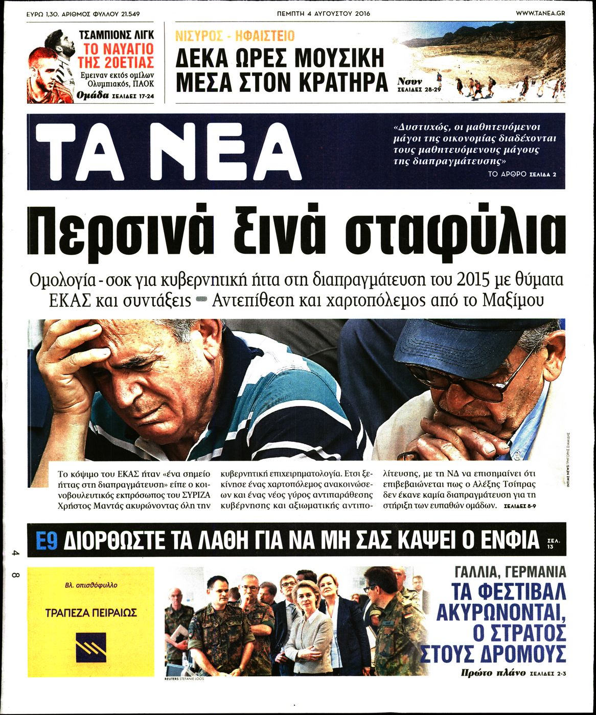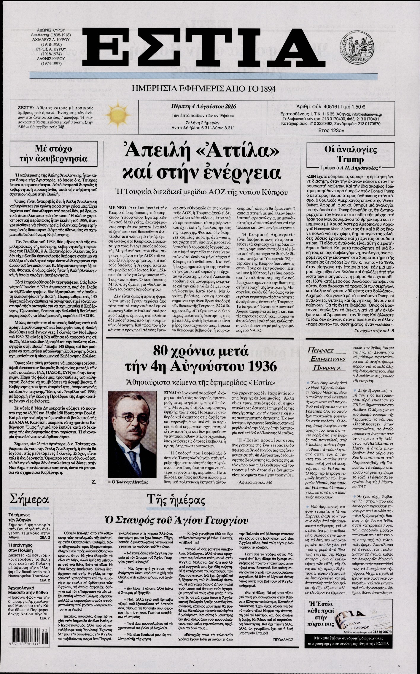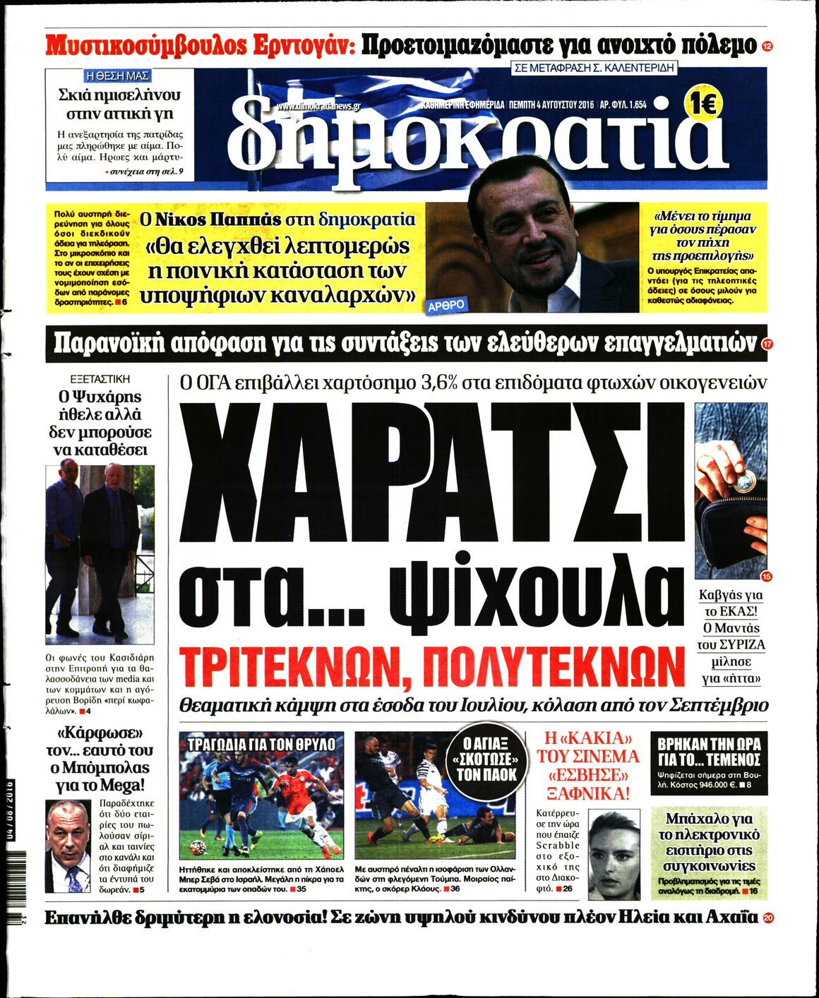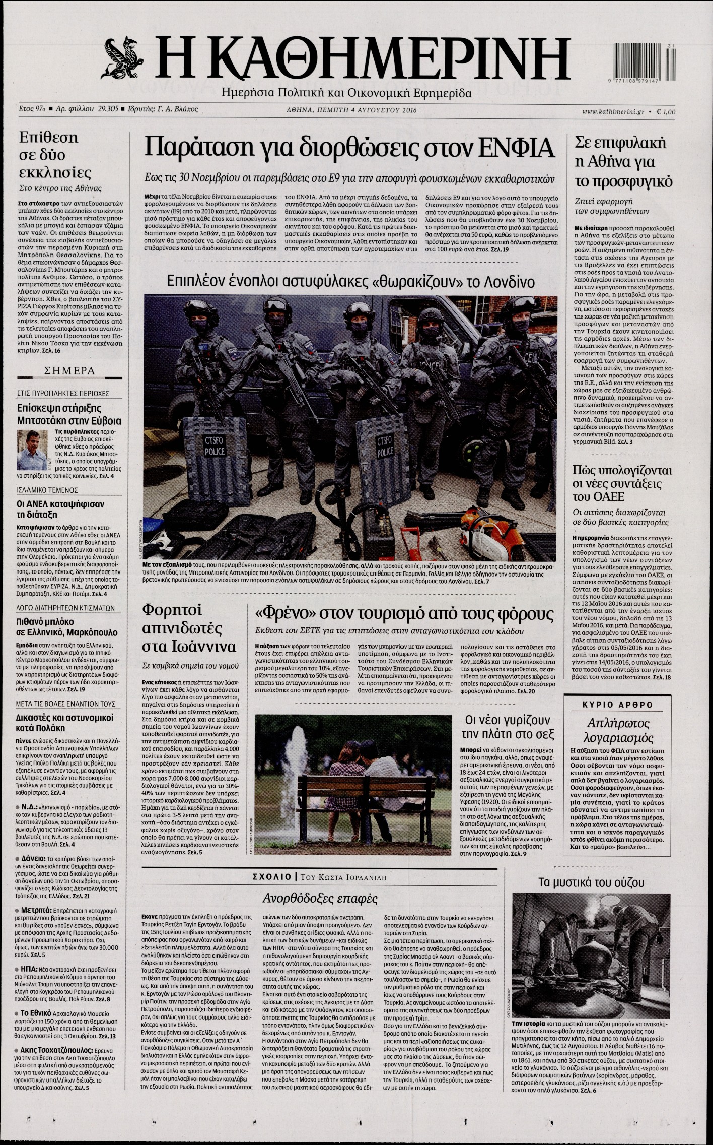 Οι πολιτικές εφημερίδες 4/8/2016 Enikos Newsroom 05:32, Πέμπτη 04 Αυγούστου 2016 Media Διαβάστε τα σημερινά πρωτοσέλιδα των πολιτικών εφημερίδων: ΠΟΛΙΤΙΚΕΣ ΕΦΗΜΕΡΙΔΕΣ ΠΡΩΤΟΣΕΛΙΔΑ Μοιράσου το: σχολίασε κι εσύ (0 σχόλια) Ακολουθήστε το enikos.gr στο Google News και μάθετε πρώτοι όλες τις ειδήσεις Δείτε όλες τις τελευταίες ειδήσεις από την Ελλάδα και τον Κόσμο στο enikos.gr Ειδήσεις Ροή Ειδήσεων 13 λεπτά πριν Υπόθεση Έπσταϊν: Το Υπουργείο Δικαιοσύνης δημοσιοποίησε μια σειρά από εξαιρετικά επεξεργασμένα αρχεία – «Λείπουν τα πιο σημαντικά έγγραφα», λένε οι Δημοκρατικοί 2 ώρες πριν Σαρωτικοί οι έλεγχοι στους δρόμους ενόψει εορτών – Μπλόκα της τροχαίας σε κεντρικές αρτηρίες της Αττικής 24 λεπτά πριν ΟΝΕΧ – MEGATUGS: Ξεκίνησε η ναυπήγηση ρυμουλκών στην Ελλάδα – Προθάλαμος πολεμικών πλοίων – Δείτε φωτογραφίες και βίντεο 9 ώρες πριν Χριστούγεννα στα μπλόκα: Επιμένουν στις κινητοποιήσεις τους οι αγρότες – Ανοίγουν τα διόδια το Σαββατοκύριακο 9 ώρες πριν Πούτιν: Τα μηνύματα σε Ευρώπη και ΝΑΤΟ από το μαραθώνιο «σόου» του – Η απαίτηση για «σεβασμό» και η ειρήνη «με τους όρους» της Μόσχας 2 ώρες πριν Αυγά: Πόσα μπορείτε να τρώτε την ημέρα με ασφάλεια για μέγιστη πρόσληψη πρωτεΐνης 2 ώρες πριν Τα ζώδια σήμερα, Σάββατο 20 Δεκεμβρίου: Παρθένοι, το σύμπαν σας δίνει το κλειδί 9 ώρες πριν Ανακαλύφθηκαν αρχαία χρυσά νομίσματα 2.200 ετών που απεικονίζουν τον θεό Απόλλωνα – Η άγνωστη σύνδεση με τον Φίλιππο Β΄ της Μακεδονίας 2 ώρες πριν Οπτική ψευδαίσθηση: Μόνο αν είσαι ο Σέρλοκ Χολμς θα βρεις τον αριθμό «87» σε 7 δευτερόλεπτα 8 λεπτά πριν ΗΠΑ: Τέσσερις μετανάστες πέθαναν σε κέντρα κράτησης – Αύξηση θανάτων σε επίπεδο ρεκόρ το 2025 13 λεπτά πριν Υπόθεση Έπσταϊν: Το Υπουργείο Δικαιοσύνης δημοσιοποίησε μια σειρά από εξαιρετικά επεξεργασμένα αρχεία – «Λείπουν τα πιο σημαντικά έγγραφα», λένε οι Δημοκρατικοί 16 λεπτά πριν Καιρός: Αλλαγή σκηνικού σήμερα με βροχές και πτώση της θερμοκρασίας – Οι προβλέψεις των μετεωρολόγων για τα Χριστούγεννα 24 λεπτά πριν ΟΝΕΧ – MEGATUGS: Ξεκίνησε η ναυπήγηση ρυμουλκών στην Ελλάδα – Προθάλαμος πολεμικών πλοίων – Δείτε φωτογραφίες και βίντεο 32 λεπτά πριν Φοινικούντα: Σήμερα απολογείται ο 30χρονος γιος γνωστού επιχειρηματία της Πλάκας ENIKOS NETWORK Το τεστ των 10 δευτερολέπτων που μπορεί να προβλέψει το προσδόκιμο ζωής σας – Τι λέει ειδικός του Cleveland Επιλέξτε καρέκλα για να μάθετε ποια είναι τα κρυφά χαρακτηριστικά σας – Τι αποκάλυψε για εσάς αυτό το τεστ προσωπικότητας; Αναστολή μέτρων αναγκαστικής εκτέλεσης για κτηνοτρόφους που πλήττονται από την ευλογιά των αιγοπροβάτων Πλήρης επάρκεια προϊόντων στις λαϊκές της Αττικής, παρά τις αγροτικές κινητοποιήσεις – Τι απαντούν οι πωλητές Χαρτογραφώντας το «σημείο χωρίς επιστροφή»: Για πρώτη φορά αποκαλύπτεται με λεπτομέρεια το ακανθώδες όριο της ατμόσφαιρας τ... Η Google καταργεί τη λειτουργία «dark web report» – Πώς θα μπορούν οι χρήστες να διαγράφουν τα δεδομένα τους περισσότερα 05:48 , Σάββατο 20 Δεκεμβρίου 2025 Οι οικονομικές εφημερίδες 20/12/2025 Διαβάστε τα πρωτοσέλιδα από τις οικονομικές εφημερίδες, σήμερα 20/12/2025. 05:43 , Σάββατο 20 Δεκεμβρίου 2025 Οι αθλητικές εφημερίδες 20/12/2025 Διαβάστε τα πρωτοσέλιδα από τις αθλητικές εφημερίδες, σήμερα 20/12/2025. 05:38 , Σάββατο 20 Δεκεμβρίου 2025 Οι πολιτικές εφημερίδες 20/12/2025 Διαβάστε τα πρωτοσέλιδα από τις πολιτικές εφημερίδες, σήμερα 20/12/2025. 04:20 , Σάββατο 20 Δεκεμβρίου 2025 Αγγελική Νικολούλη: Τα συλλυπητήρια για την απώλε