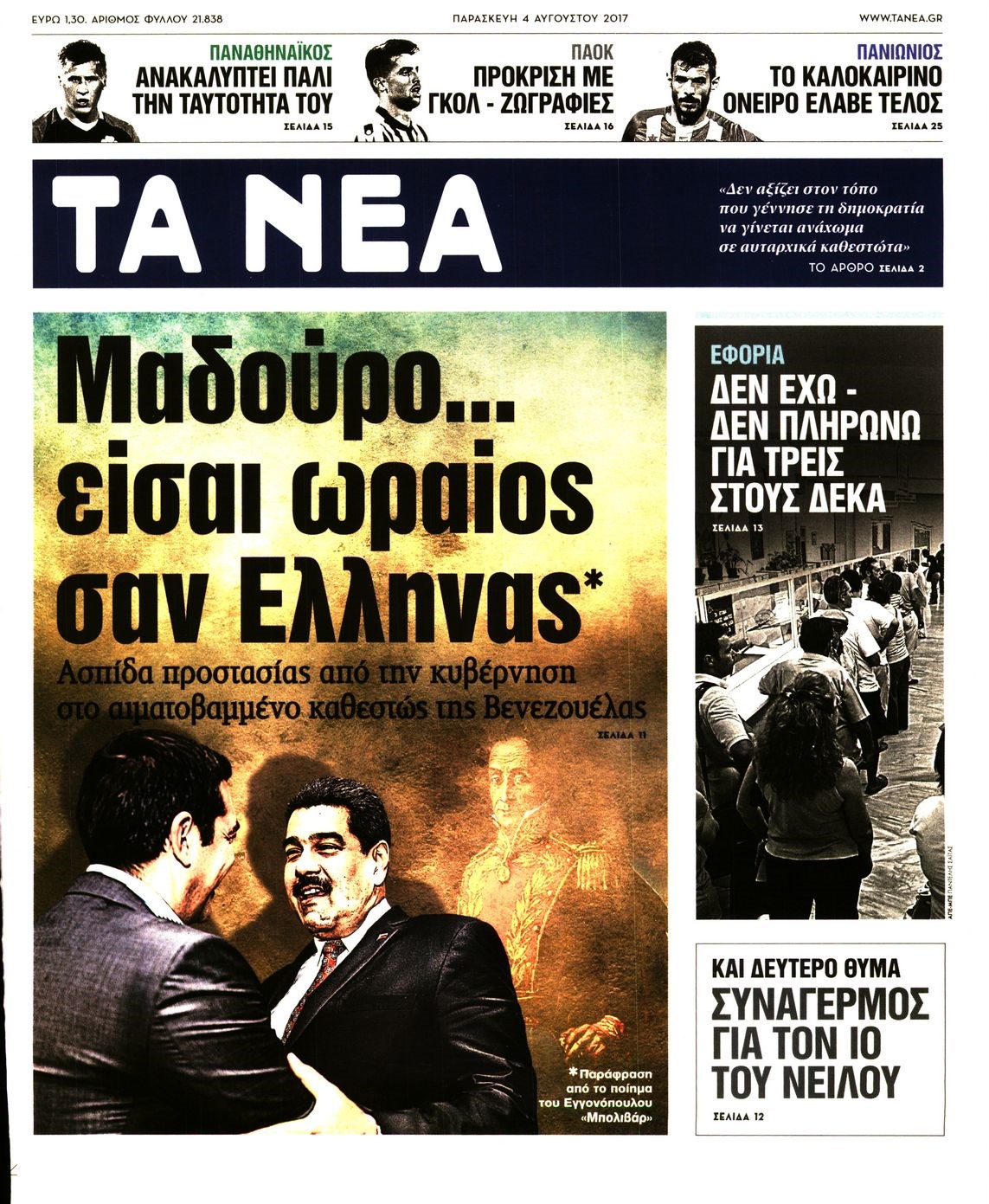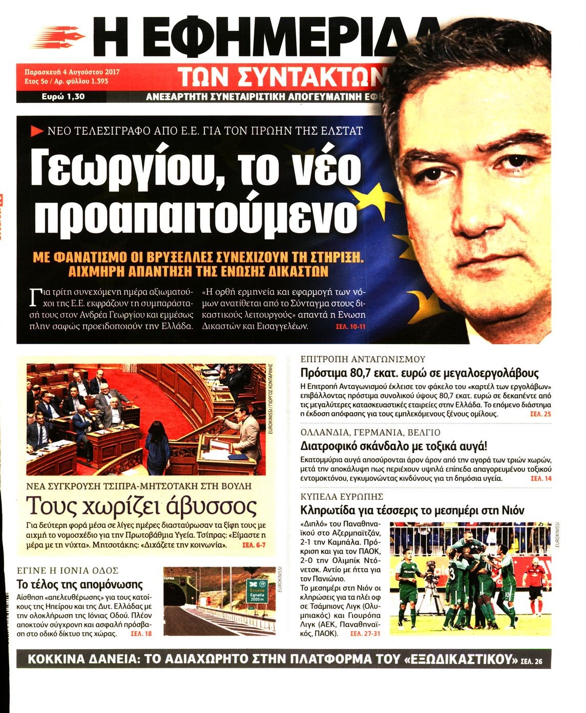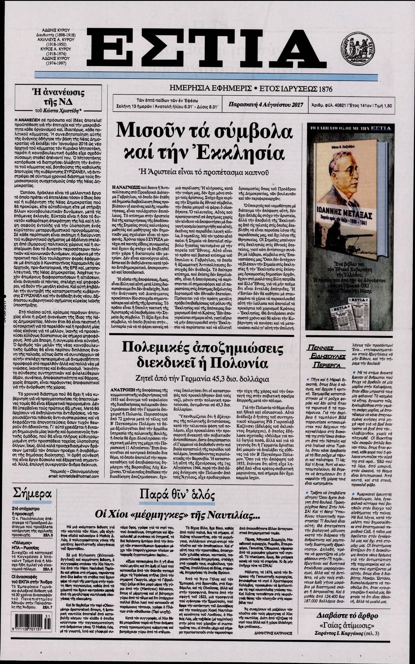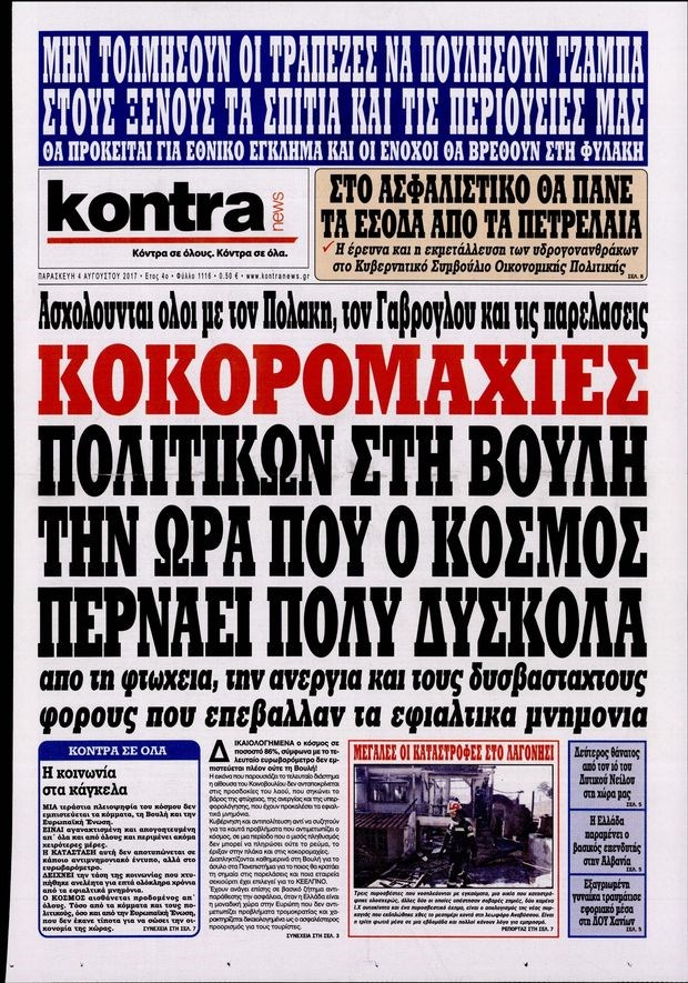 Οι πολιτικές εφημερίδες 4/8/2017 Κώστας Τεό 06:23, Παρασκευή 04 Αυγούστου 2017 Media Διαβάστε τα σημερινά πρωτοσέλιδα των πολιτικών εφημερίδων: ΠΟΛΙΤΙΚΕΣ ΕΦΗΜΕΡΙΔΕΣ ΠΡΩΤΟΣΕΛΙΔΑ Μοιράσου το: σχολίασε κι εσύ (0 σχόλια) Ακολουθήστε το enikos.gr στο Google News και μάθετε πρώτοι όλες τις ειδήσεις Δείτε όλες τις τελευταίες ειδήσεις από την Ελλάδα και τον Κόσμο στο enikos.gr Ειδήσεις Ροή Ειδήσεων 3 ώρες πριν Υπόθεση Έπσταϊν: Το Υπουργείο Δικαιοσύνης δημοσιοποίησε μια σειρά από εξαιρετικά επεξεργασμένα αρχεία – «Λείπουν τα πιο σημαντικά έγγραφα», λένε οι Δημοκρατικοί 40 λεπτά πριν Γιορτές με μπλόκα για τους αγρότες: Ανοίγουν διόδια και μοιράζουν προϊόντα στους ταξιδιώτες 1 ώρα πριν Εξαφάνιση 33χρονου γιατρού στην Κρήτη: «Άναψα τα φώτα, τρόμαξε και άρχισε να τρέχει στα χωράφια» – Η τελευταία διαδρομή και η μαρτυρία «κλειδί» 3 ώρες πριν Ο «χάρτης» με τις αυξήσεις και τις φοροελαφρύνσεις του 2026 – Ποιοι και πόσα κερδίζουν 56 λεπτά πριν Τα αρχεία του Έπσταϊν αποκαλύπτουν φωτογραφία του έκπτωτου πρίγκιπα Άντριου – Είναι ξαπλωμένος στην αγκαλιά 5 γυναικών 1 ώρα πριν Μία νέα «χρυσή» περίοδος αρχίζει για 3 ζώδια από σήμερα – «Μία αναπάντεχη ευκαιρία οδηγεί στην επιτυχία» 5 ώρες πριν Αυγά: Πόσα μπορείτε να τρώτε την ημέρα με ασφάλεια για μέγιστη πρόσληψη πρωτεΐνης 3 ώρες πριν Αρχαιολόγοι ανακάλυψαν σε χωράφι απεικόνιση 600 ετών ενός Αγίου – Τα στοιχεία που δείχνουν ότι μαρτύρησε 2 ώρες πριν Αγχώνεται για το χριστουγεννιάτικο δώρο που πήρε στην πλούσια σύντροφό του – «Φοβάμαι πως θα το βρει φθηνιάρικο, φοράει βραχιόλια Cartier» 5 λεπτά πριν Νέες ταυτότητες: Μεγάλη αναμονή για ραντεβού στην Αττική – Τέλος τα ταξίδια εκτός Ελλάδος από τον Αύγουστο για όσους δεν έχουν αλλάξει 13 λεπτά πριν Οι 7 φράσεις που δεν λένε ποτέ οι συναισθηματικά έξυπνοι άνθρωποι κατά τη διάρκεια ενός καβγά 17 λεπτά πριν Τηλεθέαση (19/12): Ανατροπές και πρωτιές στην πρωινή ζώνη 24 λεπτά πριν Πώς η κλιματική αλλαγή επηρεάζει εγκύους και βρέφη – Οι επιπτώσεις των υψηλών θερμοκρασιών 32 λεπτά πριν e-ΕΦΚΑ και ΔΥΠΑ: Οι πληρωμές από 22 έως 24 Δεκεμβρίου – Ποιοι θα δουν χρήματα στους λογαριασμούς τους ENIKOS NETWORK Είστε μόνιμα απρόσεκτοι; 3 σημάδια που δείχνουν ότι μπορεί να είναι σύμπτωμα πάθησης Πόσα κιλά παίρνουμε πραγματικά τα Χριστούγεννα, σύμφωνα με την επιστήμη – Πώς να το αποτρέψουμε; Επίδομα παιδιού: Τι αλλάζει από το 2026 – Το όφελος από τις φορολογικές ελαφρύνσεις Mega χριστουγεννιάτικη φορολοταρία: «Κλείδωσε» η ημερομηνία για την κλήρωση – Ερωτήσεις και απαντήσεις Χαρτογραφώντας το «σημείο χωρίς επιστροφή»: Για πρώτη φορά αποκαλύπτεται με λεπτομέρεια το ακανθώδες όριο της ατμόσφαιρας τ... Η Google καταργεί τη λειτουργία «dark web report» – Πώς θα μπορούν οι χρήστες να διαγράφουν τα δεδομένα τους περισσότερα 09:30 , Σάββατο 20 Δεκεμβρίου 2025 «Porto Leone: Στη γειτονιά με τα κόκκινα φανάρια» – Ο Χρόνης αποκαλύπτει στην Αλεξάνδρα το μυστικό για το παιδί της Λένας Η μεγάλη δραματική σειρά του Apha «Porto Leone: Στη γειτονιά με τα κόκκινα φανάρια» μας μεταφέ... 08:14 , Σάββατο 20 Δεκεμβρίου 2025 Τρομεροί γονείς: Η Μαρία Καβογιάννη εισβάλλει στο σπίτι της οικογένειας Στεφανίδη Όσα θα δούμε στο νέο διπλό επεισόδιο της σειράς «Τρομεροί γονείς», σήμερα Σάββατο 20 Δεκεμβρίο... 05:48 , Σάββατο 20 Δεκεμβρίου 2025 Οι οικονομικές εφημερίδες 20/12/2025 Διαβάστε τα πρωτοσέλιδα από τις οικονομικές εφημερίδες, σήμερα 20/12/2025. 05:43 , Σάββατο 20 Δεκεμβρίου 2025 Οι αθλητικές εφημερίδες 2