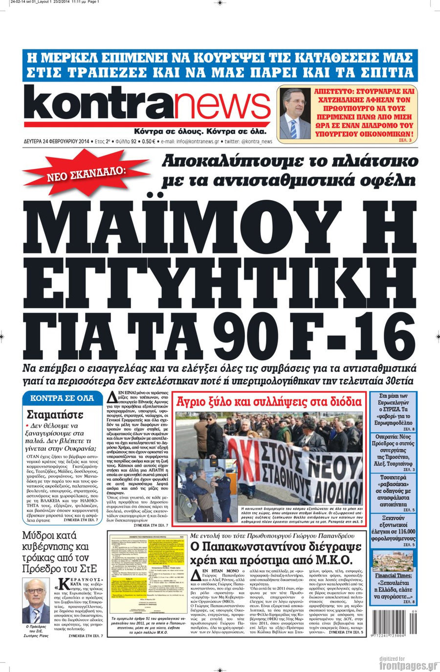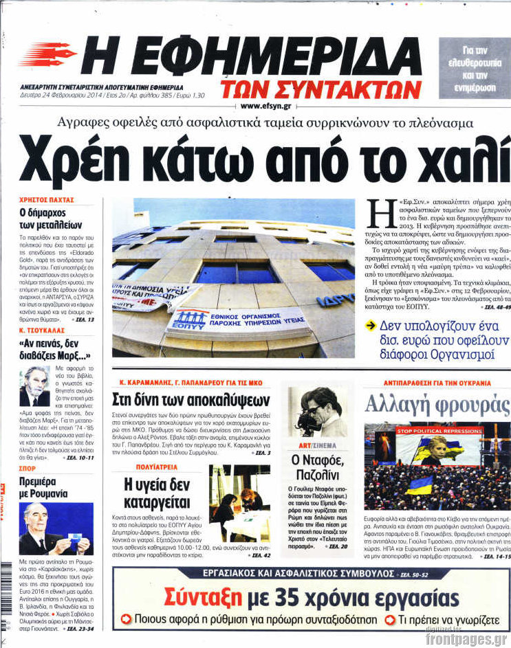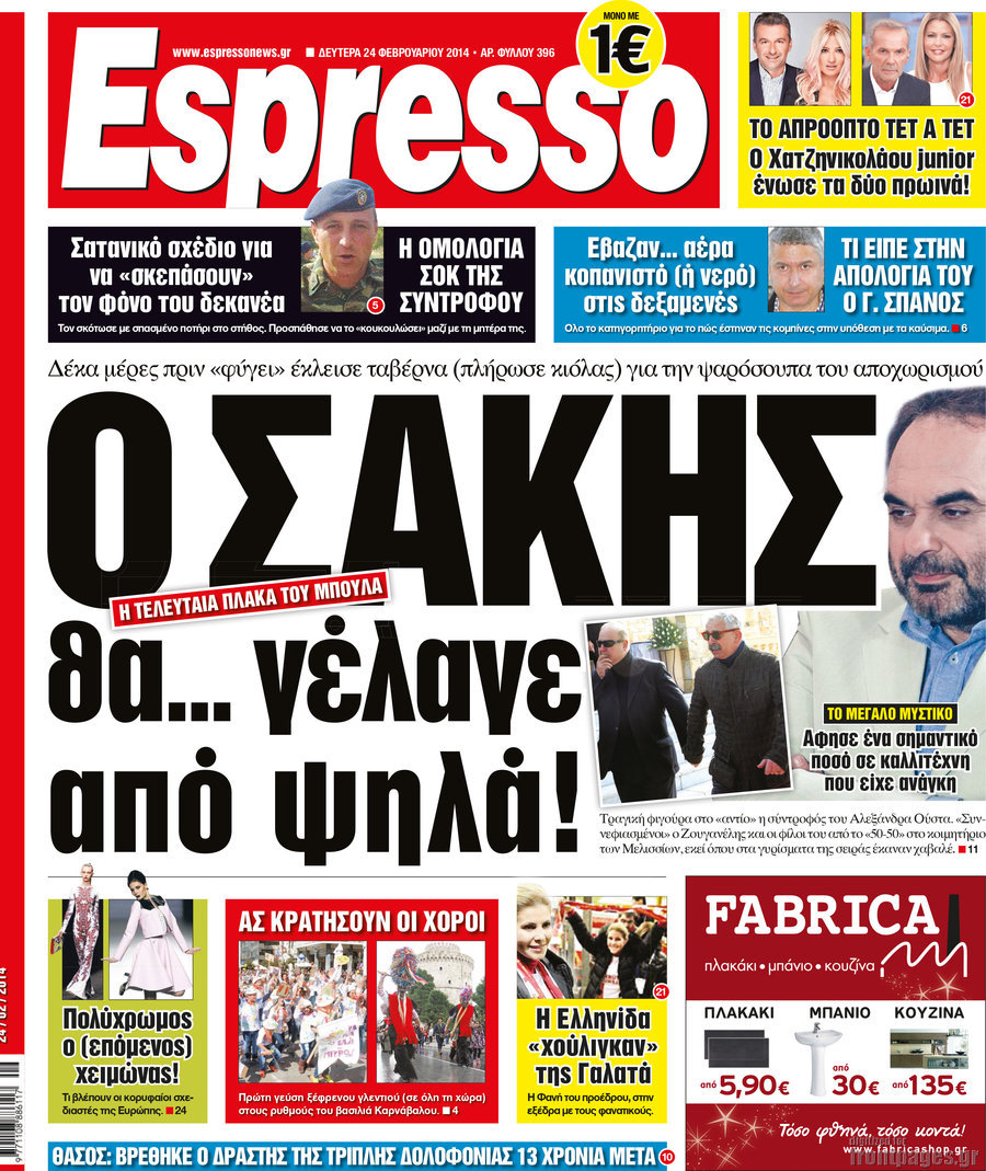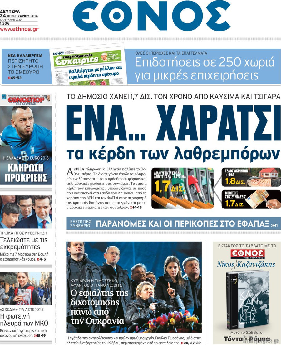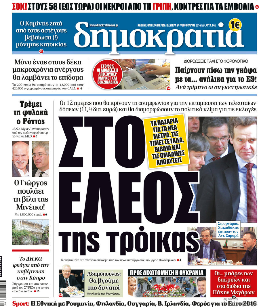 Οι πολιτικές εφημερίδες Enikos Newsroom 08:21, Δευτέρα 24 Φεβρουαρίου 2014 Media Οι πολιτικές εφημερίδες Διαβάστε τα πρωτοσέλιδα των πολιτικών εφημερίδων: ΕΦΗΜΕΡΙΔΕΣ ΠΟΛΙΤΙΚΕΣ ΕΦΗΜΕΡΙΔΕΣ ΠΡΩΤΟΣΕΛΙΔΑ Μοιράσου το: σχολίασε κι εσύ (0 σχόλια) Ακολουθήστε το enikos.gr στο Google News και μάθετε πρώτοι όλες τις ειδήσεις Δείτε όλες τις τελευταίες ειδήσεις από την Ελλάδα και τον Κόσμο στο enikos.gr Ειδήσεις Ροή Ειδήσεων 27 λεπτά πριν Αγρότες: Γιορτές στα μπλόκα με ανοιχτά διόδια – Δικογραφία στα Ιωάννινα για το σήκωμα των μπαρών 1 ώρα πριν ΕΛΑΣ: Συνελήφθησαν Υπαρχιπυροσβέστης και δύο ακόμη άτομα για κατοχή και διακίνηση ναρκωτικών ουσιών – Η καταγγελία και ο τιμοκατάλογος 4 ώρες πριν Αρχεία Έπσταϊν: Οι συγκλονιστικές φωτογραφίες – Ο Μάικλ Τζάκσον, ο Μικ Τζάγκερ και ο Κέβιν Σπέισι ανάμεσα στους διάσημους που απεικονίζονται 2 ώρες πριν Μαθητές διακινούσαν κοκαΐνη και χασίς σε σχολείο της Αττικής – 12 συλλήψεις 2 ώρες πριν Βέλγιο: Άγνωστοι έριξαν κόκκινη μπογιά στο προξενείο της Πολωνίας στις Βρυξέλλες 39 λεπτά πριν Η τύχη χαμογελά σε 3 ζώδια έως τις 28 Δεκεμβρίου – «Προσέξτε τις επιλογές σας και η επιμονή σας θα ανταμειφθεί» 5 ώρες πριν Διαιτολόγος αποκαλύπτει 9 πρωινές συνήθειες που «λιώνουν» το κοιλιακό λίπος – «Υποστηρίζουν την υγιεινή απώλεια βάρους» 6 ώρες πριν Οι 7 φράσεις που δεν λένε ποτέ οι συναισθηματικά έξυπνοι άνθρωποι κατά τη διάρκεια ενός καβγά 8 ώρες πριν Enerwave: Το νέο «ρεύμα» στη λιανική ενέργειας που αλλάζει την εμπειρία του καταναλωτή 4 λεπτά πριν Πώς δρούσε το κύκλωμα που διακινούσε ναρκωτικά σε σχολεία – Υπέβαλαν σε βασανιστήρια όσους δεν τηρούσαν τους «κανόνες πειθαρχίας» 9 λεπτά πριν Φάμελλος: «Η πρόταση για τις εκλογές έχει να κάνει με το συμφέρον της χώρας» 21 λεπτά πριν Παναθηναϊκός: Στο… «μικροσκόπιο» ο Γένσεν της Μπρέντφορντ 27 λεπτά πριν Αγρότες: Γιορτές στα μπλόκα με ανοιχτά διόδια – Δικογραφία στα Ιωάννινα για το σήκωμα των μπαρών 31 λεπτά πριν Νίκος Γιαννόπουλος: «Όποιος με χαρακτηρίζει δημοσίως μέθυσο, προκλητικό ή οτιδήποτε άλλο θα κληθεί στις δικαστικές αίθουσες» ENIKOS NETWORK Η αποχή από την αναπαραγωγή παρατείνει τη ζωή στα ζώα, σύμφωνα με μελέτη – Τι ισχύει για τους ανθρώπους; Σημαντικές επαφές στις ΗΠΑ είχε ο υπουργός Υγείας Άδωνις Γεωργιάδης Τέλη κυκλοφορίας 2026: Προσοχή στην προθεσμία εξόφλησής τους – Πώς διαμορφώνονται τα πρόστιμα σε περίπτωση καθυστέρησης Επιτροπή Ανταγωνισμού: Στο μικροσκόπιο σχολικές τσάντες και επώνυμα brands – Τι ερευνάται Χαρτογραφώντας το «σημείο χωρίς επιστροφή»: Για πρώτη φορά αποκαλύπτεται με λεπτομέρεια το ακανθώδες όριο της ατμόσφαιρας τ... Η Google καταργεί τη λειτουργία «dark web report» – Πώς θα μπορούν οι χρήστες να διαγράφουν τα δεδομένα τους περισσότερα 14:04 , Σάββατο 20 Δεκεμβρίου 2025 Η Realnews αυτής της Κυριακής (21/12/2025) Με τίτλο: «Ασπίδα προστασίας για την Ελλάδα» κυκλοφορεί, αυτήν την Κυριακή, η Realnews. Σημαντ... 12:53 , Σάββατο 20 Δεκεμβρίου 2025 Να μ’ αγαπάς: Το παρελθόν έρχεται στο φως – Καταιγιστικές εξελίξεις στα τελευταία επεισόδια του 2025 Ο Άγγελος αποκαλύπτεται, η Φωτεινή ανησυχεί για τον Λευτέρη και η Ζωή έρχεται αντιμέτωπη με το... 11:41 , Σάββατο 20 Δεκεμβρίου 2025 «Η αγάπη δεν χάνεται ποτέ»: Η μικρού μήκους ταινία κινουμένων σχεδίων που θέτει ερωτήματα για τη ζωή και τον θάνατο Ο θάνατος είναι ένα από τα πιο σκληρά θέματα που καλείται να διαχειριστεί κάποιος στη διάρκεια... 09:30 , Σάββατο 20 Δεκεμβρίου 2025 «Porto Leone: Στη γειτονι