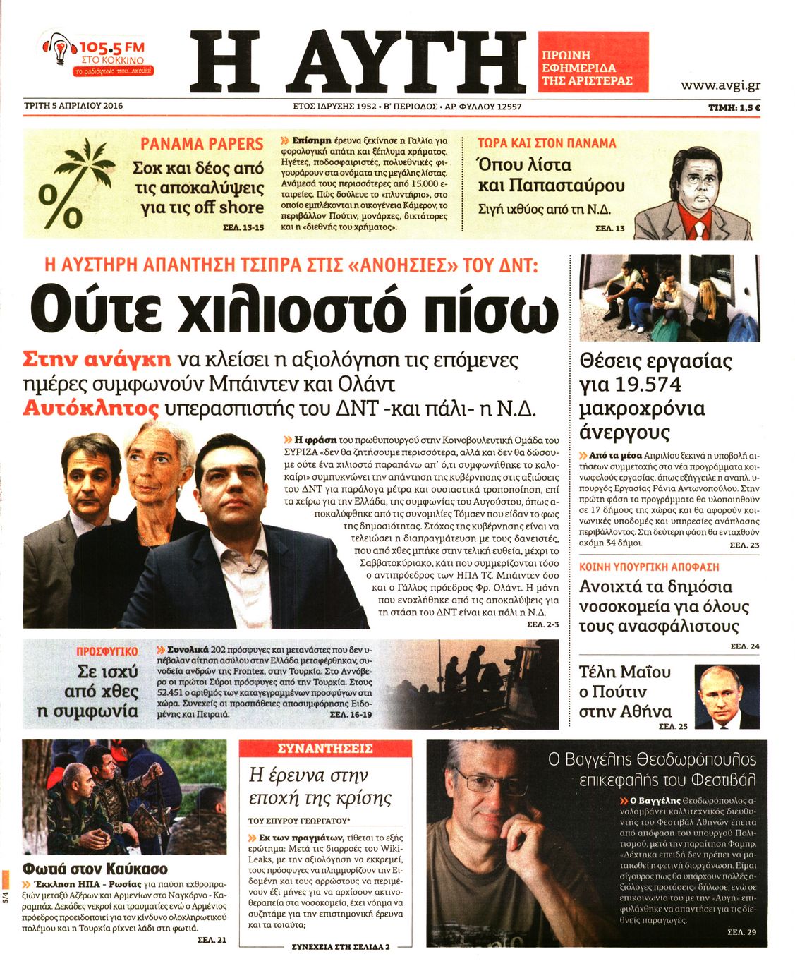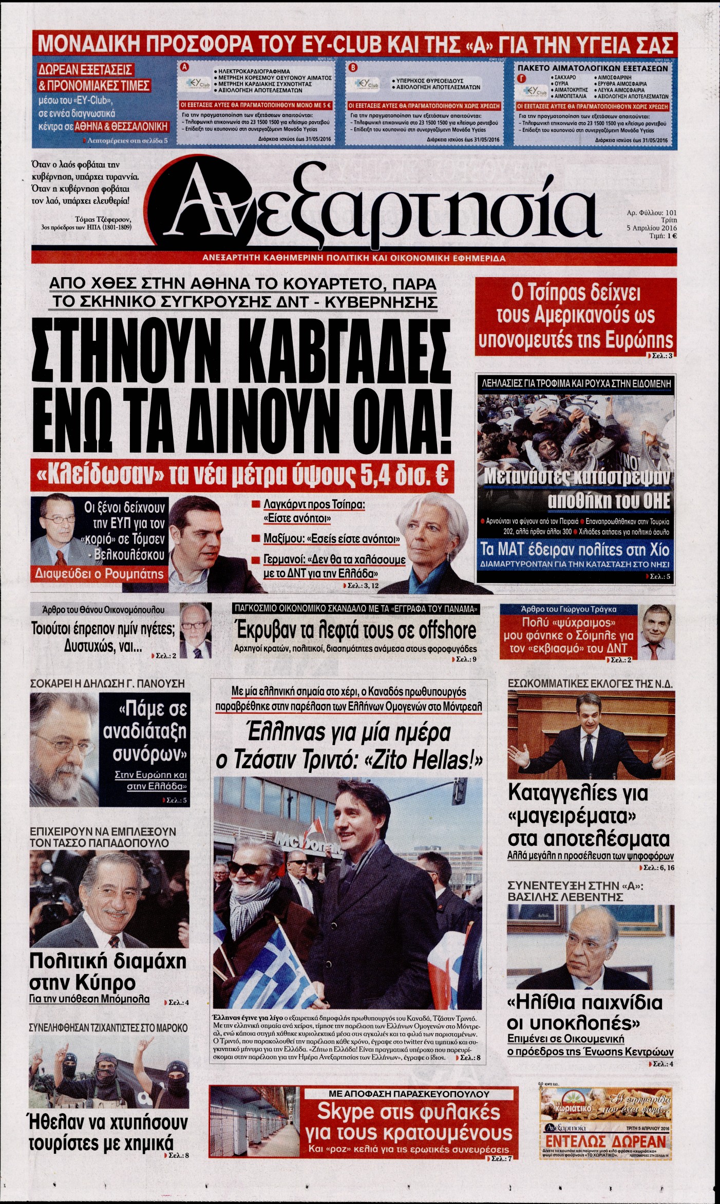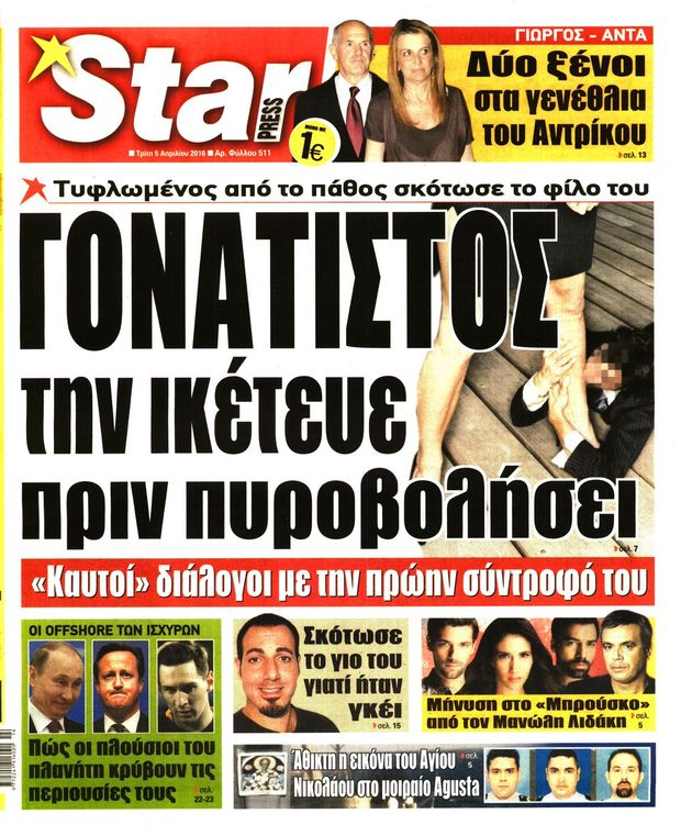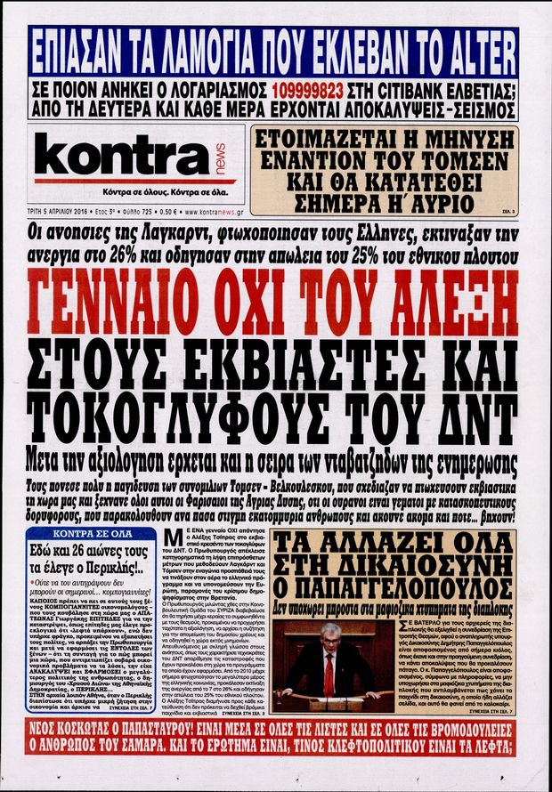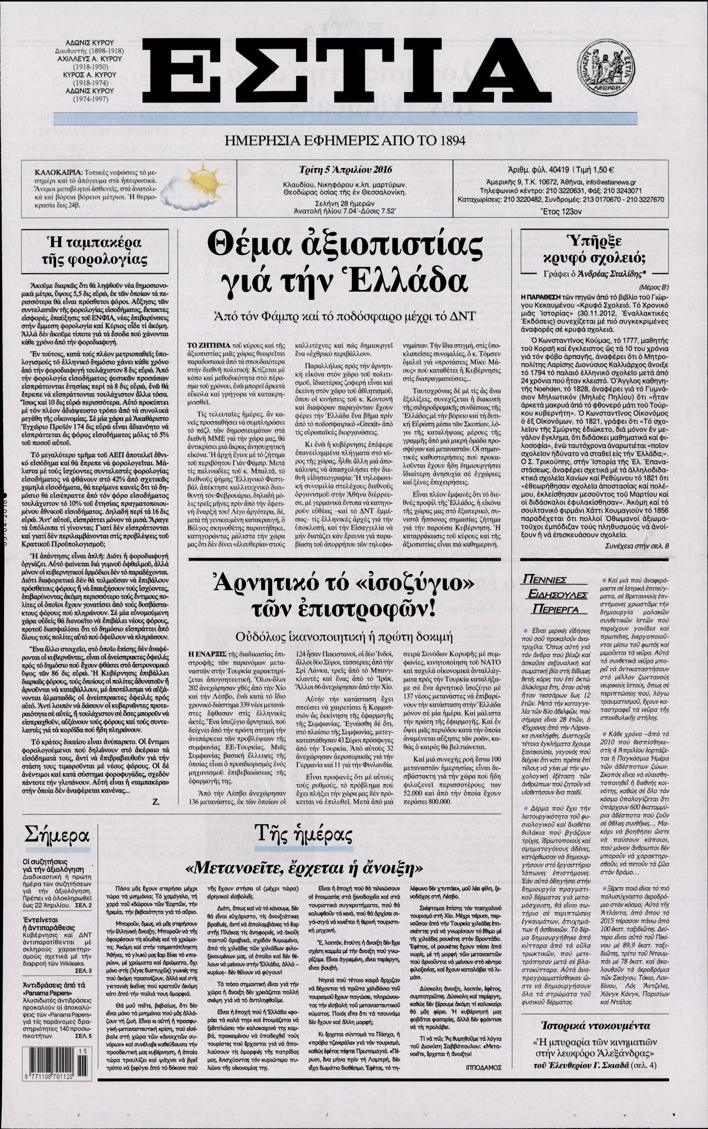 Οι πολιτικές εφημερίδες 5-4-2016 Enikos Newsroom 06:08, Τρίτη 05 Απριλίου 2016 Media Διαβάστε τα σημερινά πρωτοσέλιδα των πολιτικών εφημερίδων: ΠΟΛΙΤΙΚΕΣ ΕΦΗΜΕΡΙΔΕΣ ΠΡΩΤΟΣΕΛΙΔΑ Μοιράσου το: σχολίασε κι εσύ (0 σχόλια) Ακολουθήστε το enikos.gr στο Google News και μάθετε πρώτοι όλες τις ειδήσεις Δείτε όλες τις τελευταίες ειδήσεις από την Ελλάδα και τον Κόσμο στο enikos.gr Ειδήσεις Ροή Ειδήσεων 17 λεπτά πριν Ζελένσκι: Μόνο οι ΗΠΑ και ο Τραμπ μπορούν να πιέσουν τη Ρωσία να βάλει τέλος στον πόλεμο 36 λεπτά πριν Φοινικούντα: Προφυλακιστέος ο 30χρονος για συνέργεια στη διπλή δολοφονία – Και άλλα πρόσωπα στο «μικροσκόπιο» 2 ώρες πριν Κυριάκος Μητσοτάκης: Στην Ιερουσαλήμ την Τρίτη ο Πρωθυπουργός για την τριμερή Ελλάδας, Κύπρου, Ισραήλ – Θα συναντηθεί και με τον Αμπάς 5 ώρες πριν Πώς δρούσε το κύκλωμα που διακινούσε ναρκωτικά σε σχολεία – Υπέβαλαν σε βασανιστήρια όσους δεν τηρούσαν τους «κανόνες πειθαρχίας» 1 ώρα πριν Πάπας Λέων: Όταν έχει αϋπνίες επενδύει παραγωγικά τον χρόνο του – Ποιο παιχνίδι παίζει στο κινητό 27 λεπτά πριν Αριθμολογία: Ο αριθμός του φύλακα αγγέλου σας, με βάση τον μήνα γέννησής σας – «Έτσι σας στέλνει σημάδια το σύμπαν» 1 ώρα πριν Πώς να απαλλαγείτε από τη μυρωδιά του τηγανητού φαγητού: Το μυστικό βρίσκεται στην κουζίνα σας 2 ώρες πριν Μήπως οι γιορτές σας δεν είναι τόσο τέλειες; 7 χριστουγεννιάτικες συνήθειες που μαρτυρούν ότι μια οικογένεια είναι δυσλειτουργική 12 ώρες πριν Enerwave: Το νέο «ρεύμα» στη λιανική ενέργειας που αλλάζει την εμπειρία του καταναλωτή 10 λεπτά πριν Εριέττα Μανούρη: «Έχω νιώσει ανταγωνισμό από άντρες, μύθος αυτό που λένε για τις γυναίκες» 17 λεπτά πριν Ζελένσκι: Μόνο οι ΗΠΑ και ο Τραμπ μπορούν να πιέσουν τη Ρωσία να βάλει τέλος στον πόλεμο 27 λεπτά πριν Αριθμολογία: Ο αριθμός του φύλακα αγγέλου σας, με βάση τον μήνα γέννησής σας – «Έτσι σας στέλνει σημάδια το σύμπαν» 36 λεπτά πριν Φοινικούντα: Προφυλακιστέος ο 30χρονος για συνέργεια στη διπλή δολοφονία – Και άλλα πρόσωπα στο «μικροσκόπιο» 47 λεπτά πριν Super League: Ο Σιαμπάνης «κατέβασε ρολά» και ο Βόλος νίκησε 1-0 τον Παναιτωλικό ENIKOS NETWORK Οι γυναίκες αποκαλύπτουν το πιο ελκυστικό πράγμα που μπορεί να κάνει ένας άνδρας Ομορφιά και αντιγήρανση: Ειδικοί μιλούν για συσκευές περιποίησης του δέρματος Εφορία: 7 αλλαγές σε δηλώσεις και ελέγχους ακινήτων – Όλα όσα πρέπει να γνωρίζετε Πορτοκαλί τιμολόγια ρεύματος: Τα σημεία που πρέπει να προσέξουν οι καταναλωτές – Πότε θα εφαρμοστούν Χαρτογραφώντας το «σημείο χωρίς επιστροφή»: Για πρώτη φορά αποκαλύπτεται με λεπτομέρεια το ακανθώδες όριο της ατμόσφαιρας τ... Η Google καταργεί τη λειτουργία «dark web report» – Πώς θα μπορούν οι χρήστες να διαγράφουν τα δεδομένα τους περισσότερα 20:30 , Σάββατο 20 Δεκεμβρίου 2025 Αυτή την Κυριακή με τη Realnews: Instyle, μαζί Drive και Realnews Geopolitics Αυτή την Κυριακή με τη Realnews: Instyle, μαζί Drive και Realnews Geopolitics Instyle Η Άννα Ρ... 20:28 , Σάββατο 20 Δεκεμβρίου 2025 Ο ΑΝΤ1 γεμίζει τις γιορτές με μουσική – Ποιους καλλιτέχνες θα απολαύσουμε Φέτος στον ΑΝΤ1 γιορτάζουμε τις νύχτες μας παρέα με αγαπημένους καλλιτέχνες και μεγάλες μουσι... 18:19 , Σάββατο 20 Δεκεμβρίου 2025 HOTΕΛ ΕΛVIRA: Η Ελβίρα μαθαίνει πως ο Χάρι μένει κρυφά στο ξενοδοχείο του Παντελή Συνεχίζονται οι εκλογές για πρόεδρο, στο νέο επεισόδιο της κωμικής σειράς του MEGA, HOTΕΛ ΕΛVI... 14:04 , Σάββατο 20 Δεκεμβρίου 2025 Η Realnews αυτής της Κυριακής (21/12/2025) Με τίτλο: «Ασπίδα προστασίας για την Ελλάδα» κυκλοφορεί, αυτήν την Κυριακή, η Realnews. Σ