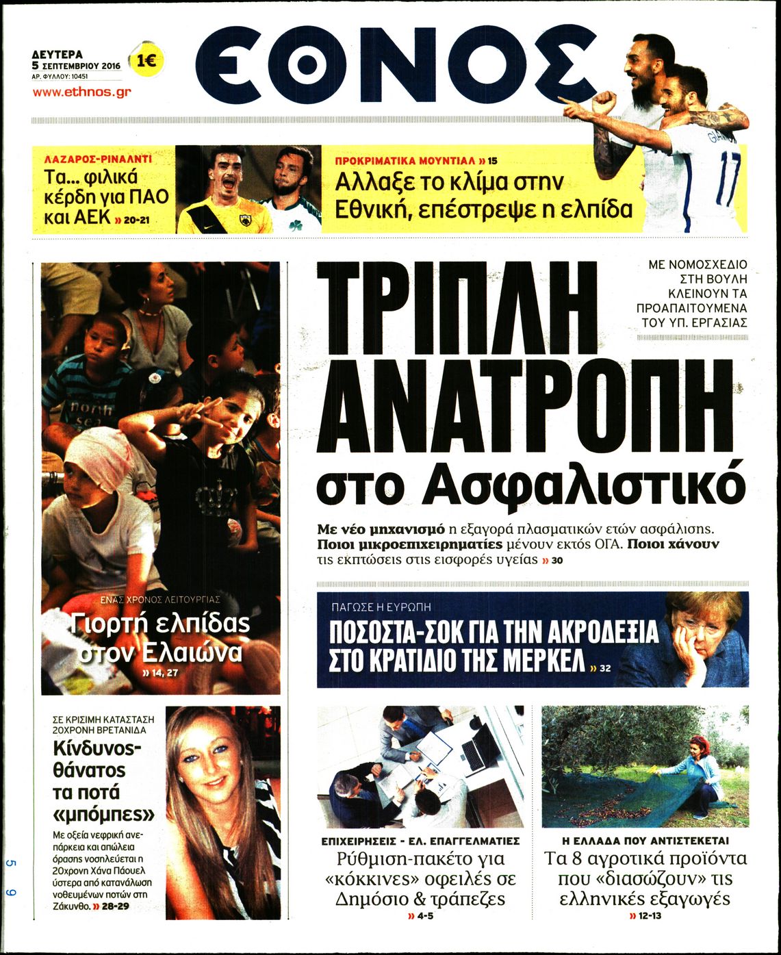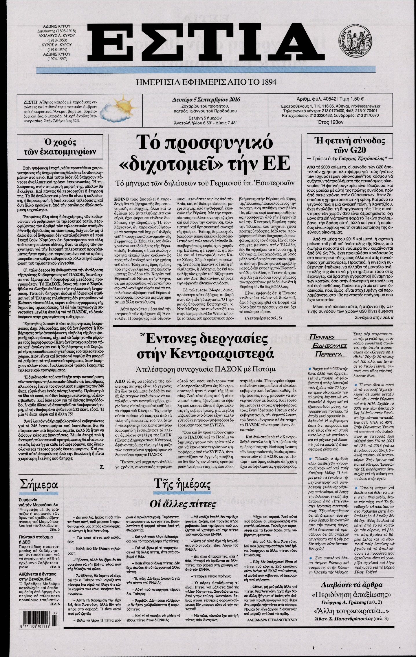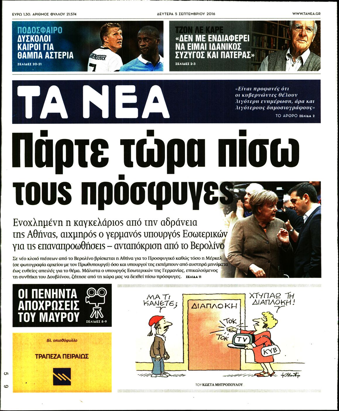 Οι πολιτικές εφημερίδες 5-9-2016 Enikos Newsroom 05:58, Δευτέρα 05 Σεπτεμβρίου 2016 Media Διαβάστε τα σημερινά πρωτοσέλιδα των πολιτικών εφημερίδων: ΠΟΛΙΤΙΚΕΣ ΕΦΗΜΕΡΙΔΕΣ ΠΡΩΤΟΣΕΛΙΔΑ Μοιράσου το: σχολίασε κι εσύ (0 σχόλια) Ακολουθήστε το enikos.gr στο Google News και μάθετε πρώτοι όλες τις ειδήσεις Δείτε όλες τις τελευταίες ειδήσεις από την Ελλάδα και τον Κόσμο στο enikos.gr Ειδήσεις Ροή Ειδήσεων 49 λεπτά πριν Ευρωπαϊκή Ένωση: Συμφωνία για δάνειο 90 δισ. ευρώ στην Ουκρανία τη διετία 2026-2027 5 ώρες πριν ΟΠΕΚΕΠΕ: Προφυλακιστέος ο φερόμενος αρχηγός και ο λογιστής της εγκληματικής οργάνωσης 6 ώρες πριν Αυξάνουν την πίεση προς την κυβέρνηση οι αγρότες: Κλείνουν παρακαμπτήριους και ανοίγουν διόδια – Τι θα γίνει τις γιορτές 6 ώρες πριν Φοινικούντα: Το Σάββατο απολογείται ο 30χρονος γιος γνωστού επιχειρηματία της Πλάκας που παραδόθηκε – Όσα είπε στους αστυνομικούς και ο ρόλος του στο έγκλημα 5 ώρες πριν ΑΕΚ – Κραϊόβα 3-2: Επική ανατροπή και πρόκριση στους «16» του Conference League η Ένωση 6 ώρες πριν Αρχαιολόγοι ανακάλυψαν ρωμαϊκά τεχνουργήματα από μια πόλη που δεν υπήρξε ποτέ – Τα τρία εντυπωσιακά κτίρια και ο αμφορέας με τις… σαρδέλες 7 ώρες πριν Ύπνος: Η απλή βραδινή ρουτίνα για να προστατεύσετε τα μαλλιά σας από το κρύο κατά τη διάρκεια του χειμώνα 8 ώρες πριν Manifesting: Πώς να συναντήσετε τον σύντροφο της ζωής σας, ανάλογα με τον μήνα γέννησής σας 2 ημέρες πριν 20 χρόνια τα Χριστούγεννα ξεκινούν στα Public με μεγάλη ποικιλία σε δώρα! 12 λεπτά πριν Αυστραλία: Κήρυξε την Κυριακή (21/12) ημέρα εθνικού πένθους για τη φονική επίθεση στην παραλία Μπόνταϊ 22 λεπτά πριν Ρόδος: Δάσκαλος καράτε καταδικάστηκε για ασέλγεια σε ανήλικες αθλήτριες – Μαρτυρίες για αγγίγματα σε ευαίσθητα σημεία 37 λεπτά πριν Γουατεμάλα: Εξαρθρώθηκε κύκλωμα διακίνησης μεταναστών προς τις ΗΠΑ – Συνελήφθησαν 14 άτομα 41 λεπτά πριν Βουλγαρία: Χιλιάδες πολίτες στους δρόμους κατά της απερχόμενης κυβέρνησης και της διαφθοράς 49 λεπτά πριν Ευρωπαϊκή Ένωση: Συμφωνία για δάνειο 90 δισ. ευρώ στην Ουκρανία τη διετία 2026-2027 ENIKOS NETWORK Σε περίοδο αυξημένης δραστηριότητας η γρίπη στην Ελλάδα-Μέτρα προστασίας από τον ΕΟΔΥ Σκέφτεστε συνέχεια συζητήσεις που έχετε κάνει; Τι σημαίνει αυτό, σύμφωνα με ειδικό Στεγαστικό: Τι λέει η ΠΟΜΙΔΑ για τα νέα μέτρα που ανακοίνωσε ο Κυριάκος Μητσοτάκης Λαγκάρντ: Αισιόδοξη για την ανάπτυξη της Ευρωζώνης, αβέβαιη για τον πληθωρισμό Χαρτογραφώντας το «σημείο χωρίς επιστροφή»: Για πρώτη φορά αποκαλύπτεται με λεπτομέρεια το ακανθώδες όριο της ατμόσφαιρας τ... Η Google καταργεί τη λειτουργία «dark web report» – Πώς θα μπορούν οι χρήστες να διαγράφουν τα δεδομένα τους περισσότερα 02:50 , Παρασκευή 19 Δεκεμβρίου 2025 GNTM: «Κλείδωσαν» οι τέσσερις φιναλίστ – Μεγάλη ανατροπή στις τελευταίες αποχωρήσεις Για προτελευταία φορά εμφανίστηκαν στο πλατό του GNTM οι φιναλίστ του φετινού κύκλου, το βράδυ... 17:45 , Πέμπτη 18 Δεκεμβρίου 2025 ROUK ZOUK: Εορταστικό επεισόδιο με καλεσμένους τους πρωταγωνιστές του «Γιατί ρε πατέρα» Το Σάββατο 20 Δεκεμβρίου στις 21:00, η Ζέτα Μακρυπούλια υποδέχεται εκλεκτούς ηθοποιούς που όλο... 17:20 , Πέμπτη 18 Δεκεμβρίου 2025 Άγιος έρωτας: Η Χριστίνα εξομολογείται στον πατέρα Νικόλαο, απόψε στις 21:00 στον Alpha Η Νότα αποφασίζει να εκδικηθεί τον Πέτρο και τον Στέφανο, για χάρη του Λούη, όμως τα πράγματα ... 16:50 , Πέμπτη 18 Δεκεμβρίου 2025 Να μ’ αγαπάς: Ζωή και Φωτεινή συμφιλιώνονται ως μάνα με κόρη, απόψε στις 20:00 Η ταυτότητα του Άγγελου αποκαλύπτεται στ