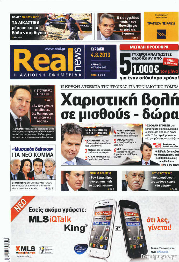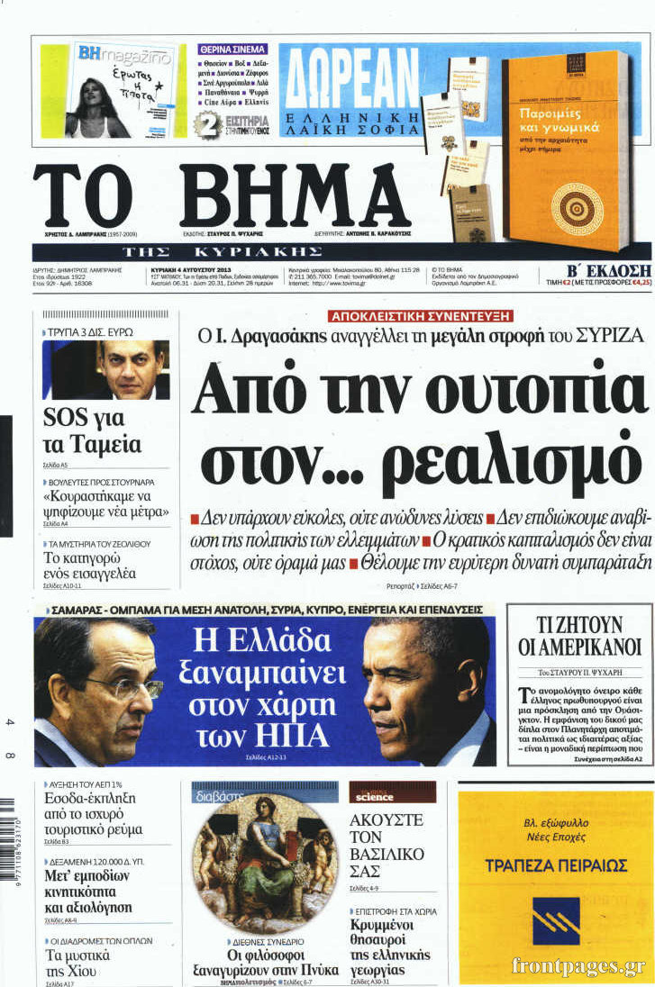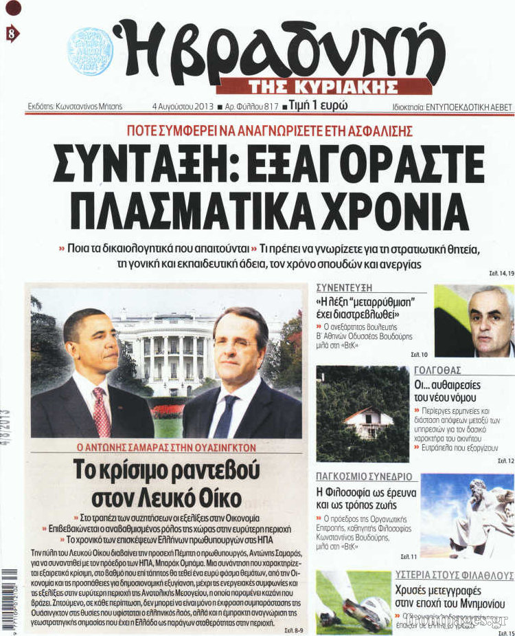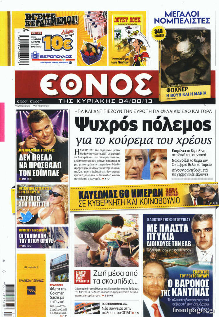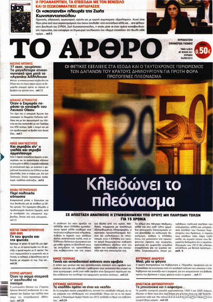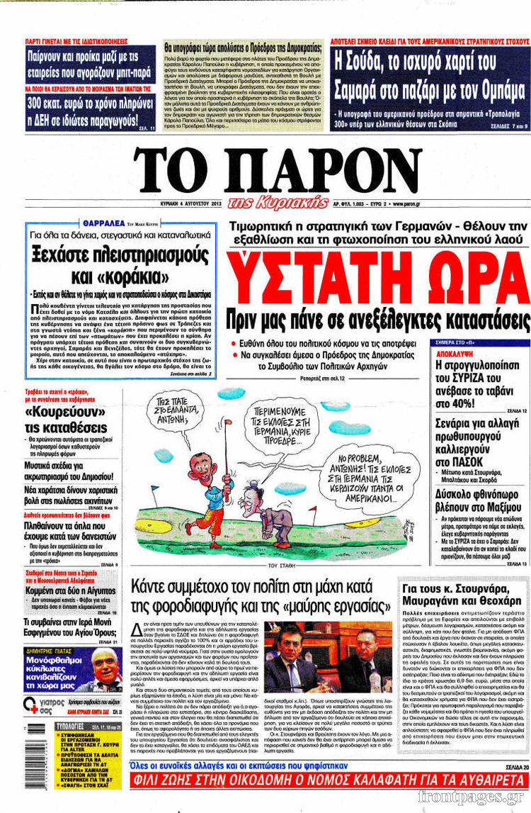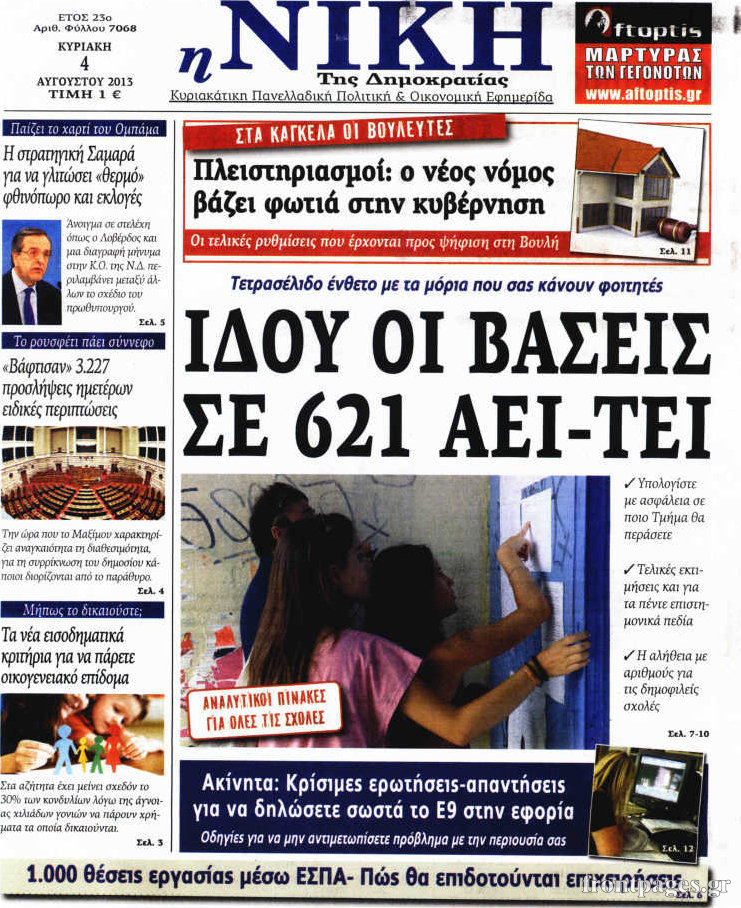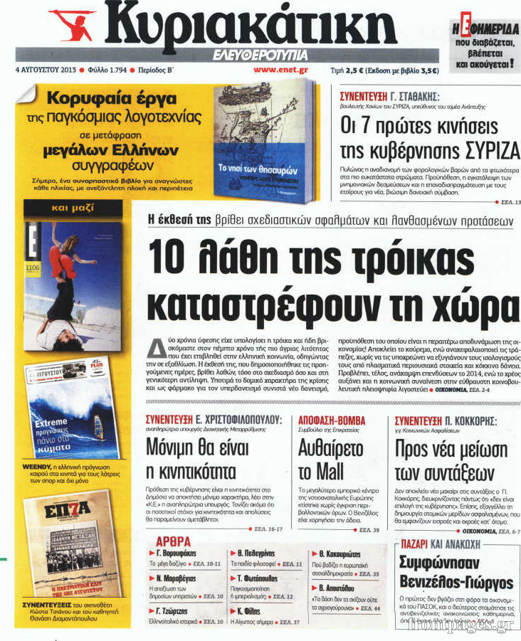 Oι πολιτικές εφημερίδες Enikos Newsroom 09:23, Κυριακή 04 Αυγούστου 2013 Media Oι πολιτικές εφημερίδες ΕΦΗΜΕΡΙΔΕΣ ΠΟΛΙΤΙΚΕΣ ΕΦΗΜΕΡΙΔΕΣ Μοιράσου το: σχολίασε κι εσύ (0 σχόλια) Ακολουθήστε το enikos.gr στο Google News και μάθετε πρώτοι όλες τις ειδήσεις Δείτε όλες τις τελευταίες ειδήσεις από την Ελλάδα και τον Κόσμο στο enikos.gr Ειδήσεις Ροή Ειδήσεων 7 ώρες πριν Χριστούγεννα στα μπλόκα: Επιμένουν στις κινητοποιήσεις τους οι αγρότες – Ανοίγουν τα διόδια το Σαββατοκύριακο 7 ώρες πριν Ουκρανία: Η άνευ προηγουμένου επίθεση σε ρωσικό τάνκερ στη Μεσόγειο και το μήνυμα προς στον Πούτιν – Το «μακρύ χέρι» του Κιέβου 6 ώρες πριν Πούτιν: Τα μηνύματα σε Ευρώπη και ΝΑΤΟ από το μαραθώνιο «σόου» του – Η απαίτηση για «σεβασμό» και η ειρήνη «με τους όρους» της Μόσχας 7 ώρες πριν Τραμπ: Δεν αποκλείει την πιθανότητα ενός πολέμου στη Βενεζουέλα – «Ο Μαδούρο ξέρει καλύτερα από τον καθένα τι ακριβώς θέλω» 8 ώρες πριν Συνεχίζει να προκαλεί ο Μίτσκοσκι: «Για μένα το όνομα Μακεδονία είναι ιερό» 6 ώρες πριν Ανακαλύφθηκαν αρχαία χρυσά νομίσματα 2.200 ετών που απεικονίζουν τον θεό Απόλλωνα – Η άγνωστη σύνδεση με τον Φίλιππο Β΄ της Μακεδονίας 7 ώρες πριν Ύπνος: Μια κρυφή κατάσταση του εγκεφάλου πριν από τον ύπνο μπορεί να είναι το “κλειδί” για υψηλή ευφυΐα και δημιουργικότητα 8 ώρες πριν Αριθμολογία: Οι άνθρωποι που έχουν γεννηθεί αυτές τις 4 ημερομηνίες, συχνά παρεξηγούνται – «Η καλοσύνη τους κρύβει τεράστια δύναμη» 9 ώρες πριν Ξεχάστε το καθάρισμα το Σαββατοκύριακο: Ο «κανόνας των 20 λεπτών» που θα σας λύσει τα χέρια 2 λεπτά πριν Γιώργος Μπαρτζώκας: «Για εμένα σημαίνει πάρα πολλά να ακούω το όνομά μου από τον κόσμο του Ολυμπιακού» 12 λεπτά πριν ΟΗΕ: Το Συμβούλιο Ασφαλείας παρατείνει για έναν χρόνο την εντολή της ειρηνευτικής δύναμης στο Κονγκό 27 λεπτά πριν Μοχάμεντ Σαλάχ: Ζήτησε «συγγνώμη» από τους συμπαίκτες του στη Λίβερπουλ για το ξέσπασμά του 42 λεπτά πριν Μάρκο Ρούμπιο: Ανθρωπιστική κατάπαυση του πυρός στο Σουδάν ζητά ο Αμερικανός υπουργός Εξωτερικών 57 λεπτά πριν Αγγελική Νικολούλη: Τα συλλυπητήρια για την απώλεια της Ειρήνης Μαρινάκη ENIKOS NETWORK Το ΕΚΑΒ τιμήθηκε από την Ακαδημία Αθηνών για τα 40 χρόνια προσφοράς του Έχετε πραγματικά μεγάλη καρδιά; 10 χαρακτηριστικά όσων έχουν καλοσύνη Αναστολή μέτρων αναγκαστικής εκτέλεσης για κτηνοτρόφους που πλήττονται από την ευλογιά των αιγοπροβάτων Πλήρης επάρκεια προϊόντων στις λαϊκές της Αττικής, παρά τις αγροτικές κινητοποιήσεις – Τι απαντούν οι πωλητές Χαρτογραφώντας το «σημείο χωρίς επιστροφή»: Για πρώτη φορά αποκαλύπτεται με λεπτομέρεια το ακανθώδες όριο της ατμόσφαιρας τ... Η Google καταργεί τη λειτουργία «dark web report» – Πώς θα μπορούν οι χρήστες να διαγράφουν τα δεδομένα τους περισσότερα 04:20 , Σάββατο 20 Δεκεμβρίου 2025 Αγγελική Νικολούλη: Τα συλλυπητήρια για την απώλεια της Ειρήνης Μαρινάκη Τα συλληπητήρια στον πρόεδρο του Mega, τον Βαγγέλη Μαρινάκη, για την απώλεια της μητέρας του Ε... 02:50 , Σάββατο 20 Δεκεμβρίου 2025 GNTM: Η Ξένια Τσίρκοβα αναδείχθηκε μεγάλη νικήτρια και πήρε τις 50.000 ευρώ – Ποιος βρέθηκε σε απόσταση αναπνοής; Με φαντασμαγορικό τρόπο ολοκληρώθηκε το βράδυ της Παρασκευής ο μεγάλος τελικός του GNTM, μέσα ... 22:42 , Παρασκευή 19 Δεκεμβρίου 2025 Γιώργος Γιαννόπουλος για “Το σόι σου”: “Είναι ευτυχία και ευλογία αυτή η σειρά” «Είναι ευτυχία και ευλογία η συγκυρία αυτής της σειράς», θα πει ο Γιώργος Γιαννόπουλος -ο αγαπ... 20:37 , Παρασκευή 19 Δεκεμβρίου 2025 Don
