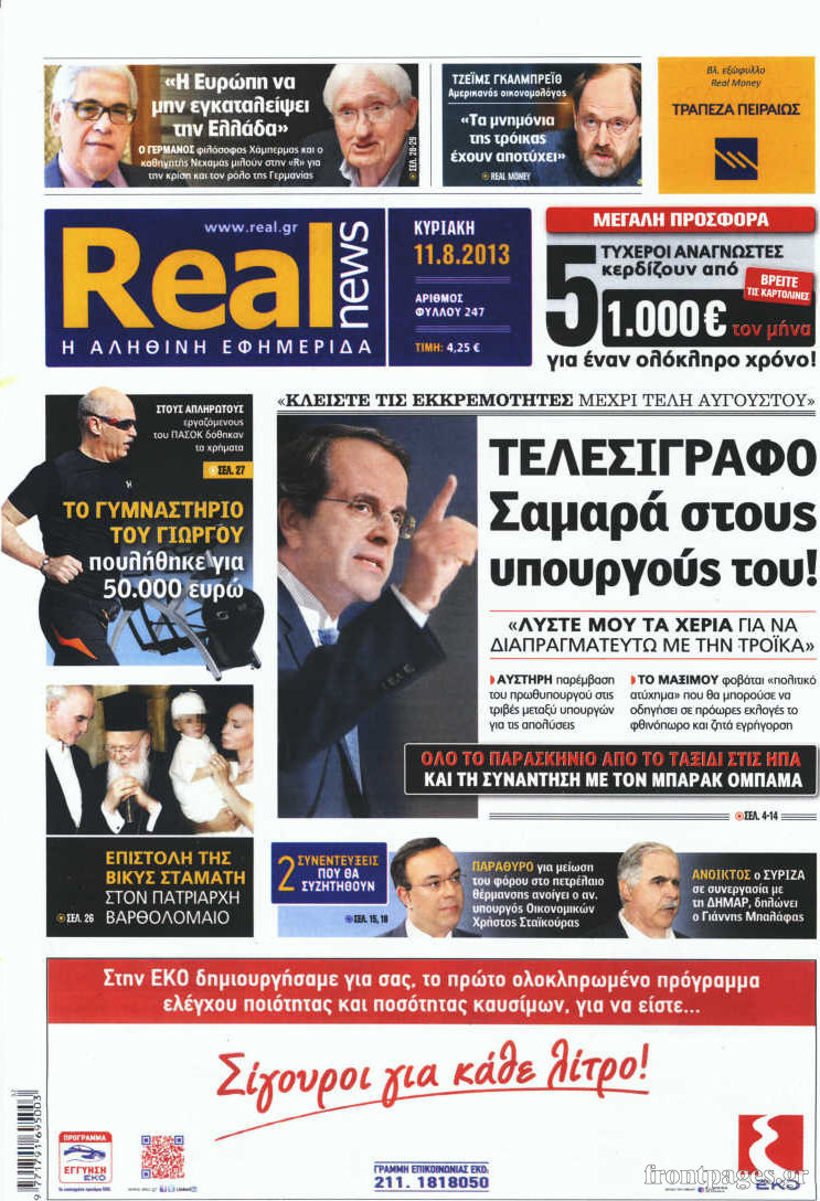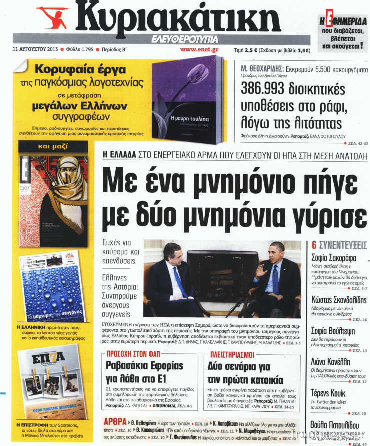 Oι πολιτικές εφημερίδες Enikos Newsroom 07:29, Κυριακή 11 Αυγούστου 2013 Media Oι πολιτικές εφημερίδες ΕΦΗΜΕΡΙΔΕΣ ΚΥΡΙΑΚΑΤΙΚΕΣ ΕΦΗΜΕΡΙΔΕΣ ΠΟΛΙΤΙΚΕΣ ΕΦΗΜΕΡΙΔΕΣ Μοιράσου το: σχολίασε κι εσύ (0 σχόλια) Ακολουθήστε το enikos.gr στο Google News και μάθετε πρώτοι όλες τις ειδήσεις Δείτε όλες τις τελευταίες ειδήσεις από την Ελλάδα και τον Κόσμο στο enikos.gr Ειδήσεις Ροή Ειδήσεων 3 ώρες πριν Live-Μετ’ εμποδίων η έξοδος για τα Χριστούγεννα: Πού ανοίγουν επιπλέον λωρίδες κυκλοφορίας στην Αθηνών-Λαμίας – Ουρές χιλιομέτρων σχηματίζουν τα αυτοκίνητα 5 ώρες πριν Μπλόκα της Τροχαίας: «Λερναία Ύδρα» τα γκρουπ στο Viber που προειδοποιούν για ελέγχους – Το «γκρίζο» νομικό τοπίο και οι νόμιμες εφαρμογές 3 ώρες πριν Καιρός: Βροχερό το σκηνικό τις ημέρες των Χριστουγέννων – Έρχονται καταιγίδες και ενισχυμένοι άνεμοι, πού θα χιονίσει 4 ώρες πριν Καλύβια: Είχε χάσει 30 κιλά το «πιστόλι» του Έντικ για να μην αναγνωρίζεται – Πώς εντόπισε τον 35χρονο το ελληνικό FBI 4 ώρες πριν Αλεξανδρούπολη: Προφυλακίστηκε η μητέρα του 3χρονου που πέθανε από ασιτία – Τι λέει η δικηγόρος της 4 ώρες πριν Τα 4 ζώδια που θα λάβουν όλα όσα ζητήσουν από το σύμπαν το 2026 -«Οι ευχές σας γίνονται πραγματικότητα» 9 ώρες πριν Αν πίνετε τον καφέ σας σκέτο, πιθανότατα διαθέτετε αυτά τα 7 ισχυρά χαρακτηριστικά 5 ώρες πριν Μυστήριο στο Διάστημα: Επιστήμονες εντόπισαν ένα «πρωτοφανές φαινόμενο» γύρω από το «Μάτι του Σάουρον», μόλις 25 έτη φωτός από τη Γη 10 ώρες πριν Η Coca-Cola και ο Ελληνικός Ερυθρός Σταυρός μαζί αυτά τα Χριστούγεννα: Μια μεγάλη αγκαλιά για τους συνανθρώπους μας που έχουν ανάγκη 3 λεπτά πριν Παυλίνα Βουλγαράκη: «Με το που γεννήθηκε η κόρη μου, μου δόθηκε ένα κίνητρο προς το φως» 8 λεπτά πριν Ιλίσια: Διασωληνωμένος και σε σοβαρή κατάσταση ο συντηρητής του ασανσέρ – Πώς έγινε το ατύχημα στο σούπερ μάρκετ 13 λεπτά πριν Συνάντηση Μητσοτάκη με τον ιδρυτή του περιοδικού δρόμου «Σχεδία» – Τι συζήτησαν 19 λεπτά πριν Δήμος Αθηναίων: Αναβάλλεται η «Νύχτα των Ευχών» λόγω της κακοκαιρίας – Πότε θα πραγματοποιηθεί 24 λεπτά πριν Έφη Παπαθεοδώρου: «Το “Παρά Πέντε” μου θυμίζει την Ειρήνη Κουμαριανού και στενοχωριέμαι που δεν την έχω δίπλα μου» ENIKOS NETWORK Συγκίνηση στα εγκαίνια του ανακαινισμένου Κέντρου Υγείας στο Αμύνταιο ΕΦΕΤ: Οδηγίες για το τραπέζι των Χριστουγέννων – Τι πρέπει να προσέξουν οι καταναλωτές ΔΥΠΑ: Πότε ολοκληρώνεται το πρόγραμμα επιταγών αγοράς βιβλίων – Τι πρέπει να γνωρίζουν οι δικαιούχοι Τράπεζες: Δείτε ποιες ημέρες θα είναι κλειστές – Τι πρέπει να γνωρίζετε για τις συναλλαγές σας Ο Google Assistant θα παραμείνει λίγο περισσότερο για ορισμένους χρήστες Android Τεστ προσωπικότητας: Το βάζο που θα επιλέξετε αποκαλύπτει πώς λύνετε προβλήματα στη ζωή σας περισσότερα 19:15 , Τρίτη 23 Δεκεμβρίου 2025 Να μ’ αγαπάς: Η Φωτεινή πυροβολεί τον Ορφέα, απόψε στις 20:00 Η Νικαίτη επιστρέφει στο σπίτι των Καλλιγά και η Σοφία απειλεί τον Θεόφιλο στο νέο επεισόδιο τ... 17:59 , Τρίτη 23 Δεκεμβρίου 2025 Στο Παρά Πέντε – 20 Χρόνια Μετά: Απόψε στις 21:00 στο Mega το αναμενόμενο Reunion Το πλέον αναμενόμενο και νοσταλγικό Reunion της ελληνικής τηλεόρασης, το «Στο Παρά Πέντε – 20 ... 17:38 , Τρίτη 23 Δεκεμβρίου 2025 Άγιος έρωτας: Ο σεισμός σπέρνει το θάνατο στη Στέρνα Μετά τον καταστροφικό σεισμό που χτυπά τη Στέρνα, τίποτα δεν θα είναι πια το ίδιο στη σειρά ... 14:03 , Τρίτη 23 Δεκεμβρίου 2025 Έξοδος εκδρομέων για τα Χριστούγεννα: Στείλε βίντεο ή φωτογραφίες στο enikos.gr – Αποθήκευσε τον αριθ