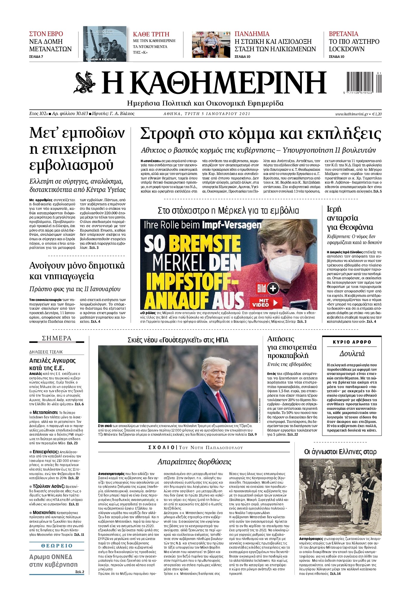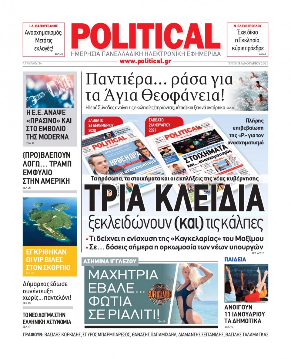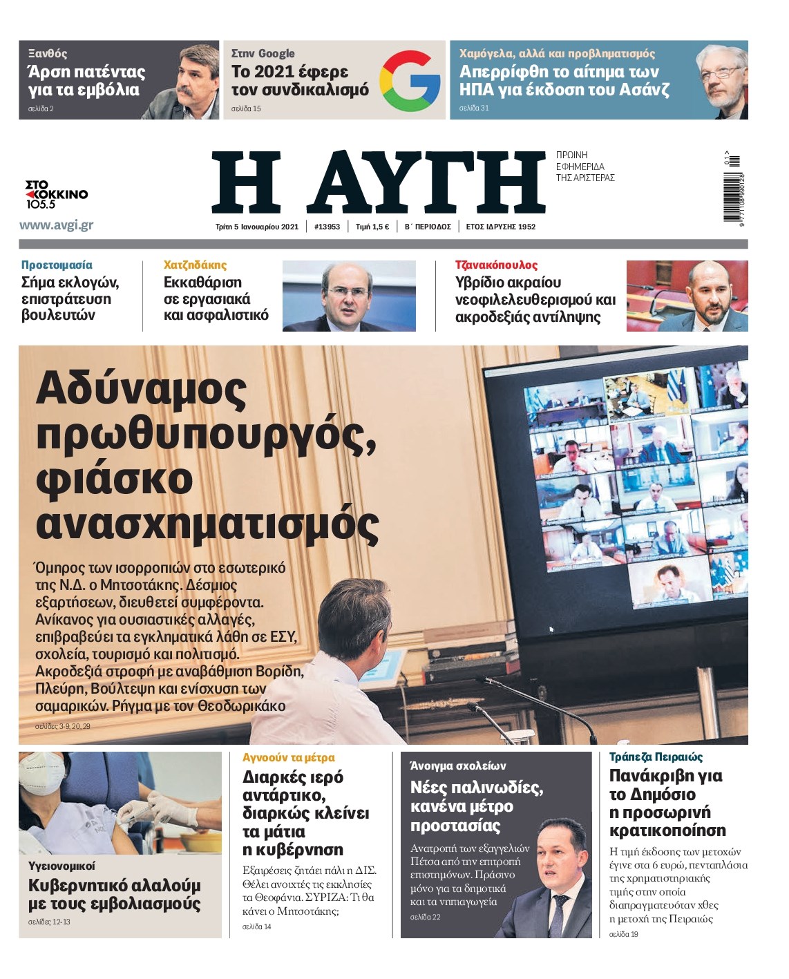 Οι πολιτικές εφημερίδες 5/1/2021 Διονύσης Νίκκας 06:14, Τρίτη 05 Ιανουαρίου 2021 Media Διαβάστε τα πρωτοσέλιδα των πολιτικών εφημερίδων… ΕΦΗΜΕΡΙΔΕΣ ΠΟΛΙΤΙΚΕΣ ΕΦΗΜΕΡΙΔΕΣ ΠΡΩΤΟΣΕΛΙΔΑ Μοιράσου το: σχολίασε κι εσύ (0 σχόλια) Ακολουθήστε το enikos.gr στο Google News και μάθετε πρώτοι όλες τις ειδήσεις Δείτε όλες τις τελευταίες ειδήσεις από την Ελλάδα και τον Κόσμο στο enikos.gr Ειδήσεις Ροή Ειδήσεων 3 ώρες πριν Υπόθεση Έπσταϊν: Το Υπουργείο Δικαιοσύνης δημοσιοποίησε μια σειρά από εξαιρετικά επεξεργασμένα αρχεία – «Λείπουν τα πιο σημαντικά έγγραφα», λένε οι Δημοκρατικοί 22 λεπτά πριν Γιορτές με μπλόκα για τους αγρότες: Ανοίγουν διόδια και μοιράζουν προϊόντα στους ταξιδιώτες 54 λεπτά πριν Εξαφάνιση 33χρονου γιατρού στην Κρήτη: «Άναψα τα φώτα, τρόμαξε και άρχισε να τρέχει στα χωράφια» – Η τελευταία διαδρομή και η μαρτυρία «κλειδί» 2 ώρες πριν Ο «χάρτης» με τις αυξήσεις και τις φοροελαφρύνσεις του 2026 – Ποιοι και πόσα κερδίζουν 38 λεπτά πριν Τα αρχεία του Έπσταϊν αποκαλύπτουν φωτογραφία του έκπτωτου πρίγκιπα Άντριου – Είναι ξαπλωμένος στην αγκαλιά 5 γυναικών 45 λεπτά πριν Μία νέα «χρυσή» περίοδος αρχίζει για 3 ζώδια από σήμερα – «Μία αναπάντεχη ευκαιρία οδηγεί στην επιτυχία» 5 ώρες πριν Αυγά: Πόσα μπορείτε να τρώτε την ημέρα με ασφάλεια για μέγιστη πρόσληψη πρωτεΐνης 3 ώρες πριν Αρχαιολόγοι ανακάλυψαν σε χωράφι απεικόνιση 600 ετών ενός Αγίου – Τα στοιχεία που δείχνουν ότι μαρτύρησε 2 ώρες πριν Αγχώνεται για το χριστουγεννιάτικο δώρο που πήρε στην πλούσια σύντροφό του – «Φοβάμαι πως θα το βρει φθηνιάρικο, φοράει βραχιόλια Cartier» 6 λεπτά πριν Πώς η κλιματική αλλαγή επηρεάζει εγκύους και βρέφη – Οι επιπτώσεις των υψηλών θερμοκρασιών 14 λεπτά πριν e-ΕΦΚΑ και ΔΥΠΑ: Οι πληρωμές από 22 έως 24 Δεκεμβρίου – Ποιοι θα δουν χρήματα στους λογαριασμούς τους 22 λεπτά πριν Συνελήφθη οδηγός μηχανής που έτρεχε με 161 χλμ στη Συγγρού – Τον έπιασε το ραντάρ της Τροχαίας 22 λεπτά πριν Γιορτές με μπλόκα για τους αγρότες: Ανοίγουν διόδια και μοιράζουν προϊόντα στους ταξιδιώτες 30 λεπτά πριν Τηλεθέαση (19/12): Κυριάρχησε η σειρά «Το σόι σου» – Τι νούμερα έκανε ο τελικός του GNTM ENIKOS NETWORK Είστε μόνιμα απρόσεκτοι; 3 σημάδια που δείχνουν ότι μπορεί να είναι σύμπτωμα πάθησης Πόσα κιλά παίρνουμε πραγματικά τα Χριστούγεννα, σύμφωνα με την επιστήμη – Πώς να το αποτρέψουμε; Επίδομα παιδιού: Τι αλλάζει από το 2026 – Το όφελος από τις φορολογικές ελαφρύνσεις Mega χριστουγεννιάτικη φορολοταρία: «Κλείδωσε» η ημερομηνία για την κλήρωση – Ερωτήσεις και απαντήσεις Χαρτογραφώντας το «σημείο χωρίς επιστροφή»: Για πρώτη φορά αποκαλύπτεται με λεπτομέρεια το ακανθώδες όριο της ατμόσφαιρας τ... Η Google καταργεί τη λειτουργία «dark web report» – Πώς θα μπορούν οι χρήστες να διαγράφουν τα δεδομένα τους περισσότερα 09:30 , Σάββατο 20 Δεκεμβρίου 2025 «Porto Leone: Στη γειτονιά με τα κόκκινα φανάρια» – Ο Χρόνης αποκαλύπτει στην Αλεξάνδρα το μυστικό για το παιδί της Λένας Η μεγάλη δραματική σειρά του Apha «Porto Leone: Στη γειτονιά με τα κόκκινα φανάρια» μας μεταφέ... 08:14 , Σάββατο 20 Δεκεμβρίου 2025 Τρομεροί γονείς: Η Μαρία Καβογιάννη εισβάλλει στο σπίτι της οικογένειας Στεφανίδη Όσα θα δούμε στο νέο διπλό επεισόδιο της σειράς «Τρομεροί γονείς», σήμερα Σάββατο 20 Δεκεμβρίο... 05:48 , Σάββατο 20 Δεκεμβρίου 2025 Οι οικονομικές εφημερίδες 20/12/2025 Διαβάστε τα πρωτοσέλιδα από τις οικονομικές εφημερίδες, σήμερα 20/12/2025. 05:43 , Σάββατο 20 Δεκεμβρίου 2025 Οι αθλητικές εφημερίδες 20/12/20