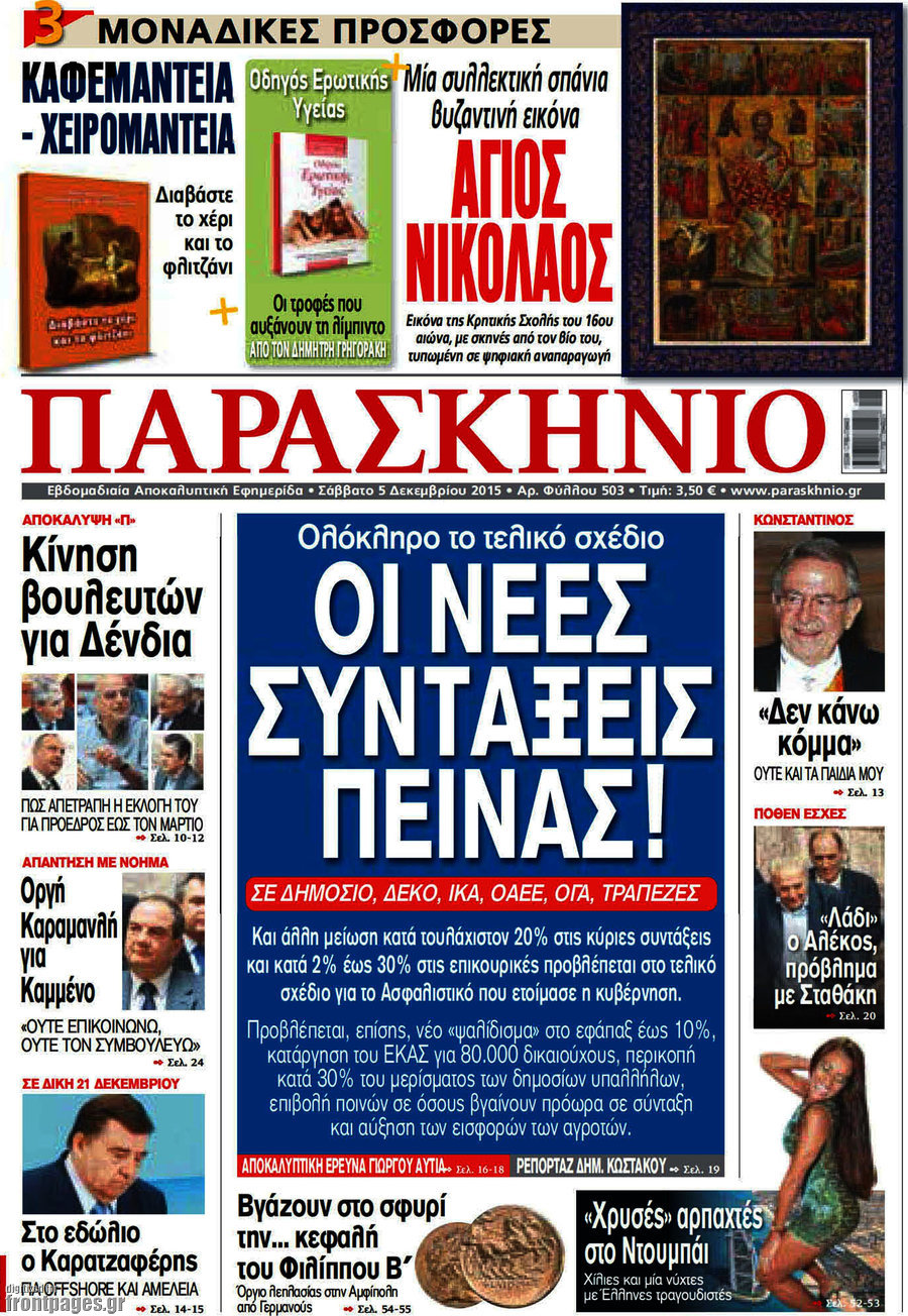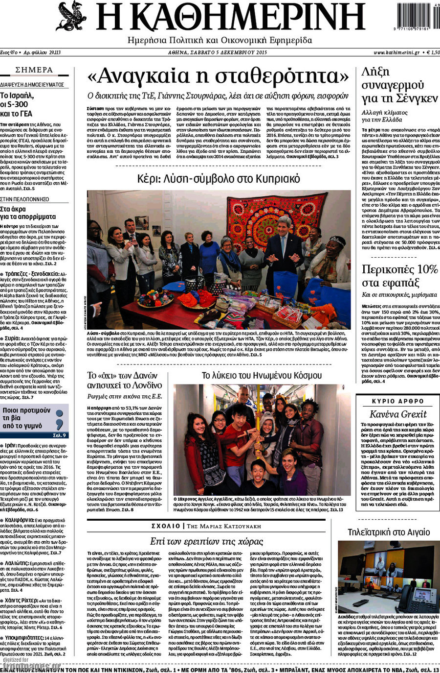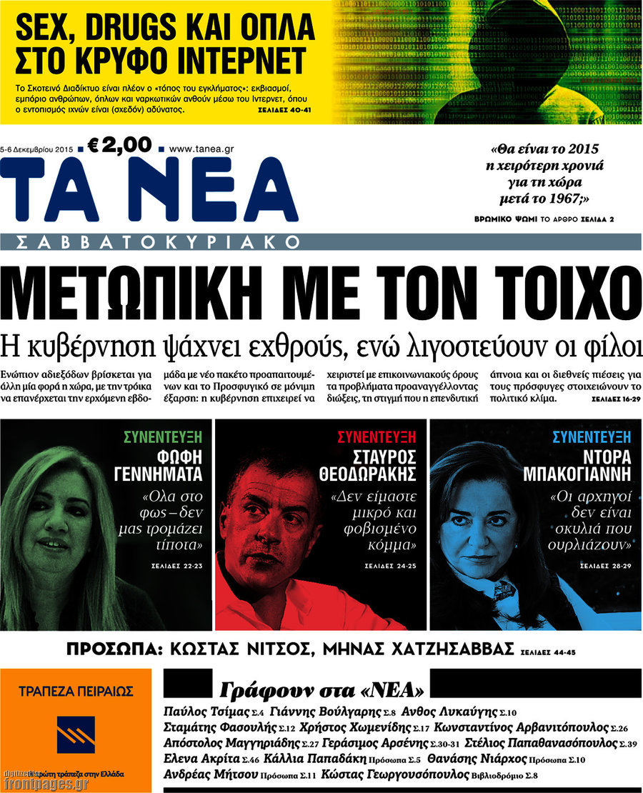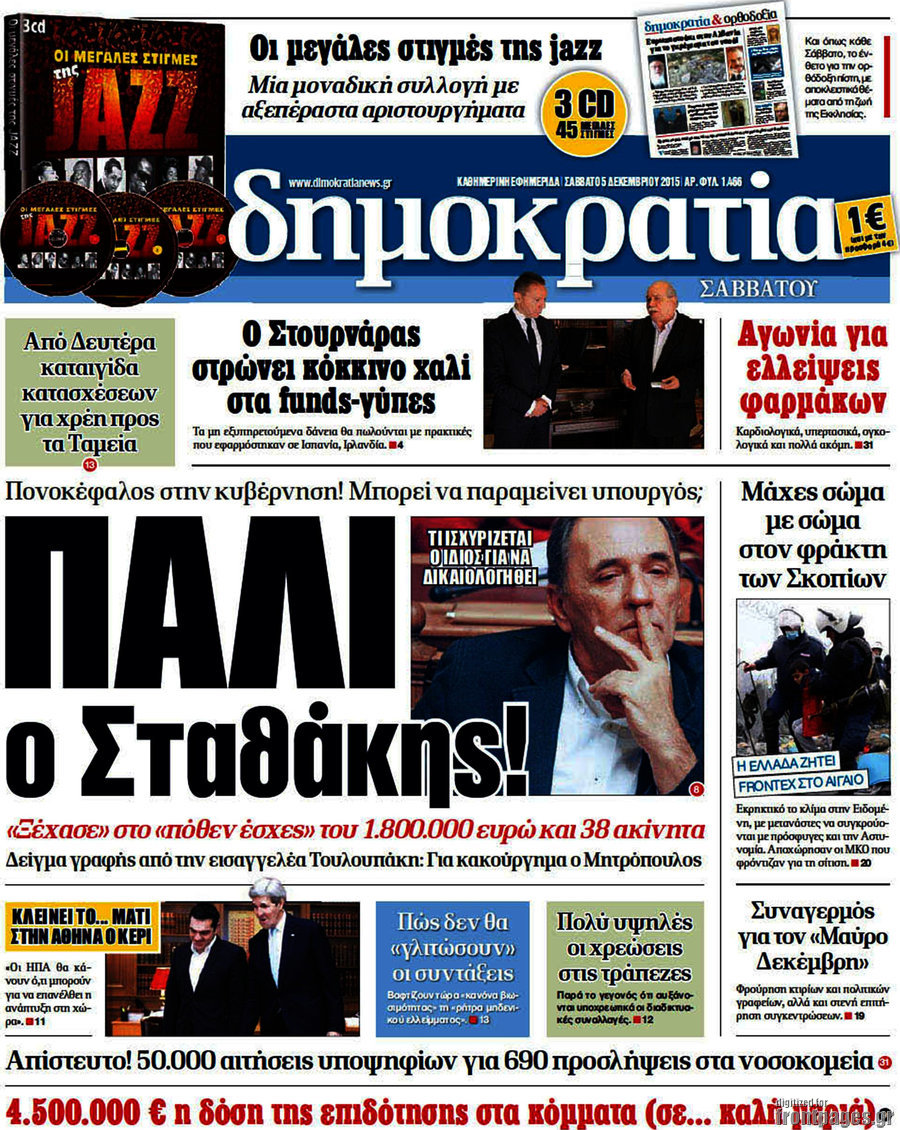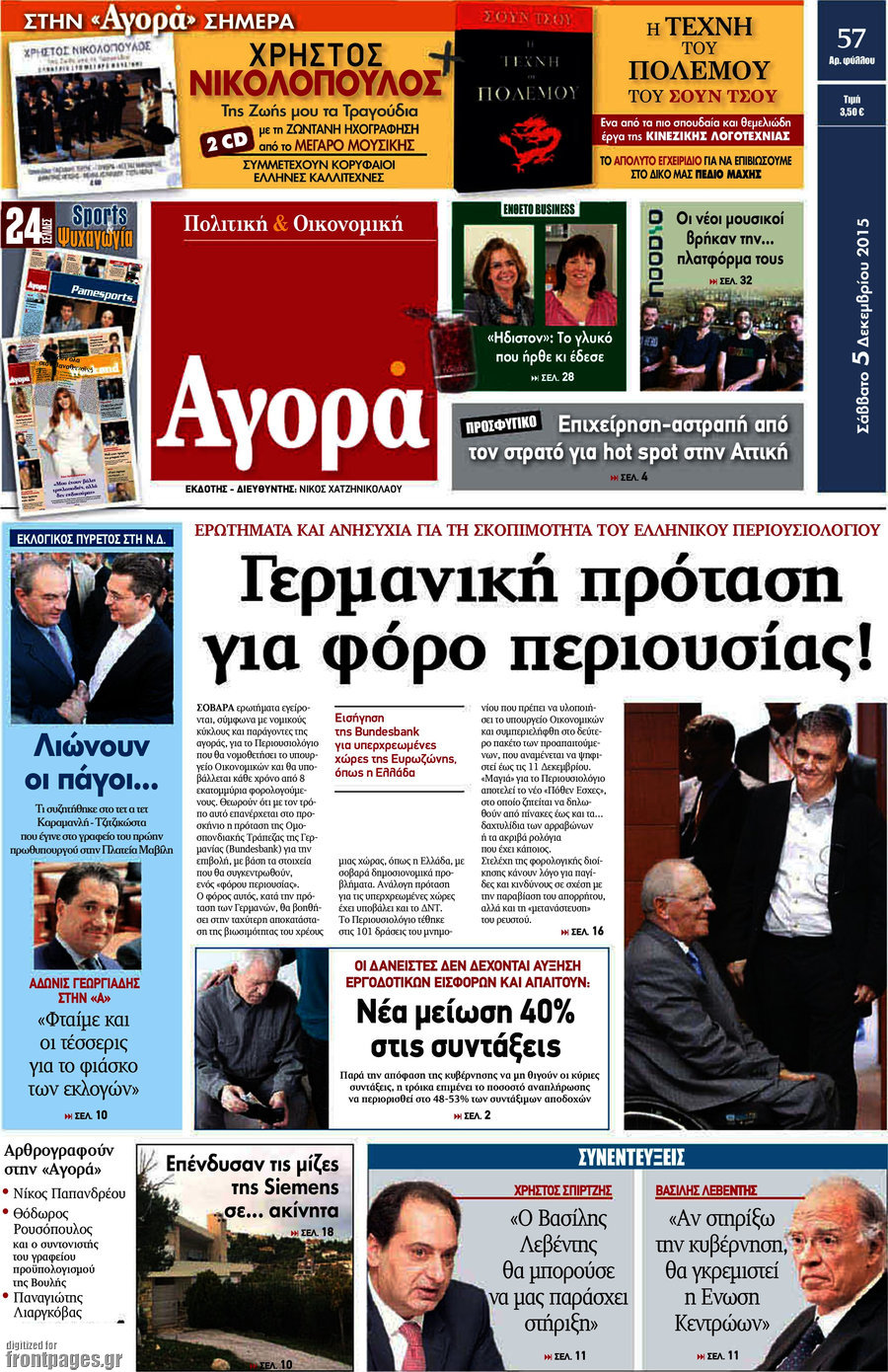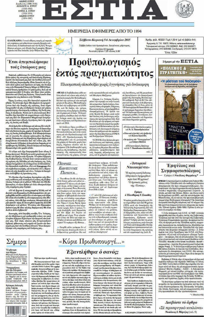 Οι πολιτικές εφημερίδες 5/12/2015 Enikos Newsroom 07:53, Σάββατο 05 Δεκεμβρίου 2015 Media Διαβάστε τα σημερινά πρωτοσέλιδα των πολιτικών εφημερίδων: ΠΟΛΙΤΙΚΕΣ ΕΦΗΜΕΡΙΔΕΣ Μοιράσου το: σχολίασε κι εσύ (0 σχόλια) Ακολουθήστε το enikos.gr στο Google News και μάθετε πρώτοι όλες τις ειδήσεις Δείτε όλες τις τελευταίες ειδήσεις από την Ελλάδα και τον Κόσμο στο enikos.gr Ειδήσεις Ροή Ειδήσεων 2 ώρες πριν Χριστούγεννα στα μπλόκα: Επιμένουν στις κινητοποιήσεις τους οι αγρότες – Ανοίγουν τα διόδια το Σαββατοκύριακο 2 ώρες πριν Ουκρανία: Η άνευ προηγουμένου επίθεση σε ρωσικό τάνκερ στη Μεσόγειο και το μήνυμα προς στον Πούτιν – Το «μακρύ χέρι» του Κιέβου 2 ώρες πριν Πούτιν: Τα μηνύματα σε Ευρώπη και ΝΑΤΟ από το μαραθώνιο «σόου» του – Η απαίτηση για «σεβασμό» και η ειρήνη «με τους όρους» της Μόσχας 3 ώρες πριν Τραμπ: Δεν αποκλείει την πιθανότητα ενός πολέμου στη Βενεζουέλα – «Ο Μαδούρο ξέρει καλύτερα από τον καθένα τι ακριβώς θέλω» 3 ώρες πριν Συνεχίζει να προκαλεί ο Μίτσκοσκι: «Για μένα το όνομα Μακεδονία είναι ιερό» 2 ώρες πριν Ανακαλύφθηκαν αρχαία χρυσά νομίσματα 2.200 ετών που απεικονίζουν τον θεό Απόλλωνα – Η άγνωστη σύνδεση με τον Φίλιππο Β΄ της Μακεδονίας 3 ώρες πριν Ύπνος: Μια κρυφή κατάσταση του εγκεφάλου πριν από τον ύπνο μπορεί να είναι το “κλειδί” για υψηλή ευφυΐα και δημιουργικότητα 4 ώρες πριν Αριθμολογία: Οι άνθρωποι που έχουν γεννηθεί αυτές τις 4 ημερομηνίες, συχνά παρεξηγούνται – «Η καλοσύνη τους κρύβει τεράστια δύναμη» 5 ώρες πριν Ξεχάστε το καθάρισμα το Σαββατοκύριακο: Ο «κανόνας των 20 λεπτών» που θα σας λύσει τα χέρια 13 λεπτά πριν Φαίη Σκορδά: «Παλιότερα τα κομπλιμέντα τα προσπερνούσα, τώρα τα έχω ανάγκη» 29 λεπτά πριν Βασίλης Σπανούλης: Δεν εμφανίστηκε ούτε ένας δημοσιογράφος στην συνέντευξη Τύπου – «Καλησπέρα στον… κανέναν», δείτε βίντεο 40 λεπτά πριν Πόλεμος στην Ουκρανία: Εφτά νεκροί από ρωσική πυραυλική επίθεση στο λιμάνι της Οδησσού 43 λεπτά πριν ΗΠΑ: Η κυβέρνηση του Ντόναλντ Τραμπ άρχισε να δημοσιοποιεί τα αρχεία Έπσταϊν 55 λεπτά πριν Σάμος: Άνοιξε το μπλόκο των αγροτών στον κόμβο Κοκκαρίου – Σε νέα συνεδρίαση θα καθορίσουν την στάση τους ENIKOS NETWORK Το ΕΚΑΒ τιμήθηκε από την Ακαδημία Αθηνών για τα 40 χρόνια προσφοράς του Έχετε πραγματικά μεγάλη καρδιά; 10 χαρακτηριστικά όσων έχουν καλοσύνη Αναστολή μέτρων αναγκαστικής εκτέλεσης για κτηνοτρόφους που πλήττονται από την ευλογιά των αιγοπροβάτων Πλήρης επάρκεια προϊόντων στις λαϊκές της Αττικής, παρά τις αγροτικές κινητοποιήσεις – Τι απαντούν οι πωλητές Χαρτογραφώντας το «σημείο χωρίς επιστροφή»: Για πρώτη φορά αποκαλύπτεται με λεπτομέρεια το ακανθώδες όριο της ατμόσφαιρας τ... Η Google καταργεί τη λειτουργία «dark web report» – Πώς θα μπορούν οι χρήστες να διαγράφουν τα δεδομένα τους περισσότερα 22:42 , Παρασκευή 19 Δεκεμβρίου 2025 Γιώργος Γιαννόπουλος για “Το σόι σου”: “Είναι ευτυχία και ευλογία αυτή η σειρά” «Είναι ευτυχία και ευλογία η συγκυρία αυτής της σειράς», θα πει ο Γιώργος Γιαννόπουλος -ο αγαπ... 20:37 , Παρασκευή 19 Δεκεμβρίου 2025 Don’t Forget The Lyrics: Η Έλλη Κοκκίνου υποδέχεται 4 παίκτες που θα κάνουν τα πάντα για να μη χάσουν ούτε… μισή λέξη από τους στίχους Το «Don’t Forget The Lyrics» επιστρέφει απόψε, Παρασκευή 19 Δεκεμβρίου, στις 21:00 με νέο επει... 19:31 , Παρασκευή 19 Δεκεμβρίου 2025 GNTM: Απόψε ο μεγάλος τελικός για τους 4 φιναλίστ Έπειτα από μήνες γεμάτους μόδα, δημιουργία και έντονες αναμετρήσεις, το GNTM 2025 κορυφώνεται,... 18:11 , Παρασκευή 19 Δ