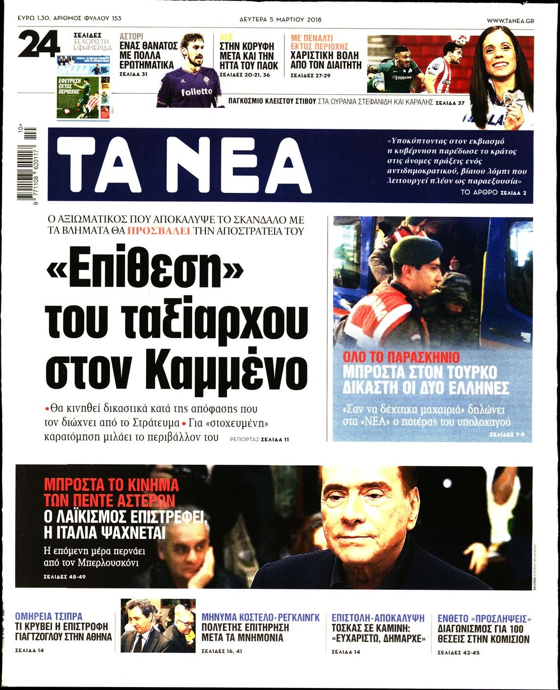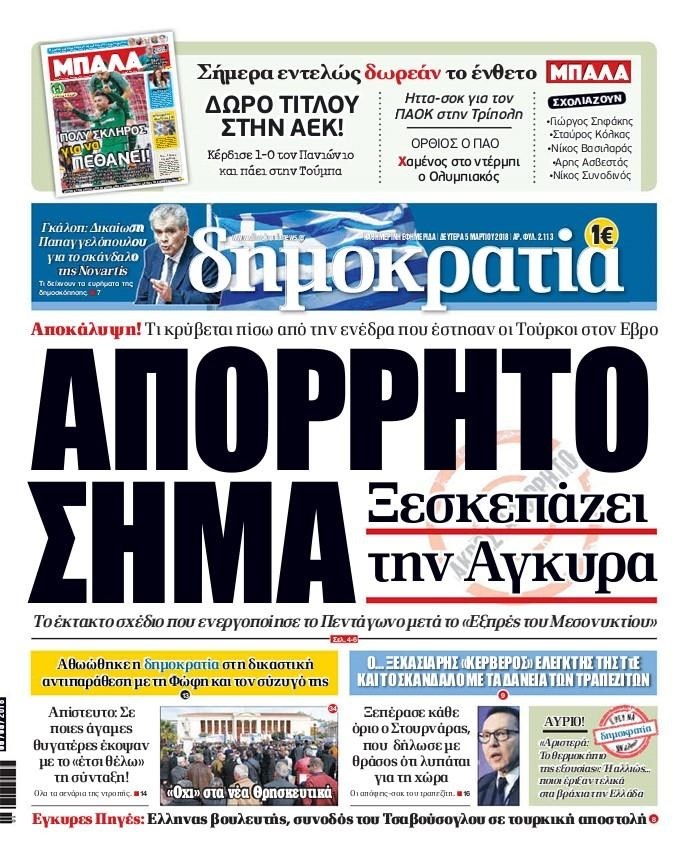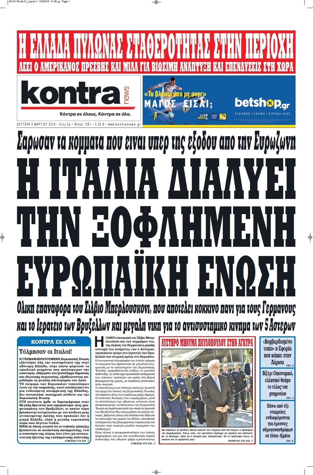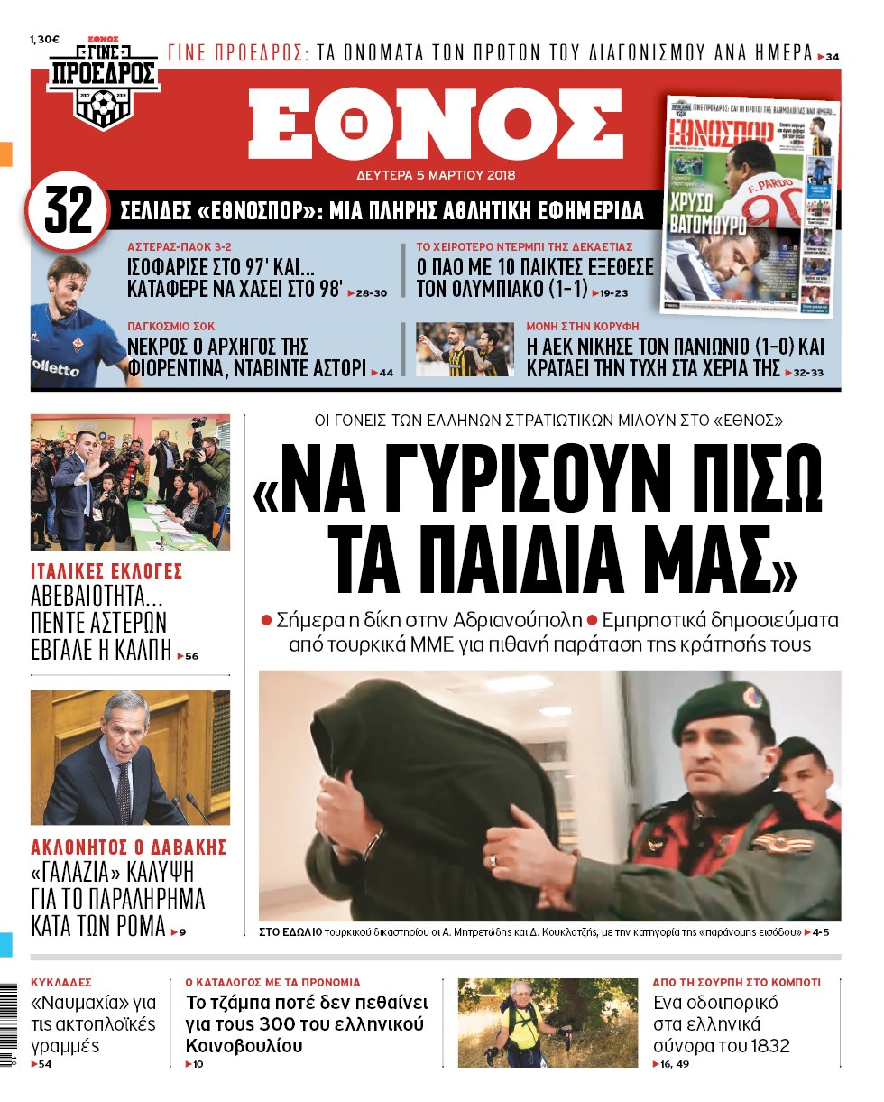 Οι πολιτικές εφημερίδες 5/3/2018 Κώστας Τεό 06:58, Δευτέρα 05 Μαρτίου 2018 Media Διαβάστε τα σημερινά πρωτοσέλιδα των πολιτικών εφημερίδων: ΠΟΛΙΤΙΚΕΣ ΕΦΗΜΕΡΙΔΕΣ ΠΡΩΤΟΣΕΛΙΔΑ Μοιράσου το: σχολίασε κι εσύ (0 σχόλια) Ακολουθήστε το enikos.gr στο Google News και μάθετε πρώτοι όλες τις ειδήσεις Δείτε όλες τις τελευταίες ειδήσεις από την Ελλάδα και τον Κόσμο στο enikos.gr Ειδήσεις Ροή Ειδήσεων 7 ώρες πριν Χριστούγεννα στα μπλόκα: Επιμένουν στις κινητοποιήσεις τους οι αγρότες – Ανοίγουν τα διόδια το Σαββατοκύριακο 7 ώρες πριν Ουκρανία: Η άνευ προηγουμένου επίθεση σε ρωσικό τάνκερ στη Μεσόγειο και το μήνυμα προς στον Πούτιν – Το «μακρύ χέρι» του Κιέβου 6 ώρες πριν Πούτιν: Τα μηνύματα σε Ευρώπη και ΝΑΤΟ από το μαραθώνιο «σόου» του – Η απαίτηση για «σεβασμό» και η ειρήνη «με τους όρους» της Μόσχας 7 ώρες πριν Τραμπ: Δεν αποκλείει την πιθανότητα ενός πολέμου στη Βενεζουέλα – «Ο Μαδούρο ξέρει καλύτερα από τον καθένα τι ακριβώς θέλω» 8 ώρες πριν Συνεχίζει να προκαλεί ο Μίτσκοσκι: «Για μένα το όνομα Μακεδονία είναι ιερό» 6 ώρες πριν Ανακαλύφθηκαν αρχαία χρυσά νομίσματα 2.200 ετών που απεικονίζουν τον θεό Απόλλωνα – Η άγνωστη σύνδεση με τον Φίλιππο Β΄ της Μακεδονίας 7 ώρες πριν Ύπνος: Μια κρυφή κατάσταση του εγκεφάλου πριν από τον ύπνο μπορεί να είναι το “κλειδί” για υψηλή ευφυΐα και δημιουργικότητα 8 ώρες πριν Αριθμολογία: Οι άνθρωποι που έχουν γεννηθεί αυτές τις 4 ημερομηνίες, συχνά παρεξηγούνται – «Η καλοσύνη τους κρύβει τεράστια δύναμη» 9 ώρες πριν Ξεχάστε το καθάρισμα το Σαββατοκύριακο: Ο «κανόνας των 20 λεπτών» που θα σας λύσει τα χέρια 17 δευτερόλεπτα πριν Γιώργος Μπαρτζώκας: «Για εμένα σημαίνει πάρα πολλά να ακούω το όνομά μου από τον κόσμο του Ολυμπιακού» 10 λεπτά πριν ΟΗΕ: Το Συμβούλιο Ασφαλείας παρατείνει για έναν χρόνο την εντολή της ειρηνευτικής δύναμης στο Κονγκό 25 λεπτά πριν Μοχάμεντ Σαλάχ: Ζήτησε «συγγνώμη» από τους συμπαίκτες του στη Λίβερπουλ για το ξέσπασμά του 40 λεπτά πριν Μάρκο Ρούμπιο: Ανθρωπιστική κατάπαυση του πυρός στο Σουδάν ζητά ο Αμερικανός υπουργός Εξωτερικών 55 λεπτά πριν Αγγελική Νικολούλη: Τα συλλυπητήρια για την απώλεια της Ειρήνης Μαρινάκη ENIKOS NETWORK Το ΕΚΑΒ τιμήθηκε από την Ακαδημία Αθηνών για τα 40 χρόνια προσφοράς του Έχετε πραγματικά μεγάλη καρδιά; 10 χαρακτηριστικά όσων έχουν καλοσύνη Αναστολή μέτρων αναγκαστικής εκτέλεσης για κτηνοτρόφους που πλήττονται από την ευλογιά των αιγοπροβάτων Πλήρης επάρκεια προϊόντων στις λαϊκές της Αττικής, παρά τις αγροτικές κινητοποιήσεις – Τι απαντούν οι πωλητές Χαρτογραφώντας το «σημείο χωρίς επιστροφή»: Για πρώτη φορά αποκαλύπτεται με λεπτομέρεια το ακανθώδες όριο της ατμόσφαιρας τ... Η Google καταργεί τη λειτουργία «dark web report» – Πώς θα μπορούν οι χρήστες να διαγράφουν τα δεδομένα τους περισσότερα 04:20 , Σάββατο 20 Δεκεμβρίου 2025 Αγγελική Νικολούλη: Τα συλλυπητήρια για την απώλεια της Ειρήνης Μαρινάκη Τα συλληπητήρια στον πρόεδρο του Mega, τον Βαγγέλη Μαρινάκη, για την απώλεια της μητέρας του Ε... 02:50 , Σάββατο 20 Δεκεμβρίου 2025 GNTM: Η Ξένια Τσίρκοβα αναδείχθηκε μεγάλη νικήτρια και πήρε τις 50.000 ευρώ – Ποιος βρέθηκε σε απόσταση αναπνοής; Με φαντασμαγορικό τρόπο ολοκληρώθηκε το βράδυ της Παρασκευής ο μεγάλος τελικός του GNTM, μέσα ... 22:42 , Παρασκευή 19 Δεκεμβρίου 2025 Γιώργος Γιαννόπουλος για “Το σόι σου”: “Είναι ευτυχία και ευλογία αυτή η σειρά” «Είναι ευτυχία και ευλογία η συγκυρία αυτής της σειράς», θα πει ο Γιώργος Για