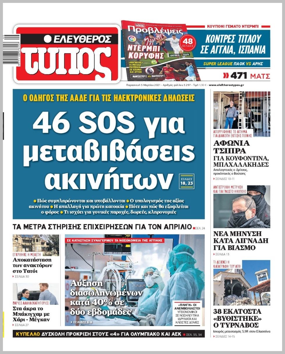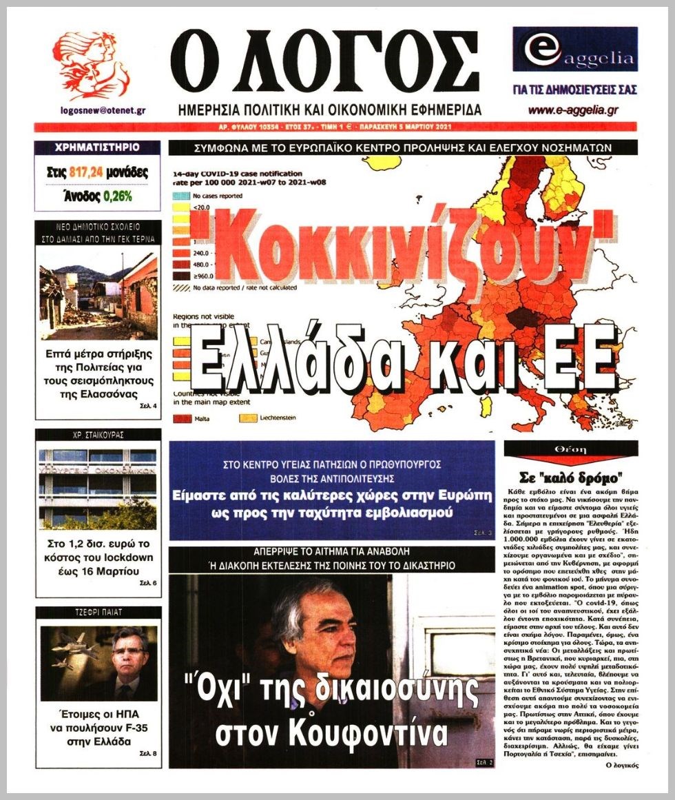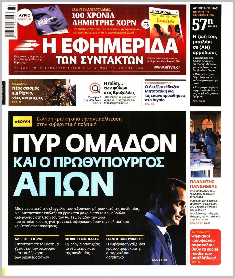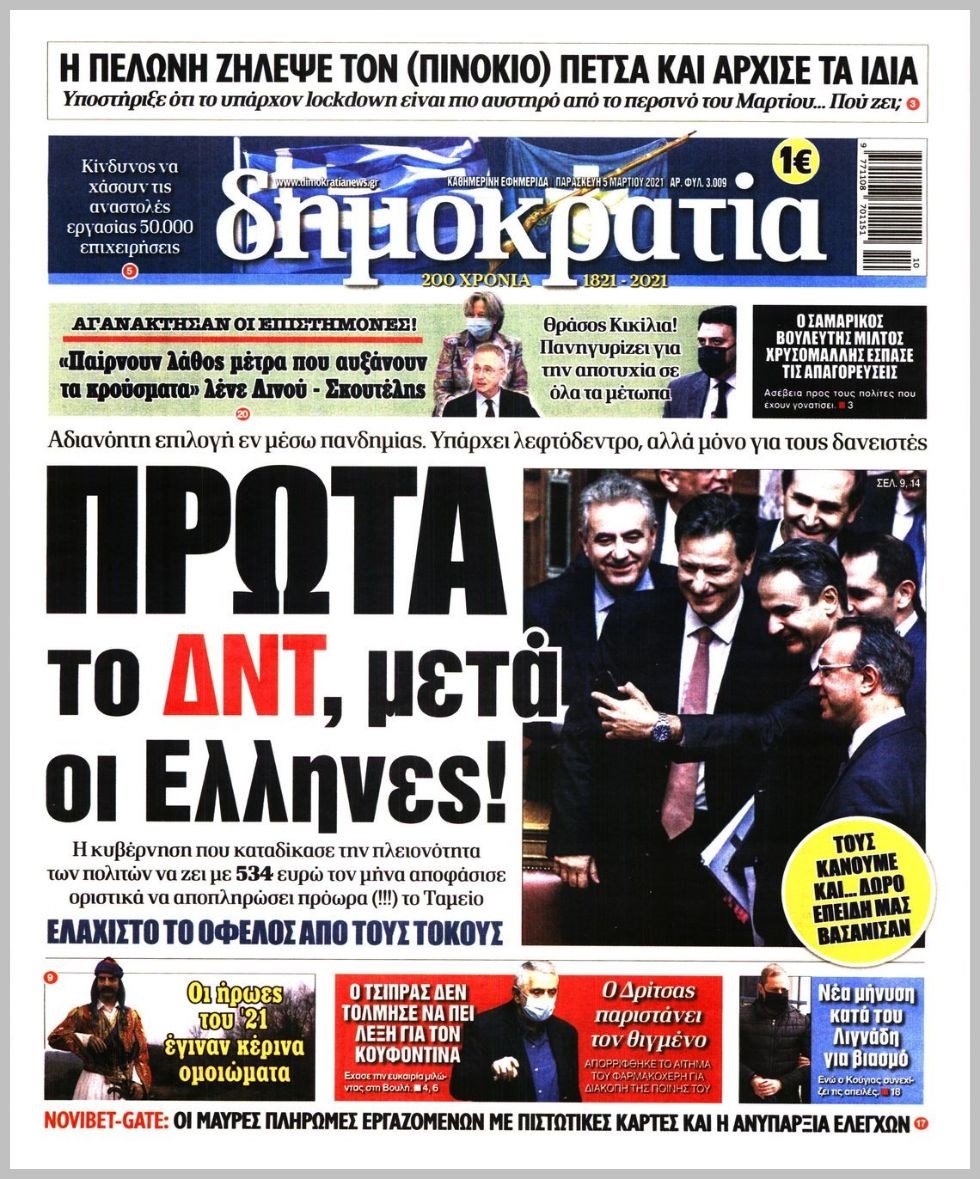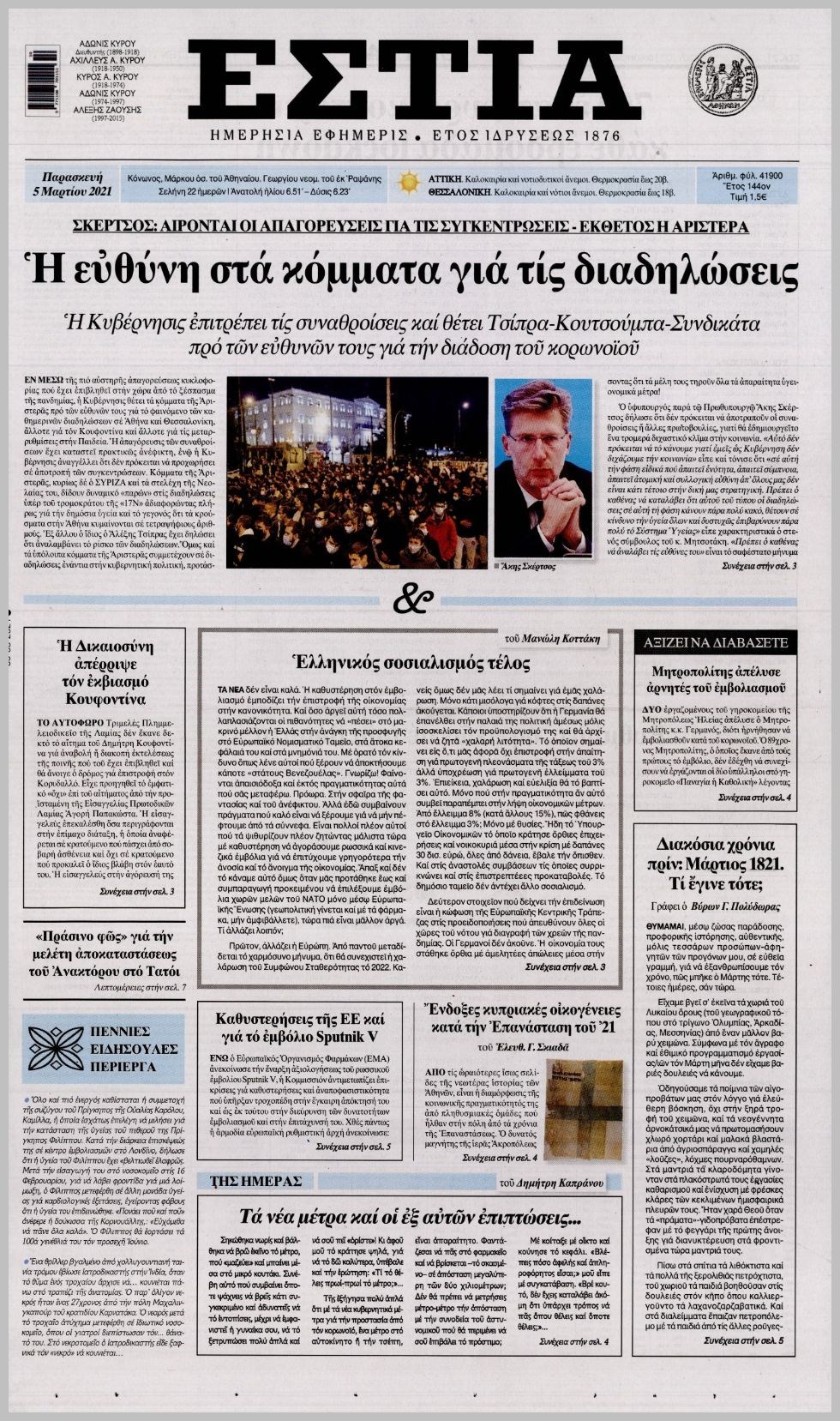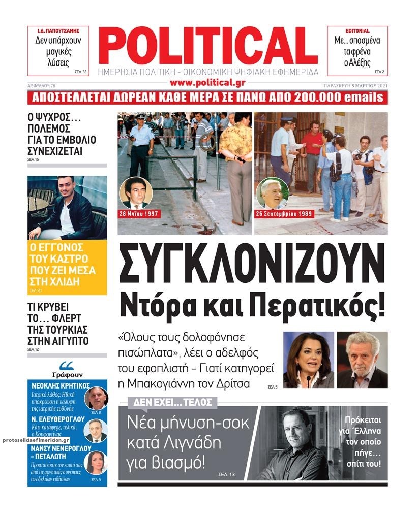 Οι πολιτικές εφημερίδες 5/3/2021 Διονύσης Νίκκας 06:11, Παρασκευή 05 Μαρτίου 2021 Media Διαβάστε τα πρωτοσέλιδα των πολιτικών εφημερίδων… ΕΦΗΜΕΡΙΔΕΣ ΠΡΩΤΟΣΕΛΙΔΑ Μοιράσου το: σχολίασε κι εσύ (0 σχόλια) Ακολουθήστε το enikos.gr στο Google News και μάθετε πρώτοι όλες τις ειδήσεις Δείτε όλες τις τελευταίες ειδήσεις από την Ελλάδα και τον Κόσμο στο enikos.gr Ειδήσεις Ροή Ειδήσεων 4 ώρες πριν Υπόθεση Έπσταϊν: Το Υπουργείο Δικαιοσύνης δημοσιοποίησε μια σειρά από εξαιρετικά επεξεργασμένα αρχεία – «Λείπουν τα πιο σημαντικά έγγραφα», λένε οι Δημοκρατικοί 46 λεπτά πριν Γιορτές με μπλόκα για τους αγρότες: Ανοίγουν διόδια και μοιράζουν προϊόντα στους ταξιδιώτες 1 ώρα πριν Εξαφάνιση 33χρονου γιατρού στην Κρήτη: «Άναψα τα φώτα, τρόμαξε και άρχισε να τρέχει στα χωράφια» – Η τελευταία διαδρομή και η μαρτυρία «κλειδί» 3 ώρες πριν Ο «χάρτης» με τις αυξήσεις και τις φοροελαφρύνσεις του 2026 – Ποιοι και πόσα κερδίζουν 1 ώρα πριν Τα αρχεία του Έπσταϊν αποκαλύπτουν φωτογραφία του έκπτωτου πρίγκιπα Άντριου – Είναι ξαπλωμένος στην αγκαλιά 5 γυναικών 1 ώρα πριν Μία νέα «χρυσή» περίοδος αρχίζει για 3 ζώδια από σήμερα – «Μία αναπάντεχη ευκαιρία οδηγεί στην επιτυχία» 5 ώρες πριν Αυγά: Πόσα μπορείτε να τρώτε την ημέρα με ασφάλεια για μέγιστη πρόσληψη πρωτεΐνης 3 ώρες πριν Αρχαιολόγοι ανακάλυψαν σε χωράφι απεικόνιση 600 ετών ενός Αγίου – Τα στοιχεία που δείχνουν ότι μαρτύρησε 2 ώρες πριν Αγχώνεται για το χριστουγεννιάτικο δώρο που πήρε στην πλούσια σύντροφό του – «Φοβάμαι πως θα το βρει φθηνιάρικο, φοράει βραχιόλια Cartier» 4 λεπτά πριν Τα Labubu «μετακομίζουν» στο Χόλιγουντ: Η Sony Pictures ετοιμάζει live-action ταινία με τον σκηνοθέτη του «Wonka» 11 λεπτά πριν Νέες ταυτότητες: Μεγάλη αναμονή για ραντεβού στην Αττική – Τέλος τα ταξίδια εκτός Ελλάδος από τον Αύγουστο για όσους δεν έχουν αλλάξει 20 λεπτά πριν Οι 7 φράσεις που δεν λένε ποτέ οι συναισθηματικά έξυπνοι άνθρωποι κατά τη διάρκεια ενός καβγά 23 λεπτά πριν Τηλεθέαση (19/12): Ανατροπές και πρωτιές στην πρωινή ζώνη 31 λεπτά πριν Πώς η κλιματική αλλαγή επηρεάζει εγκύους και βρέφη – Οι επιπτώσεις των υψηλών θερμοκρασιών ENIKOS NETWORK Είστε μόνιμα απρόσεκτοι; 3 σημάδια που δείχνουν ότι μπορεί να είναι σύμπτωμα πάθησης Πόσα κιλά παίρνουμε πραγματικά τα Χριστούγεννα, σύμφωνα με την επιστήμη – Πώς να το αποτρέψουμε; e-ΕΦΚΑ και ΔΥΠΑ: Έρχονται νέες πληρωμές έως τις 24 Δεκεμβρίου – Ποιοι πάνε ταμείο Επίδομα παιδιού: Τι αλλάζει από το 2026 – Το όφελος από τις φορολογικές ελαφρύνσεις Χαρτογραφώντας το «σημείο χωρίς επιστροφή»: Για πρώτη φορά αποκαλύπτεται με λεπτομέρεια το ακανθώδες όριο της ατμόσφαιρας τ... Η Google καταργεί τη λειτουργία «dark web report» – Πώς θα μπορούν οι χρήστες να διαγράφουν τα δεδομένα τους περισσότερα 09:30 , Σάββατο 20 Δεκεμβρίου 2025 «Porto Leone: Στη γειτονιά με τα κόκκινα φανάρια» – Ο Χρόνης αποκαλύπτει στην Αλεξάνδρα το μυστικό για το παιδί της Λένας Η μεγάλη δραματική σειρά του Apha «Porto Leone: Στη γειτονιά με τα κόκκινα φανάρια» μας μεταφέ... 08:14 , Σάββατο 20 Δεκεμβρίου 2025 Τρομεροί γονείς: Η Μαρία Καβογιάννη εισβάλλει στο σπίτι της οικογένειας Στεφανίδη Όσα θα δούμε στο νέο διπλό επεισόδιο της σειράς «Τρομεροί γονείς», σήμερα Σάββατο 20 Δεκεμβρίο... 05:48 , Σάββατο 20 Δεκεμβρίου 2025 Οι οικονομικές εφημερίδες 20/12/2025 Διαβάστε τα πρωτοσέλιδα από τις οικονομικές εφημερίδες, σήμερα 20/12/2025. 05:43 , Σάββατο 20 Δεκεμβρίου 2025 Οι αθλητικές εφημερίδες 20/12/2025 Διαβάστε τα πρωτοσέλιδα από τις αθλητ