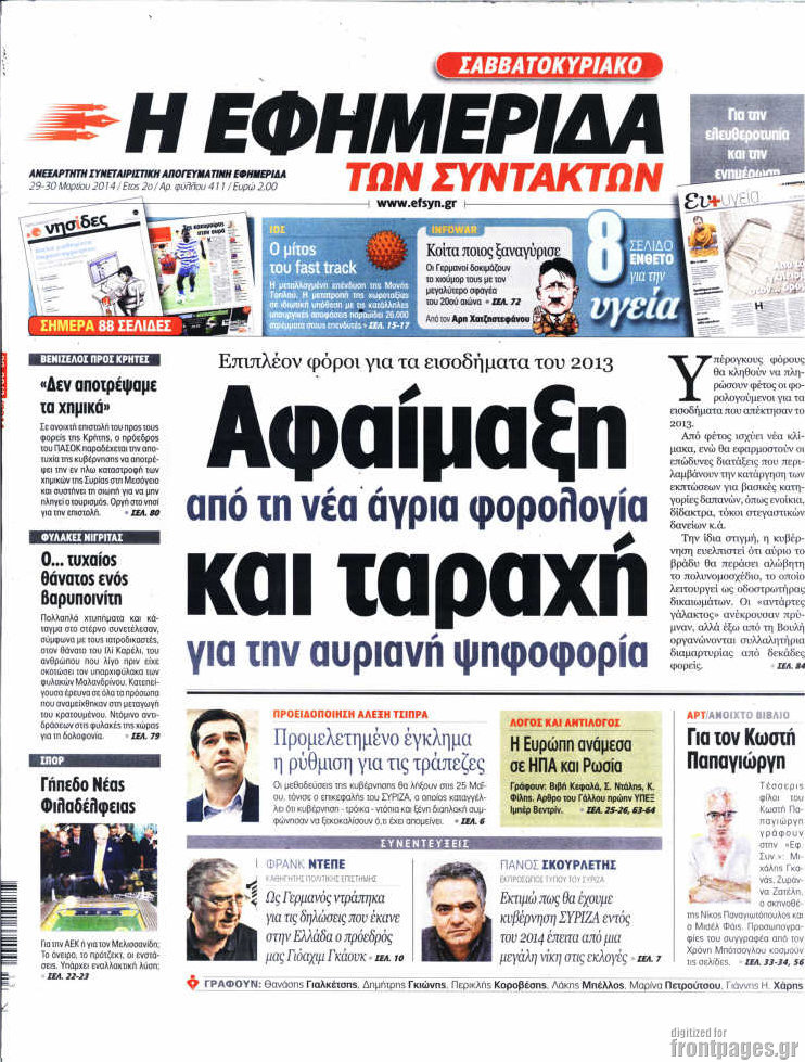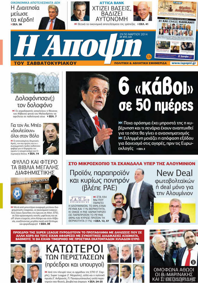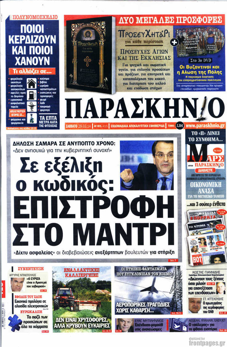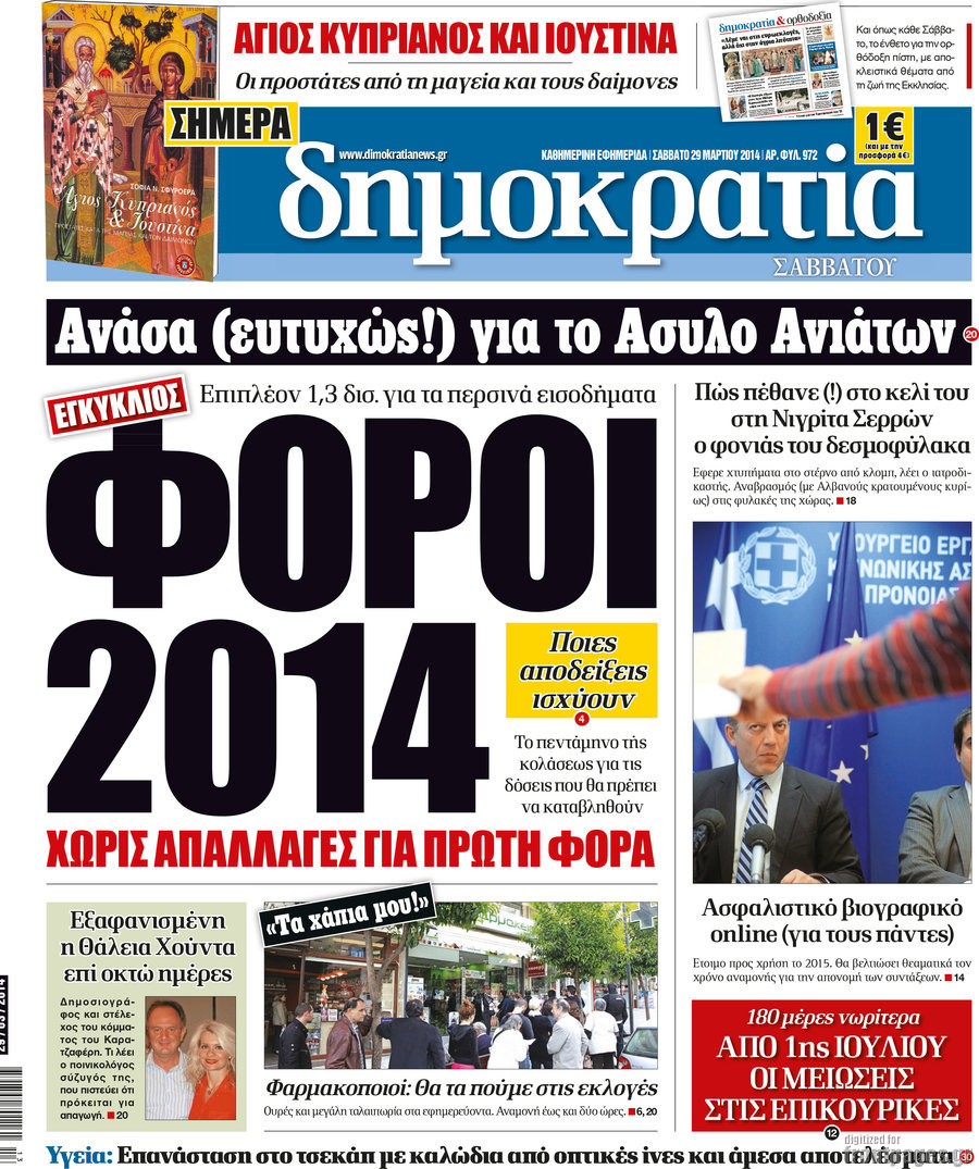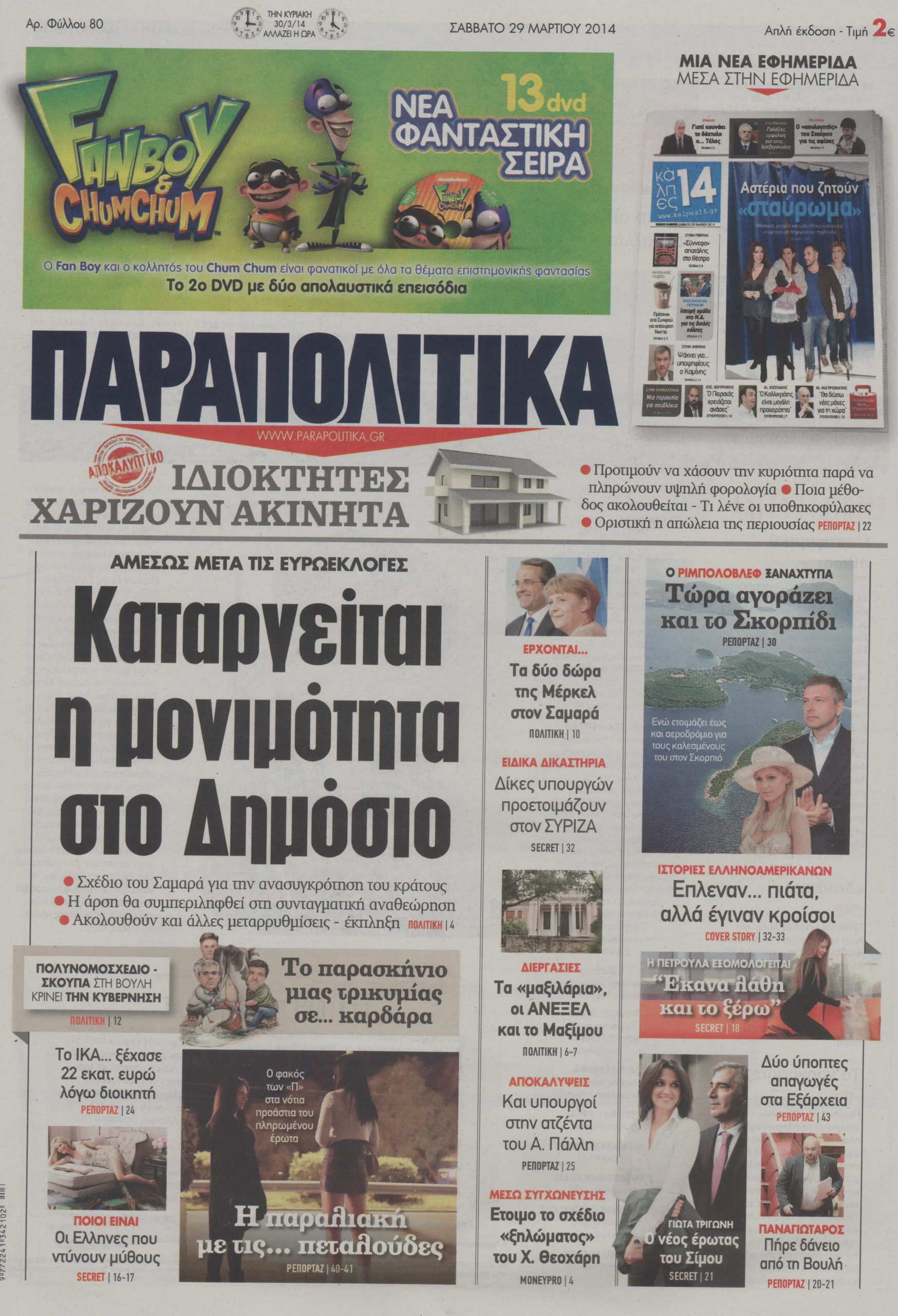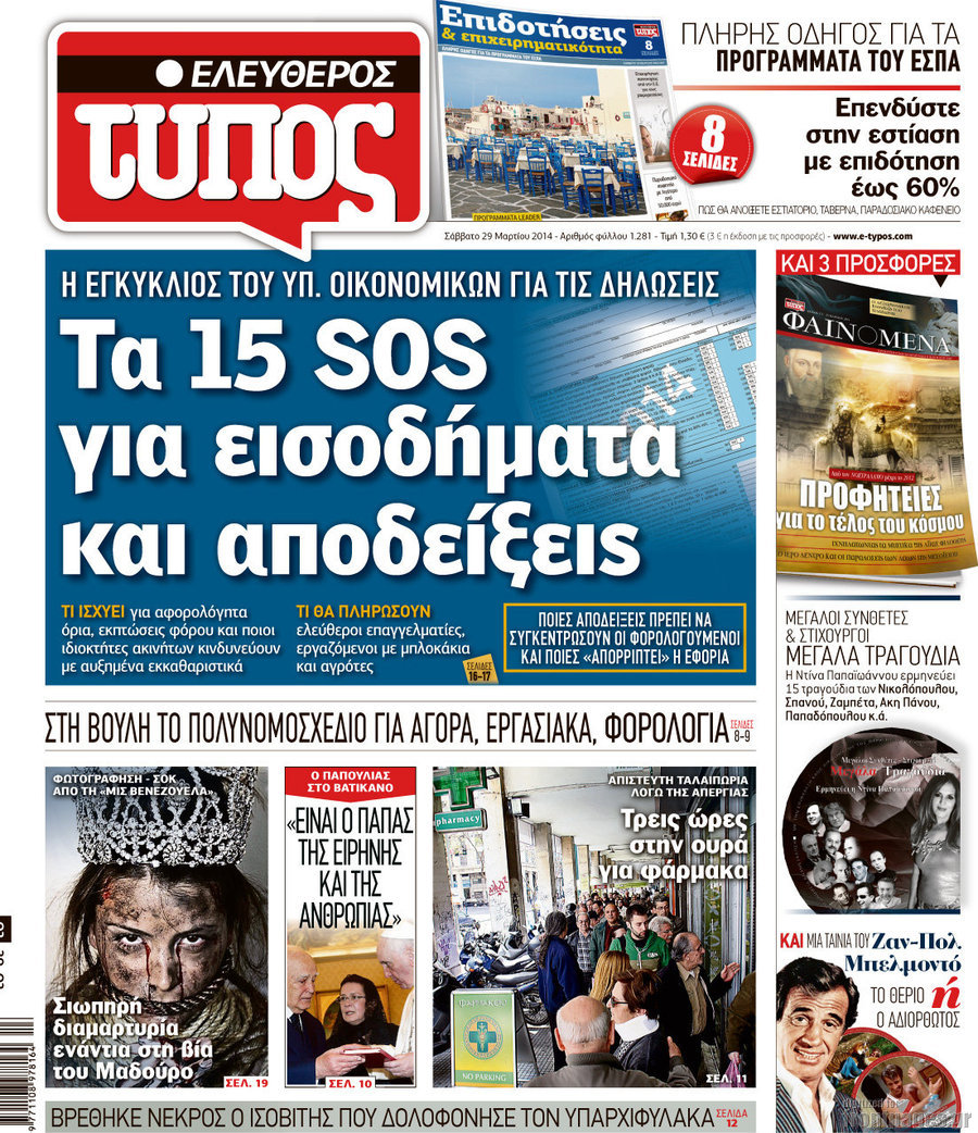 Οι πολιτικές εφημερίδες Enikos Newsroom 07:26, Σάββατο 29 Μαρτίου 2014 Media Οι πολιτικές εφημερίδες ΕΦΗΜΕΡΙΔΕΣ ΠΟΛΙΤΙΚΕΣ ΕΦΗΜΕΡΙΔΕΣ Μοιράσου το: σχολίασε κι εσύ (0 σχόλια) Ακολουθήστε το enikos.gr στο Google News και μάθετε πρώτοι όλες τις ειδήσεις Δείτε όλες τις τελευταίες ειδήσεις από την Ελλάδα και τον Κόσμο στο enikos.gr Ειδήσεις Ροή Ειδήσεων 3 ώρες πριν Υπόθεση Έπσταϊν: Το Υπουργείο Δικαιοσύνης δημοσιοποίησε μια σειρά από εξαιρετικά επεξεργασμένα αρχεία – «Λείπουν τα πιο σημαντικά έγγραφα», λένε οι Δημοκρατικοί 27 λεπτά πριν Γιορτές με μπλόκα για τους αγρότες: Ανοίγουν διόδια και μοιράζουν προϊόντα στους ταξιδιώτες 59 λεπτά πριν Εξαφάνιση 33χρονου γιατρού στην Κρήτη: «Άναψα τα φώτα, τρόμαξε και άρχισε να τρέχει στα χωράφια» – Η τελευταία διαδρομή και η μαρτυρία «κλειδί» 2 ώρες πριν Ο «χάρτης» με τις αυξήσεις και τις φοροελαφρύνσεις του 2026 – Ποιοι και πόσα κερδίζουν 43 λεπτά πριν Τα αρχεία του Έπσταϊν αποκαλύπτουν φωτογραφία του έκπτωτου πρίγκιπα Άντριου – Είναι ξαπλωμένος στην αγκαλιά 5 γυναικών 50 λεπτά πριν Μία νέα «χρυσή» περίοδος αρχίζει για 3 ζώδια από σήμερα – «Μία αναπάντεχη ευκαιρία οδηγεί στην επιτυχία» 5 ώρες πριν Αυγά: Πόσα μπορείτε να τρώτε την ημέρα με ασφάλεια για μέγιστη πρόσληψη πρωτεΐνης 3 ώρες πριν Αρχαιολόγοι ανακάλυψαν σε χωράφι απεικόνιση 600 ετών ενός Αγίου – Τα στοιχεία που δείχνουν ότι μαρτύρησε 2 ώρες πριν Αγχώνεται για το χριστουγεννιάτικο δώρο που πήρε στην πλούσια σύντροφό του – «Φοβάμαι πως θα το βρει φθηνιάρικο, φοράει βραχιόλια Cartier» 3 λεπτά πριν Τηλεθέαση (19/12): Ανατροπές και πρωτιές στην πρωινή ζώνη 11 λεπτά πριν Πώς η κλιματική αλλαγή επηρεάζει εγκύους και βρέφη – Οι επιπτώσεις των υψηλών θερμοκρασιών 19 λεπτά πριν e-ΕΦΚΑ και ΔΥΠΑ: Οι πληρωμές από 22 έως 24 Δεκεμβρίου – Ποιοι θα δουν χρήματα στους λογαριασμούς τους 27 λεπτά πριν Συνελήφθη οδηγός μηχανής που έτρεχε με 161 χλμ στη Συγγρού – Τον έπιασε το ραντάρ της Τροχαίας 27 λεπτά πριν Γιορτές με μπλόκα για τους αγρότες: Ανοίγουν διόδια και μοιράζουν προϊόντα στους ταξιδιώτες ENIKOS NETWORK Είστε μόνιμα απρόσεκτοι; 3 σημάδια που δείχνουν ότι μπορεί να είναι σύμπτωμα πάθησης Πόσα κιλά παίρνουμε πραγματικά τα Χριστούγεννα, σύμφωνα με την επιστήμη – Πώς να το αποτρέψουμε; Επίδομα παιδιού: Τι αλλάζει από το 2026 – Το όφελος από τις φορολογικές ελαφρύνσεις Mega χριστουγεννιάτικη φορολοταρία: «Κλείδωσε» η ημερομηνία για την κλήρωση – Ερωτήσεις και απαντήσεις Χαρτογραφώντας το «σημείο χωρίς επιστροφή»: Για πρώτη φορά αποκαλύπτεται με λεπτομέρεια το ακανθώδες όριο της ατμόσφαιρας τ... Η Google καταργεί τη λειτουργία «dark web report» – Πώς θα μπορούν οι χρήστες να διαγράφουν τα δεδομένα τους περισσότερα 09:30 , Σάββατο 20 Δεκεμβρίου 2025 «Porto Leone: Στη γειτονιά με τα κόκκινα φανάρια» – Ο Χρόνης αποκαλύπτει στην Αλεξάνδρα το μυστικό για το παιδί της Λένας Η μεγάλη δραματική σειρά του Apha «Porto Leone: Στη γειτονιά με τα κόκκινα φανάρια» μας μεταφέ... 08:14 , Σάββατο 20 Δεκεμβρίου 2025 Τρομεροί γονείς: Η Μαρία Καβογιάννη εισβάλλει στο σπίτι της οικογένειας Στεφανίδη Όσα θα δούμε στο νέο διπλό επεισόδιο της σειράς «Τρομεροί γονείς», σήμερα Σάββατο 20 Δεκεμβρίο... 05:48 , Σάββατο 20 Δεκεμβρίου 2025 Οι οικονομικές εφημερίδες 20/12/2025 Διαβάστε τα πρωτοσέλιδα από τις οικονομικές εφημερίδες, σήμερα 20/12/2025. 05:43 , Σάββατο 20 Δεκεμβρίου 2025 Οι αθλητικές εφημερίδες 20/12/2025 Διαβάστε τα πρωτοσέλιδα από τις αθλητικές εφημερίδες, σήμερα 20/12/2025. ΤΕΛΕΥΤΑΙΕΣ 