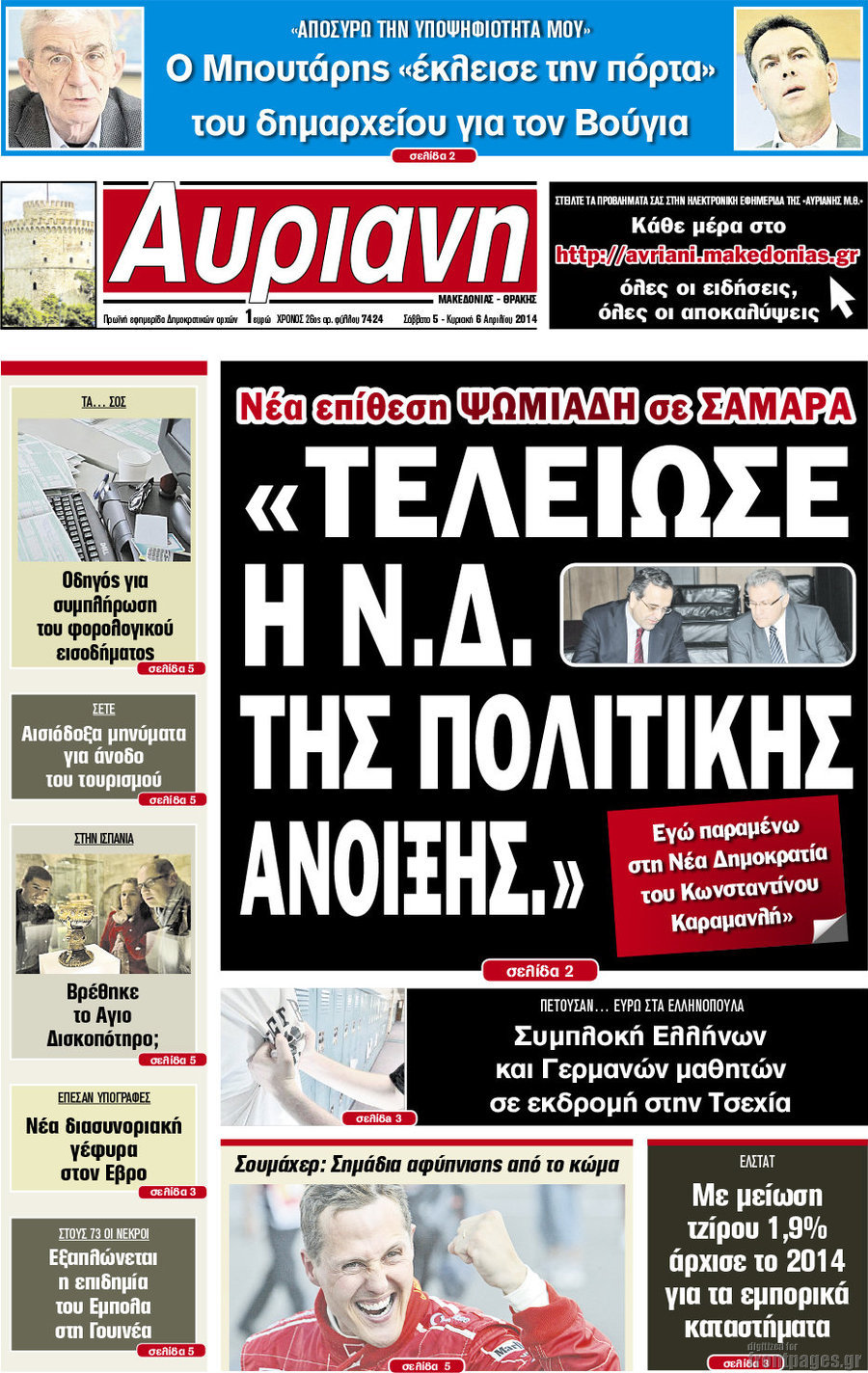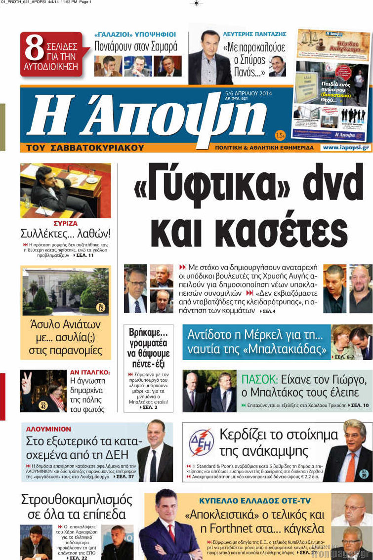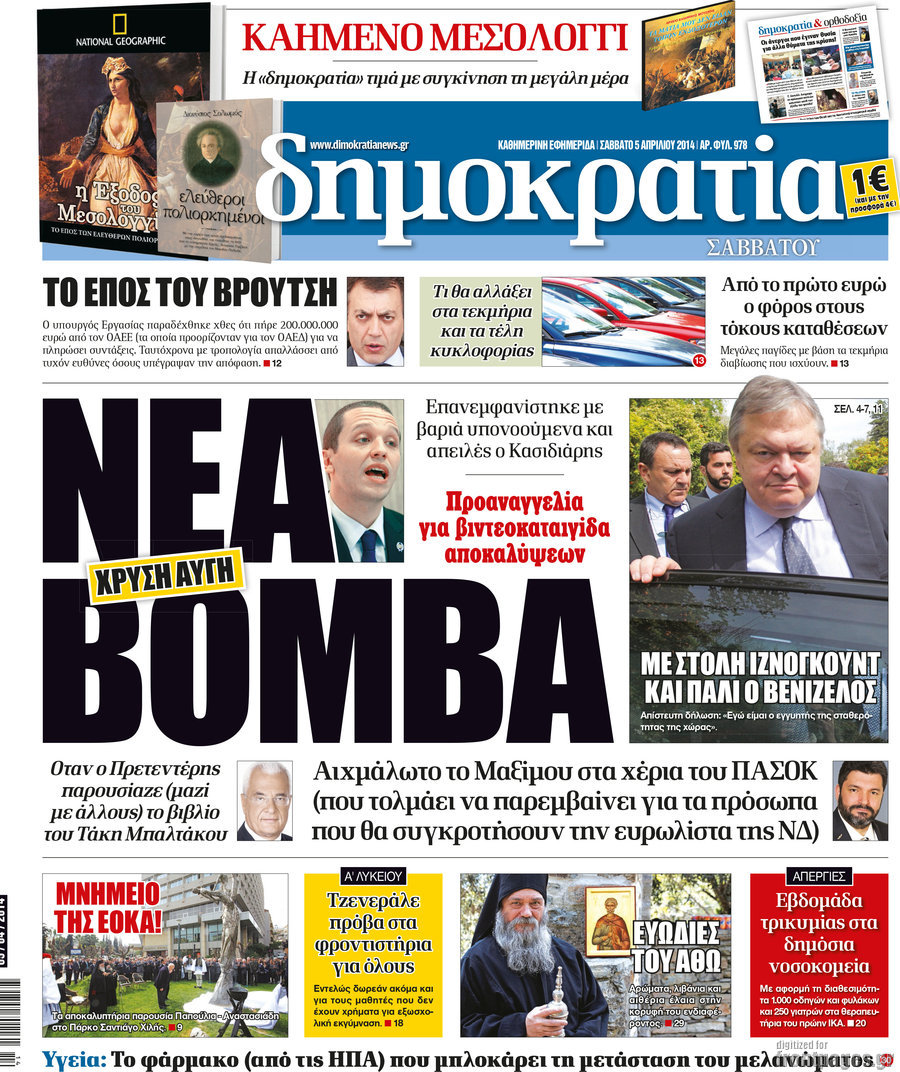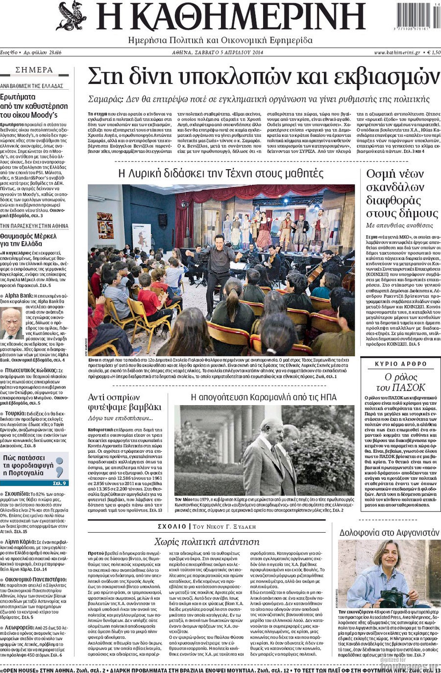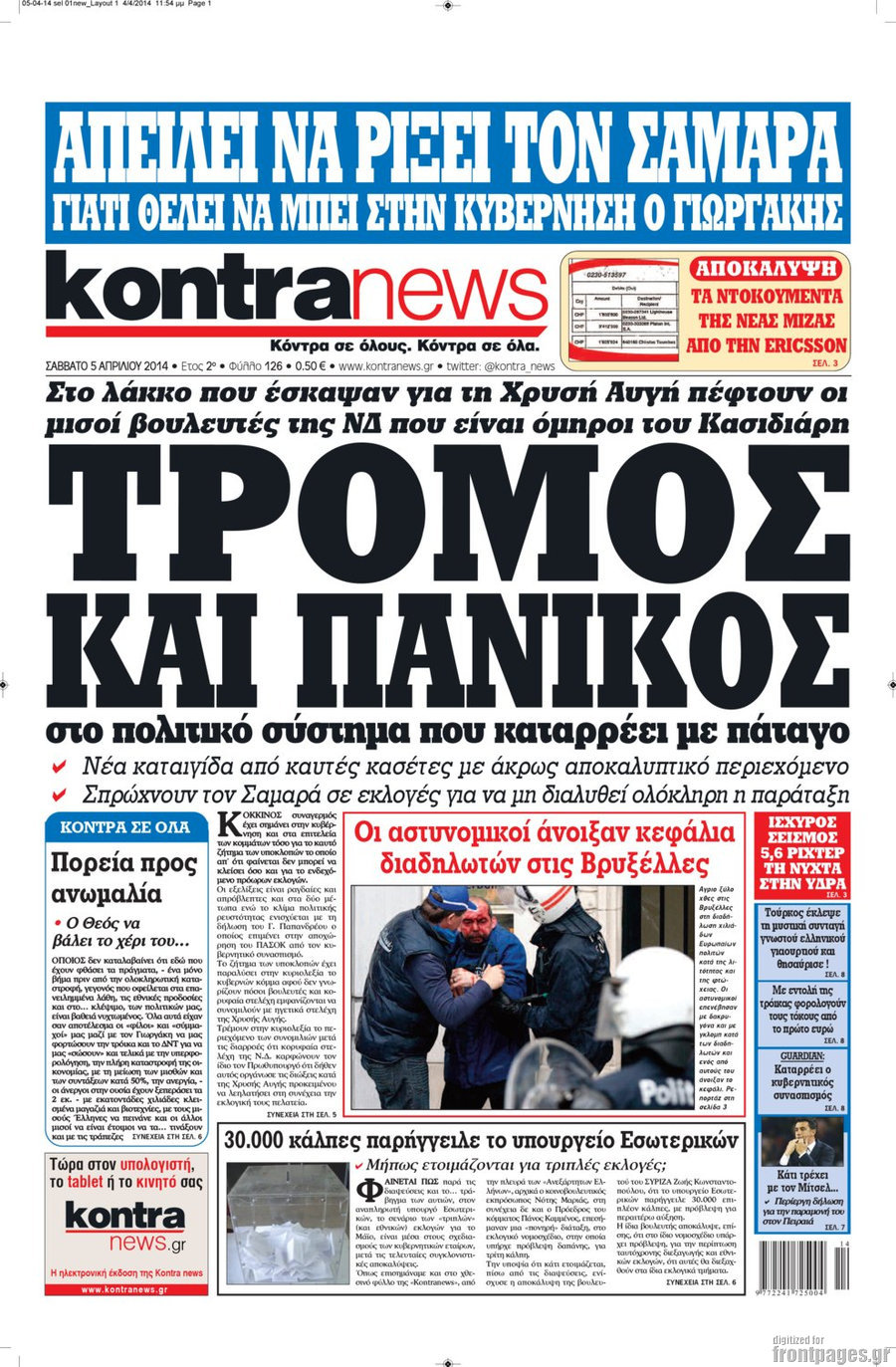 Οι πολιτικές εφημερίδες Enikos Newsroom 08:51, Σάββατο 05 Απριλίου 2014 Media Οι πολιτικές εφημερίδες Διαβάστε τα πρωτοσέλιδα των πολιτικών εφημερίδων: ΠΟΛΙΤΙΚΕΣ ΕΦΗΜΕΡΙΔΕΣ ΠΡΩΤΟΣΕΛΙΔΑ Μοιράσου το: σχολίασε κι εσύ (0 σχόλια) Ακολουθήστε το enikos.gr στο Google News και μάθετε πρώτοι όλες τις ειδήσεις Δείτε όλες τις τελευταίες ειδήσεις από την Ελλάδα και τον Κόσμο στο enikos.gr Ειδήσεις Ροή Ειδήσεων 2 ώρες πριν Συνεχίζουν τις κινητοποιήσεις οι αγρότες: Κλείνουν τις σήραγγες των Τεμπών για τα φορτηγά – Τι θα γίνει τα Χριστούγεννα 3 ώρες πριν Νέες εστίες ακρίβειας «ροκανίζουν» τα εισοδήματα – Πού καταγράφονται οι μεγαλύτερες αυξήσεις 43 λεπτά πριν Νέες δηλώσεις του αγροτοσυνδικαλιστή Ανεστίδη: Όσα λέγονται είναι λάσπη στον ανεμιστήρα για να σπάσουν τα μπλόκα 2 ώρες πριν «Έπιασαν δουλειά» οι 8 κάμερες που λειτουργούν πιλοτικά – Περισσότερες από 1.000 παραβάσεις σε 4 ημέρες 2 ώρες πριν Ουκρανία: Συνομιλίες στη Φλόριντα με υποσημειώσεις και βαθιές διαφωνίες – Το δύσκολο παζλ των διαπραγματεύσεων και το χάσμα Ουάσιγκτον – Μόσχας 4 ώρες πριν Άνοια και εγκεφαλικό: Γιατρός προειδοποιεί για ένα δημοφιλές ρόφημα που αυξάνει τον κίνδυνο κατά 290% και 300% αντίστοιχα 1 ώρα πριν Ο άνδρας της απαιτεί να κάνει όλες τις δουλειές του σπιτιού από τότε που παραιτήθηκε – «Εξακολουθώ να συνδράμω οικονομικά στο σπίτι» 2 ώρες πριν Ανακαλύφθηκε βραχογράφημα που παραπέμπει στον Ηρακλή και την Ύδρα από ελληνικά νομίσματα του 325 π.Χ. 2 ημέρες πριν Enerwave: Το νέο «ρεύμα» στη λιανική ενέργειας που αλλάζει την εμπειρία του καταναλωτή 4 λεπτά πριν Τα 4 ζώδια που παίρνουν επιτέλους την αναγνώριση που τους αξίζει – «Απρόσμενες ευκαιρίες, που μοιάζουν με δώρα από το σύμπαν» 9 λεπτά πριν Αγρότες: Παραμένουν στα τελωνεία Εξοχής, Προμαχώνα, Νίκης και Ευζώνων – Ποιες ώρες θα είναι ανοιχτά για αυτοκίνητα και τουριστικά λεωφορεία 14 λεπτά πριν Καιρός: Δύο κύματα με καταιγίδες και χιόνια στα βουνά τα Χριστούγεννα – Η πρόγνωση για την Πρωτοχρονιά 19 λεπτά πριν Ο χριστουγεννιάτικος τηλεμαραθώνιος αλληλεγγύης του ANT1 για τα παιδιά 24 λεπτά πριν Μόσχα: Σκοτώθηκε Ρώσος στρατηγός έπειτα από έκρηξη μηχανισμού στο αυτοκίνητό του ENIKOS NETWORK Χοληστερίνη: Το σημάδι στο δέρμα που μπορεί να δείχνει ότι είναι υπερβολικά υψηλή Ποιο γλυκό φρούτο ρυθμίζει το σάκχαρο και μπορούν να φάνε οι διαβητικοί, σύμφωνα με μελέτη Νέες εστίες ακρίβειας «ροκανίζουν» τα εισοδήματα – Πού καταγράφονται οι μεγαλύτερες αυξήσεις Νέο έτος ρεκόρ για τον ελληνικό τουρισμό το 2025: «Είμαστε μέσα στους 10 πλέον επισκέψιμους προορισμούς παγκοσμίως» λέει η ... Χαρτογραφώντας το «σημείο χωρίς επιστροφή»: Για πρώτη φορά αποκαλύπτεται με λεπτομέρεια το ακανθώδες όριο της ατμόσφαιρας τ... Η Google καταργεί τη λειτουργία «dark web report» – Πώς θα μπορούν οι χρήστες να διαγράφουν τα δεδομένα τους περισσότερα 09:45 , Δευτέρα 22 Δεκεμβρίου 2025 Ο χριστουγεννιάτικος τηλεμαραθώνιος αλληλεγγύης του ANT1 για τα παιδιά Ο ANT1 διοργανώνει Χριστουγεννιάτικο Τηλεμαραθώνιο για τα Παιδιά την 22η Δεκεμβρίου 2025, με σ... 09:30 , Δευτέρα 22 Δεκεμβρίου 2025 Eurovision 2026: Φαβορί η Μπέττυ Μαγγίρα Στην τελική ευθεία μπαίνει ο σχεδιασμός της ΕΡΤ για τους δύο ημιτελικούς και τον εθνικό τελικό... 07:02 , Δευτέρα 22 Δεκεμβρίου 2025 Αυτή την Κυριακή με τη Realnews: Το μυστήριο των Χριστουγέννων της Vicki Delany – Μαζί αστυνομικά μυθιστορήματα Αυτή την Κυριακή με τη Realnews: Το μυστήριο των Χριστουγέννων της Vicki Delany – Μαζί α... 05:48 , Δευ