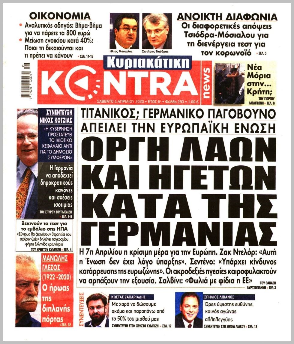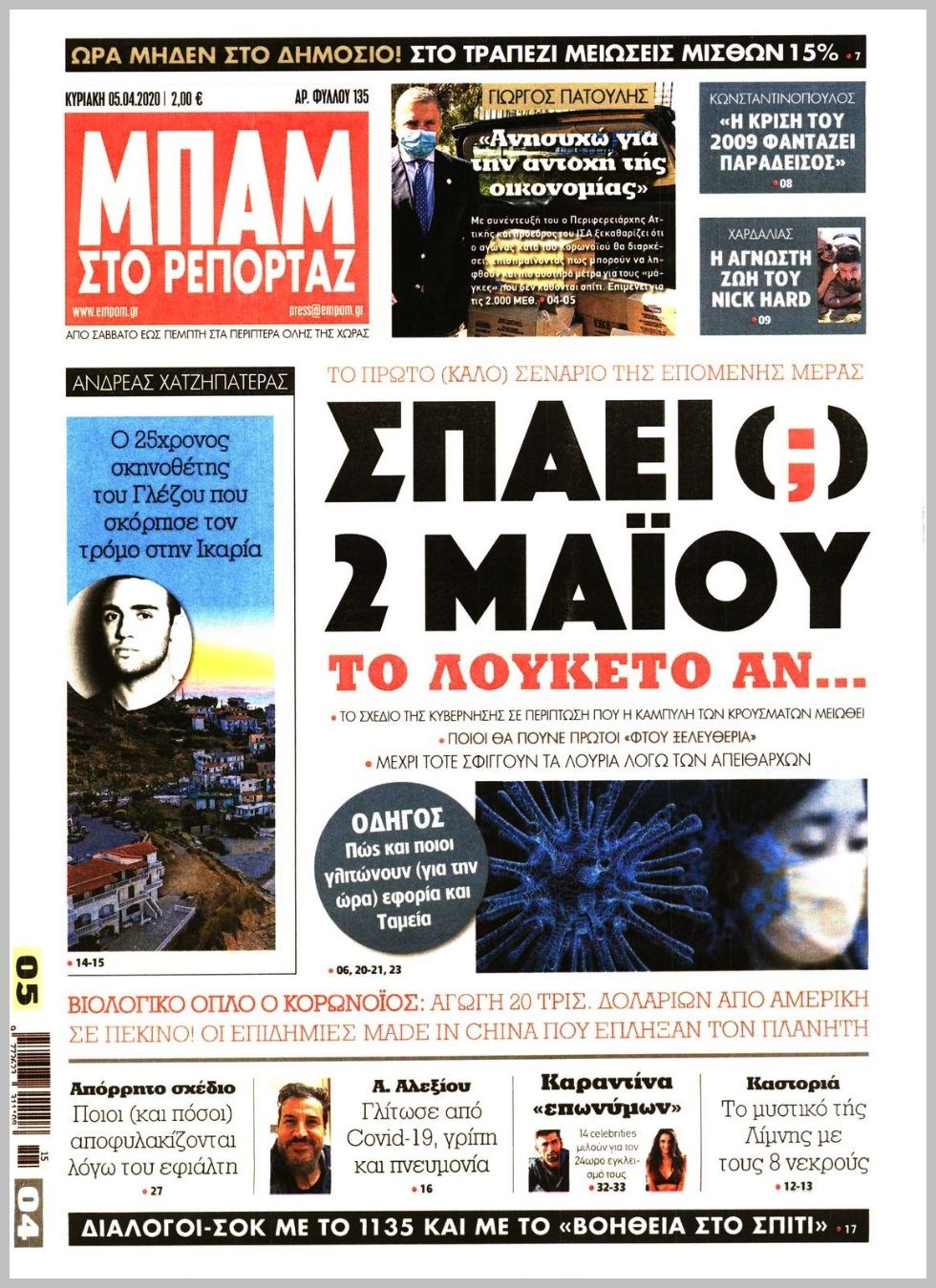 Οι πολιτικές εφημερίδες 5/4/2020 Διονύσης Νίκκας 07:30, Κυριακή 05 Απριλίου 2020 Media Διαβάστε τα πρωτοσέλιδα των πολιτικών εφημερίδων… ΠΟΛΙΤΙΚΕΣ ΕΦΗΜΕΡΙΔΕΣ ΠΡΩΤΟΣΕΛΙΔΑ Μοιράσου το: σχολίασε κι εσύ (0 σχόλια) Ακολουθήστε το enikos.gr στο Google News και μάθετε πρώτοι όλες τις ειδήσεις Δείτε όλες τις τελευταίες ειδήσεις από την Ελλάδα και τον Κόσμο στο enikos.gr Ειδήσεις Ροή Ειδήσεων 9 λεπτά πριν Υπόθεση Έπσταϊν: Το Υπουργείο Δικαιοσύνης δημοσιοποίησε μια σειρά από εξαιρετικά επεξεργασμένα αρχεία – «Λείπουν τα πιο σημαντικά έγγραφα», λένε οι Δημοκρατικοί 2 ώρες πριν Σαρωτικοί οι έλεγχοι στους δρόμους ενόψει εορτών – Μπλόκα της τροχαίας σε κεντρικές αρτηρίες της Αττικής 19 λεπτά πριν ΟΝΕΧ – MEGATUGS: Ξεκίνησε η ναυπήγηση ρυμουλκών στην Ελλάδα – Προθάλαμος πολεμικών πλοίων – Δείτε φωτογραφίες και βίντεο 9 ώρες πριν Χριστούγεννα στα μπλόκα: Επιμένουν στις κινητοποιήσεις τους οι αγρότες – Ανοίγουν τα διόδια το Σαββατοκύριακο 9 ώρες πριν Πούτιν: Τα μηνύματα σε Ευρώπη και ΝΑΤΟ από το μαραθώνιο «σόου» του – Η απαίτηση για «σεβασμό» και η ειρήνη «με τους όρους» της Μόσχας 2 ώρες πριν Αυγά: Πόσα μπορείτε να τρώτε την ημέρα με ασφάλεια για μέγιστη πρόσληψη πρωτεΐνης 2 ώρες πριν Τα ζώδια σήμερα, Σάββατο 20 Δεκεμβρίου: Παρθένοι, το σύμπαν σας δίνει το κλειδί 9 ώρες πριν Ανακαλύφθηκαν αρχαία χρυσά νομίσματα 2.200 ετών που απεικονίζουν τον θεό Απόλλωνα – Η άγνωστη σύνδεση με τον Φίλιππο Β΄ της Μακεδονίας 2 ώρες πριν Οπτική ψευδαίσθηση: Μόνο αν είσαι ο Σέρλοκ Χολμς θα βρεις τον αριθμό «87» σε 7 δευτερόλεπτα 3 λεπτά πριν ΗΠΑ: Τέσσερις μετανάστες πέθαναν σε κέντρα κράτησης – Αύξηση θανάτων σε επίπεδο ρεκόρ το 2025 9 λεπτά πριν Υπόθεση Έπσταϊν: Το Υπουργείο Δικαιοσύνης δημοσιοποίησε μια σειρά από εξαιρετικά επεξεργασμένα αρχεία – «Λείπουν τα πιο σημαντικά έγγραφα», λένε οι Δημοκρατικοί 11 λεπτά πριν Καιρός: Αλλαγή σκηνικού σήμερα με βροχές και πτώση της θερμοκρασίας – Οι προβλέψεις των μετεωρολόγων για τα Χριστούγεννα 19 λεπτά πριν ΟΝΕΧ – MEGATUGS: Ξεκίνησε η ναυπήγηση ρυμουλκών στην Ελλάδα – Προθάλαμος πολεμικών πλοίων – Δείτε φωτογραφίες και βίντεο 28 λεπτά πριν Φοινικούντα: Σήμερα απολογείται ο 30χρονος γιος γνωστού επιχειρηματία της Πλάκας ENIKOS NETWORK Το τεστ των 10 δευτερολέπτων που μπορεί να προβλέψει το προσδόκιμο ζωής σας – Τι λέει ειδικός του Cleveland Επιλέξτε καρέκλα για να μάθετε ποια είναι τα κρυφά χαρακτηριστικά σας – Τι αποκάλυψε για εσάς αυτό το τεστ προσωπικότητας; Αναστολή μέτρων αναγκαστικής εκτέλεσης για κτηνοτρόφους που πλήττονται από την ευλογιά των αιγοπροβάτων Πλήρης επάρκεια προϊόντων στις λαϊκές της Αττικής, παρά τις αγροτικές κινητοποιήσεις – Τι απαντούν οι πωλητές Χαρτογραφώντας το «σημείο χωρίς επιστροφή»: Για πρώτη φορά αποκαλύπτεται με λεπτομέρεια το ακανθώδες όριο της ατμόσφαιρας τ... Η Google καταργεί τη λειτουργία «dark web report» – Πώς θα μπορούν οι χρήστες να διαγράφουν τα δεδομένα τους περισσότερα 05:48 , Σάββατο 20 Δεκεμβρίου 2025 Οι οικονομικές εφημερίδες 20/12/2025 Διαβάστε τα πρωτοσέλιδα από τις οικονομικές εφημερίδες, σήμερα 20/12/2025. 05:43 , Σάββατο 20 Δεκεμβρίου 2025 Οι αθλητικές εφημερίδες 20/12/2025 Διαβάστε τα πρωτοσέλιδα από τις αθλητικές εφημερίδες, σήμερα 20/12/2025. 05:38 , Σάββατο 20 Δεκεμβρίου 2025 Οι πολιτικές εφημερίδες 20/12/2025 Διαβάστε τα πρωτοσέλιδα από τις πολιτικές εφημερίδες, σήμερα 20/12/2025. 04:20 , Σάββατο 20 Δεκεμβρίου 2025 Αγγελική Νικολούλη: Τα συλλυπητήρια για την απώλεια