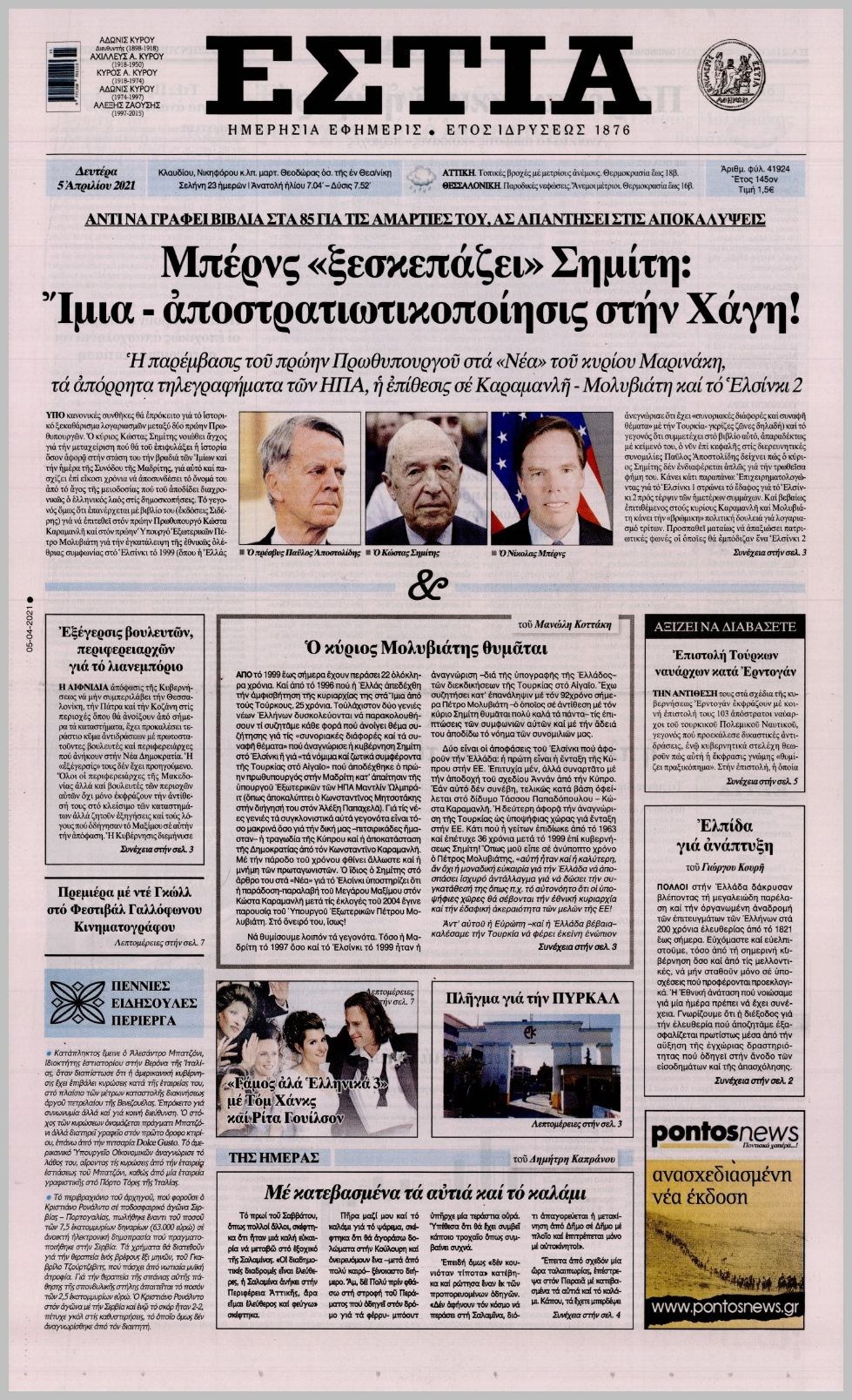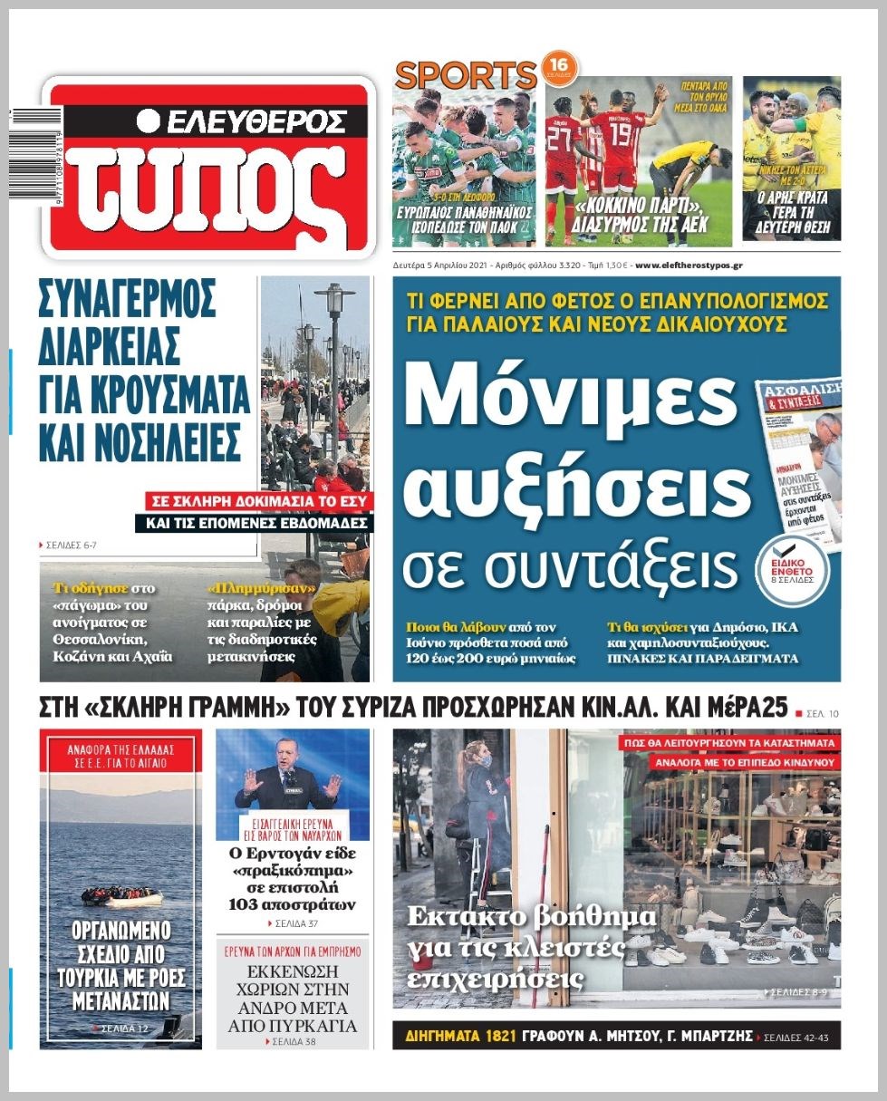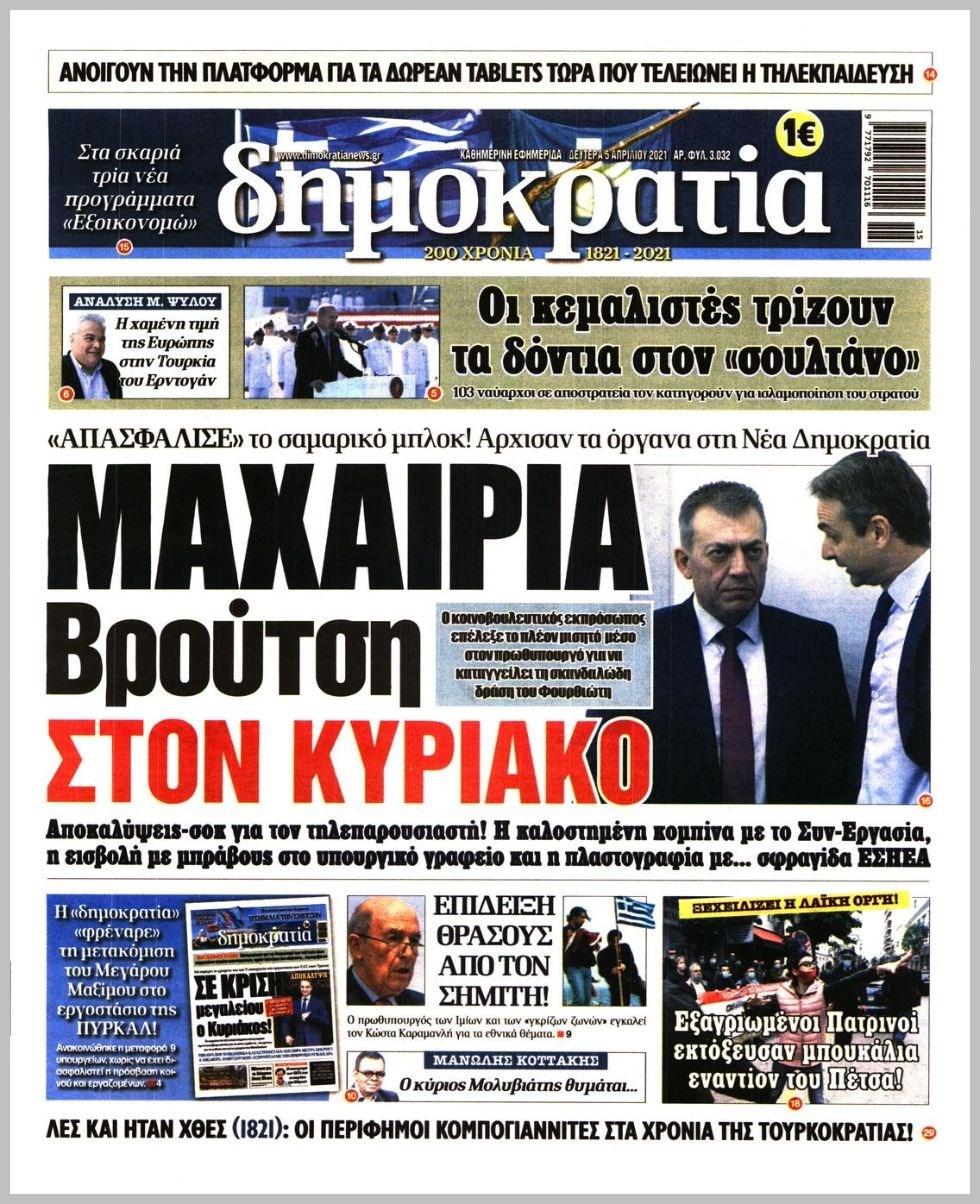 Οι πολιτικές εφημερίδες 5/4/2021 Διονύσης Νίκκας 06:14, Δευτέρα 05 Απριλίου 2021 Media Διαβάστε τα πρωτοσέλιδα των πολιτικών εφημερίδων… ΕΦΗΜΕΡΙΔΕΣ ΠΡΩΤΟΣΕΛΙΔΑ Μοιράσου το: σχολίασε κι εσύ (0 σχόλια) Ακολουθήστε το enikos.gr στο Google News και μάθετε πρώτοι όλες τις ειδήσεις Δείτε όλες τις τελευταίες ειδήσεις από την Ελλάδα και τον Κόσμο στο enikos.gr Ειδήσεις Ροή Ειδήσεων 8 ώρες πριν Χριστούγεννα στα μπλόκα οι αγρότες: Άνοιξαν στα διόδια και μοίρασαν προϊόντα στους πολίτες – Νέα σύσκεψη την Κυριακή στη Νίκαια 29 λεπτά πριν Εορταστικό ωράριο: Ανοιχτά σήμερα τα καταστήματα – Οι ώρες λειτουργίας 7 ώρες πριν Ρετζέπ Ταγίπ Ερντογάν: Δεν έχουμε καμία βλέψη στα εδάφη ή την κυριαρχία κανενός – Δεν θα επιτρέψουμε να παραβιαστούν τα δικαιώματά μας 7 ώρες πριν H ακτοφυλακή των ΗΠΑ κατάσχεσε και δεύτερο τάνκερ στα ανοιχτά της Βενεζουέλας – Δείτε βίντεο 9 ώρες πριν Κύκλωμα διακίνησης ναρκωτικών σε σχολεία: Τηλεφωνούσαν στους ανηλίκους την ώρα του μαθήματος – Οι διάλογοι-σοκ, τα «ψευδώνυμα» και τα βασανιστήρια 53 λεπτά πριν Οπτική ψευδαίσθηση: Μόνο το 2% των ανθρώπων θα βρει την πεταλούδα σε 15 δευτερόλεπτα 1 ώρα πριν Μήλο vs μπανάνα: Ποιο φρούτο έχει περισσότερες φυτικές ίνες, σύμφωνα με διαιτολόγους – Τα οφέλη τους για την υγεία 2 ώρες πριν Τα ζώδια σήμερα, Κυριακή 21 Δεκεμβρίου: Αιγόκεροι, αποφασίζετε για το επόμενο κεφάλαιο της ζωής σας 22 ώρες πριν Enerwave: Το νέο «ρεύμα» στη λιανική ενέργειας που αλλάζει την εμπειρία του καταναλωτή 52 λεπτά πριν Σήμερα με τη Realnews: Ό,τι και αν αγοράσεις, σκανάρεις και κερδίζεις! 2 λεπτά πριν Εορτολόγιο: Ποιοι γιορτάζουν σήμερα 21 Δεκεμβρίου 8 λεπτά πριν Σήμερα με τη Realnews: Instyle, μαζί Drive και Realnews Geopolitics 13 λεπτά πριν Η Realnews στο www.pressreader.com 21 λεπτά πριν ΔΕΔΔΗΕ: Διακοπές ρεύματος σήμερα (21/12) στην Αθήνα και σε άλλες 5 περιοχές της Αττικής ENIKOS NETWORK Το αφροδισιακό φυλλώδες λαχανικό που μπορεί να προστατεύσει τα μάτια και να καταπολεμήσει τον καρκίνο Το απόλυτο κόλπο με το αυτοκόλλητο για να βγει πρώτη η βαλίτσα σας από το αεροπλάνο «Πολεμική» προετοιμασία από την ευρωπαϊκή βιομηχανία ενέργειας – Η Eurelectric ζητεί «ομπρέλα» προστασίας για τις υποδομές Ακύρωση ΑΦΜ για απάτες – Ποιους βάζει στο στόχαστρο η ΑΑΔΕ Χαρτογραφώντας το «σημείο χωρίς επιστροφή»: Για πρώτη φορά αποκαλύπτεται με λεπτομέρεια το ακανθώδες όριο της ατμόσφαιρας τ... Η Google καταργεί τη λειτουργία «dark web report» – Πώς θα μπορούν οι χρήστες να διαγράφουν τα δεδομένα τους περισσότερα 07:00 , Κυριακή 21 Δεκεμβρίου 2025 Σήμερα με τη Realnews: Instyle, μαζί Drive και Realnews Geopolitics Σήμερα με τη Realnews: Instyle, μαζί Drive και Realnews Geopolitics Instyle Η Άννα Ρεζάν, η Ch... 06:55 , Κυριακή 21 Δεκεμβρίου 2025 Η Realnews στο www.pressreader.com Διαβάστε την ψηφιακή έκδοση της εφημερίδας στην οθόνη του κινητού, του tablet και του υπολογισ... 05:46 , Κυριακή 21 Δεκεμβρίου 2025 Οι αθλητικές εφημερίδες 21/12/2025 Διαβάστε τα πρωτοσέλιδα από τις αθλητικές εφημερίδες, σήμερα 21/12/2025. 05:38 , Κυριακή 21 Δεκεμβρίου 2025 Οι πολιτικές εφημερίδες 21/12/2025 Διαβάστε τα πρωτοσέλιδα από τις πολιτικές εφημερίδες, σήμερα 21/12/2025. ΤΕΛΕΥΤΑΙΕΣ ΕΙΔΗΣΕΙΣ 2 λεπτά πριν Εορτολόγιο: Ποιοι γιορτάζουν σήμερα 21 Δεκεμβρίου 8 λεπτά πριν Σήμερα με τη Realnews: Instyle, μαζί Drive και Realnews Geopolitics 13 λεπτά πριν Η Realnews στο www.pressreader.com 21 λεπτά πριν ΔΕΔΔΗΕ: Διακοπές ρεύματος σήμερα (21/12) στην Αθήνα και... 29 λεπτά πριν Εορταστικό ωράριο: Ανοιχτά σήμερα τα καταστήματα –... 37 λεπτά πριν Κυκλοφοριακές ρυθμίσεις σήμερα στην Αθήνα λόγω του... 45 λεπτά πριν Β
