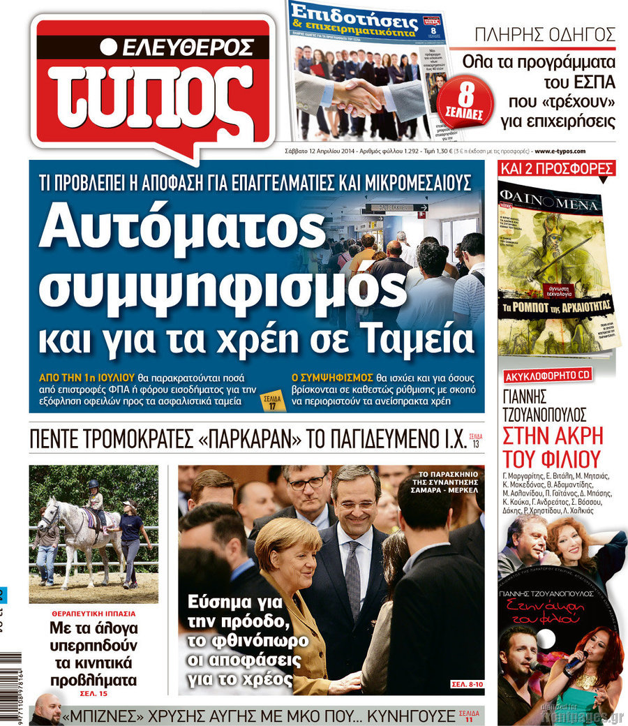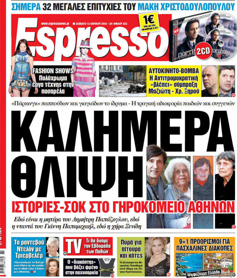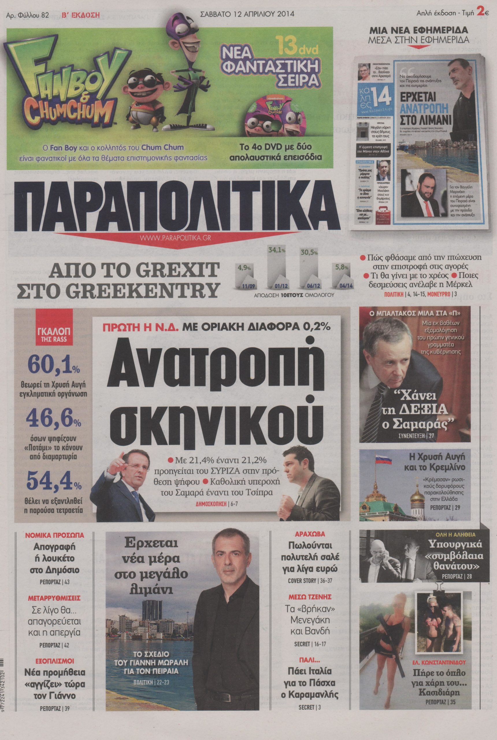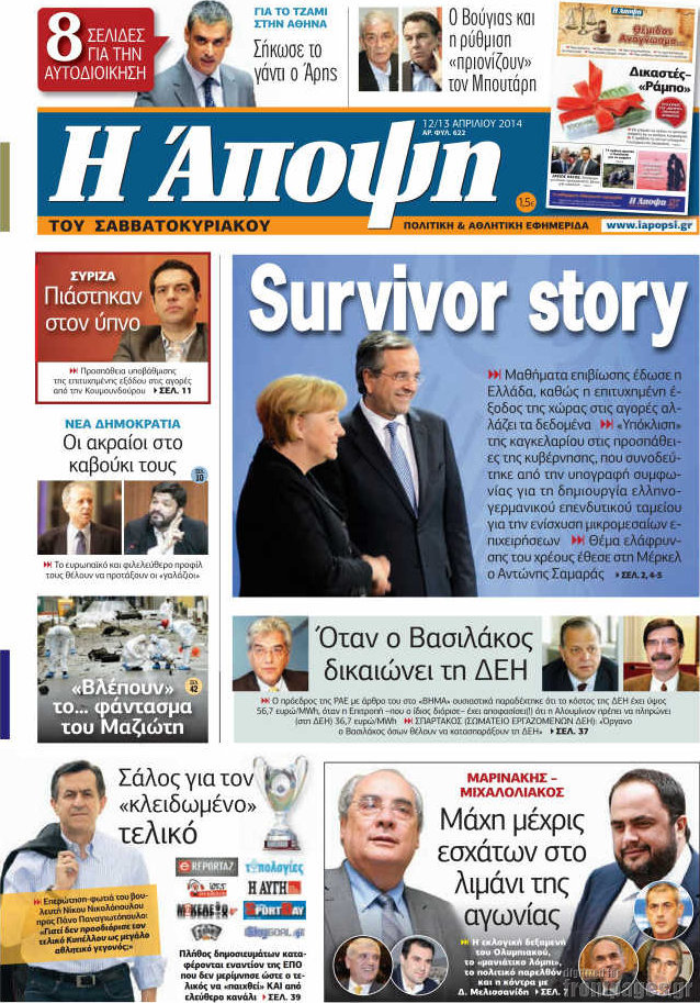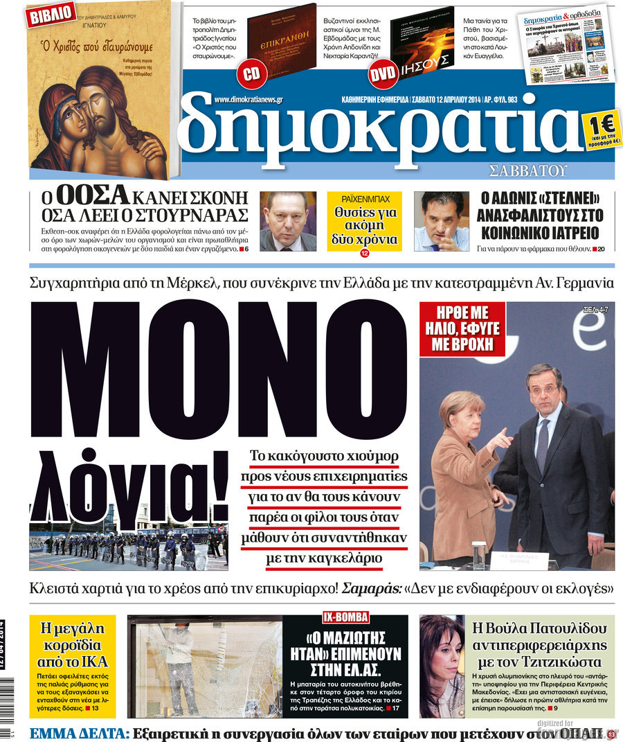 Οι πολιτικές εφημερίδες Enikos Newsroom 07:48, Σάββατο 12 Απριλίου 2014 Media Οι πολιτικές εφημερίδες ΕΦΗΜΕΡΙΔΕΣ ΠΟΛΙΤΙΚΕΣ ΕΦΗΜΕΡΙΔΕΣ Μοιράσου το: σχολίασε κι εσύ (0 σχόλια) Ακολουθήστε το enikos.gr στο Google News και μάθετε πρώτοι όλες τις ειδήσεις Δείτε όλες τις τελευταίες ειδήσεις από την Ελλάδα και τον Κόσμο στο enikos.gr Ειδήσεις Ροή Ειδήσεων 29 λεπτά πριν Μητσοτάκης σε αγρότες: Είμαστε ανοιχτοί στον διάλογο, αλλά όχι στο παράλογο – Η διεκδίκηση αιτημάτων οφείλει να γίνεται με σεβασμό στο κοινωνικό σύνολο 45 λεπτά πριν Γρίπη: «Καμπανάκι» από τους επιστήμονες για έξαρση κρουσμάτων στις γιορτές – Ποιοι κινδυνεύουν και πώς προστατευόμαστε 2 ώρες πριν Γαλλία: Έτοιμοι για Χριστούγεννα στους δρόμους οι αγρότες – «Οι δεσμεύσεις της κυβέρνησης δεν είναι αρκετές» 1 ώρα πριν Φοροδιαφυγή και «κενό ΦΠΑ»: Πώς τα ψηφιακά εργαλεία έφεραν δισεκατομμύρια στα ταμεία του Δημοσίου 3 ώρες πριν Τζορτζ Κλούνεϊ: Πέθανε η αδελφή του, Άντα Ζάιντλερ – «Η ηρωίδα μου» 39 λεπτά πριν Τα άστρα ευνοούν σκανδαλωδώς 4 ζώδια – «Εμφανίζονται ξαφνικά ευκαιρίες γιατί αποφασίζετε να αφήσετε πίσω το παρελθόν» 2 ώρες πριν Οι γονείς της θέλουν να έχουν πρόσβαση στον τραπεζικό της λογαριασμό – «Επιμένουν πως στις οικογένειες δεν υπάρχουν μυστικά» 2 ώρες πριν Αρχαιολόγοι ανακάλυψαν κάτι που δεν περίμεναν: Τα μαθηματικά υπήρχαν πριν από τους αριθμούς – Το μυστικό που κρύβεται πίσω από περίεργα αγγεία 8.000 ετών 1 ημέρα πριν Enerwave: Το νέο «ρεύμα» στη λιανική ενέργειας που αλλάζει την εμπειρία του καταναλωτή 5 λεπτά πριν Τηλεθέαση (20/12): Πρωτιά για το The Voice στην prime time – Τα ποσοστά στο δυναμικό και στο γενικό σύνολο 9 λεπτά πριν Συναγερμός στην Σκύρο – Ακυβέρνητο δεξαμενόπλοιο λόγω μπλακ άουτ 13 λεπτά πριν Σοκ στις Πινακάτες: Νεκρός ο πρόεδρος του χωριού Νίκος Παππάς – Κατέρρευσε μπροστά στη σύζυγο και τα παιδιά του 21 λεπτά πριν Πώς «ακούγονται» το Δέλτα του Αξιού και η λίμνη Ορεστιάδα; Οι πρώτες ηχογραφήσεις των επιστημόνων δείχνουν κάτι απρόσμενο 29 λεπτά πριν Μητσοτάκης σε αγρότες: Είμαστε ανοιχτοί στον διάλογο, αλλά όχι στο παράλογο – Η διεκδίκηση αιτημάτων οφείλει να γίνεται με σεβασμό στο κοινωνικό σύνολο ENIKOS NETWORK Έχετε καταρροή και φαγούρα στα μάτια στις γιορτές; Μπορεί να ευθύνεται το σύνδρομο χριστουγεννιάτικου δέντρου Η Danielle Fishel μετά τη διάγνωση καρκίνου του μαστού: «Είμαι καλά και νιώθω ευγνωμοσύνη» Ανοιχτά τα καταστήματα σήμερα – Μέχρι τι ώρα μπορείτε να κάνετε τις αγορές σας Πρωτοχρονιά 2026: Πόσο θα κοστίσει φέτος η βασιλόπιτα – Οι τιμές σε ζαχαροπλαστεία, φούρνους και σούπερ μάρκετ Χαρτογραφώντας το «σημείο χωρίς επιστροφή»: Για πρώτη φορά αποκαλύπτεται με λεπτομέρεια το ακανθώδες όριο της ατμόσφαιρας τ... Η Google καταργεί τη λειτουργία «dark web report» – Πώς θα μπορούν οι χρήστες να διαγράφουν τα δεδομένα τους περισσότερα 09:43 , Κυριακή 21 Δεκεμβρίου 2025 Το λάθος στην ταινία Die Hard που άφησε άναυδους τους θαυμαστές του Μπρους Γουίλις Ένας φανατικός των ταινιών άφησε άναυδους τους θαυμαστές του Die Hard, επισημαίνοντας τρία βασ... 08:13 , Κυριακή 21 Δεκεμβρίου 2025 Άγιος έρωτας: Ένας καταστροφικός σεισμός χτυπά τη Στέρνα Καταιγιστικές είναι οι εξελίξεις στα δυο τελευταία, συγκλονιστικά επεισόδια του 2025 της σειρά... 08:00 , Κυριακή 21 Δεκεμβρίου 2025 Σήμερα με τη Realnews: Ό,τι και αν αγοράσεις, σκανάρεις και κερδίζεις! Σήμερα με τη Realnews: Ό,τι και αν αγοράσεις, σκανάρεις και κερδίζεις! Με το PADU app, το κορυ... 07:00 , Κυριακή 21 Δεκεμ