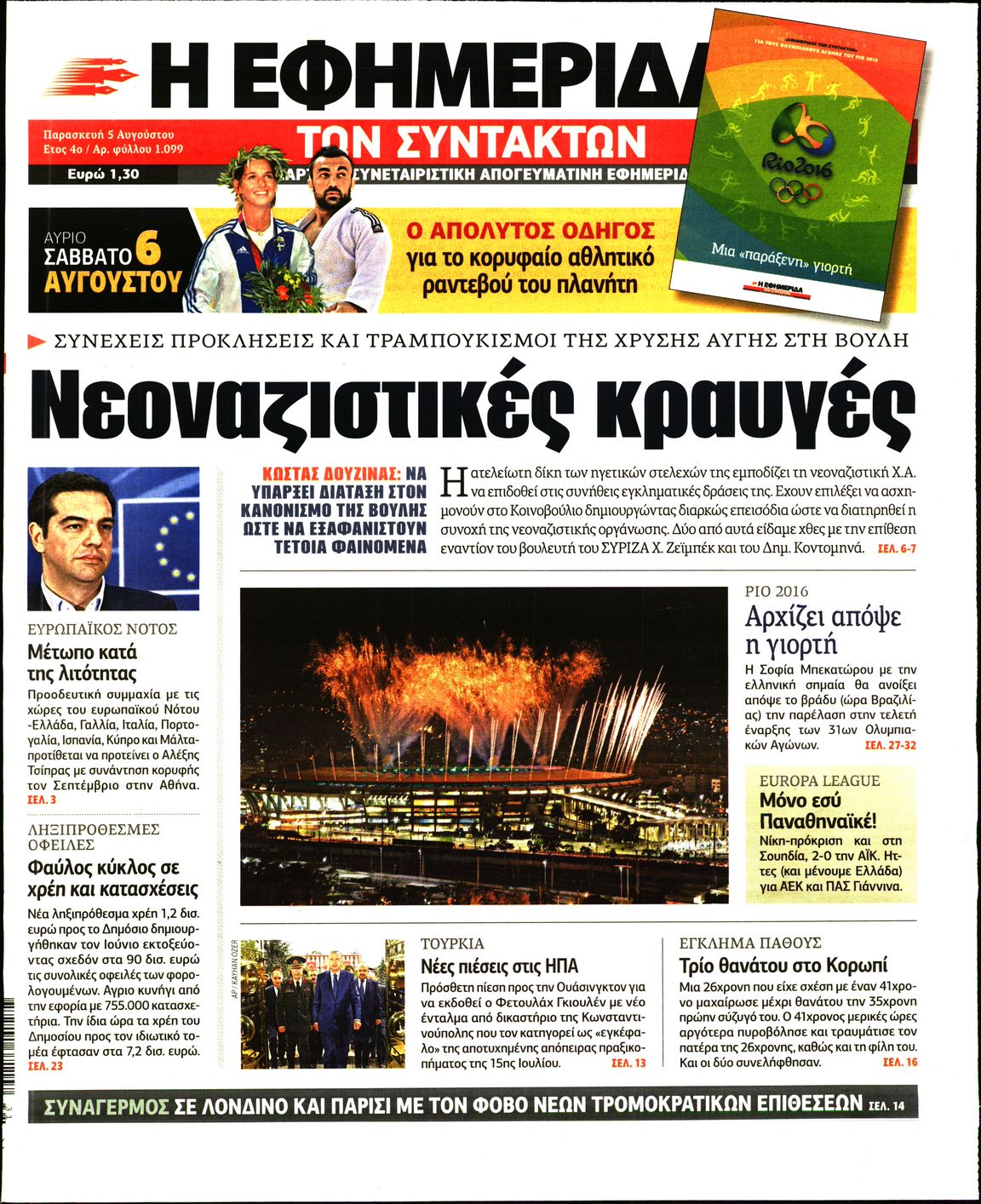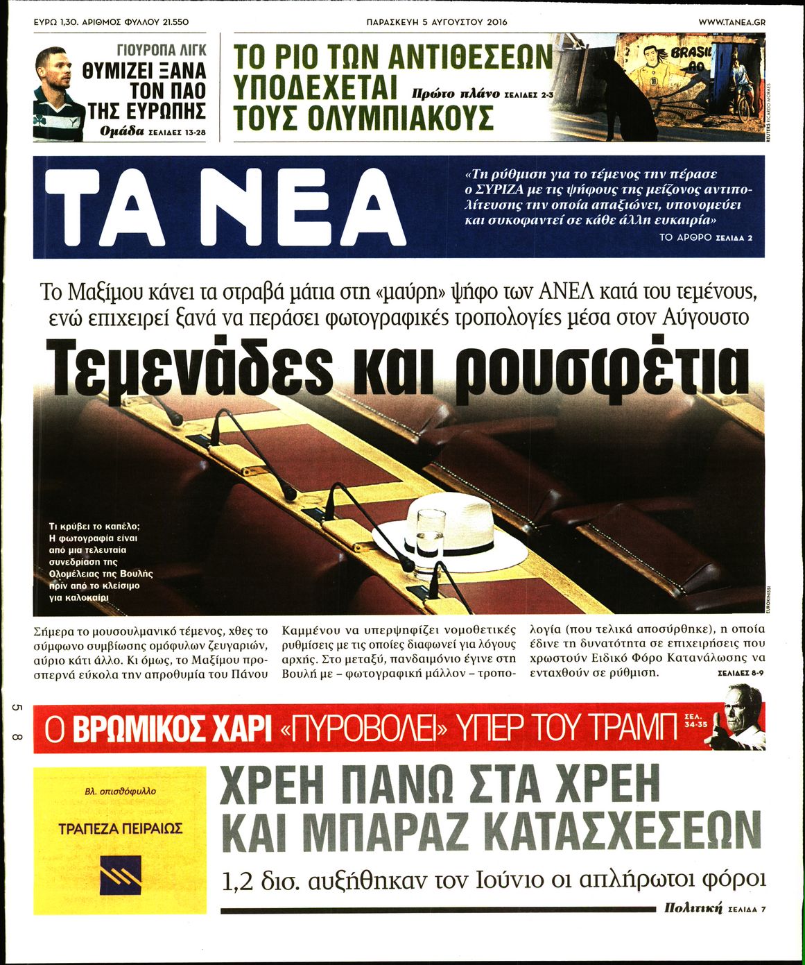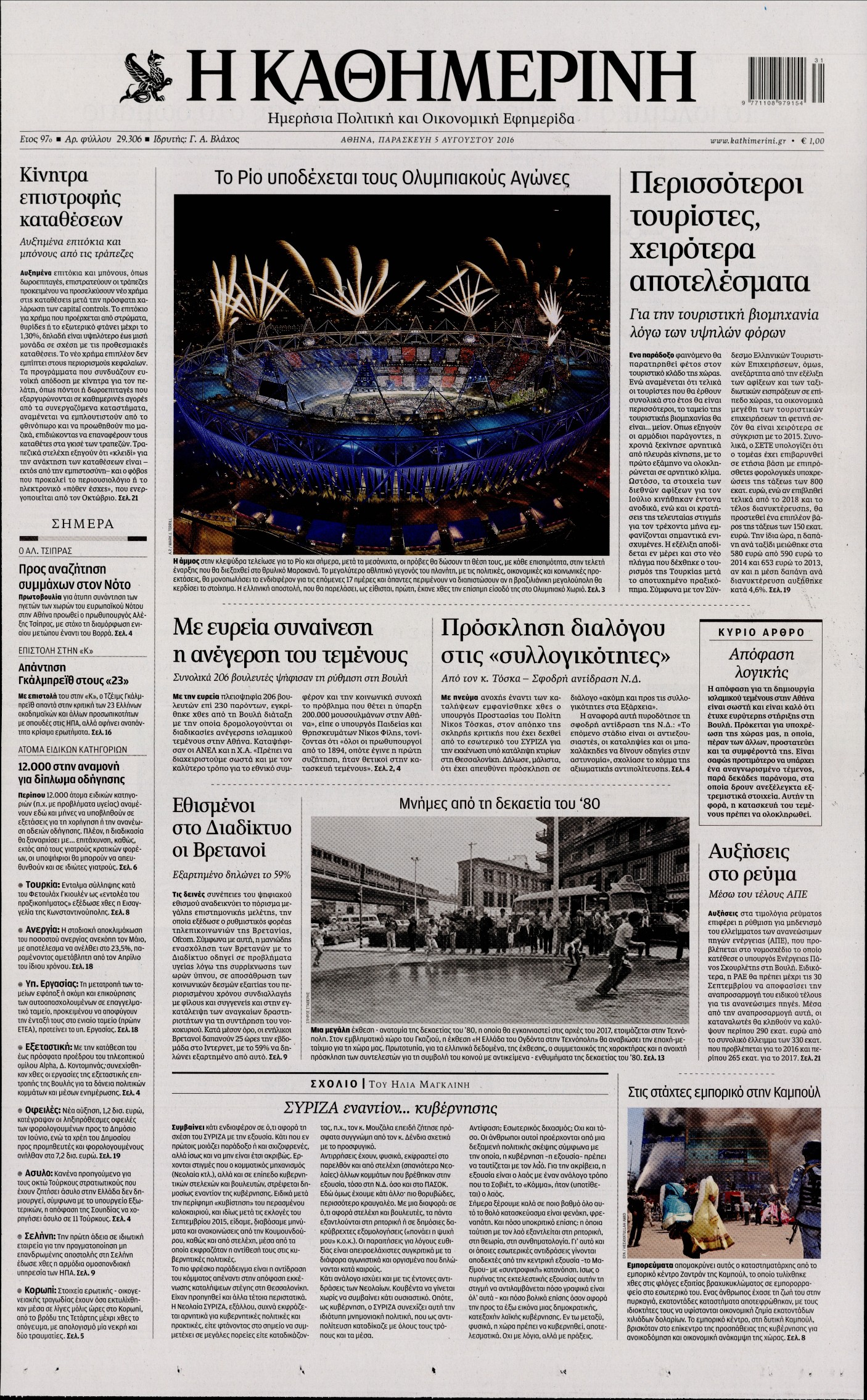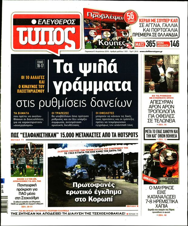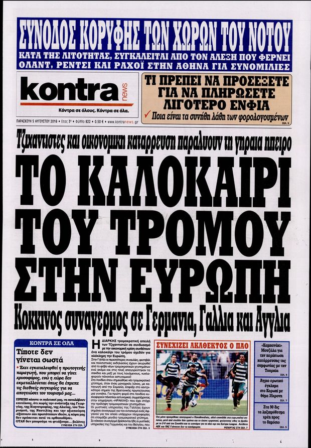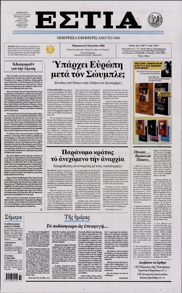 Οι πολιτικές εφημερίδες 5/8/2016 Enikos Newsroom 05:22, Παρασκευή 05 Αυγούστου 2016 Media Διαβάστε τα σημερινά πρωτοσέλιδα των πολιτικών εφημερίδων: ΠΟΛΙΤΙΚΕΣ ΕΦΗΜΕΡΙΔΕΣ ΠΡΩΤΟΣΕΛΙΔΑ Μοιράσου το: σχολίασε κι εσύ (0 σχόλια) Ακολουθήστε το enikos.gr στο Google News και μάθετε πρώτοι όλες τις ειδήσεις Δείτε όλες τις τελευταίες ειδήσεις από την Ελλάδα και τον Κόσμο στο enikos.gr Ειδήσεις Ροή Ειδήσεων 3 ώρες πριν Αυξάνουν την πίεση προς την κυβέρνηση οι αγρότες: Κλείνουν παρακαμπτήριους και ανοίγουν διόδια – Τι θα γίνει τις γιορτές 2 ώρες πριν ΟΠΕΚΕΠΕ: Προφυλακιστέος ο φερόμενος αρχηγός και ο λογιστής της εγκληματικής οργάνωσης 3 ώρες πριν Φοινικούντα: Το Σάββατο απολογείται ο 30χρονος γιος γνωστού επιχειρηματία της Πλάκας που παραδόθηκε – Όσα είπε στους αστυνομικούς και ο ρόλος του στο έγκλημα 3 ώρες πριν Μπορεί ο Μαδούρο να αντέξει τον αποκλεισμό του Τραμπ; Τι θα χρειαστεί η Ουάσινγκτον για να τον ανατρέψει 4 ώρες πριν Πρίγκιπας Ουίλιαμ – Κέιτ: Η νέα οικογενειακή φωτογραφία για τις Χριστουγεννιάτικες κάρτες του 2025 4 ώρες πριν Ύπνος: Η απλή βραδινή ρουτίνα για να προστατεύσετε τα μαλλιά σας από το κρύο κατά τη διάρκεια του χειμώνα 5 ώρες πριν Manifesting: Πώς να συναντήσετε τον σύντροφο της ζωής σας, ανάλογα με τον μήνα γέννησής σας 2 ημέρες πριν 20 χρόνια τα Χριστούγεννα ξεκινούν στα Public με μεγάλη ποικιλία σε δώρα! 3 ώρες πριν Αρχαιολόγοι ανακάλυψαν ρωμαϊκά τεχνουργήματα από μια πόλη που δεν υπήρξε ποτέ – Τα τρία εντυπωσιακά κτίρια και ο αμφορέας με τις… σαρδέλες 15 λεπτά πριν Μάρκο Νίκολιτς: «Είμαι περήφανος για τους παίκτες μου, όποιος αντίπαλος και να έρθει θα προετοιμαστούμε» 24 λεπτά πριν ΟΗΕ: Την εκλογή του νέου ύπατου αρμοστή για τους Πρόσφυγες Μπαρχάμ Άχμεντ Σαλίχ χαιρέτησε ο Αντόνιο Γκουτέρες 28 λεπτά πριν Σύνοδος Κορυφής στις Βρυξέλλες: Ακόμη πιο κοντά σε διέξοδο για τη χρηματοδότηση της Ουκρανίας 36 λεπτά πριν ΟΗΕ: Iστορική επίσκεψη του Συμβουλίου Ασφαλείας στη Δαμασκό – Mήνυμα Ελλάδας για συμπερίληψη και λογοδοσία 43 λεπτά πριν Νέος πρέσβης της Μεγάλης Βρετανίας στις ΗΠΑ ο Κρίστιαν Τέρνερ ENIKOS NETWORK Σε περίοδο αυξημένης δραστηριότητας η γρίπη στην Ελλάδα-Μέτρα προστασίας από τον ΕΟΔΥ Σκέφτεστε συνέχεια συζητήσεις που έχετε κάνει; Τι σημαίνει αυτό, σύμφωνα με ειδικό Στεγαστικό: Τι λέει η ΠΟΜΙΔΑ για τα νέα μέτρα που ανακοίνωσε ο Κυριάκος Μητσοτάκης Λαγκάρντ: Αισιόδοξη για την ανάπτυξη της Ευρωζώνης, αβέβαιη για τον πληθωρισμό Χαρτογραφώντας το «σημείο χωρίς επιστροφή»: Για πρώτη φορά αποκαλύπτεται με λεπτομέρεια το ακανθώδες όριο της ατμόσφαιρας τ... Η Google καταργεί τη λειτουργία «dark web report» – Πώς θα μπορούν οι χρήστες να διαγράφουν τα δεδομένα τους περισσότερα 17:45 , Πέμπτη 18 Δεκεμβρίου 2025 ROUK ZOUK: Εορταστικό επεισόδιο με καλεσμένους τους πρωταγωνιστές του «Γιατί ρε πατέρα» Το Σάββατο 20 Δεκεμβρίου στις 21:00, η Ζέτα Μακρυπούλια υποδέχεται εκλεκτούς ηθοποιούς που όλο... 17:20 , Πέμπτη 18 Δεκεμβρίου 2025 Άγιος έρωτας: Η Χριστίνα εξομολογείται στον πατέρα Νικόλαο, απόψε στις 21:00 στον Alpha Η Νότα αποφασίζει να εκδικηθεί τον Πέτρο και τον Στέφανο, για χάρη του Λούη, όμως τα πράγματα ... 16:50 , Πέμπτη 18 Δεκεμβρίου 2025 Να μ’ αγαπάς: Ζωή και Φωτεινή συμφιλιώνονται ως μάνα με κόρη, απόψε στις 20:00 Η ταυτότητα του Άγγελου αποκαλύπτεται στο νέο επεισόδιο της σειράς “Να μ’ αγαπάς... 15:52 , Πέμπτη 18 Δεκεμβρίου 2025 Το Σπίτι Δίπλα Στο Ποτάμι: Το καθηλωτικό τελευταίο επεισόδιο για το 2025 απόψε στις 22:30 Καθηλώνει 