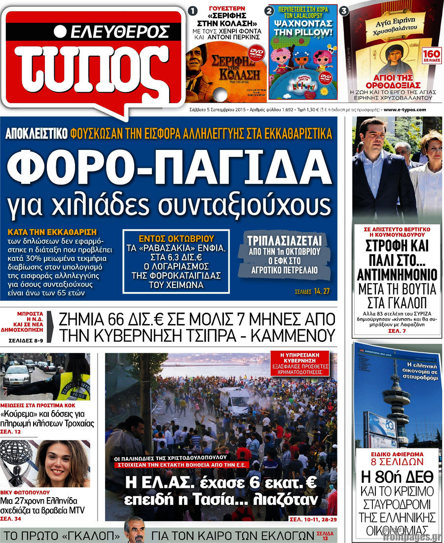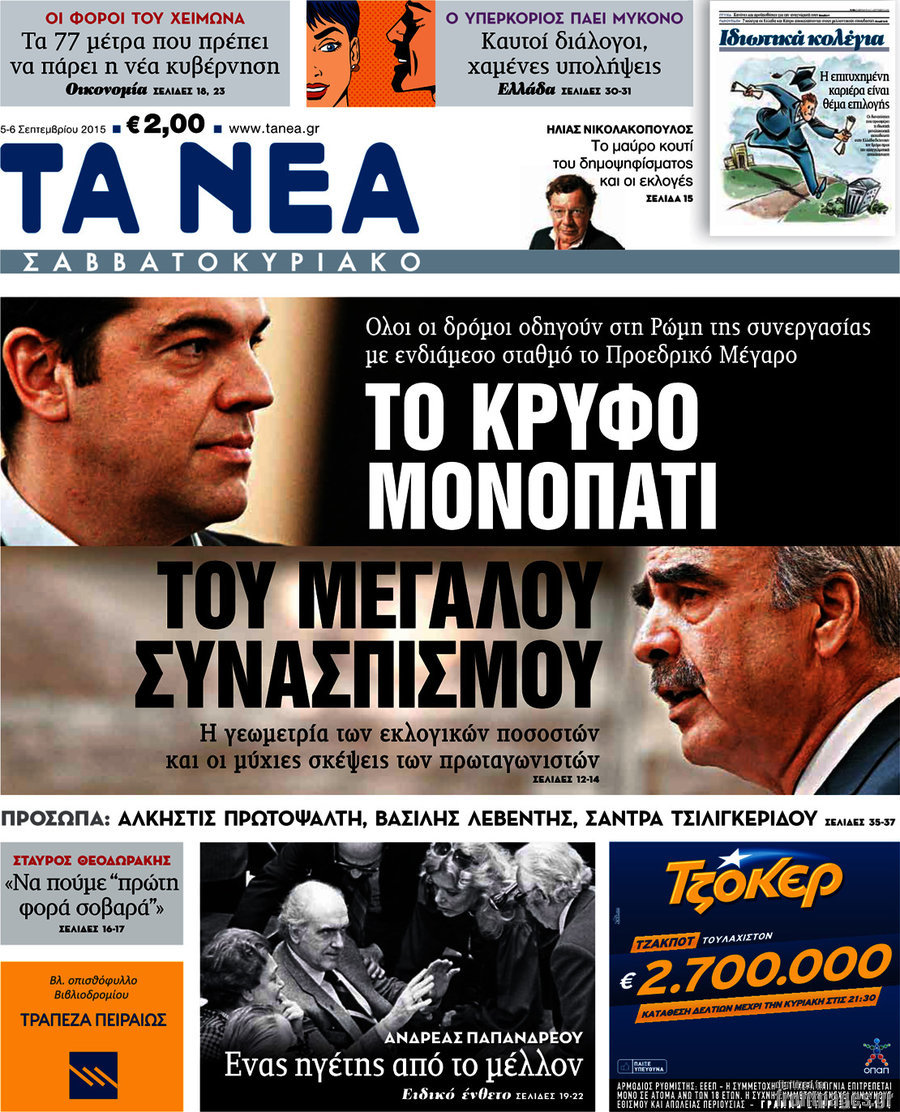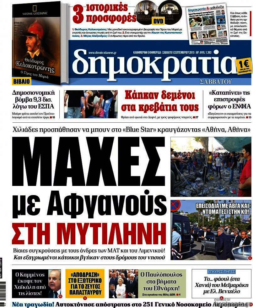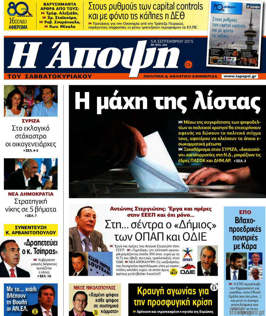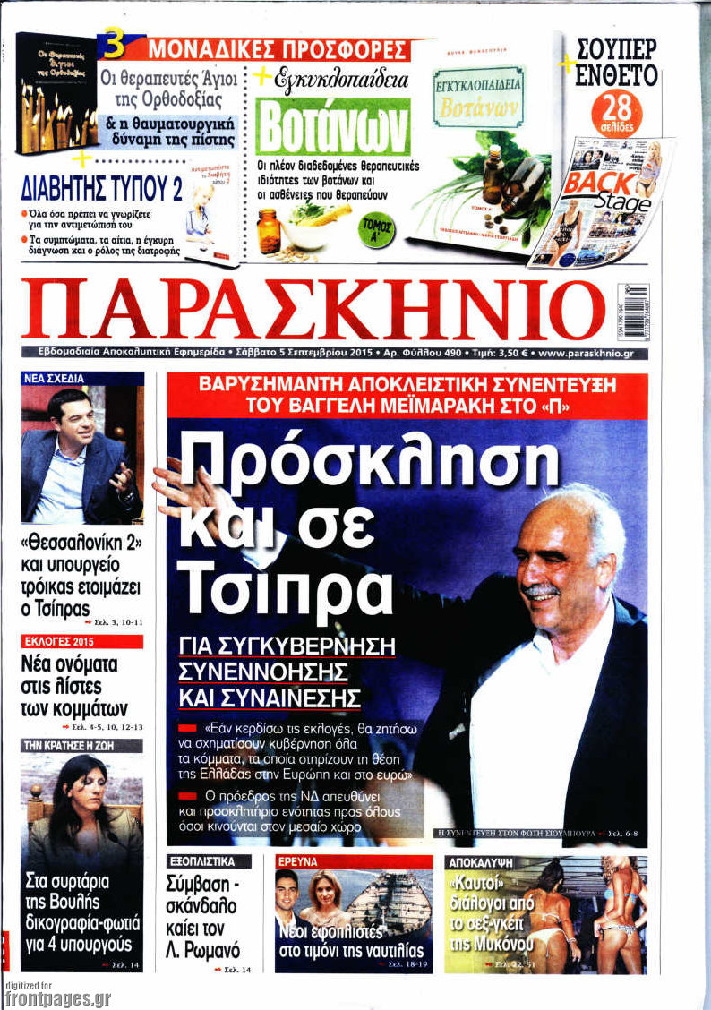 Οι πολιτικές εφημερίδες 5/9/2015 Ιωάννα Θυμουλέα 08:14, Σάββατο 05 Σεπτεμβρίου 2015 Media Διαβάστε τα πρωτοσέλιδα των πολιτικών εφημερίδων: ΕΦΗΜΕΡΙΔΕΣ ΠΟΛΙΤΙΚΕΣ ΕΦΗΜΕΡΙΔΕΣ ΠΡΩΤΟΣΕΛΙΔΑ ΕΦΗΜΕΡΙΔΩΝ Μοιράσου το: σχολίασε κι εσύ (0 σχόλια) Ακολουθήστε το enikos.gr στο Google News και μάθετε πρώτοι όλες τις ειδήσεις Δείτε όλες τις τελευταίες ειδήσεις από την Ελλάδα και τον Κόσμο στο enikos.gr Ειδήσεις Ροή Ειδήσεων 24 λεπτά πριν Τσιάρας προς αγρότες: Τα μπλόκα και τα πείσματα δεν ωφελούν – Οι λύσεις περνούν μέσα από τον διάλογο 1 ώρα πριν Αρχεία Έπσταϊν: Οι συγκλονιστικές φωτογραφίες – Ο Μάικλ Τζάκσον, ο Μικ Τζάγκερ και ο Κέβιν Σπέισι ανάμεσα στους διάσημους που απεικονίζονται 2 ώρες πριν Νέες ταυτότητες: Μεγάλη αναμονή για ραντεβού στην Αττική – Τέλος τα ταξίδια εκτός Ελλάδος από τον Αύγουστο για όσους δεν έχουν αλλάξει 2 ώρες πριν Ινδία: Επτά ελέφαντες σκοτώθηκαν κατά τη σύγκρουση επιβατικού τρένου με κοπάδι 3 ώρες πριν Συνελήφθη οδηγός μηχανής που έτρεχε με 161 χλμ στη Συγγρού – Τον έπιασε το ραντάρ της Τροχαίας 3 ώρες πριν Μία νέα «χρυσή» περίοδος αρχίζει για 3 ζώδια από σήμερα – «Μία αναπάντεχη ευκαιρία οδηγεί στην επιτυχία» 5 ώρες πριν Αγχώνεται για το χριστουγεννιάτικο δώρο που πήρε στην πλούσια σύντροφό του – «Φοβάμαι πως θα το βρει φθηνιάρικο, φοράει βραχιόλια Cartier» 2 ώρες πριν Διαιτολόγος αποκαλύπτει 9 πρωινές συνήθειες που «λιώνουν» το κοιλιακό λίπος – «Υποστηρίζουν την υγιεινή απώλεια βάρους» 3 ώρες πριν Οι 7 φράσεις που δεν λένε ποτέ οι συναισθηματικά έξυπνοι άνθρωποι κατά τη διάρκεια ενός καβγά 7 λεπτά πριν Πάτρα: Πέθανε 46χρονος έπειτα από λιποθυμικό επεισόδιο στο σπίτι του 15 λεπτά πριν «Μεγάλη Χίμαιρα»: Πότε κάνει πρεμιέρα η σειρά 23 λεπτά πριν Καλλιθέα: Έφοδος του «ελληνικού FBI» σε δύο καταστήματα stripshow – 5 συλλήψεις – Βίντεο 24 λεπτά πριν Τσιάρας προς αγρότες: Τα μπλόκα και τα πείσματα δεν ωφελούν – Οι λύσεις περνούν μέσα από τον διάλογο 30 λεπτά πριν Μεσσηνία: Μαχαιριές έπειτα από καβγά για οικονομικές διαφορές στον Πολύλοφο – Συνελήφθη 40χρονος ENIKOS NETWORK Γήρανση του εγκεφάλου: Νευροεπιστήμονες ανακάλυψαν τη 10λεπτη δραστηριότητα που μπορεί να τη σταματήσει Είστε μόνιμα απρόσεκτοι; 3 σημάδια που δείχνουν ότι μπορεί να είναι σύμπτωμα πάθησης Χειμερινές εκπτώσεις 2026: Πρεμιέρα στις 12 Ιανουαρίου – Πόσο θα διαρκέσουν και τι πρέπει να γνωρίζουν οι καταναλωτές Χρήστος Δήμας: Στα 2,5 εκατ. ευρώ την ημέρα το κόστος από το άνοιγμα των διοδίων από τους αγρότες – Θα αξιώσουν αποζημίωση ... Χαρτογραφώντας το «σημείο χωρίς επιστροφή»: Για πρώτη φορά αποκαλύπτεται με λεπτομέρεια το ακανθώδες όριο της ατμόσφαιρας τ... Η Google καταργεί τη λειτουργία «dark web report» – Πώς θα μπορούν οι χρήστες να διαγράφουν τα δεδομένα τους περισσότερα 12:53 , Σάββατο 20 Δεκεμβρίου 2025 Να μ’ αγαπάς: Το παρελθόν έρχεται στο φως – Καταιγιστικές εξελίξεις στα τελευταία επεισόδια του 2025 Ο Άγγελος αποκαλύπτεται, η Φωτεινή ανησυχεί για τον Λευτέρη και η Ζωή έρχεται αντιμέτωπη με το... 11:41 , Σάββατο 20 Δεκεμβρίου 2025 «Η αγάπη δεν χάνεται ποτέ»: Η μικρού μήκους ταινία κινουμένων σχεδίων που θέτει ερωτήματα για τη ζωή και τον θάνατο Ο θάνατος είναι ένα από τα πιο σκληρά θέματα που καλείται να διαχειριστεί κάποιος στη διάρκεια... 09:30 , Σάββατο 20 Δεκεμβρίου 2025 «Porto Leone: Στη γειτονιά με τα κόκκινα φανάρια» – Ο Χρόνης αποκαλύπτει στην Αλεξάνδρα το μυστικό για το παιδί της Λένας Η μεγάλη δραματική σειρά του Apha «Porto Leone: Σ