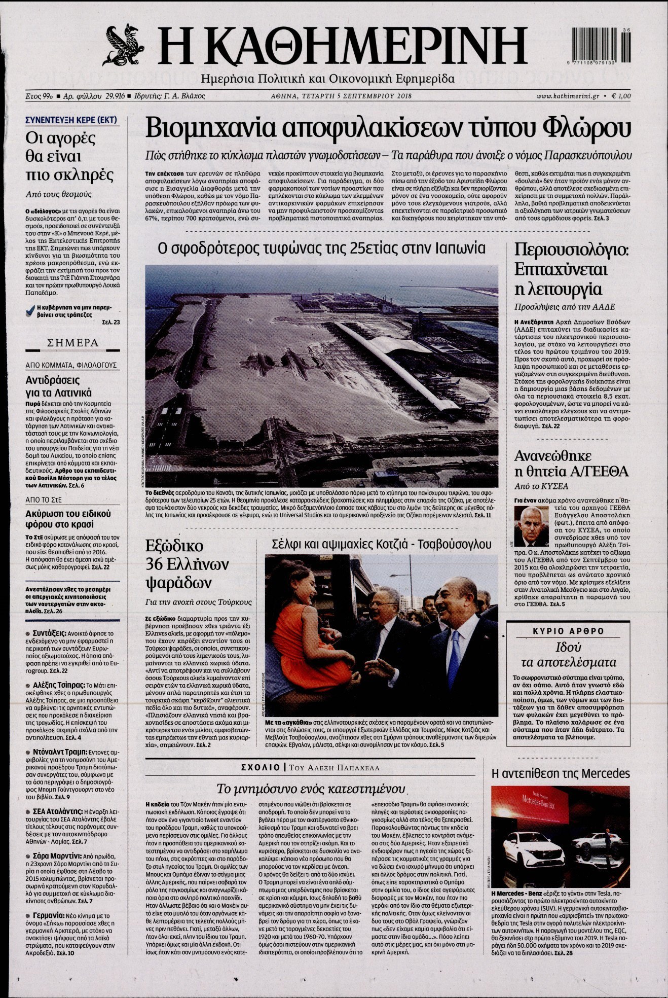 Οι πολιτικές εφημερίδες 5/9/2018 Enikos Newsroom 06:26, Τετάρτη 05 Σεπτεμβρίου 2018 Media Διαβάστε τα πρωτοσέλιδα των πολιτικών εφημερίδων. ΠΟΛΙΤΙΚΕΣ ΕΦΗΜΕΡΙΔΕΣ ΠΡΩΤΟΣΕΛΙΔΑ Μοιράσου το: σχολίασε κι εσύ (0 σχόλια) Ακολουθήστε το enikos.gr στο Google News και μάθετε πρώτοι όλες τις ειδήσεις Δείτε όλες τις τελευταίες ειδήσεις από την Ελλάδα και τον Κόσμο στο enikos.gr Ειδήσεις Ροή Ειδήσεων 4 ώρες πριν Χριστούγεννα στα μπλόκα οι αγρότες: Άνοιξαν στα διόδια και μοίρασαν προϊόντα στους πολίτες – Νέα σύσκεψη την Κυριακή στη Νίκαια 4 ώρες πριν Κύκλωμα διακίνησης ναρκωτικών σε σχολεία: Τηλεφωνούσαν στους ανηλίκους την ώρα του μαθήματος – Οι διάλογοι-σοκ, τα «ψευδώνυμα» και τα βασανιστήρια 4 ώρες πριν Αρχεία Επστάιν: Οι 500 σελίδες που λείπουν, τα αναπάντητα ερωτήματα και οι επώνυμοι – Τι έπεται 5 ώρες πριν Ζελένσκι: Μόνο οι ΗΠΑ και ο Τραμπ μπορούν να πιέσουν τη Ρωσία να βάλει τέλος στον πόλεμο 6 ώρες πριν Φοινικούντα: Προφυλακιστέος ο 30χρονος για συνέργεια στη διπλή δολοφονία – Και άλλα πρόσωπα στο «μικροσκόπιο» 3 ώρες πριν Αποκαλύφθηκε το άγνωστο «GPS» της αρχαιότητας – Πώς οι ναοί «φώτιζαν» τον δρόμο των ναυτικών πριν από την εφεύρεση των φάρων 4 ώρες πριν Ύπνος: Η διατροφή που μπορεί να σας βοηθήσει να κοιμάστε καλύτερα και να ζήσετε περισσότερο 6 ώρες πριν Αριθμολογία: Ο αριθμός του φύλακα αγγέλου σας, με βάση τον μήνα γέννησής σας – «Έτσι σας στέλνει σημάδια το σύμπαν» 18 ώρες πριν Enerwave: Το νέο «ρεύμα» στη λιανική ενέργειας που αλλάζει την εμπειρία του καταναλωτή 14 λεπτά πριν Δυτική Όχθη: Δύο Παλαιστίνιοι νεκροί από σφαίρες του Ισραηλινού στρατού 30 λεπτά πριν Ένοχος ο 54χρονος «ερευνητής» που έταζε ότι θα εντοπίσει τον αγνοούμενο γιατρό από την Κρήτη – «Μας γέμισε φρούδες ελπίδες», λέει ο πατέρας του 33χρονου 45 λεπτά πριν Σεισμός 3,8 Ρίχτερ ανοιχτά της Αμοργού 60 λεπτά πριν Άννα Βίσση: Τα… Social Media «προσκύνησαν» την «απόλυτη» για την συναυλία της στο Καλλιμάρμαρο που προβλήθηκε από το Mega 1 ώρα πριν Φωτεινή Αθερίδου: «Προσπαθώ να είμαι κάθετη και αυστηρή σαν μαμά πια» ENIKOS NETWORK Οι γυναίκες αποκαλύπτουν το πιο ελκυστικό πράγμα που μπορεί να κάνει ένας άνδρας Ομορφιά και αντιγήρανση: Ειδικοί μιλούν για συσκευές περιποίησης του δέρματος «Πολεμική» προετοιμασία από την ευρωπαϊκή βιομηχανία ενέργειας – Η Eurelectric ζητεί «ομπρέλα» προστασίας για τις υποδομές Ακύρωση ΑΦΜ για απάτες – Ποιους βάζει στο στόχαστρο η ΑΑΔΕ Χαρτογραφώντας το «σημείο χωρίς επιστροφή»: Για πρώτη φορά αποκαλύπτεται με λεπτομέρεια το ακανθώδες όριο της ατμόσφαιρας τ... Η Google καταργεί τη λειτουργία «dark web report» – Πώς θα μπορούν οι χρήστες να διαγράφουν τα δεδομένα τους περισσότερα 01:30 , Κυριακή 21 Δεκεμβρίου 2025 Άννα Βίσση: Τα… Social Media «προσκύνησαν» την «απόλυτη» για την συναυλία της στο Καλλιμάρμαρο που προβλήθηκε από το Mega Την ημέρα των γενεθλίων της Άννας Βίσση, το MEGA τίμησε τη διαχρονική παρουσία της «απόλυτης Ε... 00:00 , Κυριακή 21 Δεκεμβρίου 2025 The Voice: Η επιστροφή της Έλενας Παπαρίζου και η ατάκα του Γιώργου Μαζωνάκη μετά τις καταγγελίες Στη φάση των Cross Battles Live μπήκε το The Voice, με την Έλενα Παπαρίζου να επιστρέφει στο π... 20:30 , Σάββατο 20 Δεκεμβρίου 2025 Αυτή την Κυριακή με τη Realnews: Instyle, μαζί Drive και Realnews Geopolitics Αυτή την Κυριακή με τη Realnews: Instyle, μαζί Drive και Realnews Geopolitics Instyle Η Άννα Ρ... 20:28 , Σάββατο 20 Δεκεμβρίου 2025 Ο ΑΝΤ1 γεμίζει τις γιορτές με μουσική – Ποιους καλλιτέχνες θα απολαύσουμε Φέτος στον ΑΝΤ1 γιορτάζουμε τις νύχτες μας παρέ
