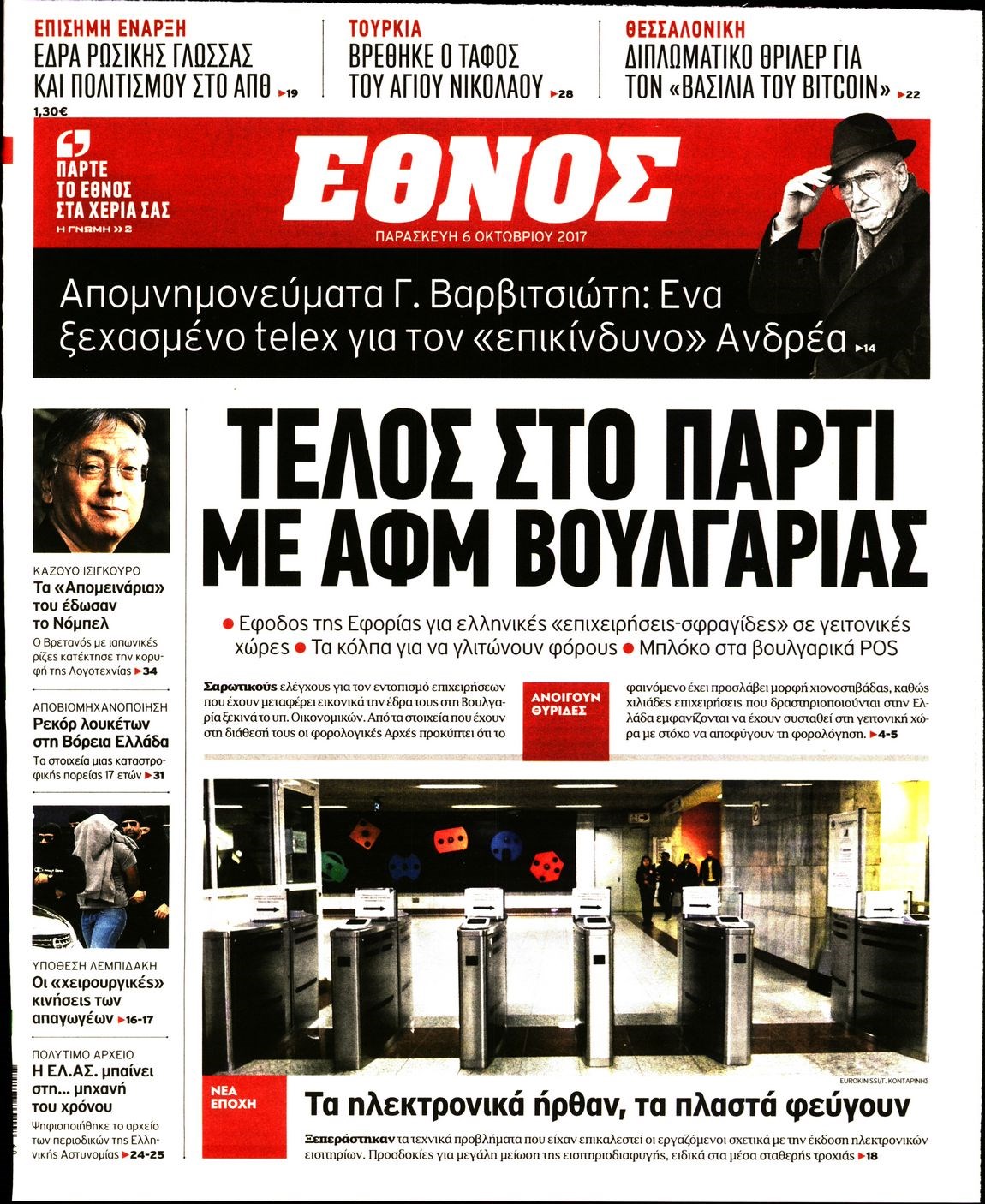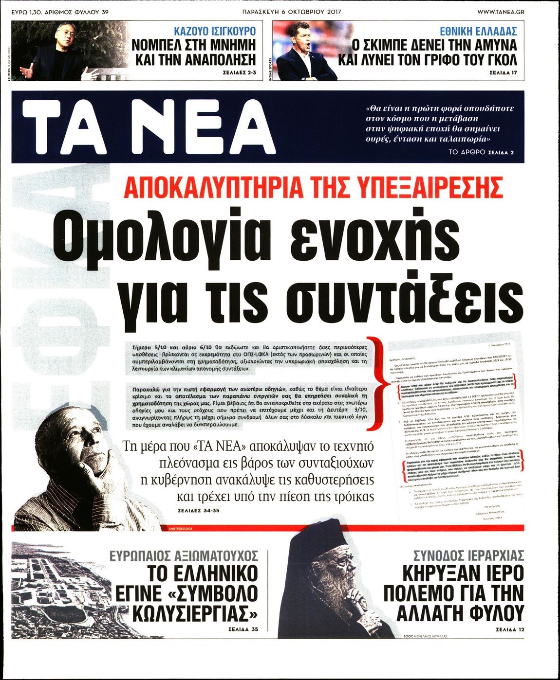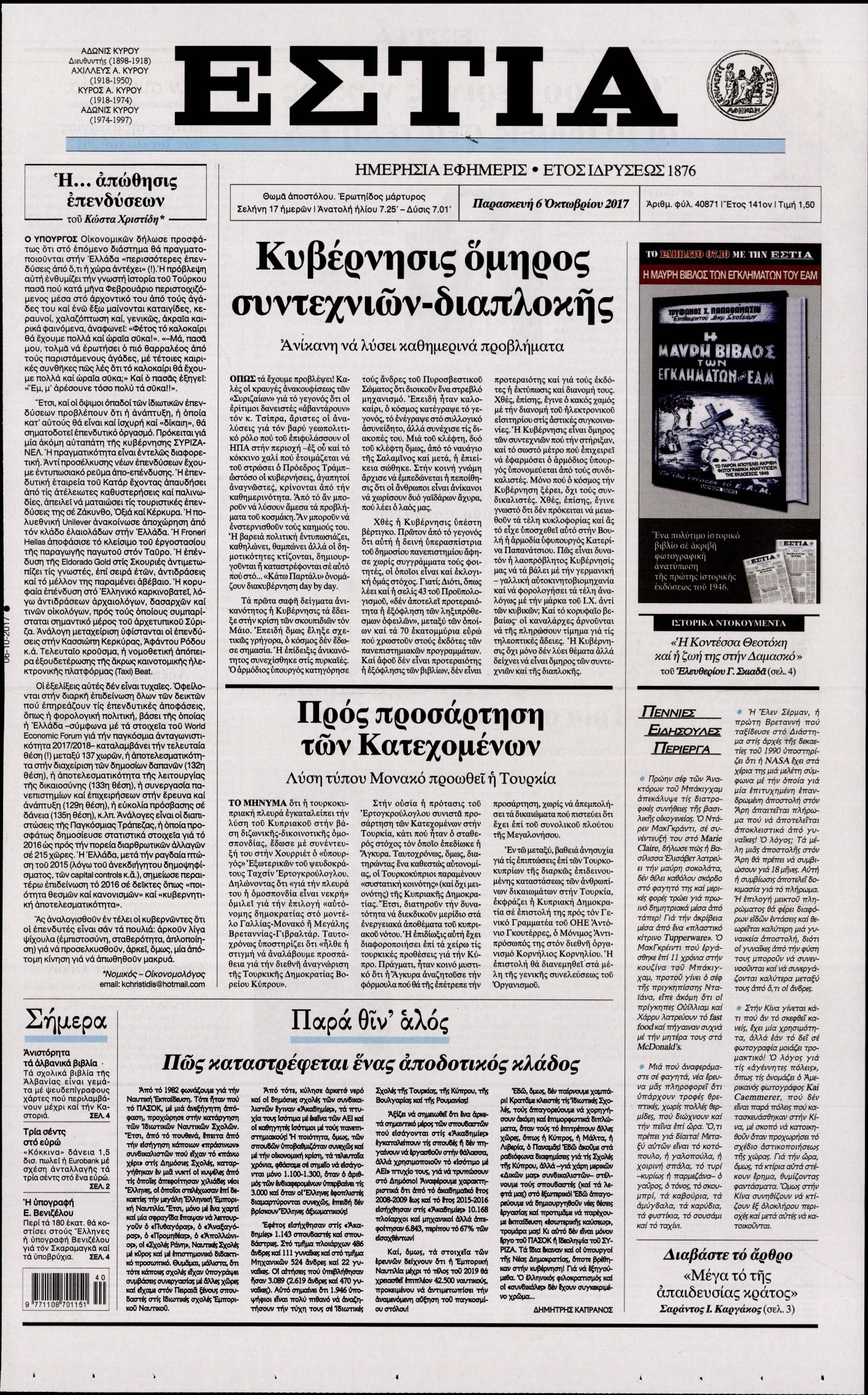 Οι πολιτικές εφημερίδες 6/10/2017 Enikos Newsroom 07:54, Παρασκευή 06 Οκτωβρίου 2017 Media Διαβάστε τα σημερινά πρωτοσέλιδα των πολιτικών εφημερίδων: ΠΟΛΙΤΙΚΕΣ ΕΦΗΜΕΡΙΔΕΣ ΠΡΩΤΟΣΕΛΙΔΑ Μοιράσου το: σχολίασε κι εσύ (0 σχόλια) Ακολουθήστε το enikos.gr στο Google News και μάθετε πρώτοι όλες τις ειδήσεις Δείτε όλες τις τελευταίες ειδήσεις από την Ελλάδα και τον Κόσμο στο enikos.gr Ειδήσεις Ροή Ειδήσεων 38 λεπτά πριν Μεσόγειος: Η διαδρομή του ρωσικού τάνκερ «Qendil» και η στοχευμένη επίθεση της Ουκρανίας με drone – Ο Πούτιν προειδοποίησε για αντίποινα 32 λεπτά πριν Αττική: Θρίλερ με νεκρό βρέφος 5 μηνών – Κοιμόταν στο ίδιο κρεβάτι με τους γονείς του 1 ώρα πριν Από το Ορμένιο ως τα Μάλγαρα κι από τη Σιάτιστα μέχρι τη Νίκαια: Μπλόκα σε όλη την Ελλάδα – Το Σάββατο ανοίγουν τα διόδια οι αγρότες 2 ώρες πριν «Έλληνας Εσκομπάρ»: Φωτογραφίες με τους 4 τόνους κοκαΐνης που κατασχέθηκαν από το σκάφος «Ουρανία» 3 ώρες πριν Πούτιν: Σαρκαστικά μηνύματα, παράπονα και απρόοπτα στη συνέντευξη Τύπου – Η πρόταση γάμου on air και οι ερωτήσεις για τα αγγούρια και τους… εξωγήινους 3 ώρες πριν Τα 5 ζώδια που ευνοούνται στην ερωτική ζωή τους την επόμενη εβδομάδα – «Η ενέργεια του Αιγόκερου φέρνει αγάπη και σταθερότητα» 7 ώρες πριν Ειδικός μοιράζεται 6 κόλπα για να διατηρείστε σε φόρμα με πάνω από 40 ώρες εργασίας την εβδομάδα: «Προπονηθείτε πριν από τη δουλειά, όχι μετά» 4 ώρες πριν Αυτό το έξυπνο μαθηματικό κόλπο θα μπορούσε να αλλάξει τον τρόπο με τον οποίο οι επιστήμονες μελετούν τους σεισμούς 2 ώρες πριν Κουίζ για την παλιά Αθήνα: Αναγνωρίζετε την περιοχή; Έχετε περάσει 100% από εκεί 7 λεπτά πριν Επίσημη η «βόμβα»: Ο ΠΑΟΚ ανακοίνωσε την απόκτηση του Πάτρικ Μπέβερλι 12 λεπτά πριν Θεσσαλονίκη: Πατέρας εγκαλεί τον Ιατρικό Σύλλογο για ποινές «χάδι» σε γιατρό που κατηγορείται για τον θάνατο του παιδιού του 18 λεπτά πριν Κερατσίνι: Αστυνομικός εκτός υπηρεσίας απέτρεψε κλοπή μηχανών – Συνελήφθησαν τρεις ανήλικοι 22 λεπτά πριν Το σόι σου: Ο Άρης έρχεται στην Ελλάδα για τις γιορτές των Χριστουγέννων – Τι θα δούμε στο αποψινό εορταστικό επεισόδιο 29 λεπτά πριν ΠΑΣΟΚ σε Μαρινάκη: Δεν νομιμοποιούμε πολιτικές επιλογές που μεταφέρουν το πρόβλημα από υπηρεσία σε υπηρεσία ENIKOS NETWORK «Η σούπερ» γρίπη εξαπλώνεται στην Ευρώπη-Στοιχεία για την αποτελεσματικότητα του εμβολίου από το ECDC ΕΛΣΤΑΤ: Αύξηση κατά 1,7% των επαγγελματιών υγείας το 2024 Η απάντηση της κυβέρνησης στα αιτήματα των αγροτών: 16 έχουν ικανοποιηθεί, 4 βρίσκονται υπό επεξεργασία και 7 δεν είναι εφι... Μισθολογική διαφάνεια: Το 68% των εργαζομένων αγνοεί τη νέα οδηγία – Αναλυτικά τα στοιχεία έρευνας Χαρτογραφώντας το «σημείο χωρίς επιστροφή»: Για πρώτη φορά αποκαλύπτεται με λεπτομέρεια το ακανθώδες όριο της ατμόσφαιρας τ... Η Google καταργεί τη λειτουργία «dark web report» – Πώς θα μπορούν οι χρήστες να διαγράφουν τα δεδομένα τους περισσότερα 18:11 , Παρασκευή 19 Δεκεμβρίου 2025 Το σόι σου: Ο Άρης έρχεται στην Ελλάδα για τις γιορτές των Χριστουγέννων – Τι θα δούμε στο αποψινό εορταστικό επεισόδιο Ένα απολαυστικό, εορταστικό επεισόδιο της σειράς “Το σόι σου”, γεμάτο ευτράπελα αλ... 15:15 , Παρασκευή 19 Δεκεμβρίου 2025 Την Κυριακή με τη Realnews: Ό,τι και αν αγοράσεις, σκανάρεις και κερδίζεις! Την Κυριακή με τη Realnews: Ό,τι και αν αγοράσεις, σκανάρεις και κερδίζεις! Με το PADU app, το... 08:00 , Παρασκευή 19 Δεκεμβρίου 2025 Την Κυριακή με τη Realnews: Δωροεπιταγή 10€ Δωροεπιταγή αξίας 10€ για αγορές άνω των 60€ από τα πολυκα