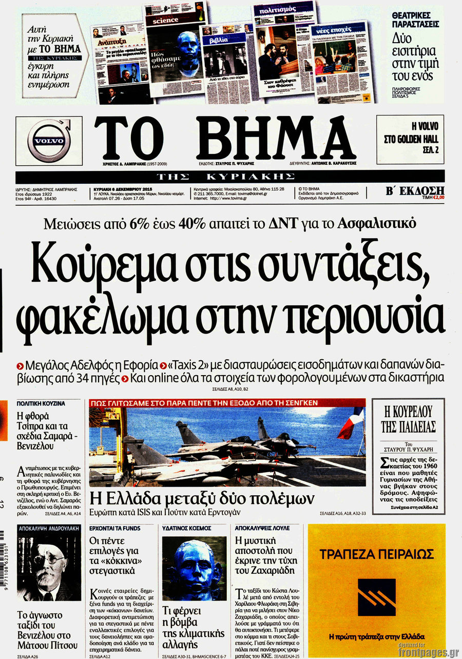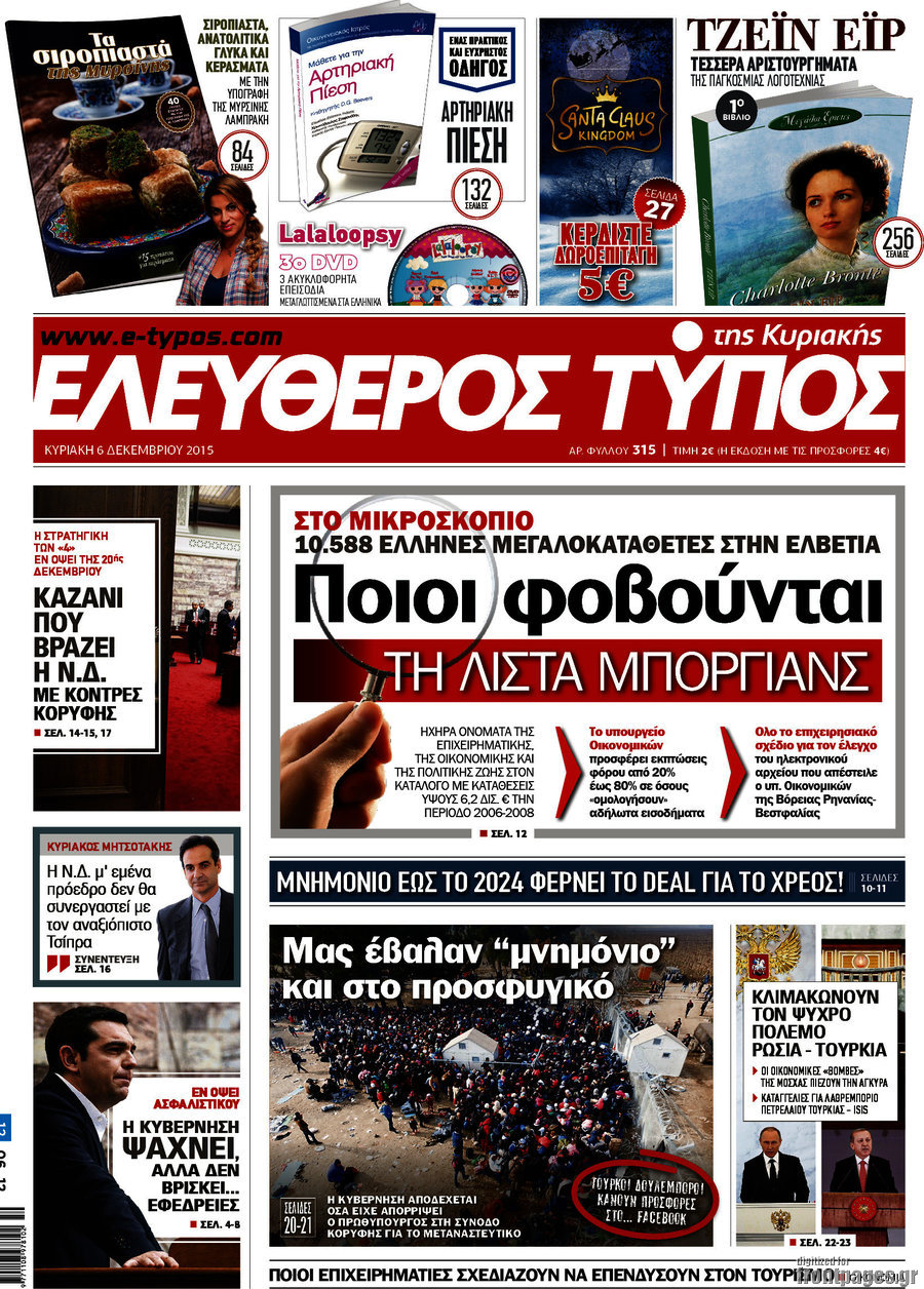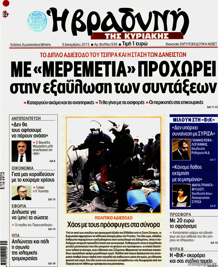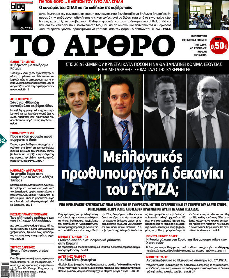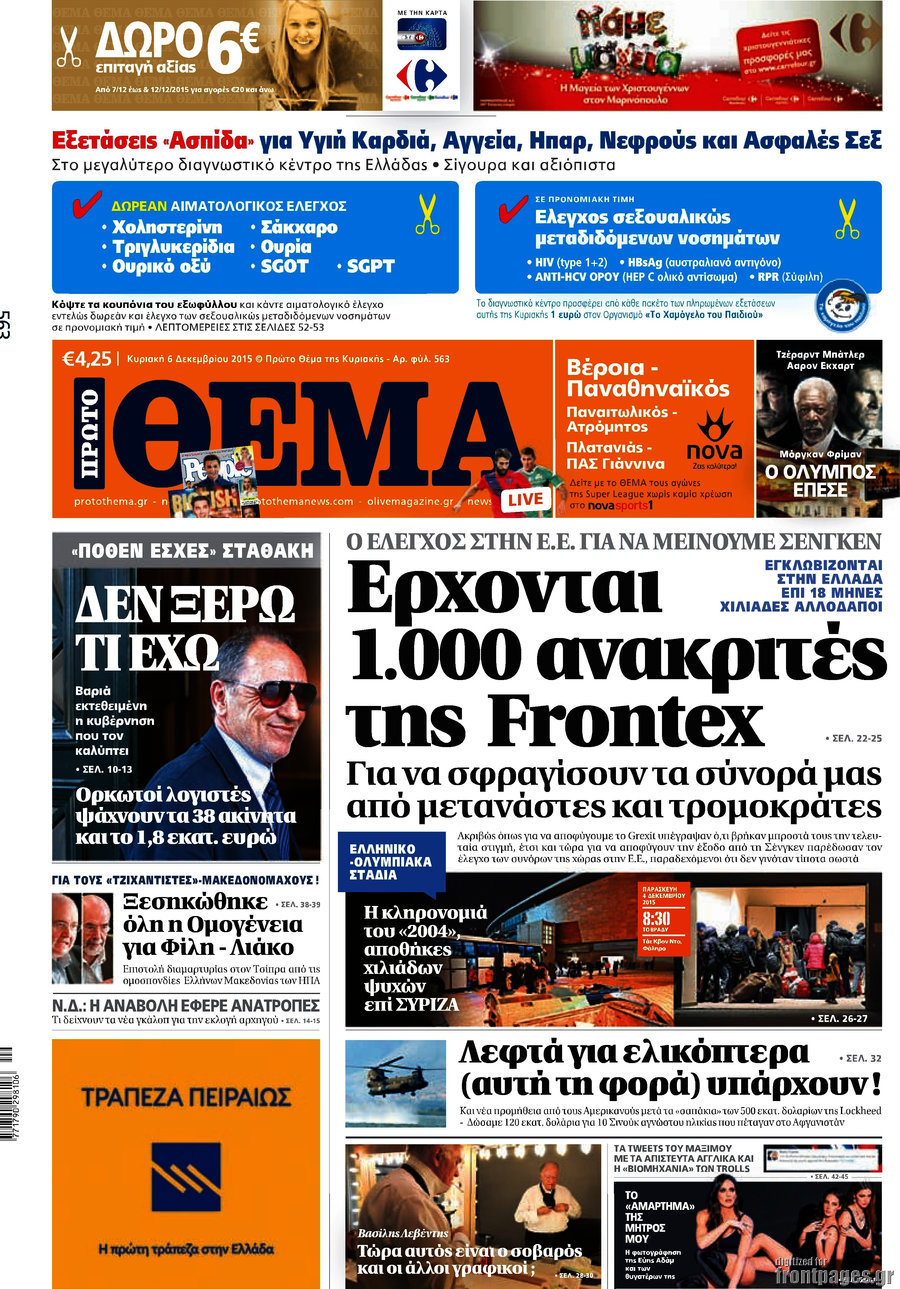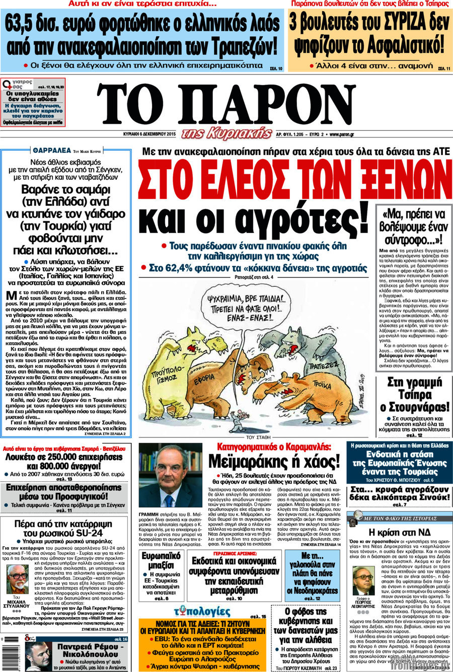 Οι πολιτικές εφημερίδες 6/12/2015 Enikos Newsroom 06:44, Κυριακή 06 Δεκεμβρίου 2015 Media Διαβάστε τα σημερινά πρωτοσέλιδα των πολιτικών εφημερίδων. ΕΦΗΜΕΡΙΔΕΣ ΠΟΛΙΤΙΚΕΣ ΕΦΗΜΕΡΙΔΕΣ Μοιράσου το: σχολίασε κι εσύ (0 σχόλια) Ακολουθήστε το enikos.gr στο Google News και μάθετε πρώτοι όλες τις ειδήσεις Δείτε όλες τις τελευταίες ειδήσεις από την Ελλάδα και τον Κόσμο στο enikos.gr Ειδήσεις Ροή Ειδήσεων 4 ώρες πριν Χριστούγεννα στα μπλόκα: Επιμένουν στις κινητοποιήσεις τους οι αγρότες – Ανοίγουν τα διόδια το Σαββατοκύριακο 4 ώρες πριν Ουκρανία: Η άνευ προηγουμένου επίθεση σε ρωσικό τάνκερ στη Μεσόγειο και το μήνυμα προς στον Πούτιν – Το «μακρύ χέρι» του Κιέβου 3 ώρες πριν Πούτιν: Τα μηνύματα σε Ευρώπη και ΝΑΤΟ από το μαραθώνιο «σόου» του – Η απαίτηση για «σεβασμό» και η ειρήνη «με τους όρους» της Μόσχας 4 ώρες πριν Τραμπ: Δεν αποκλείει την πιθανότητα ενός πολέμου στη Βενεζουέλα – «Ο Μαδούρο ξέρει καλύτερα από τον καθένα τι ακριβώς θέλω» 5 ώρες πριν Συνεχίζει να προκαλεί ο Μίτσκοσκι: «Για μένα το όνομα Μακεδονία είναι ιερό» 3 ώρες πριν Ανακαλύφθηκαν αρχαία χρυσά νομίσματα 2.200 ετών που απεικονίζουν τον θεό Απόλλωνα – Η άγνωστη σύνδεση με τον Φίλιππο Β΄ της Μακεδονίας 4 ώρες πριν Ύπνος: Μια κρυφή κατάσταση του εγκεφάλου πριν από τον ύπνο μπορεί να είναι το “κλειδί” για υψηλή ευφυΐα και δημιουργικότητα 5 ώρες πριν Αριθμολογία: Οι άνθρωποι που έχουν γεννηθεί αυτές τις 4 ημερομηνίες, συχνά παρεξηγούνται – «Η καλοσύνη τους κρύβει τεράστια δύναμη» 6 ώρες πριν Ξεχάστε το καθάρισμα το Σαββατοκύριακο: Ο «κανόνας των 20 λεπτών» που θα σας λύσει τα χέρια 2 λεπτά πριν Ντόναλντ Τραμπ: «Πολύ βαριά αντίποινα» στη Συρία – «Πλήττουμε πολύ δυνατά οχυρά του Ισλαμικού Κράτους» 16 λεπτά πριν Εξάρχεια: Ένταση με μολότοφ, χημικά και κρότου λάμψης 32 λεπτά πριν ΗΠΑ: Τραγωδία στην Αλαμπάμα – Σκότωσε την δημοσιογράφο σύζυγό του και αυτοκτόνησε μπροστά στον 3χρονο γιο τους 46 λεπτά πριν Πρόταση γάμου στο ΣΕΦ κατά την διάρκεια του αγώνα Ολυμπιακός-Βιλερμπάν – Δείτε βίντεο 1 ώρα πριν Euroleague: Επέστρεψε στις νίκες ο Ολυμπιακός, πήρε την ματσάρα της χρονιάς η Μπάρτσα – Τα αποτελέσματα και η βαθμολογία ENIKOS NETWORK Το ΕΚΑΒ τιμήθηκε από την Ακαδημία Αθηνών για τα 40 χρόνια προσφοράς του Έχετε πραγματικά μεγάλη καρδιά; 10 χαρακτηριστικά όσων έχουν καλοσύνη Αναστολή μέτρων αναγκαστικής εκτέλεσης για κτηνοτρόφους που πλήττονται από την ευλογιά των αιγοπροβάτων Πλήρης επάρκεια προϊόντων στις λαϊκές της Αττικής, παρά τις αγροτικές κινητοποιήσεις – Τι απαντούν οι πωλητές Χαρτογραφώντας το «σημείο χωρίς επιστροφή»: Για πρώτη φορά αποκαλύπτεται με λεπτομέρεια το ακανθώδες όριο της ατμόσφαιρας τ... Η Google καταργεί τη λειτουργία «dark web report» – Πώς θα μπορούν οι χρήστες να διαγράφουν τα δεδομένα τους περισσότερα 22:42 , Παρασκευή 19 Δεκεμβρίου 2025 Γιώργος Γιαννόπουλος για “Το σόι σου”: “Είναι ευτυχία και ευλογία αυτή η σειρά” «Είναι ευτυχία και ευλογία η συγκυρία αυτής της σειράς», θα πει ο Γιώργος Γιαννόπουλος -ο αγαπ... 20:37 , Παρασκευή 19 Δεκεμβρίου 2025 Don’t Forget The Lyrics: Η Έλλη Κοκκίνου υποδέχεται 4 παίκτες που θα κάνουν τα πάντα για να μη χάσουν ούτε… μισή λέξη από τους στίχους Το «Don’t Forget The Lyrics» επιστρέφει απόψε, Παρασκευή 19 Δεκεμβρίου, στις 21:00 με νέο επει... 19:31 , Παρασκευή 19 Δεκεμβρίου 2025 GNTM: Απόψε ο μεγάλος τελικός για τους 4 φιναλίστ Έπειτα από μήνες γεμάτους μόδα, δημιουργία και έντονες αναμετρήσεις, το GNTM 2025 κορυφώνεται,... 18:11 , Παρασ