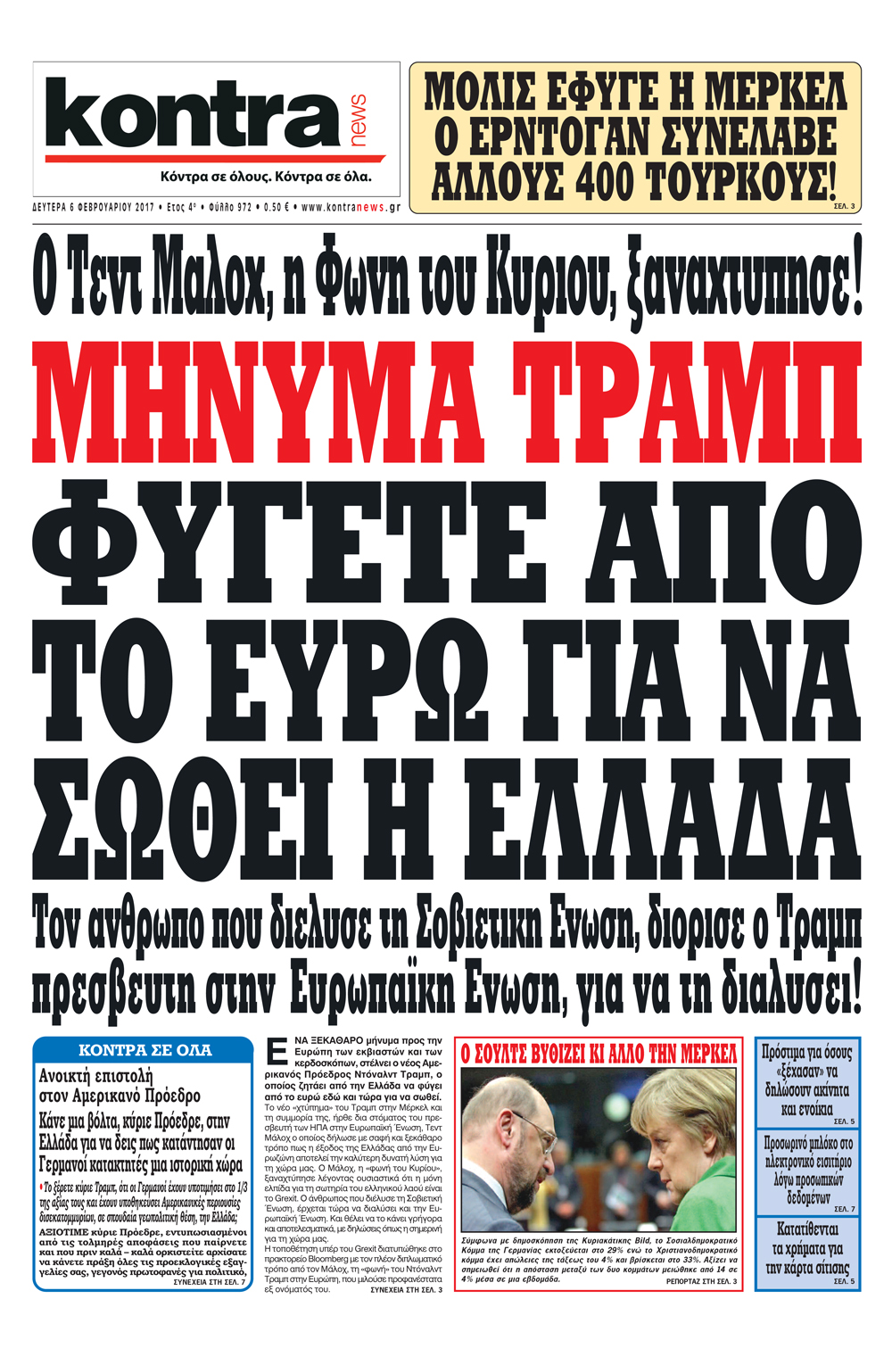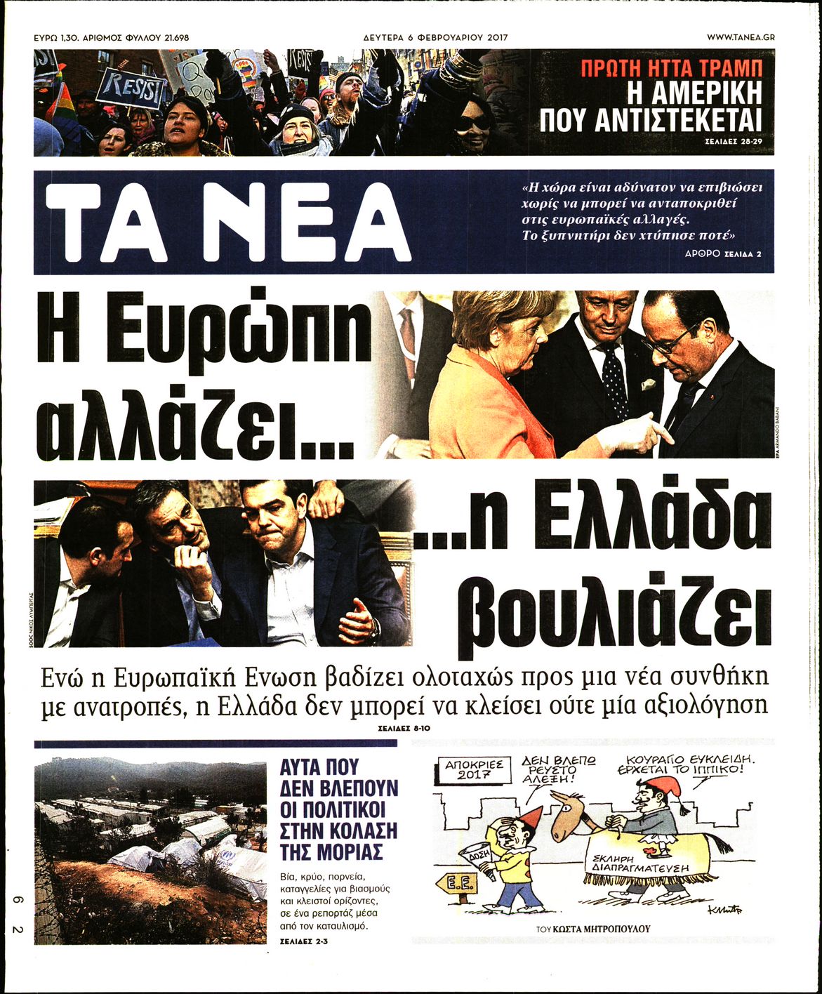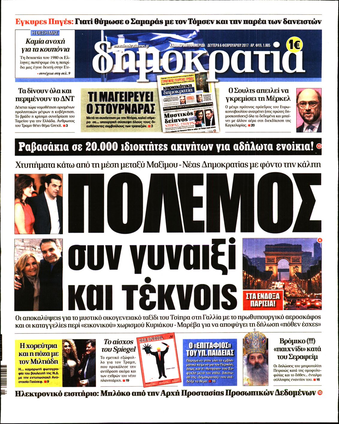 Οι πολιτικές εφημερίδες 6/2/2017 Enikos Newsroom 05:34, Δευτέρα 06 Φεβρουαρίου 2017 Media Διαβάστε τα σημερινά πρωτοσέλιδα των πολιτικών εφημερίδων: ΠΟΛΙΤΙΚΕΣ ΕΦΗΜΕΡΙΔΕΣ ΠΡΩΤΟΣΕΛΙΔΑ Μοιράσου το: σχολίασε κι εσύ (0 σχόλια) Ακολουθήστε το enikos.gr στο Google News και μάθετε πρώτοι όλες τις ειδήσεις Δείτε όλες τις τελευταίες ειδήσεις από την Ελλάδα και τον Κόσμο στο enikos.gr Ειδήσεις Ροή Ειδήσεων 2 ώρες πριν Μπλόκα: Οι αγρότες σηκώνουν τις μπάρες σε διόδια για τους εκδρομείς των Χριστουγέννων και μοιράζουν προϊόντα – Βίντεο 2 ώρες πριν Τσιάρας προς αγρότες: Τα μπλόκα και τα πείσματα δεν ωφελούν – Οι λύσεις περνούν μέσα από τον διάλογο 3 ώρες πριν Αρχεία Έπσταϊν: Οι συγκλονιστικές φωτογραφίες – Ο Μάικλ Τζάκσον, ο Μικ Τζάγκερ και ο Κέβιν Σπέισι ανάμεσα στους διάσημους που απεικονίζονται 54 λεπτά πριν Μαθητές διακινούσαν κοκαΐνη και χασίς σε σχολείο της Αττικής – 12 συλλήψεις 60 λεπτά πριν Βέλγιο: Άγνωστοι έριξαν κόκκινη μπογιά στο προξενείο της Πολωνίας στις Βρυξέλλες 5 ώρες πριν Μία νέα «χρυσή» περίοδος αρχίζει για 3 ζώδια από σήμερα – «Μία αναπάντεχη ευκαιρία οδηγεί στην επιτυχία» 3 ώρες πριν Διαιτολόγος αποκαλύπτει 9 πρωινές συνήθειες που «λιώνουν» το κοιλιακό λίπος – «Υποστηρίζουν την υγιεινή απώλεια βάρους» 4 ώρες πριν Οι 7 φράσεις που δεν λένε ποτέ οι συναισθηματικά έξυπνοι άνθρωποι κατά τη διάρκεια ενός καβγά 6 ώρες πριν Enerwave: Το νέο «ρεύμα» στη λιανική ενέργειας που αλλάζει την εμπειρία του καταναλωτή 3 λεπτά πριν Μαρινάκης στον Realfm 97,8: Η κυβέρνηση σέβεται κάθε λογική διεκδίκηση των αγροτών, αλλά και το αίτημα των πολιτών να μην ταλαιπωρούνται 9 λεπτά πριν O Πάντερ MVP της 17ης αγωνιστικής στην Euroleague 18 λεπτά πριν Πέθανε η τραγουδίστρια Κλαούντια Ντελμέρ 25 λεπτά πριν Μία ανεκμετάλλευτη πηγή θα μπορούσε να προσφέρει ανεξάντλητη ενέργεια – Οι επιστήμονες ίσως γνωρίζουν πώς να την ξεκλειδώσουν 34 λεπτά πριν Θεσσαλονίκη: Ανήλικος που είχε εξαφανιστεί βρέθηκε στο σπίτι Τούρκων μετά από αστυνομική επιχείρηση ENIKOS NETWORK Η αποχή από την αναπαραγωγή παρατείνει τη ζωή στα ζώα, σύμφωνα με μελέτη – Τι ισχύει για τους ανθρώπους; Σημαντικές επαφές στις ΗΠΑ είχε ο υπουργός Υγείας Άδωνις Γεωργιάδης Ευλογιά αιγοπροβάτων: Παρατεταμένη επιζωοτία, αυστηρά μέτρα – Τι ισχύει για τον εμβολιασμό και την ανασύσταση του ζωικού κε... Τσιάρας προς αγρότες: Έχει ικανοποιηθεί το 74% των αιτημάτων – Τα μπλόκα και τα πείσματα δεν ωφελούν Χαρτογραφώντας το «σημείο χωρίς επιστροφή»: Για πρώτη φορά αποκαλύπτεται με λεπτομέρεια το ακανθώδες όριο της ατμόσφαιρας τ... Η Google καταργεί τη λειτουργία «dark web report» – Πώς θα μπορούν οι χρήστες να διαγράφουν τα δεδομένα τους περισσότερα 14:04 , Σάββατο 20 Δεκεμβρίου 2025 Η Realnews αυτής της Κυριακής (21/12/2025) Με τίτλο: «Ασπίδα προστασίας για την Ελλάδα» κυκλοφορεί, αυτήν την Κυριακή, η Realnews. Σημαντ... 12:53 , Σάββατο 20 Δεκεμβρίου 2025 Να μ’ αγαπάς: Το παρελθόν έρχεται στο φως – Καταιγιστικές εξελίξεις στα τελευταία επεισόδια του 2025 Ο Άγγελος αποκαλύπτεται, η Φωτεινή ανησυχεί για τον Λευτέρη και η Ζωή έρχεται αντιμέτωπη με το... 11:41 , Σάββατο 20 Δεκεμβρίου 2025 «Η αγάπη δεν χάνεται ποτέ»: Η μικρού μήκους ταινία κινουμένων σχεδίων που θέτει ερωτήματα για τη ζωή και τον θάνατο Ο θάνατος είναι ένα από τα πιο σκληρά θέματα που καλείται να διαχειριστεί κάποιος στη διάρκεια... 09:30 , Σάββατο 20 Δεκεμβρίου 2025 «Porto Leone: Στη γειτονιά με τα κόκκινα φανάρια» – Ο Χρόνης αποκαλύπτει στην Αλεξάνδρα το μυ