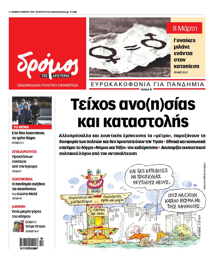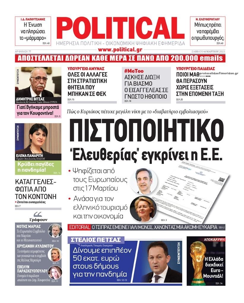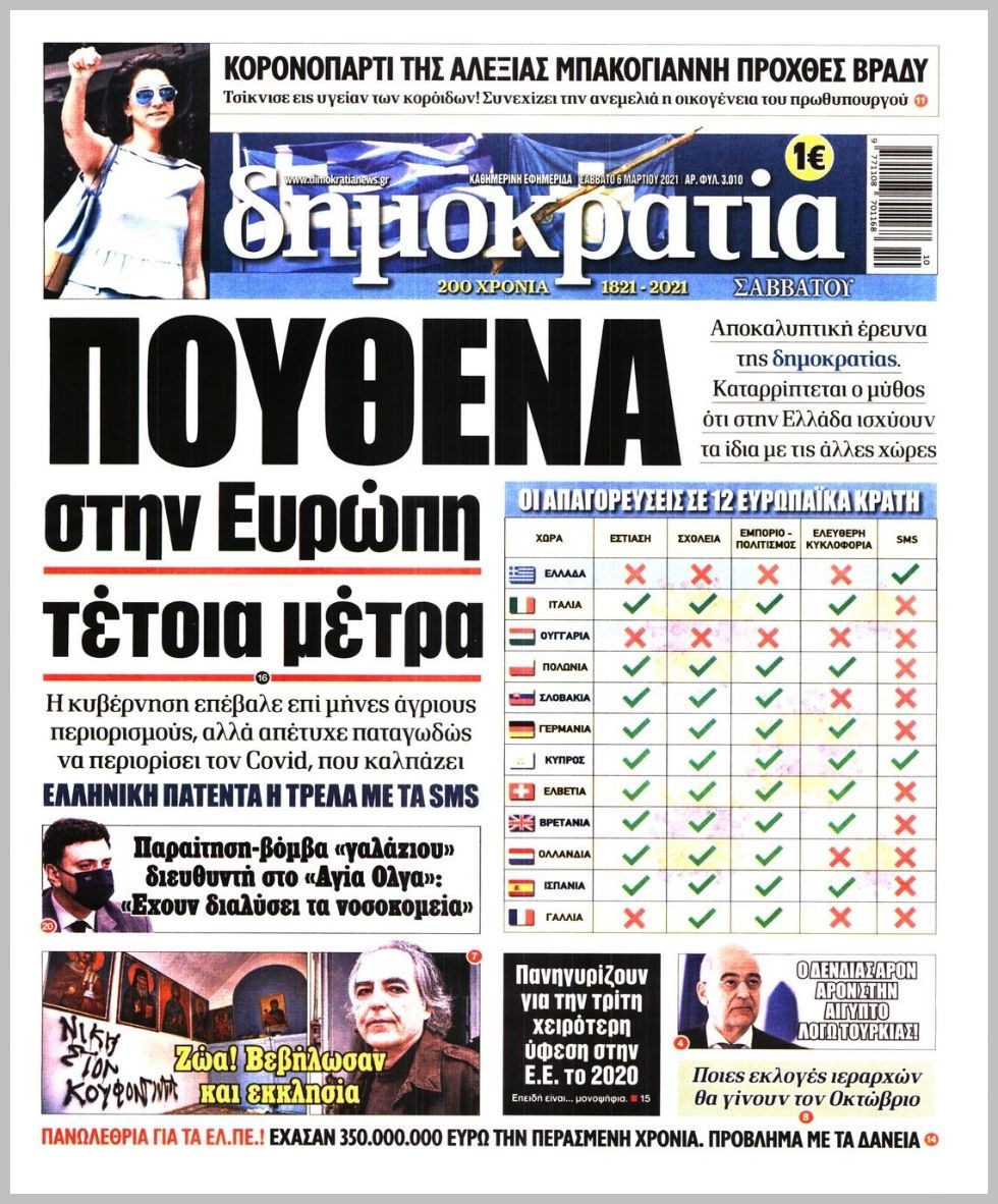 Οι πολιτικές εφημερίδες 6/3/2021 Διονύσης Νίκκας 07:08, Σάββατο 06 Μαρτίου 2021 Media Διαβάστε τα πρωτοσέλιδα των πολιτικών εφημερίδων… ΕΦΗΜΕΡΙΔΕΣ ΠΡΩΤΟΣΕΛΙΔΑ Μοιράσου το: σχολίασε κι εσύ (0 σχόλια) Ακολουθήστε το enikos.gr στο Google News και μάθετε πρώτοι όλες τις ειδήσεις Δείτε όλες τις τελευταίες ειδήσεις από την Ελλάδα και τον Κόσμο στο enikos.gr Ειδήσεις Ροή Ειδήσεων 4 ώρες πριν Υπόθεση Έπσταϊν: Το Υπουργείο Δικαιοσύνης δημοσιοποίησε μια σειρά από εξαιρετικά επεξεργασμένα αρχεία – «Λείπουν τα πιο σημαντικά έγγραφα», λένε οι Δημοκρατικοί 49 λεπτά πριν Γιορτές με μπλόκα για τους αγρότες: Ανοίγουν διόδια και μοιράζουν προϊόντα στους ταξιδιώτες 1 ώρα πριν Εξαφάνιση 33χρονου γιατρού στην Κρήτη: «Άναψα τα φώτα, τρόμαξε και άρχισε να τρέχει στα χωράφια» – Η τελευταία διαδρομή και η μαρτυρία «κλειδί» 3 ώρες πριν Ο «χάρτης» με τις αυξήσεις και τις φοροελαφρύνσεις του 2026 – Ποιοι και πόσα κερδίζουν 1 ώρα πριν Τα αρχεία του Έπσταϊν αποκαλύπτουν φωτογραφία του έκπτωτου πρίγκιπα Άντριου – Είναι ξαπλωμένος στην αγκαλιά 5 γυναικών 1 ώρα πριν Μία νέα «χρυσή» περίοδος αρχίζει για 3 ζώδια από σήμερα – «Μία αναπάντεχη ευκαιρία οδηγεί στην επιτυχία» 5 ώρες πριν Αυγά: Πόσα μπορείτε να τρώτε την ημέρα με ασφάλεια για μέγιστη πρόσληψη πρωτεΐνης 3 ώρες πριν Αρχαιολόγοι ανακάλυψαν σε χωράφι απεικόνιση 600 ετών ενός Αγίου – Τα στοιχεία που δείχνουν ότι μαρτύρησε 2 ώρες πριν Αγχώνεται για το χριστουγεννιάτικο δώρο που πήρε στην πλούσια σύντροφό του – «Φοβάμαι πως θα το βρει φθηνιάρικο, φοράει βραχιόλια Cartier» 7 λεπτά πριν Τα Labubu «μετακομίζουν» στο Χόλιγουντ: Η Sony Pictures ετοιμάζει live-action ταινία με τον σκηνοθέτη του «Wonka» 14 λεπτά πριν Νέες ταυτότητες: Μεγάλη αναμονή για ραντεβού στην Αττική – Τέλος τα ταξίδια εκτός Ελλάδος από τον Αύγουστο για όσους δεν έχουν αλλάξει 23 λεπτά πριν Οι 7 φράσεις που δεν λένε ποτέ οι συναισθηματικά έξυπνοι άνθρωποι κατά τη διάρκεια ενός καβγά 26 λεπτά πριν Τηλεθέαση (19/12): Ανατροπές και πρωτιές στην πρωινή ζώνη 34 λεπτά πριν Πώς η κλιματική αλλαγή επηρεάζει εγκύους και βρέφη – Οι επιπτώσεις των υψηλών θερμοκρασιών ENIKOS NETWORK Είστε μόνιμα απρόσεκτοι; 3 σημάδια που δείχνουν ότι μπορεί να είναι σύμπτωμα πάθησης Πόσα κιλά παίρνουμε πραγματικά τα Χριστούγεννα, σύμφωνα με την επιστήμη – Πώς να το αποτρέψουμε; e-ΕΦΚΑ και ΔΥΠΑ: Έρχονται νέες πληρωμές έως τις 24 Δεκεμβρίου – Ποιοι πάνε ταμείο Επίδομα παιδιού: Τι αλλάζει από το 2026 – Το όφελος από τις φορολογικές ελαφρύνσεις Χαρτογραφώντας το «σημείο χωρίς επιστροφή»: Για πρώτη φορά αποκαλύπτεται με λεπτομέρεια το ακανθώδες όριο της ατμόσφαιρας τ... Η Google καταργεί τη λειτουργία «dark web report» – Πώς θα μπορούν οι χρήστες να διαγράφουν τα δεδομένα τους περισσότερα 09:30 , Σάββατο 20 Δεκεμβρίου 2025 «Porto Leone: Στη γειτονιά με τα κόκκινα φανάρια» – Ο Χρόνης αποκαλύπτει στην Αλεξάνδρα το μυστικό για το παιδί της Λένας Η μεγάλη δραματική σειρά του Apha «Porto Leone: Στη γειτονιά με τα κόκκινα φανάρια» μας μεταφέ... 08:14 , Σάββατο 20 Δεκεμβρίου 2025 Τρομεροί γονείς: Η Μαρία Καβογιάννη εισβάλλει στο σπίτι της οικογένειας Στεφανίδη Όσα θα δούμε στο νέο διπλό επεισόδιο της σειράς «Τρομεροί γονείς», σήμερα Σάββατο 20 Δεκεμβρίο... 05:48 , Σάββατο 20 Δεκεμβρίου 2025 Οι οικονομικές εφημερίδες 20/12/2025 Διαβάστε τα πρωτοσέλιδα από τις οικονομικές εφημερίδες, σήμερα 20/12/2025. 05:43 , Σάββατο 20 Δεκεμβρίου 2025 Οι αθλητικές εφημερίδες 20/12/2025 Διαβάστε τα πρωτοσέλιδα από τις αθλητικ