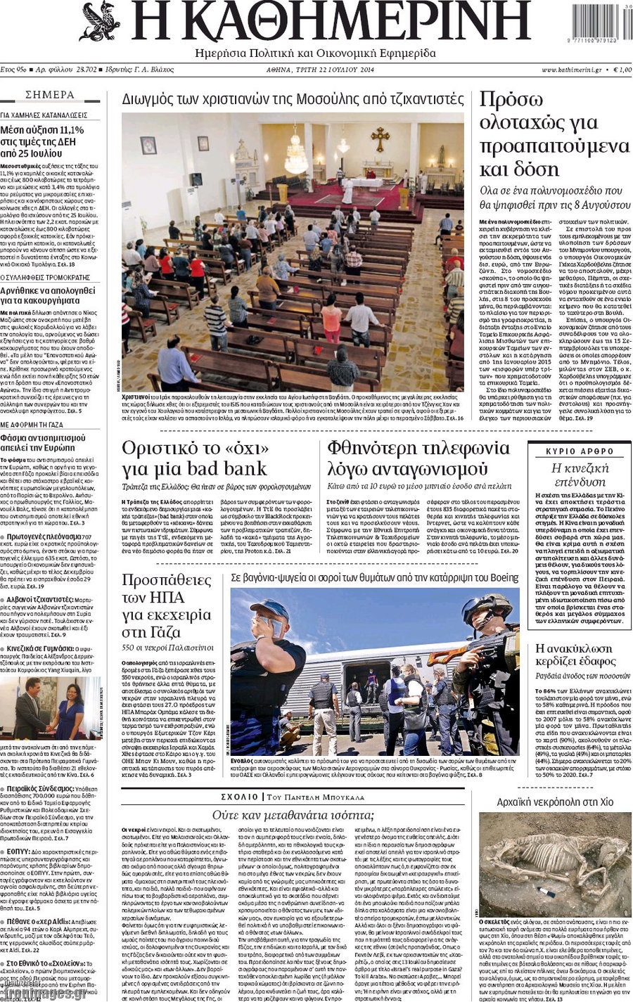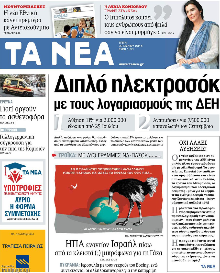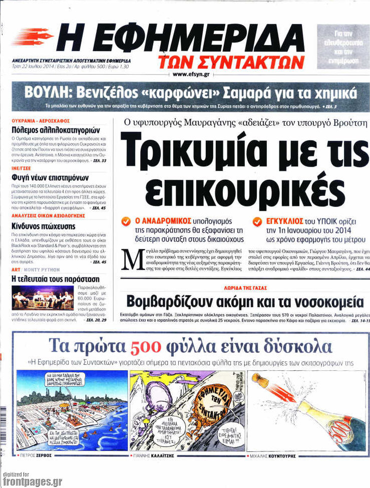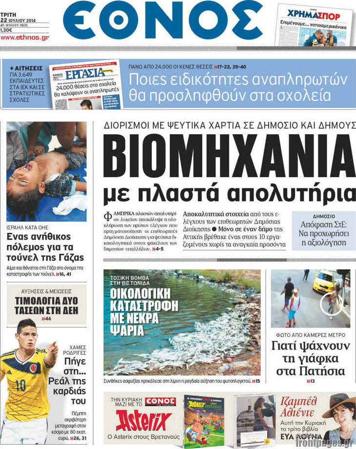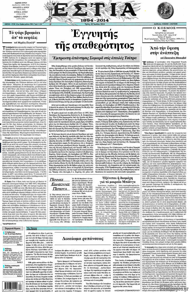 Οι πολιτικές εφημερίδες Enikos Newsroom 08:17, Τρίτη 22 Ιουλίου 2014 Media Οι πολιτικές εφημερίδες Διαβάστε τα πρωτοσέλιδα των πολιτικών εφημερίδων. ΠΟΛΙΤΙΚΕΣ ΕΦΗΜΕΡΙΔΕΣ ΠΡΩΤΟΣΕΛΙΔΑ Μοιράσου το: σχολίασε κι εσύ (0 σχόλια) Ακολουθήστε το enikos.gr στο Google News και μάθετε πρώτοι όλες τις ειδήσεις Δείτε όλες τις τελευταίες ειδήσεις από την Ελλάδα και τον Κόσμο στο enikos.gr Ειδήσεις Ροή Ειδήσεων 3 ώρες πριν Υπόθεση Έπσταϊν: Το Υπουργείο Δικαιοσύνης δημοσιοποίησε μια σειρά από εξαιρετικά επεξεργασμένα αρχεία – «Λείπουν τα πιο σημαντικά έγγραφα», λένε οι Δημοκρατικοί 26 λεπτά πριν Γιορτές με μπλόκα για τους αγρότες: Ανοίγουν διόδια και μοιράζουν προϊόντα στους ταξιδιώτες 59 λεπτά πριν Εξαφάνιση 33χρονου γιατρού στην Κρήτη: «Άναψα τα φώτα, τρόμαξε και άρχισε να τρέχει στα χωράφια» – Η τελευταία διαδρομή και η μαρτυρία «κλειδί» 2 ώρες πριν Ο «χάρτης» με τις αυξήσεις και τις φοροελαφρύνσεις του 2026 – Ποιοι και πόσα κερδίζουν 43 λεπτά πριν Τα αρχεία του Έπσταϊν αποκαλύπτουν φωτογραφία του έκπτωτου πρίγκιπα Άντριου – Είναι ξαπλωμένος στην αγκαλιά 5 γυναικών 50 λεπτά πριν Μία νέα «χρυσή» περίοδος αρχίζει για 3 ζώδια από σήμερα – «Μία αναπάντεχη ευκαιρία οδηγεί στην επιτυχία» 5 ώρες πριν Αυγά: Πόσα μπορείτε να τρώτε την ημέρα με ασφάλεια για μέγιστη πρόσληψη πρωτεΐνης 3 ώρες πριν Αρχαιολόγοι ανακάλυψαν σε χωράφι απεικόνιση 600 ετών ενός Αγίου – Τα στοιχεία που δείχνουν ότι μαρτύρησε 2 ώρες πριν Αγχώνεται για το χριστουγεννιάτικο δώρο που πήρε στην πλούσια σύντροφό του – «Φοβάμαι πως θα το βρει φθηνιάρικο, φοράει βραχιόλια Cartier» 3 λεπτά πριν Τηλεθέαση (19/12): Ανατροπές και πρωτιές στην πρωινή ζώνη 11 λεπτά πριν Πώς η κλιματική αλλαγή επηρεάζει εγκύους και βρέφη – Οι επιπτώσεις των υψηλών θερμοκρασιών 19 λεπτά πριν e-ΕΦΚΑ και ΔΥΠΑ: Οι πληρωμές από 22 έως 24 Δεκεμβρίου – Ποιοι θα δουν χρήματα στους λογαριασμούς τους 26 λεπτά πριν Συνελήφθη οδηγός μηχανής που έτρεχε με 161 χλμ στη Συγγρού – Τον έπιασε το ραντάρ της Τροχαίας 26 λεπτά πριν Γιορτές με μπλόκα για τους αγρότες: Ανοίγουν διόδια και μοιράζουν προϊόντα στους ταξιδιώτες ENIKOS NETWORK Είστε μόνιμα απρόσεκτοι; 3 σημάδια που δείχνουν ότι μπορεί να είναι σύμπτωμα πάθησης Πόσα κιλά παίρνουμε πραγματικά τα Χριστούγεννα, σύμφωνα με την επιστήμη – Πώς να το αποτρέψουμε; Επίδομα παιδιού: Τι αλλάζει από το 2026 – Το όφελος από τις φορολογικές ελαφρύνσεις Mega χριστουγεννιάτικη φορολοταρία: «Κλείδωσε» η ημερομηνία για την κλήρωση – Ερωτήσεις και απαντήσεις Χαρτογραφώντας το «σημείο χωρίς επιστροφή»: Για πρώτη φορά αποκαλύπτεται με λεπτομέρεια το ακανθώδες όριο της ατμόσφαιρας τ... Η Google καταργεί τη λειτουργία «dark web report» – Πώς θα μπορούν οι χρήστες να διαγράφουν τα δεδομένα τους περισσότερα 09:30 , Σάββατο 20 Δεκεμβρίου 2025 «Porto Leone: Στη γειτονιά με τα κόκκινα φανάρια» – Ο Χρόνης αποκαλύπτει στην Αλεξάνδρα το μυστικό για το παιδί της Λένας Η μεγάλη δραματική σειρά του Apha «Porto Leone: Στη γειτονιά με τα κόκκινα φανάρια» μας μεταφέ... 08:14 , Σάββατο 20 Δεκεμβρίου 2025 Τρομεροί γονείς: Η Μαρία Καβογιάννη εισβάλλει στο σπίτι της οικογένειας Στεφανίδη Όσα θα δούμε στο νέο διπλό επεισόδιο της σειράς «Τρομεροί γονείς», σήμερα Σάββατο 20 Δεκεμβρίο... 05:48 , Σάββατο 20 Δεκεμβρίου 2025 Οι οικονομικές εφημερίδες 20/12/2025 Διαβάστε τα πρωτοσέλιδα από τις οικονομικές εφημερίδες, σήμερα 20/12/2025. 05:43 , Σάββατο 20 Δεκεμβρίου 2025 Οι αθλητικές εφημερίδες 20/12/2025 Διαβάστε τα πρωτοσέλιδα από τ