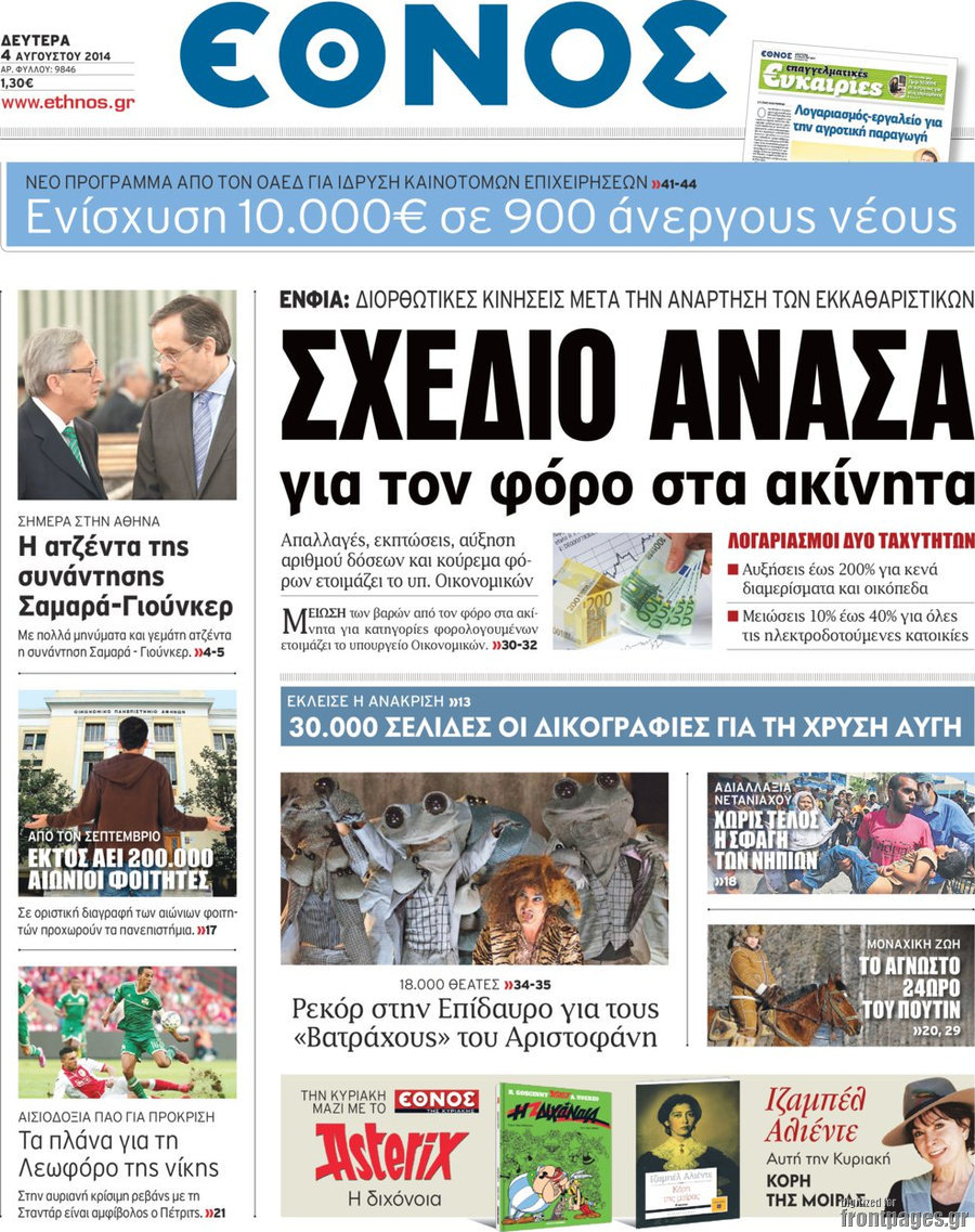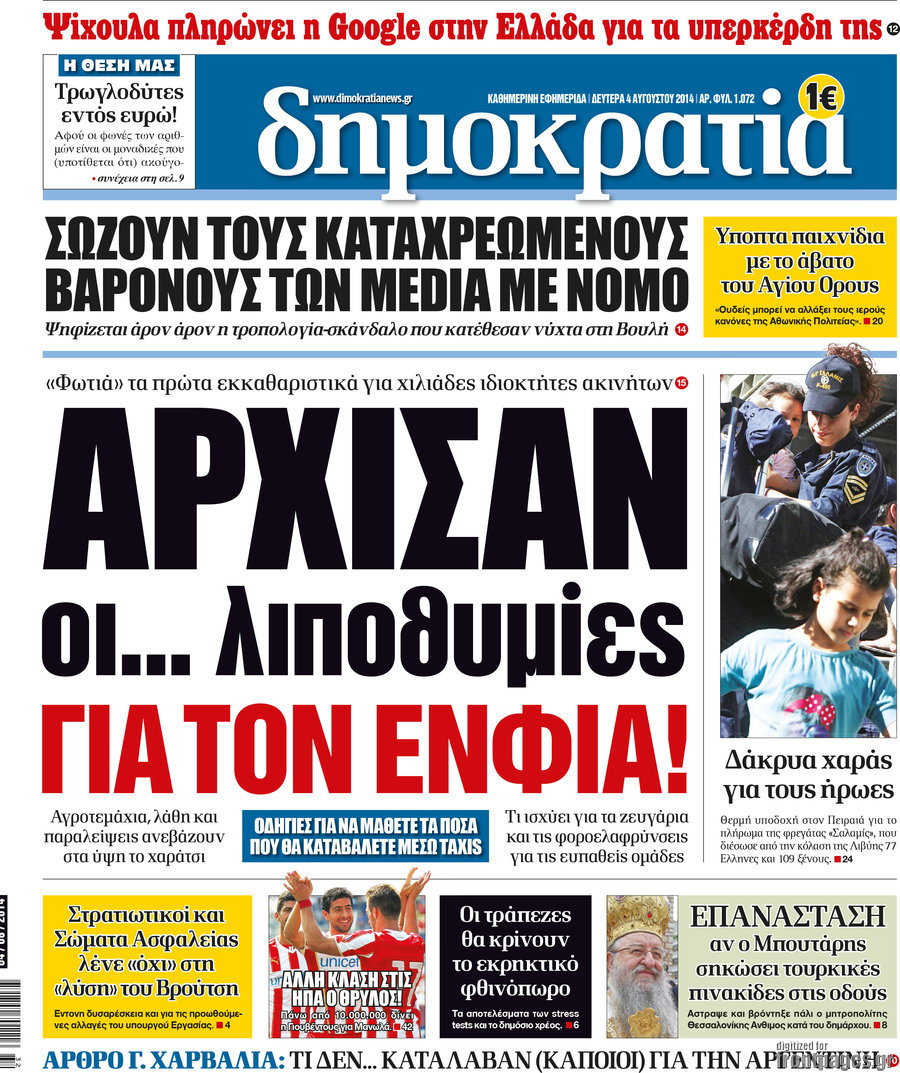 Οι πολιτικές εφημερίδες Enikos Newsroom 07:56, Δευτέρα 04 Αυγούστου 2014 Media Οι πολιτικές εφημερίδες Διαβάστε τα πρωτοσέλιδα των πολιτικών εφημερίδων. ΠΟΛΙΤΙΚΕΣ ΕΦΗΜΕΡΙΔΕΣ ΠΡΩΤΟΣΕΛΙΔΑ Μοιράσου το: σχολίασε κι εσύ (0 σχόλια) Ακολουθήστε το enikos.gr στο Google News και μάθετε πρώτοι όλες τις ειδήσεις Δείτε όλες τις τελευταίες ειδήσεις από την Ελλάδα και τον Κόσμο στο enikos.gr Ειδήσεις Ροή Ειδήσεων 2 ώρες πριν Μητσοτάκης σε αγρότες: Είμαστε ανοιχτοί στον διάλογο, αλλά όχι στο παράλογο – Η διεκδίκηση αιτημάτων οφείλει να γίνεται με σεβασμό στο κοινωνικό σύνολο 2 ώρες πριν Γρίπη: «Καμπανάκι» από τους επιστήμονες για έξαρση κρουσμάτων στις γιορτές – Ποιοι κινδυνεύουν και πώς προστατευόμαστε 4 ώρες πριν Γαλλία: Έτοιμοι για Χριστούγεννα στους δρόμους οι αγρότες – «Οι δεσμεύσεις της κυβέρνησης δεν είναι αρκετές» 3 ώρες πριν Η οικογενειακή διαμάχη των Μπέκαμ: Το block από τον Μπρούκλιν και η απόφαση να περάσει τα Χριστούγεννα με τους δισεκατομμυριούχους γονείς της συζύγου του 3 ώρες πριν Φοροδιαφυγή και «κενό ΦΠΑ»: Πώς τα ψηφιακά εργαλεία έφεραν δισεκατομμύρια στα ταμεία του Δημοσίου 2 ώρες πριν Τα άστρα ευνοούν σκανδαλωδώς 4 ζώδια – «Εμφανίζονται ξαφνικά ευκαιρίες γιατί αποφασίζετε να αφήσετε πίσω το παρελθόν» 1 ώρα πριν Προπονήτρια γυμναστικής που έχασε 9 κιλά αποκαλύπτει: «Αυτοί είναι οι 5 παράγοντες που εμποδίζουν την απώλεια βάρους» 21 λεπτά πριν Οι άνθρωποι που στρώνουν το κρεβάτι τους κάθε πρωί, διαθέτουν αυτές τις 8 κρυφές δυνάμεις 1 ημέρα πριν Enerwave: Το νέο «ρεύμα» στη λιανική ενέργειας που αλλάζει την εμπειρία του καταναλωτή 9 λεπτά πριν Super League: «Αντίο» στο 2025 με ντέρμπι στην Τούμπα 17 λεπτά πριν Στρατιωτική θητεία: Τι ισχύει με τις αναβολές σε κατοίκους εξωτερικού – Διευκρινίσεις από το υπουργείο Εθνικής Άμυνας 21 λεπτά πριν Οι άνθρωποι που στρώνουν το κρεβάτι τους κάθε πρωί, διαθέτουν αυτές τις 8 κρυφές δυνάμεις 25 λεπτά πριν Ρωσία: Δεν προετοιμάζεται συνάντηση Αμερικανών, Ρώσων και Ουκρανών απεσταλμένων, ανακοίνωσε το Κρεμλίνο 33 λεπτά πριν «Melania»: Η βασίλισσα Ράνια της Ιορδανίας στο πλευρό της Μελάνια Τραμπ στο νέο ντοκιμαντέρ της Amazon MGM Studios ENIKOS NETWORK Άσκηση: η «ασπίδα» του εγκεφάλου απέναντι στη γήρανση Έχετε καταρροή και φαγούρα στα μάτια στις γιορτές; Μπορεί να ευθύνεται το σύνδρομο χριστουγεννιάτικου δέντρου “Προσβασιμότητα κατ’ Οίκον”: Έως αύριο η υποβολή των δικαιολογητικών για 3.000 δικαιούχους Ανοιχτά τα καταστήματα σήμερα – Μέχρι τι ώρα μπορείτε να κάνετε τις αγορές σας Χαρτογραφώντας το «σημείο χωρίς επιστροφή»: Για πρώτη φορά αποκαλύπτεται με λεπτομέρεια το ακανθώδες όριο της ατμόσφαιρας τ... Η Google καταργεί τη λειτουργία «dark web report» – Πώς θα μπορούν οι χρήστες να διαγράφουν τα δεδομένα τους περισσότερα 09:43 , Κυριακή 21 Δεκεμβρίου 2025 Το λάθος στην ταινία Die Hard που άφησε άναυδους τους θαυμαστές του Μπρους Γουίλις Ένας φανατικός των ταινιών άφησε άναυδους τους θαυμαστές του Die Hard, επισημαίνοντας τρία βασ... 08:13 , Κυριακή 21 Δεκεμβρίου 2025 Άγιος έρωτας: Ένας καταστροφικός σεισμός χτυπά τη Στέρνα Καταιγιστικές είναι οι εξελίξεις στα δυο τελευταία, συγκλονιστικά επεισόδια του 2025 της σειρά... 08:00 , Κυριακή 21 Δεκεμβρίου 2025 Σήμερα με τη Realnews: Ό,τι και αν αγοράσεις, σκανάρεις και κερδίζεις! Σήμερα με τη Realnews: Ό,τι και αν αγοράσεις, σκανάρεις και κερδίζεις! Με το PADU app, το κορυ... 07:00 , Κυριακή 21 Δεκεμβρίου 2025 Σήμερα με τη Realnews: Instyle, μαζί Drive και Realnews Geopolitics Σήμερα με τη Realne